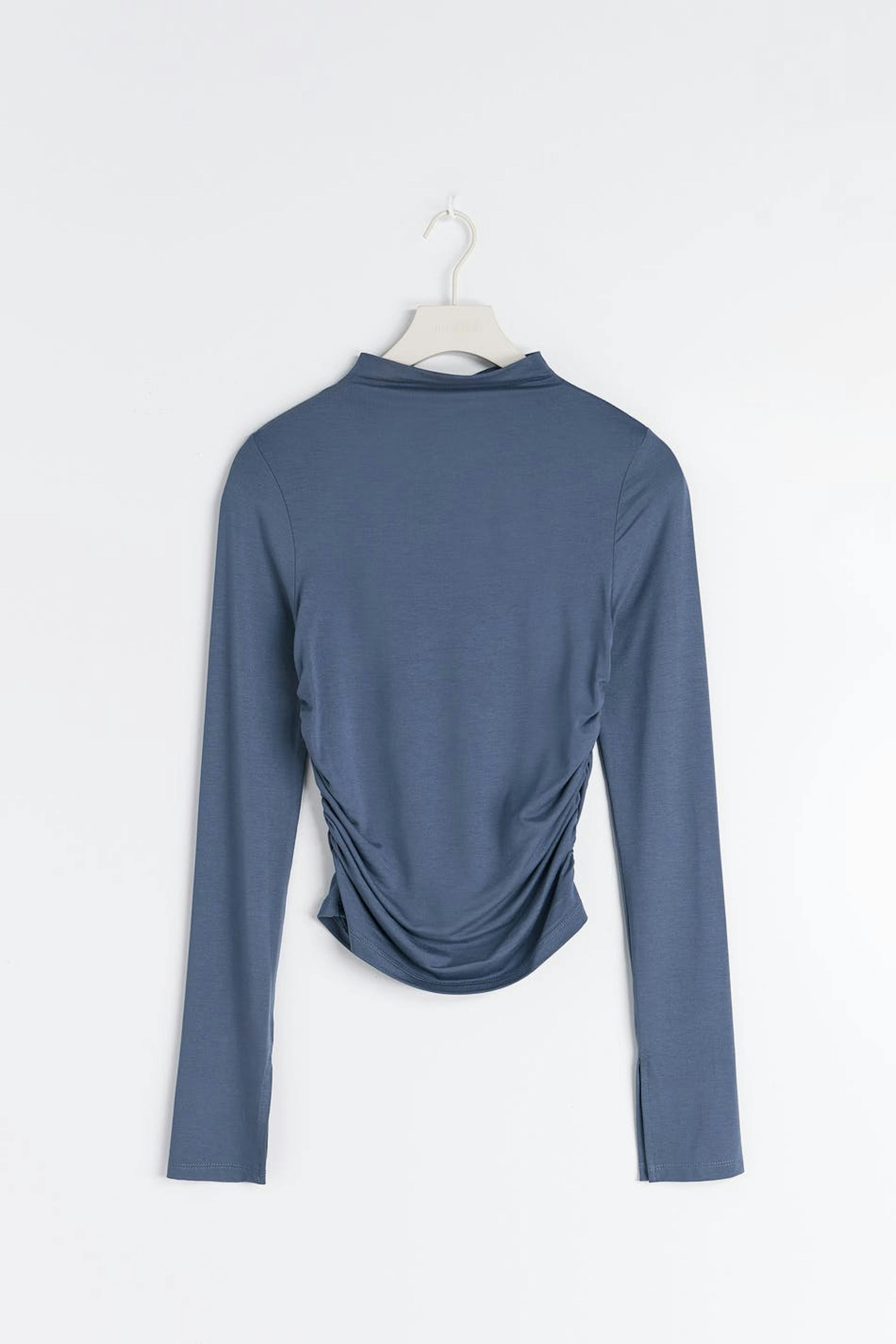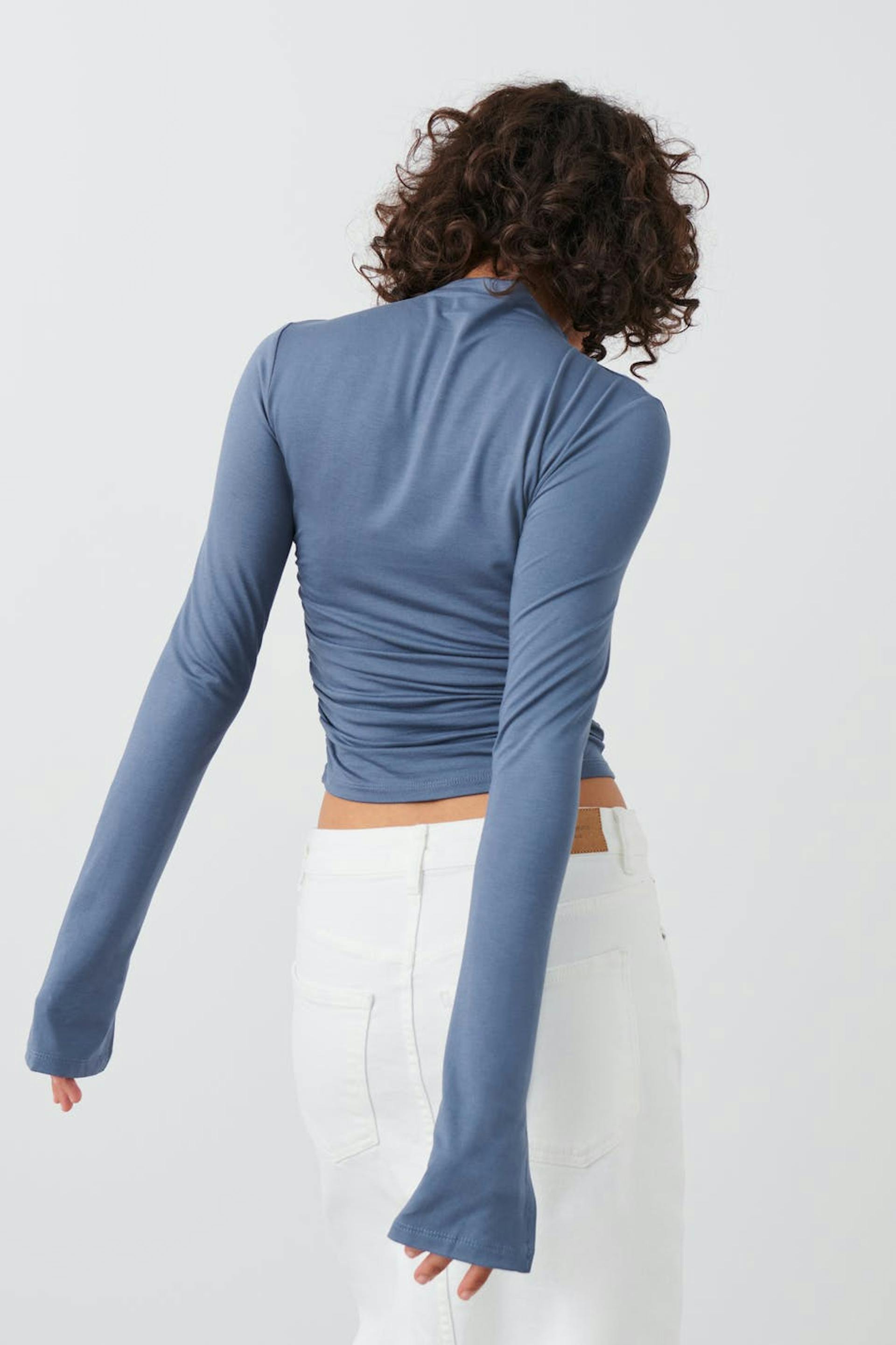 Soft touch – second skin comfort. Långärmad topp i mjuk viskos med trattkrage. Toppen är grå och har figurnära passform. Den har rynkningar i sidorna och slits vid ärmsluten.
