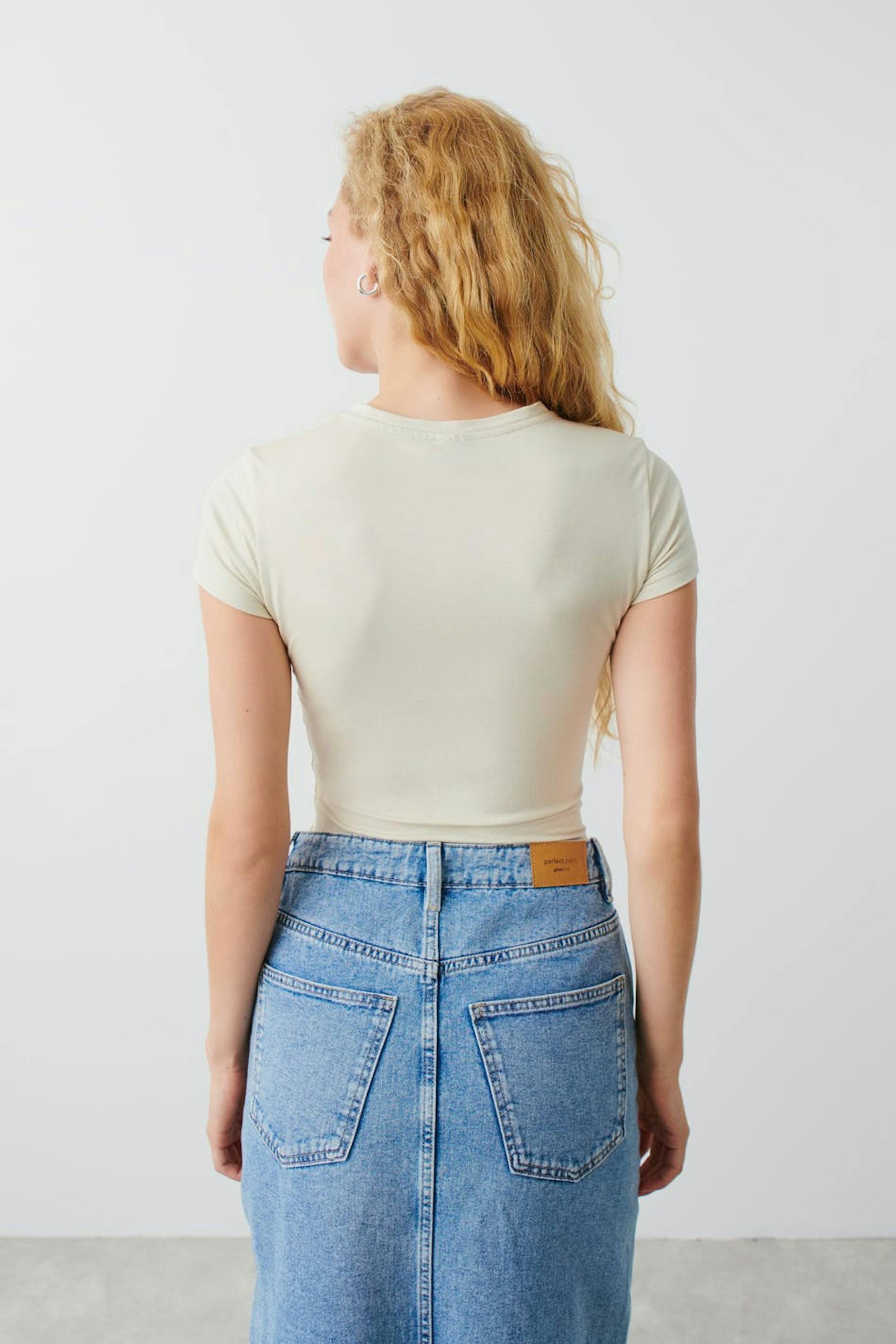 Soft touch – second skin comfort. Figurnära topp med rund hals. Toppen är beige och har korta ärmar.