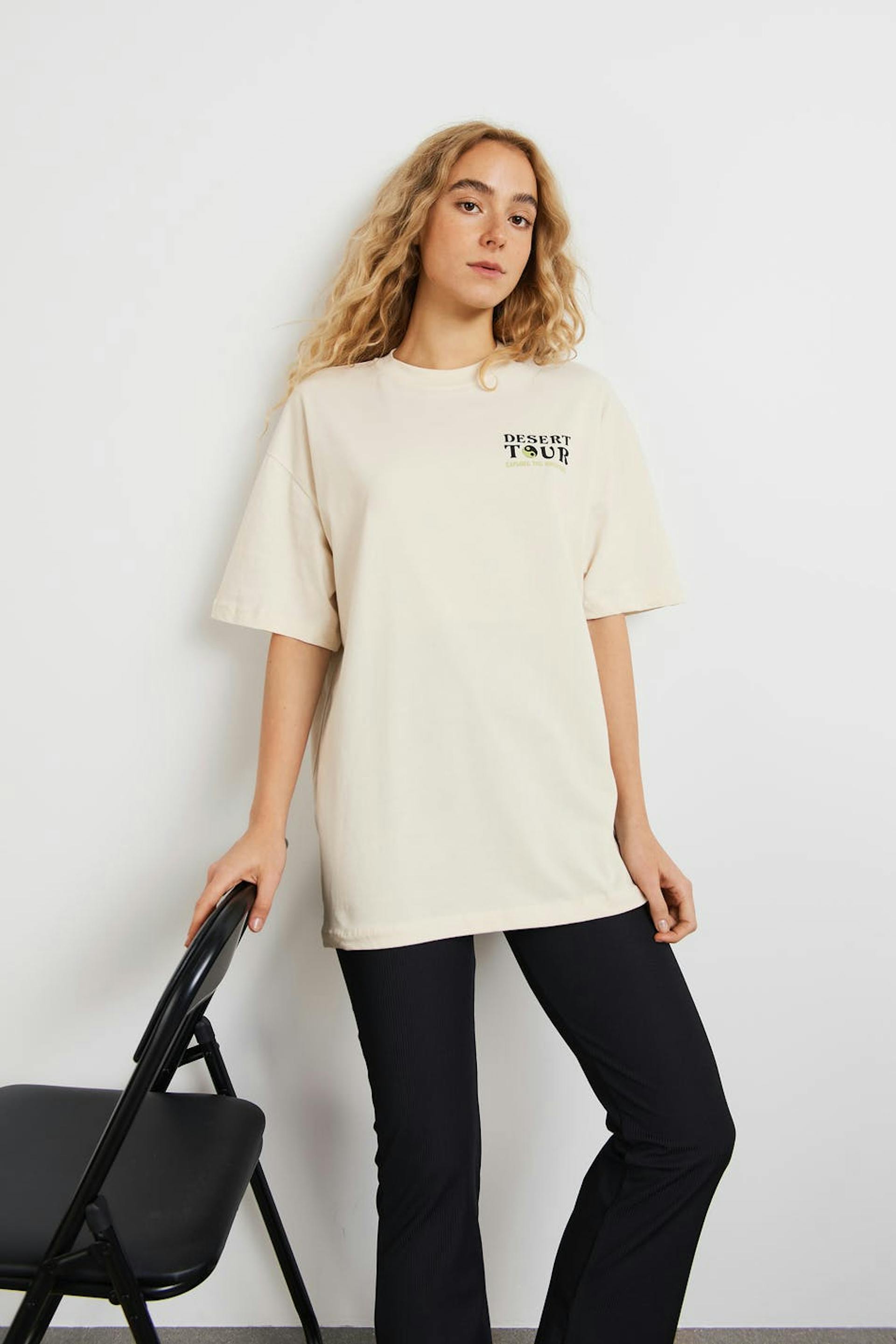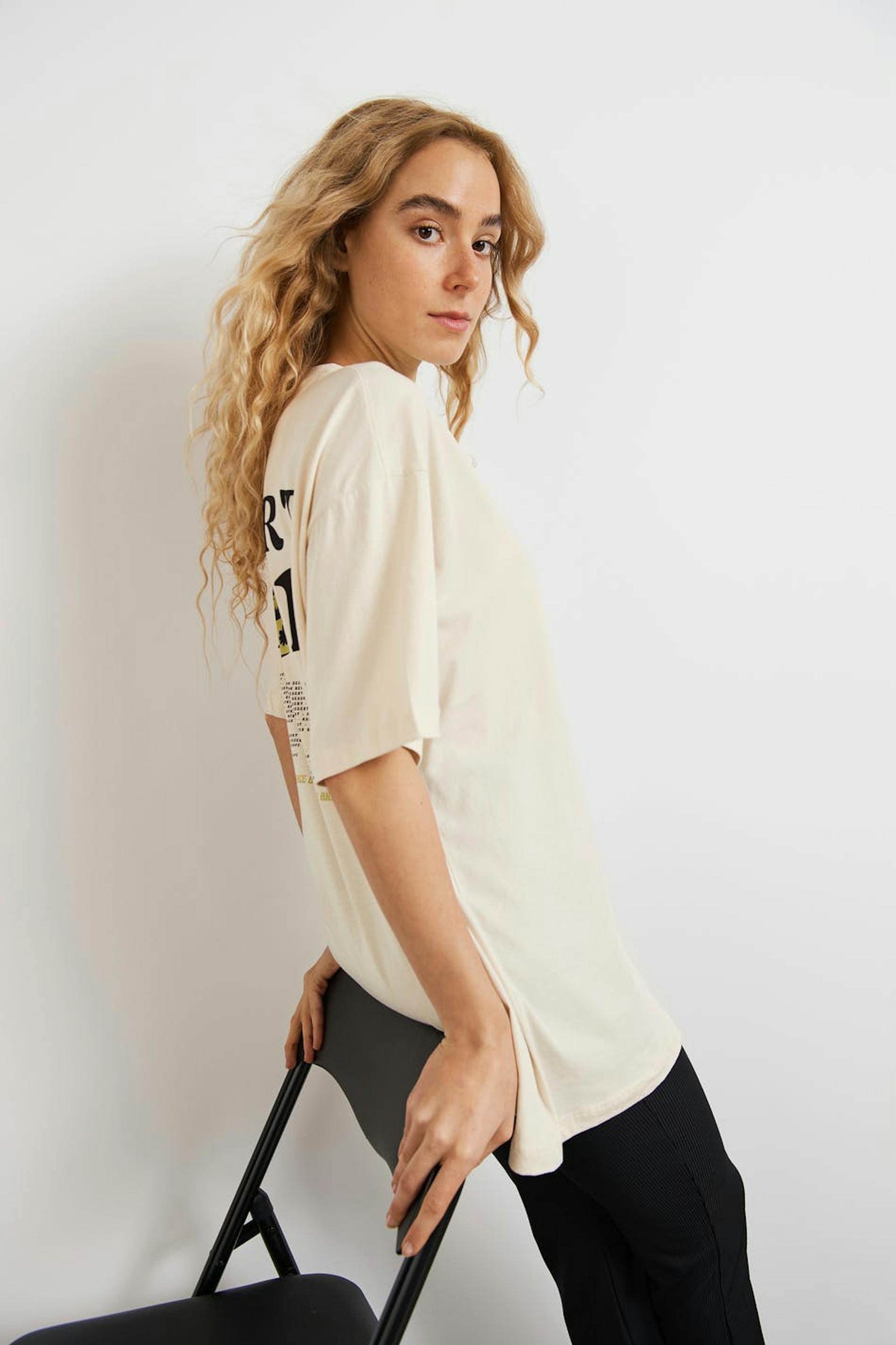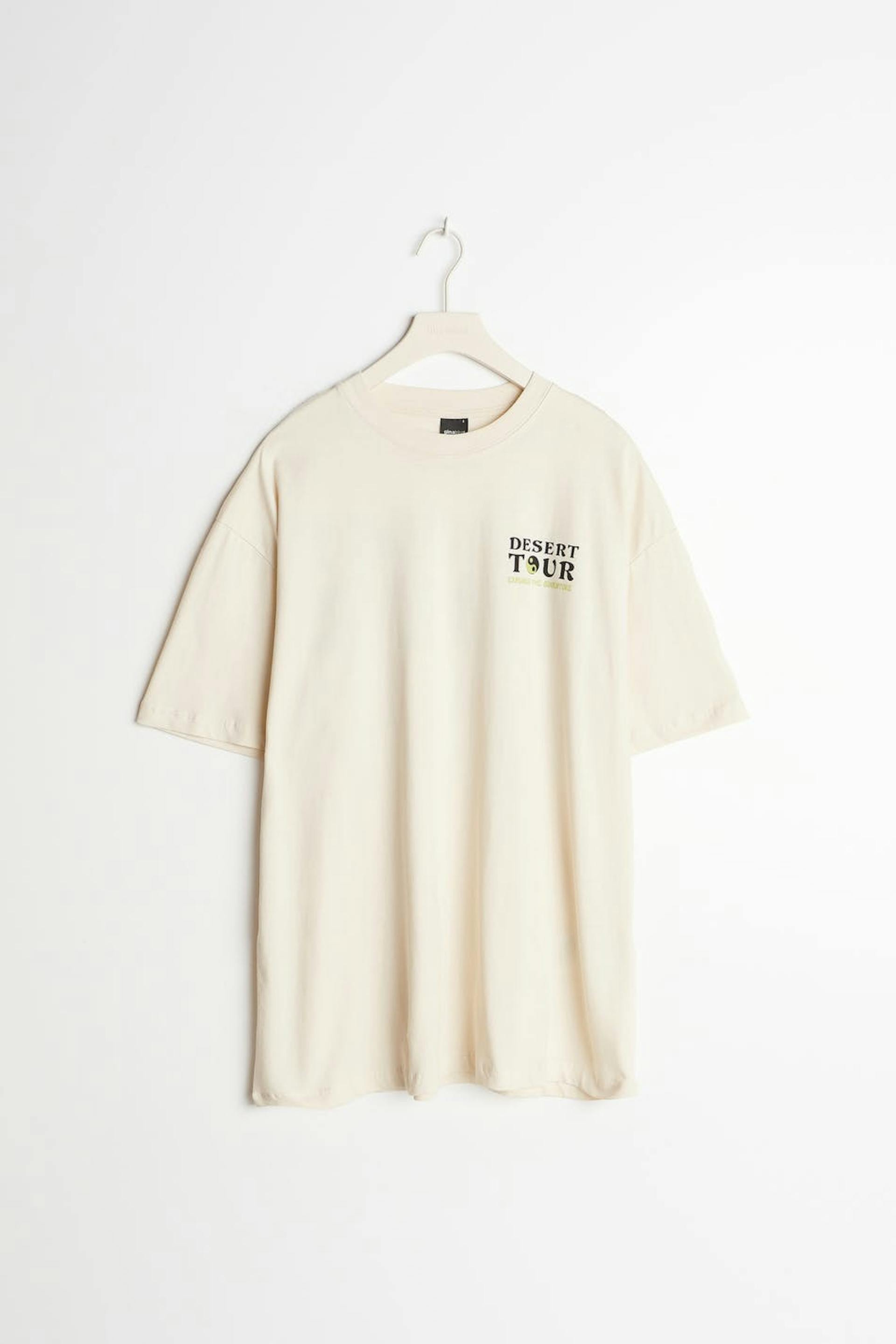 T-shirt i mjuk trikå med tryck fram och bak. T-shirten är beige och har oversize fit. Den har en rund, ribbad halsringning och korta ärmar.