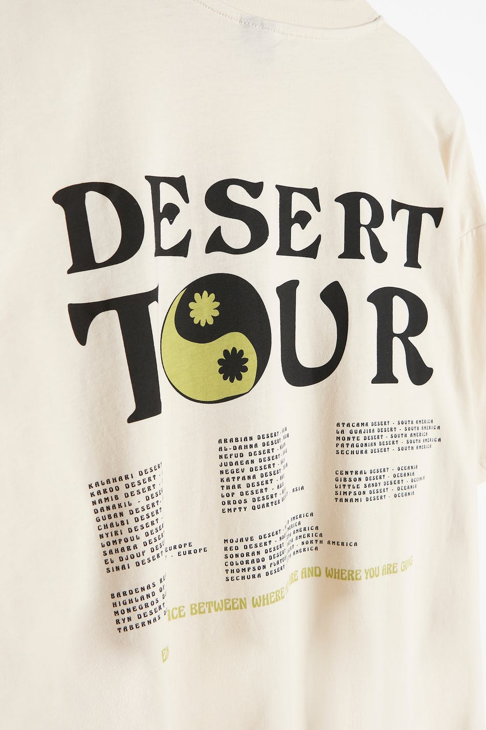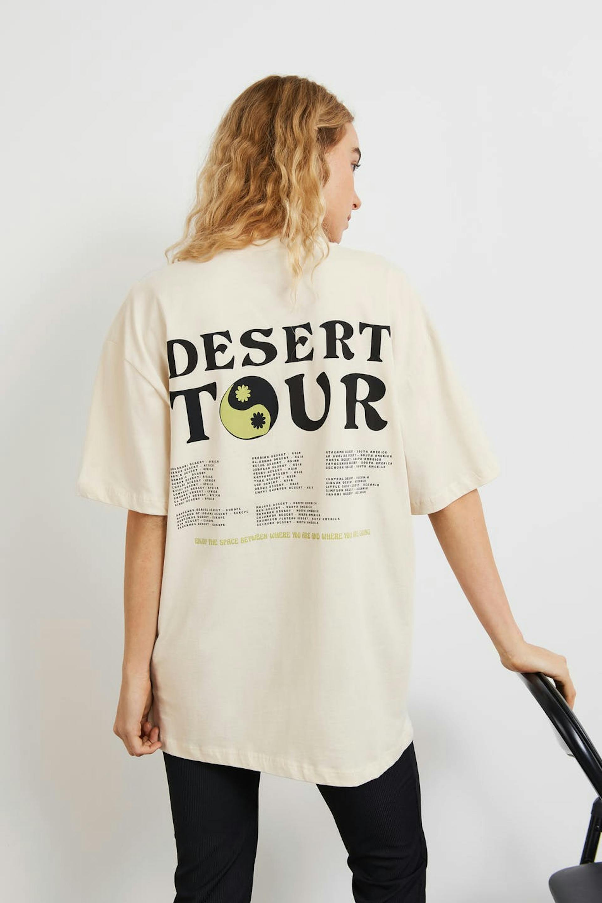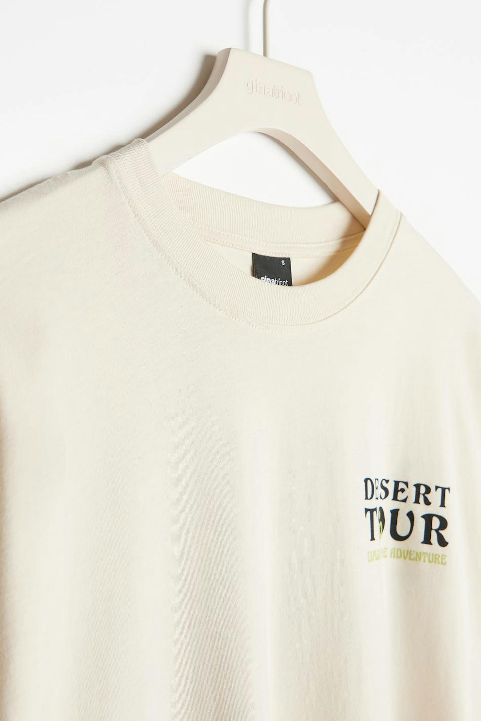 T-shirt i mjuk trikå med tryck fram och bak. T-shirten är beige och har oversize fit. Den har en rund, ribbad halsringning och korta ärmar.