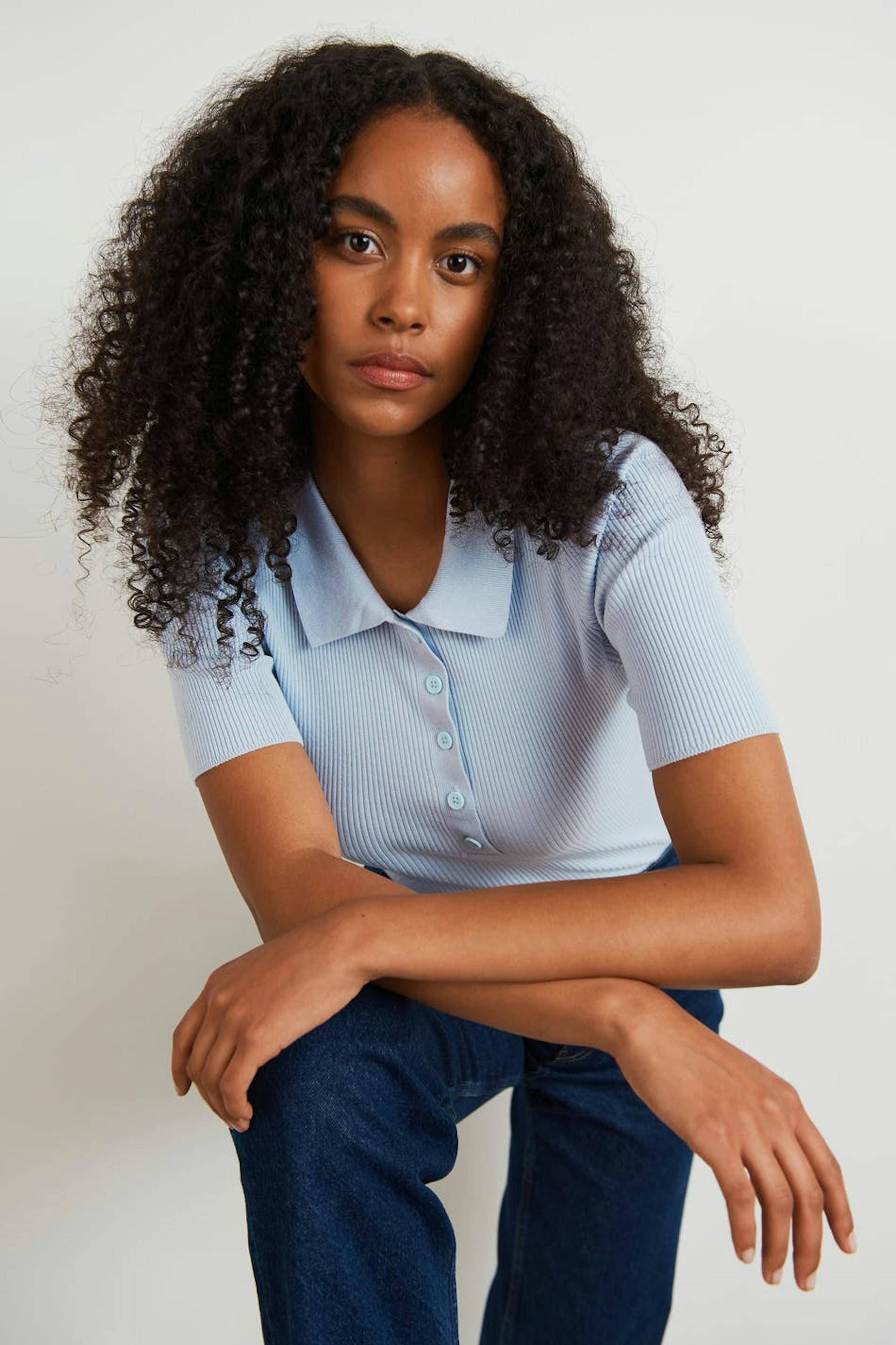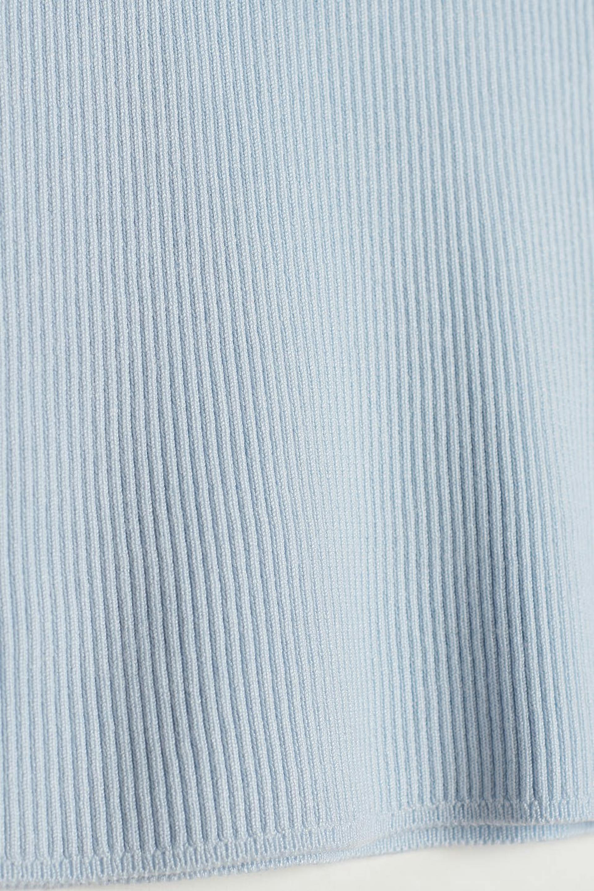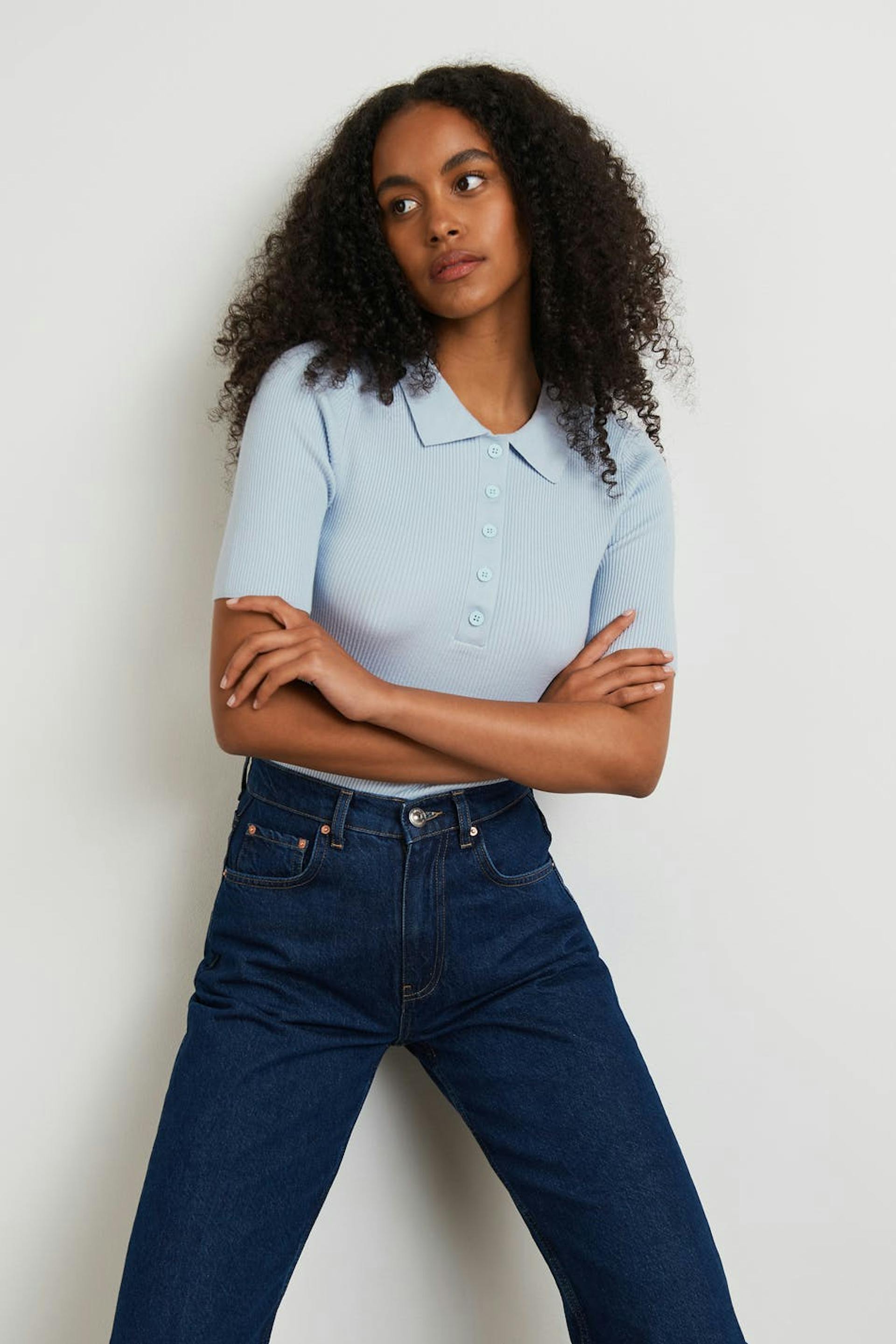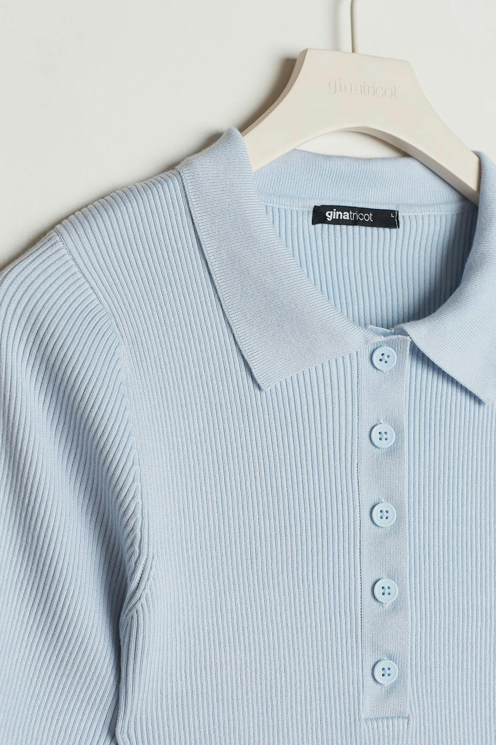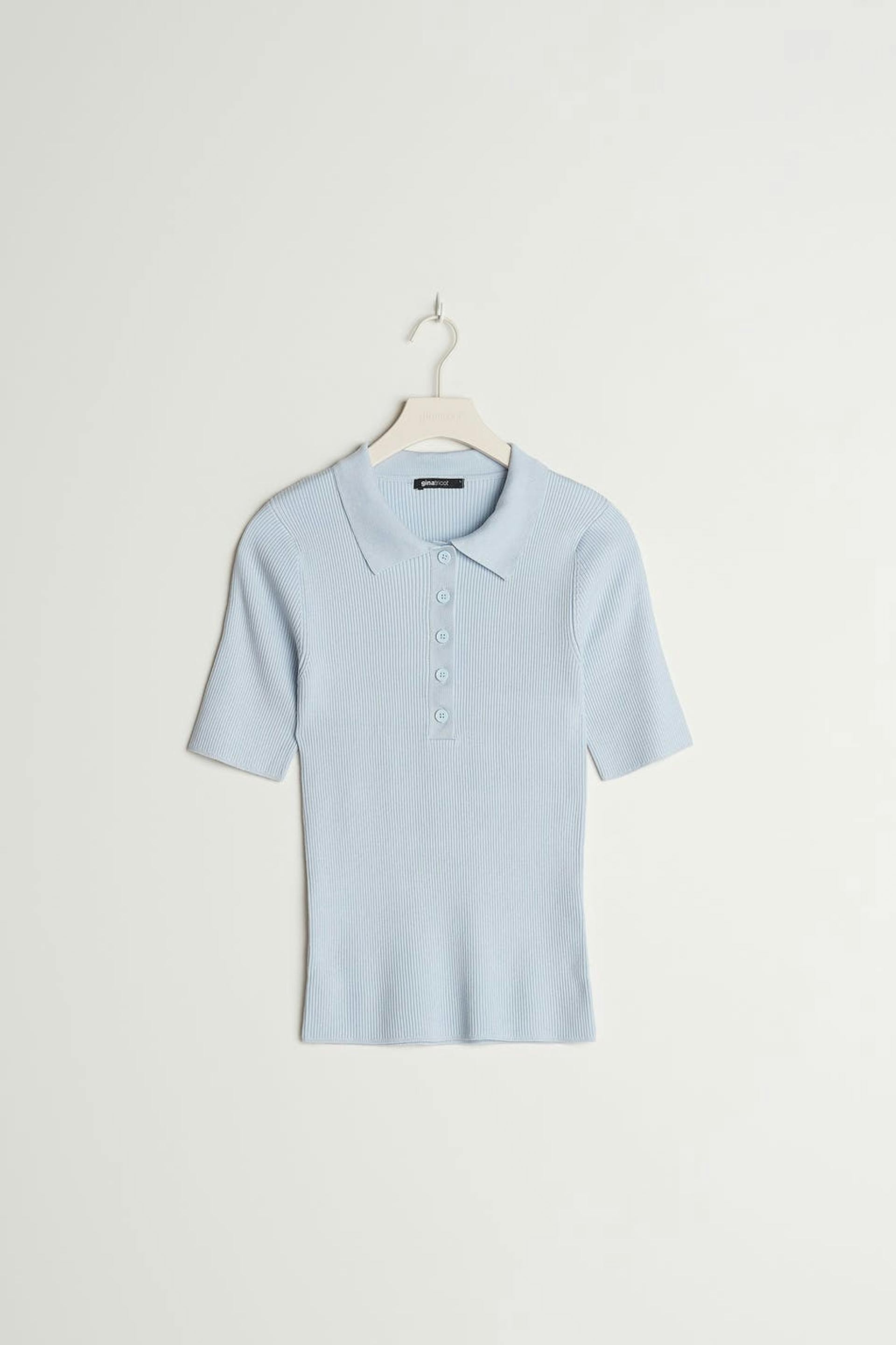 Ribbstickad topp med korta ärmar. Toppen är blå och har en halsringning med knappar. Den har en krage och en figurnära passform.