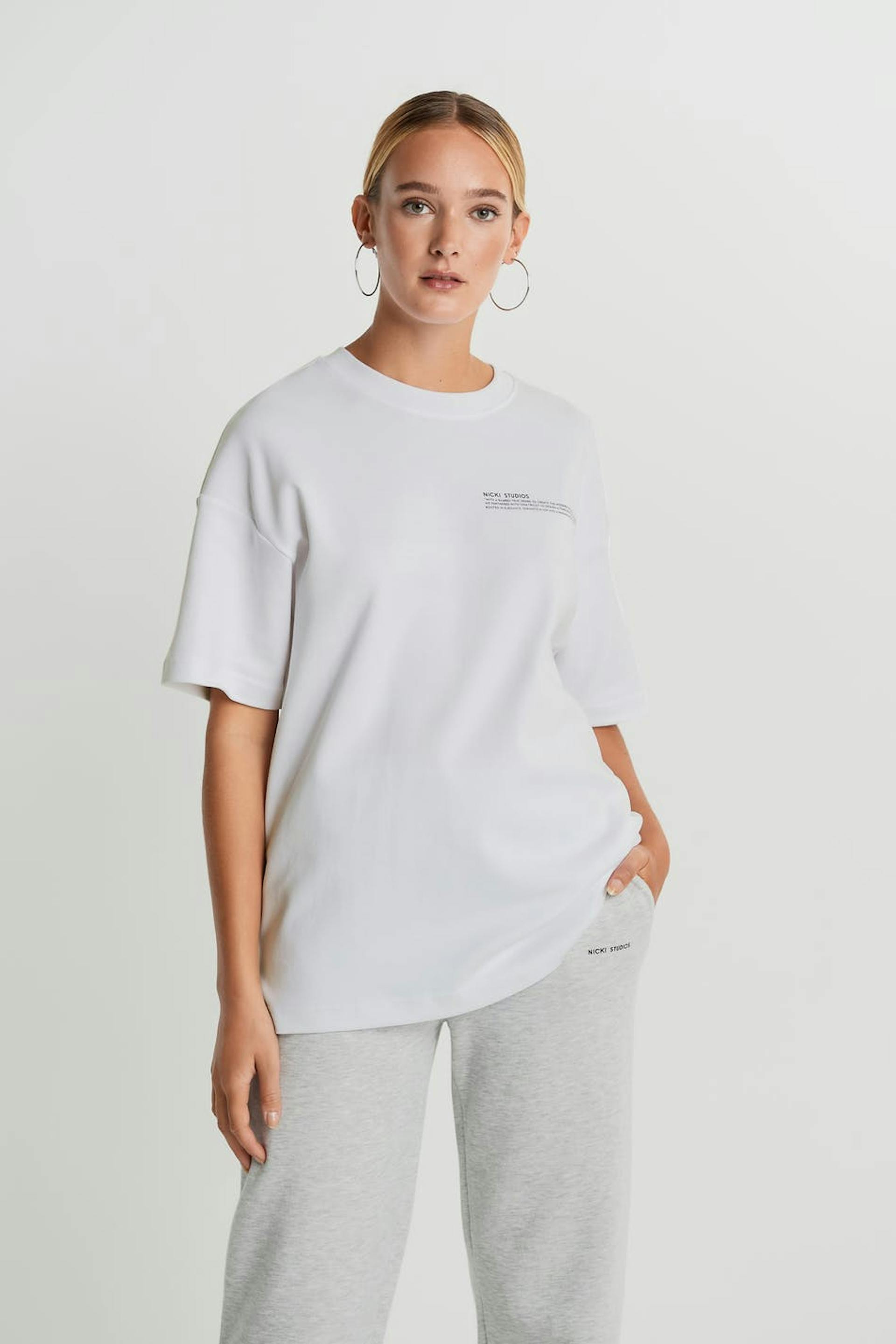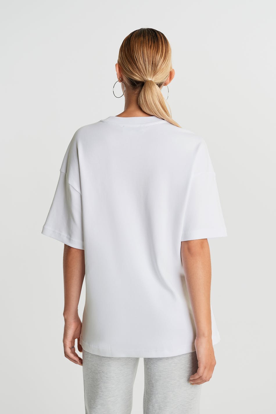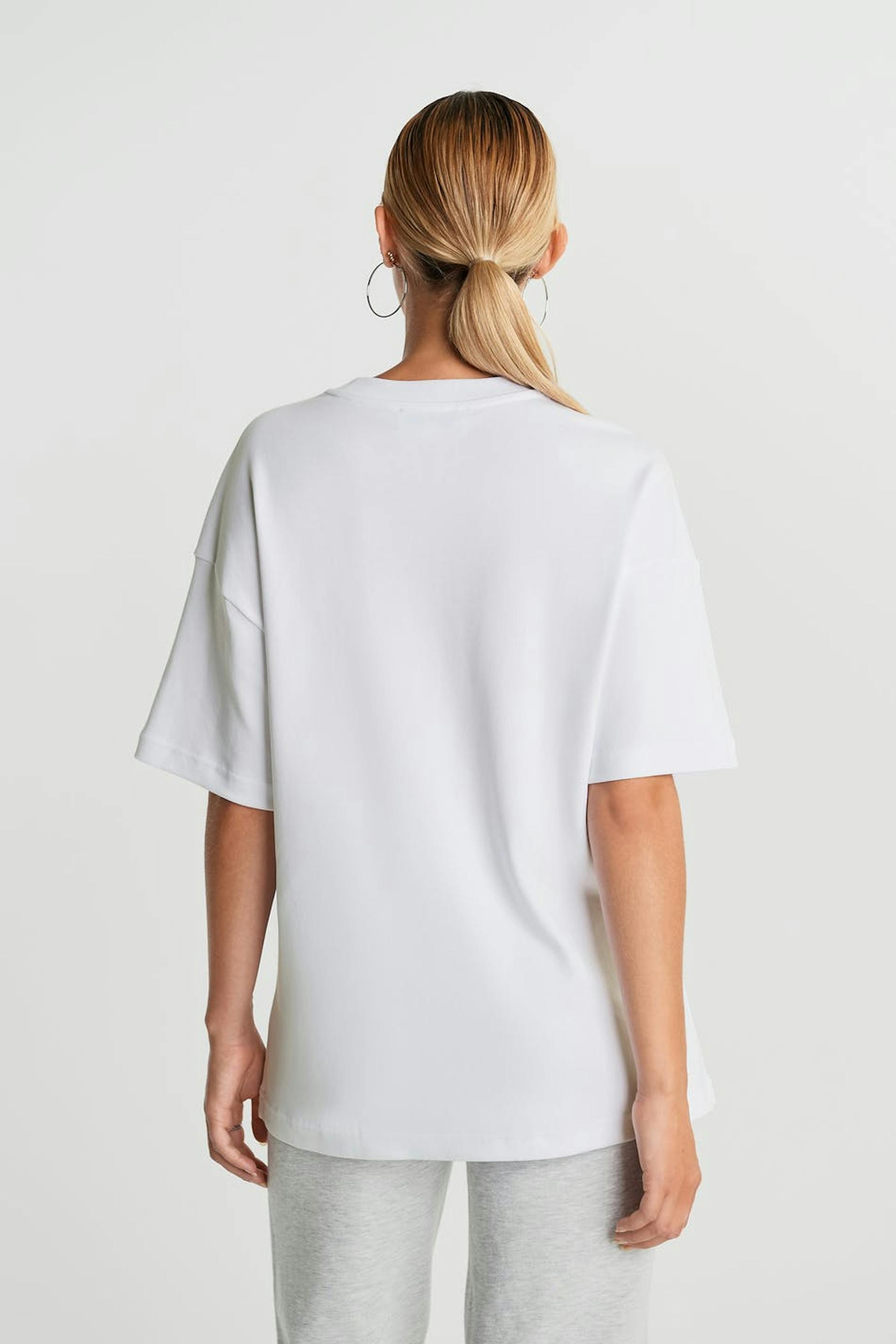 Oversized t-shirt med ett tryck på framsidan. T-shirten är vit.
