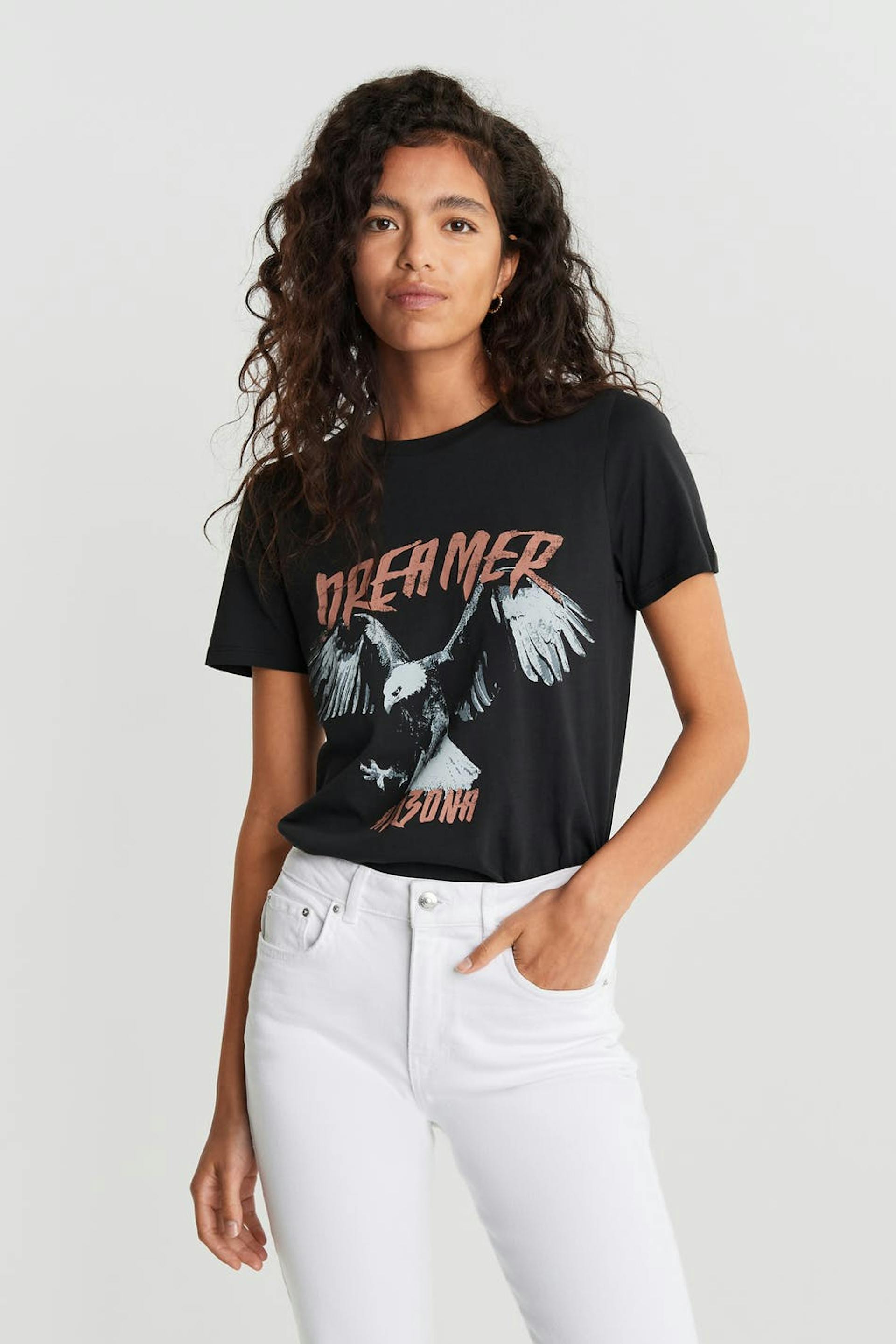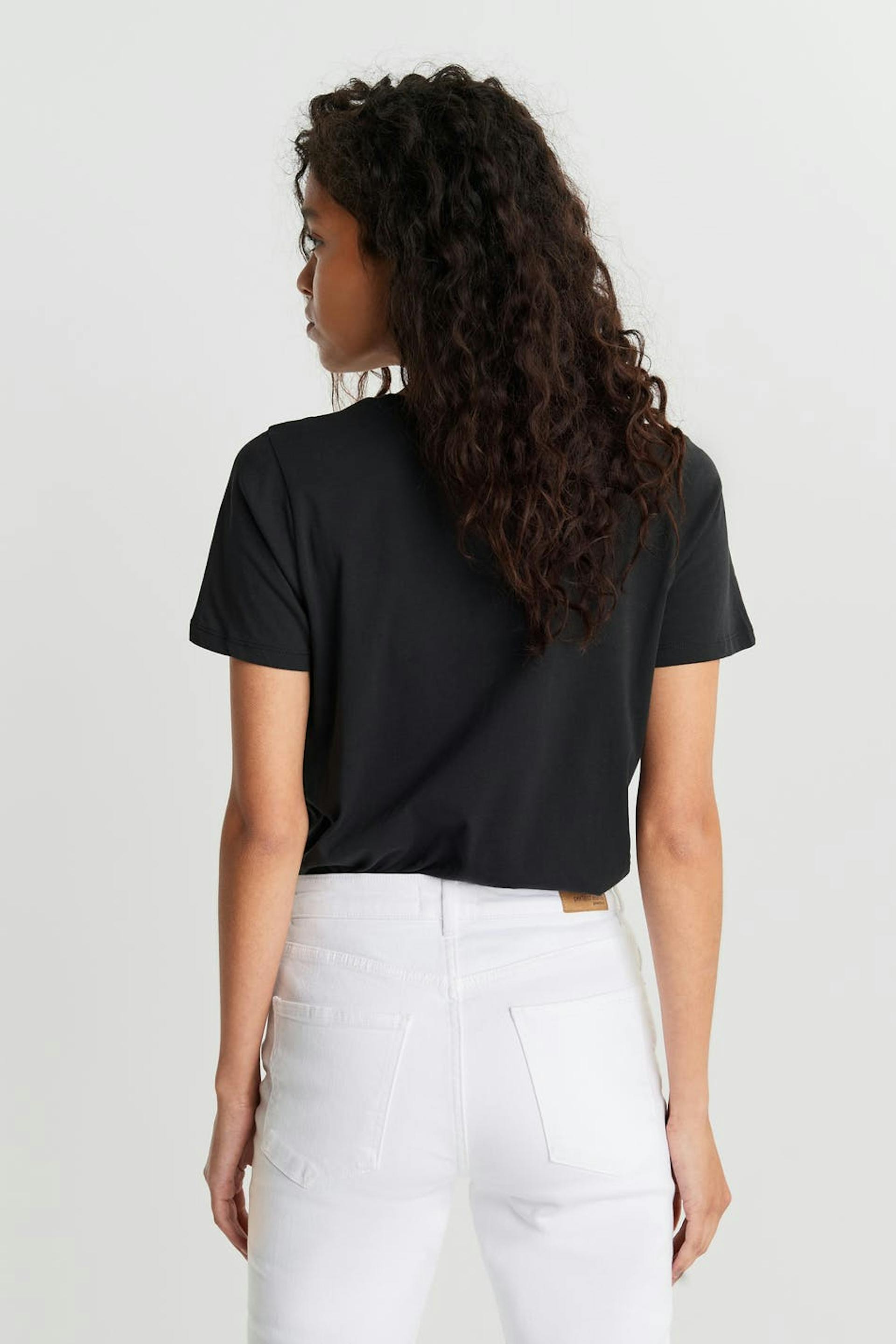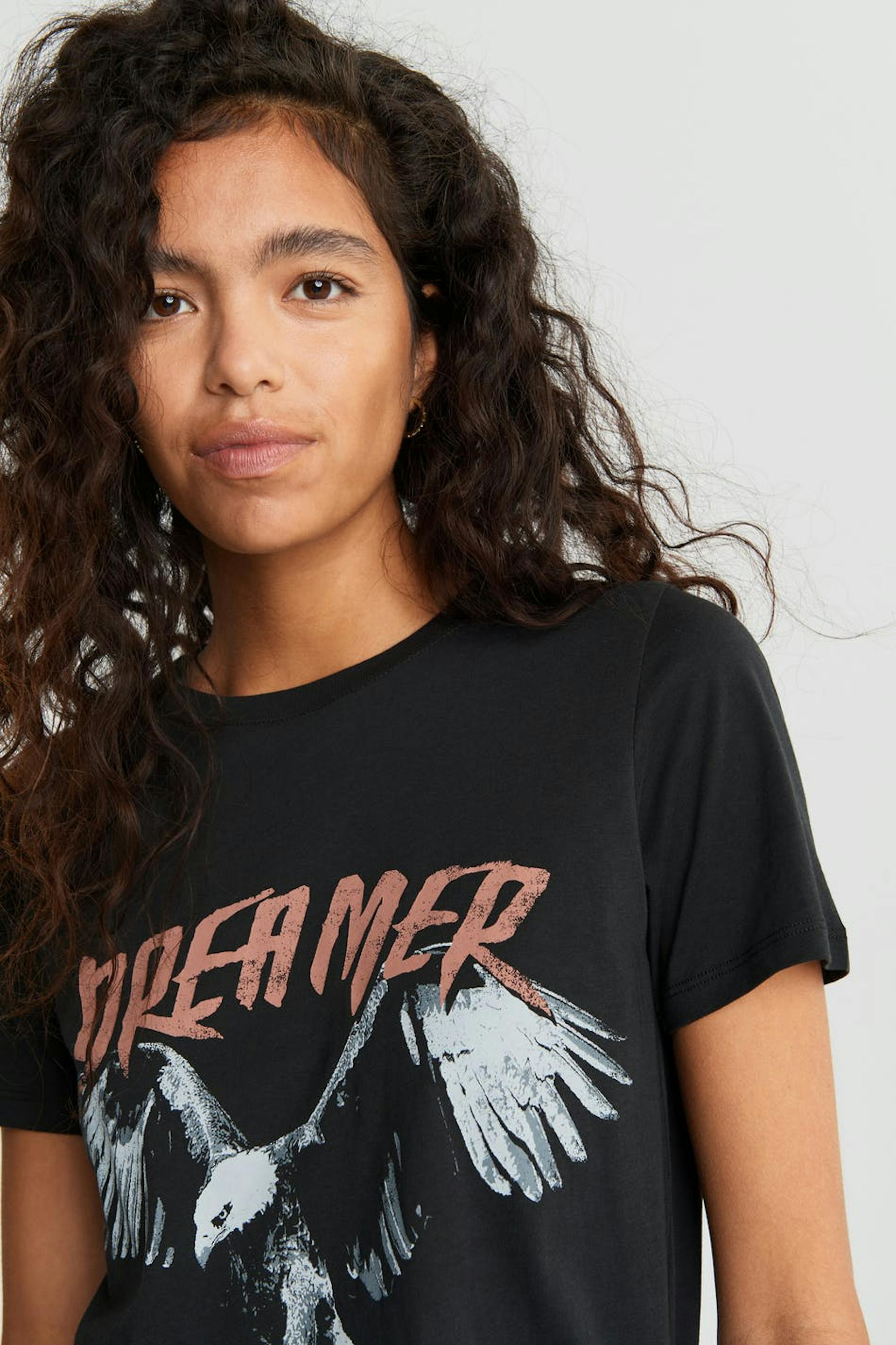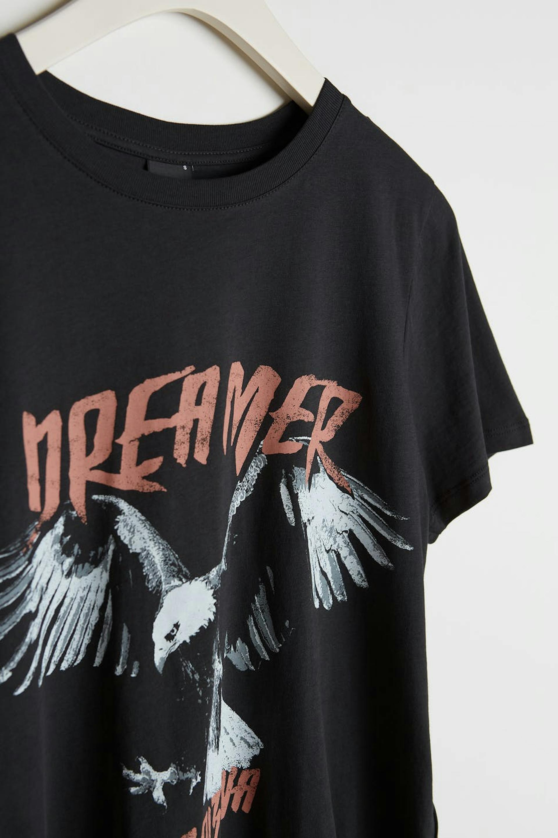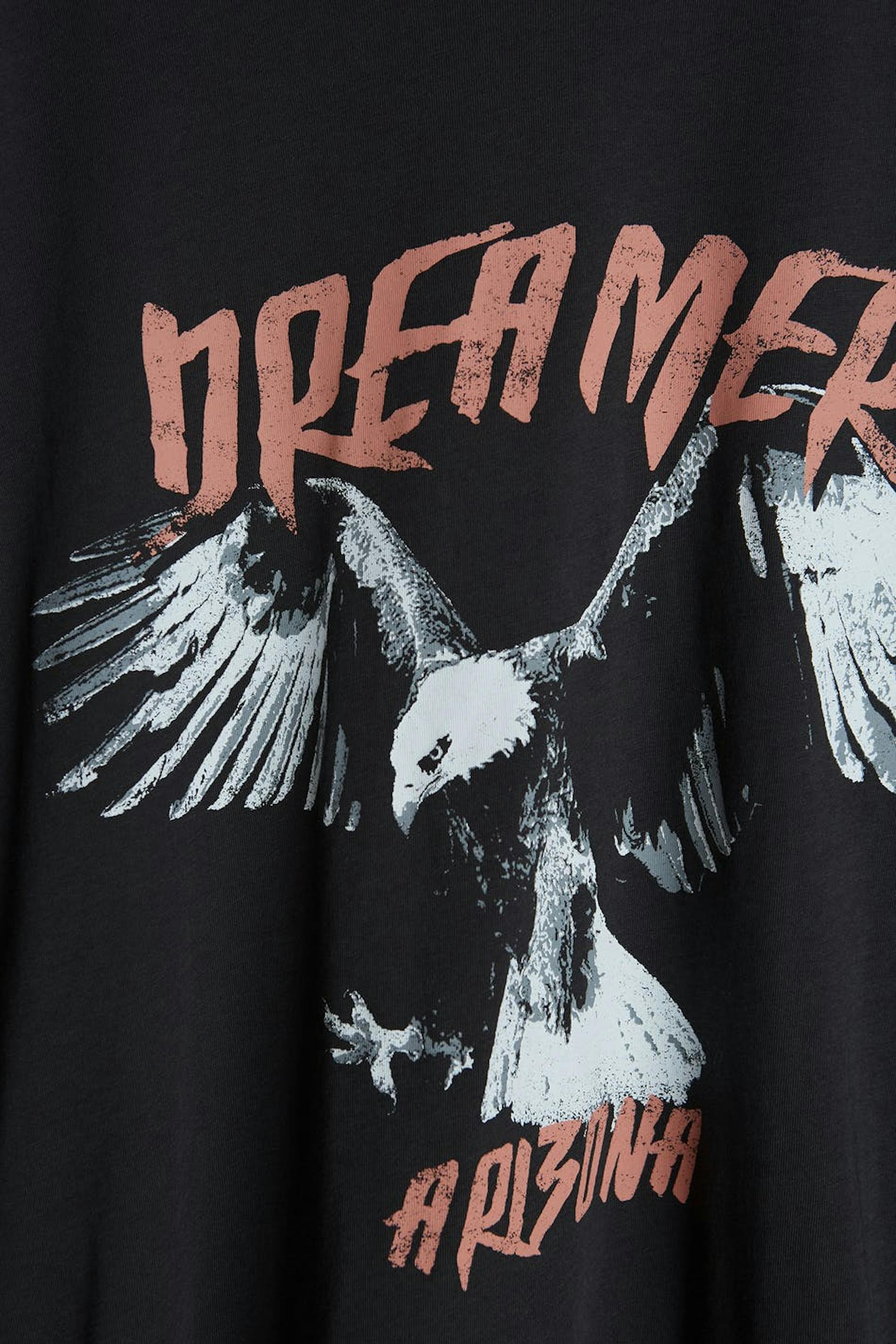 Kortärmad topp med en normal passform. Toppen är svart och har en rund halsringning. Den har en smal ribbmudd och ett tryck på framsidan.