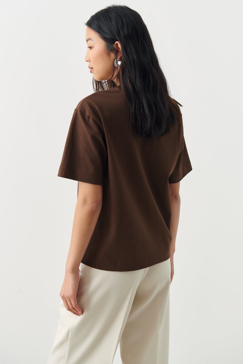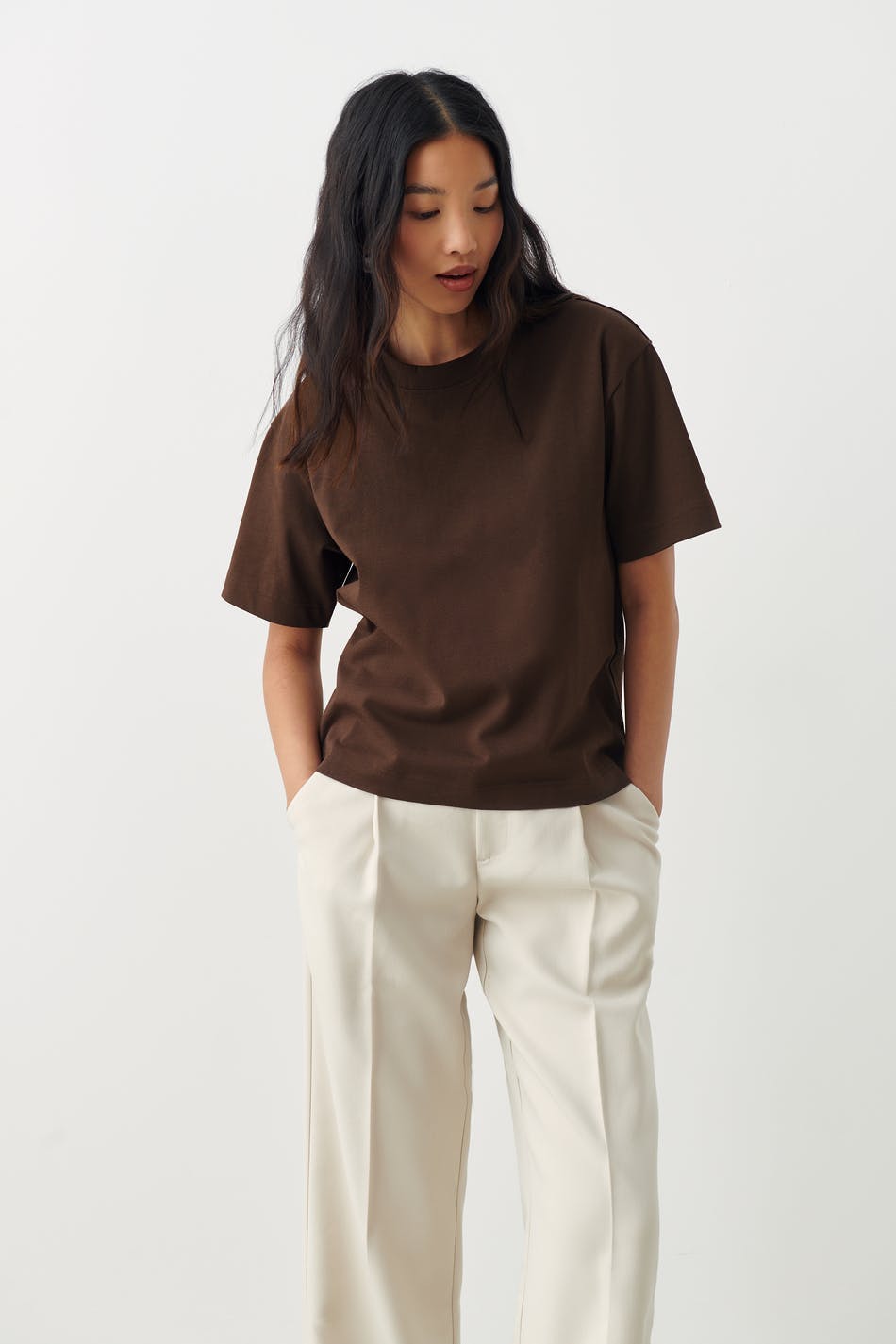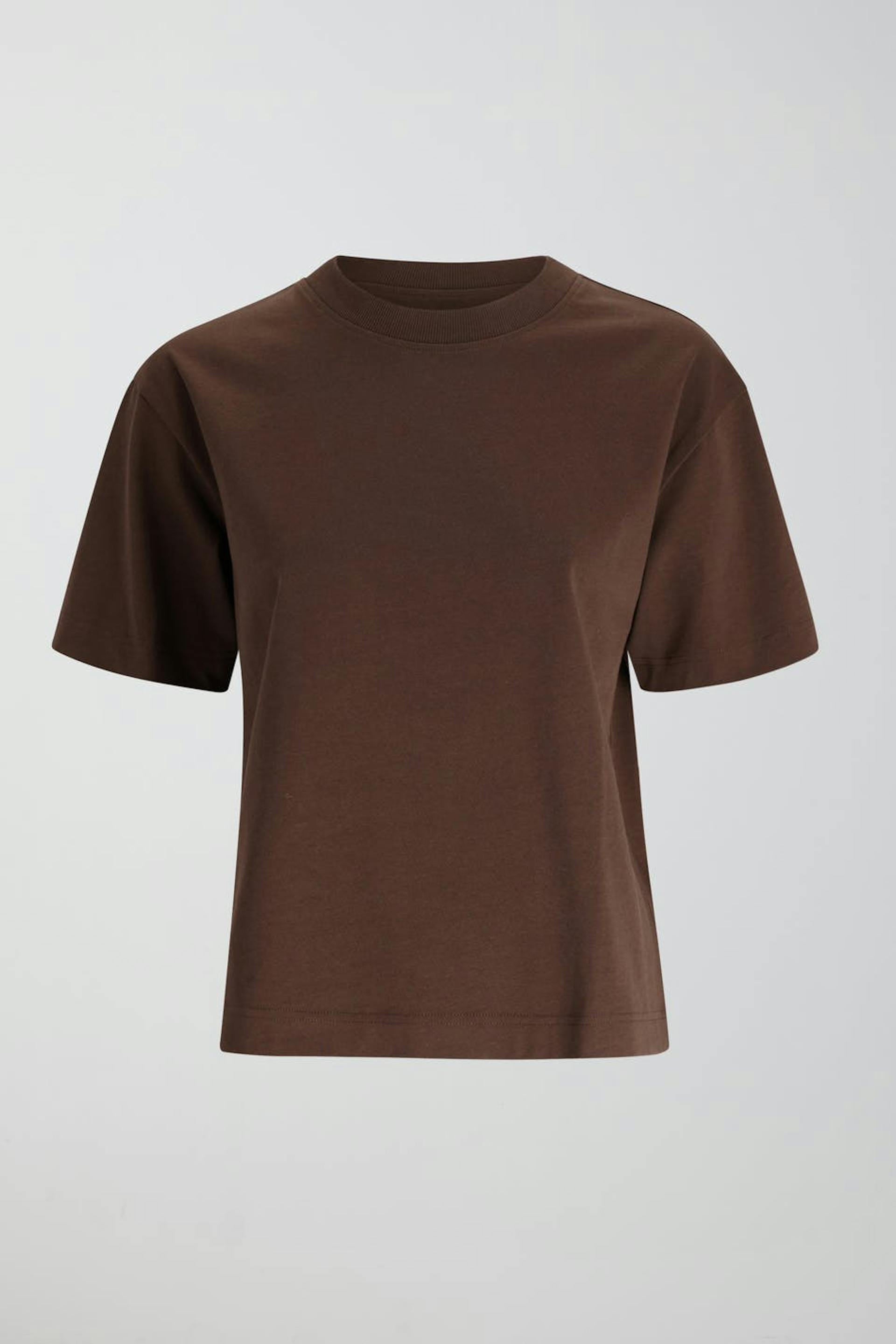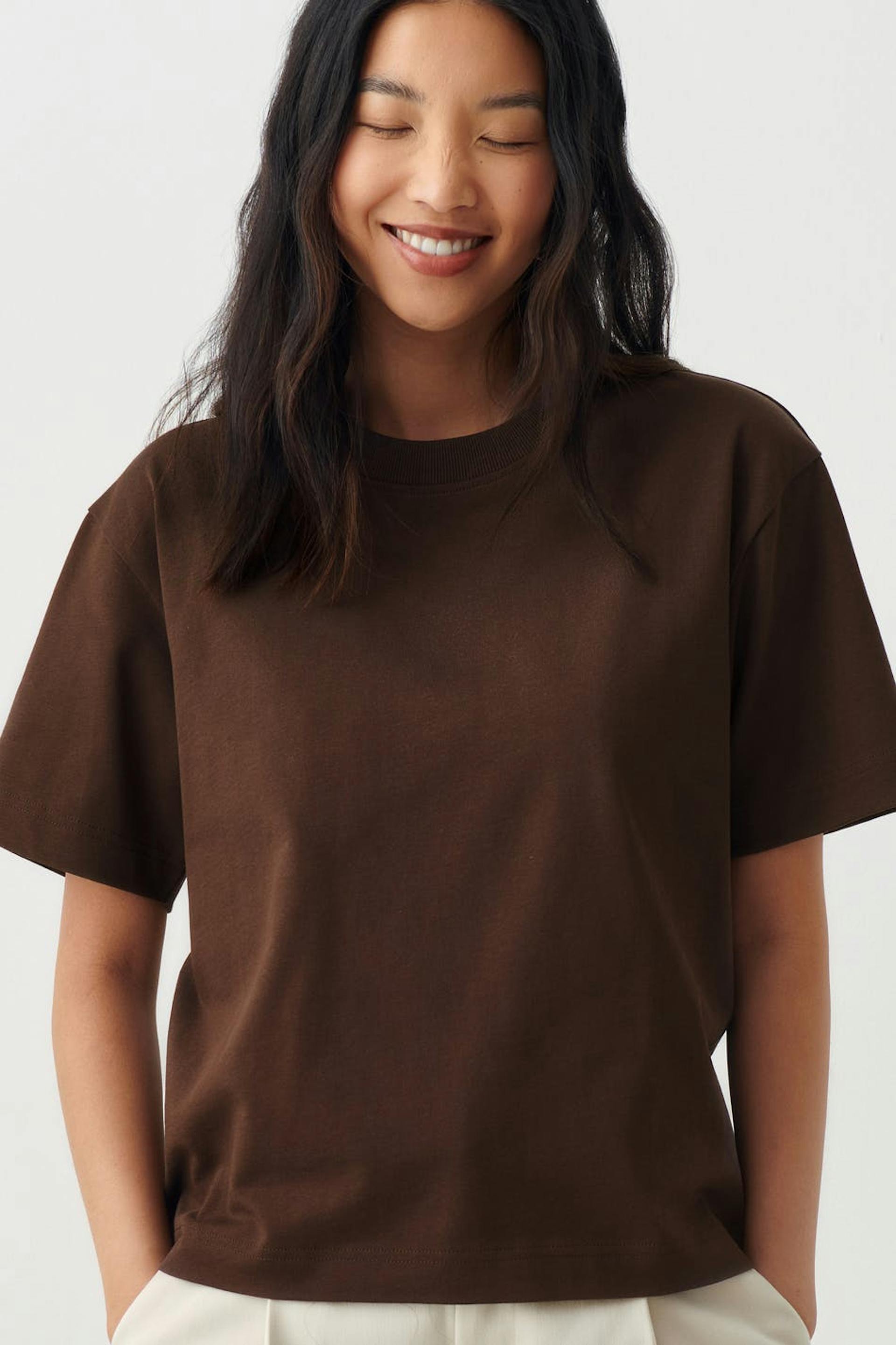 T-shirt med oversize fit. T-shirten är brun och har ett mjukt, tjockare material i bomull. Den har en ribbmudd kring halsringning.