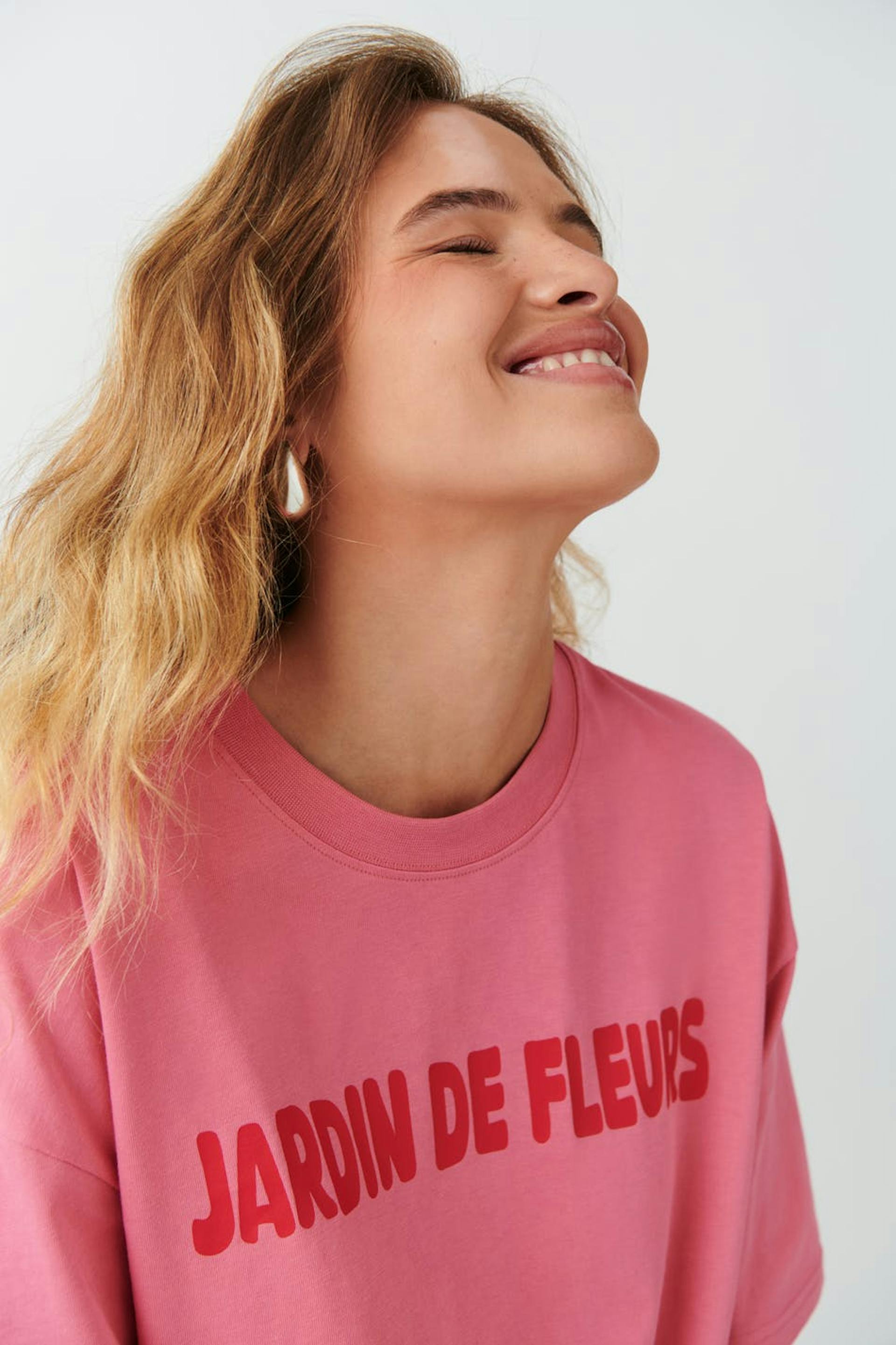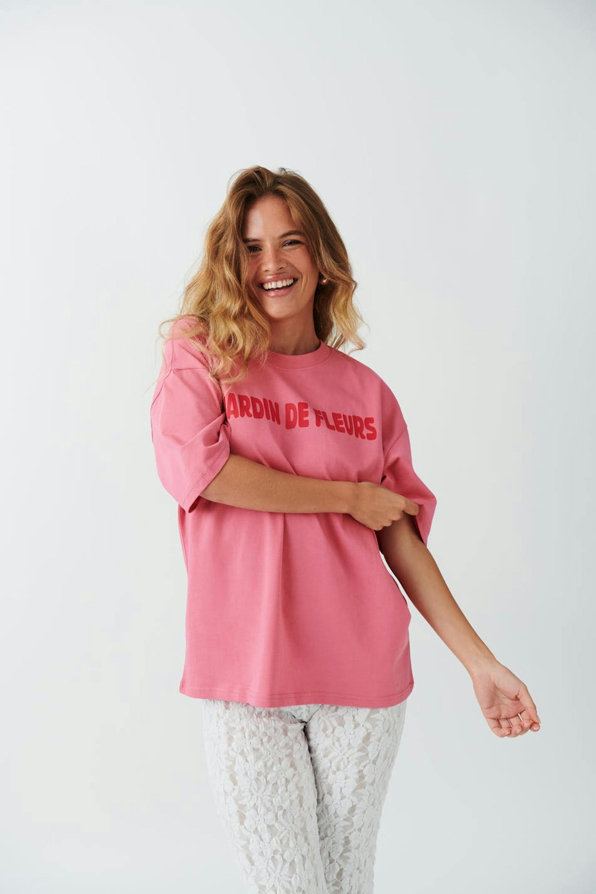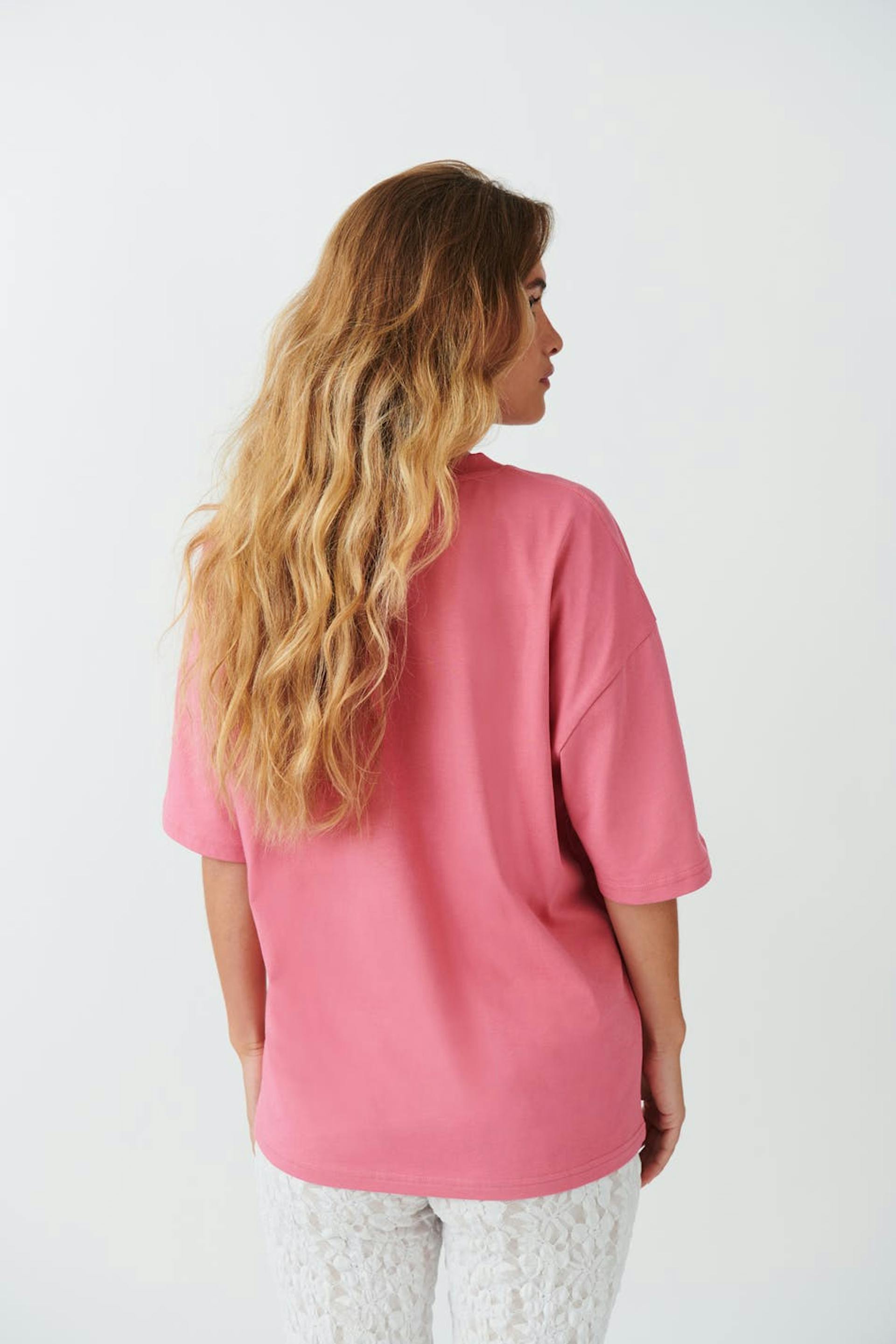 Oversized t-shirt i bomull med kort ärm. T-shirten är rosa och har rund halsringning. Den har nedhasad axel.