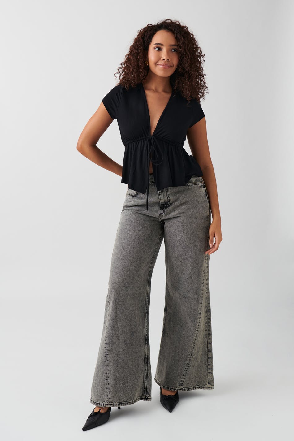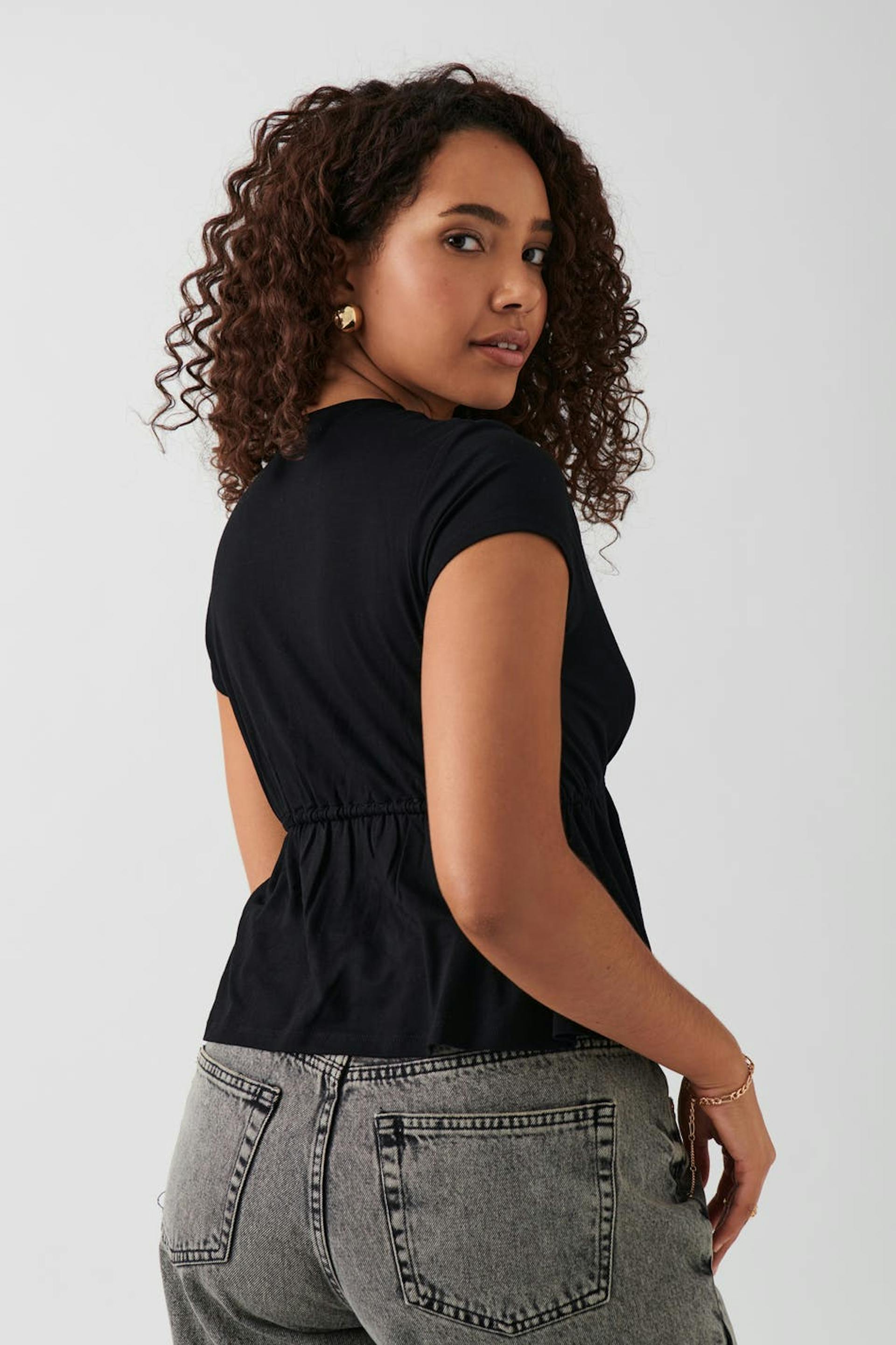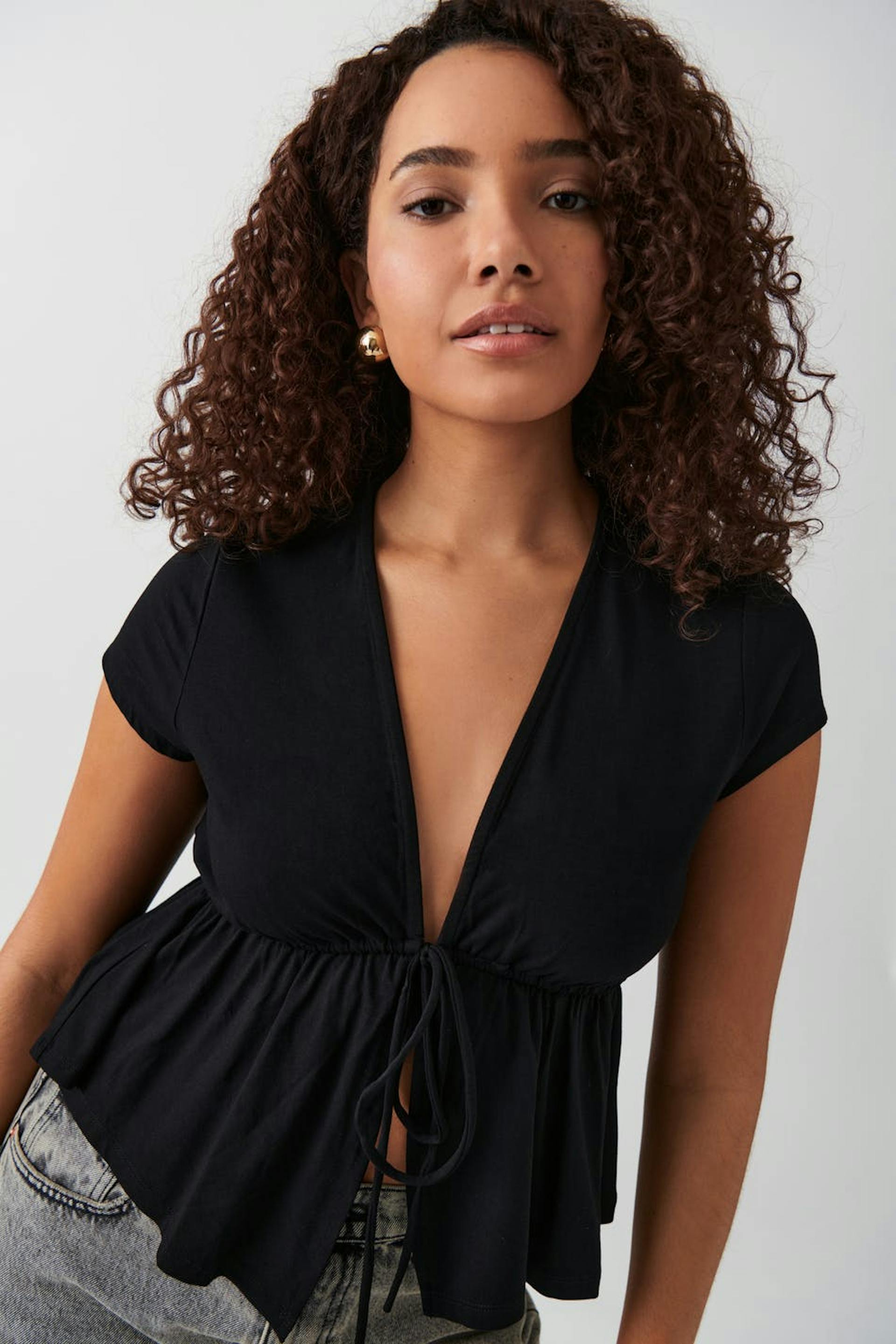 Kortärmad knyttopp i trikå med djup v-ringning. Toppen är svart och har knytdetalj framtill.