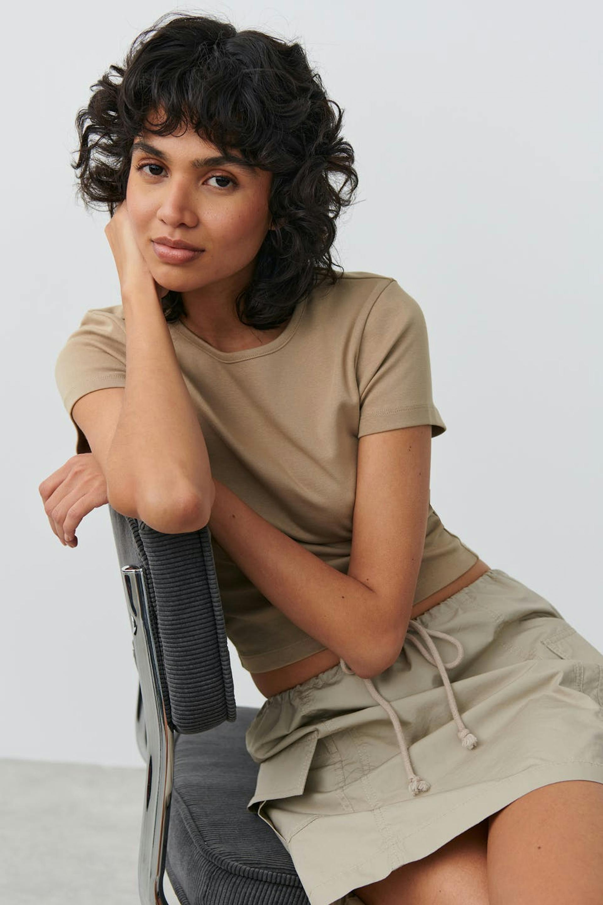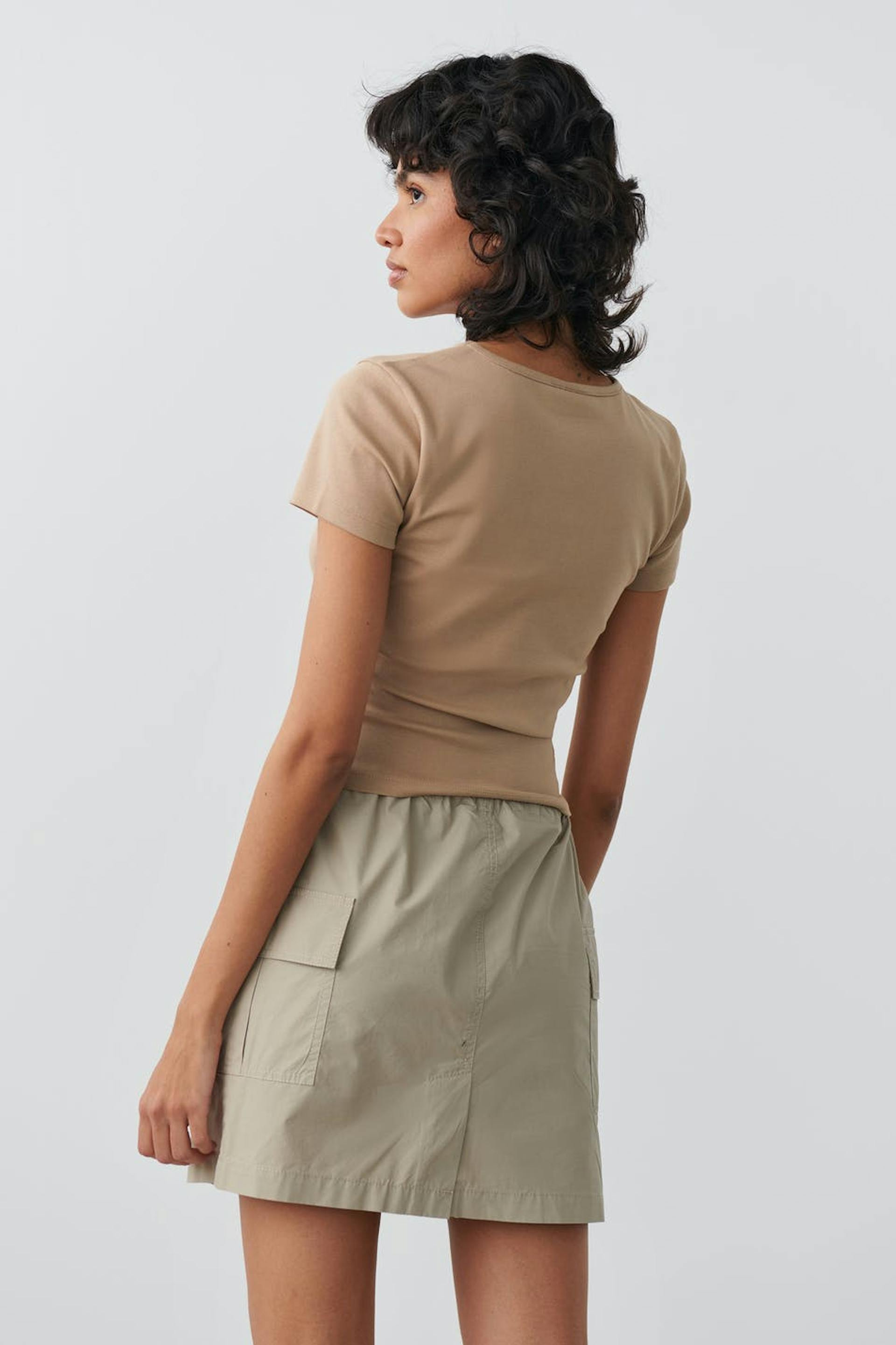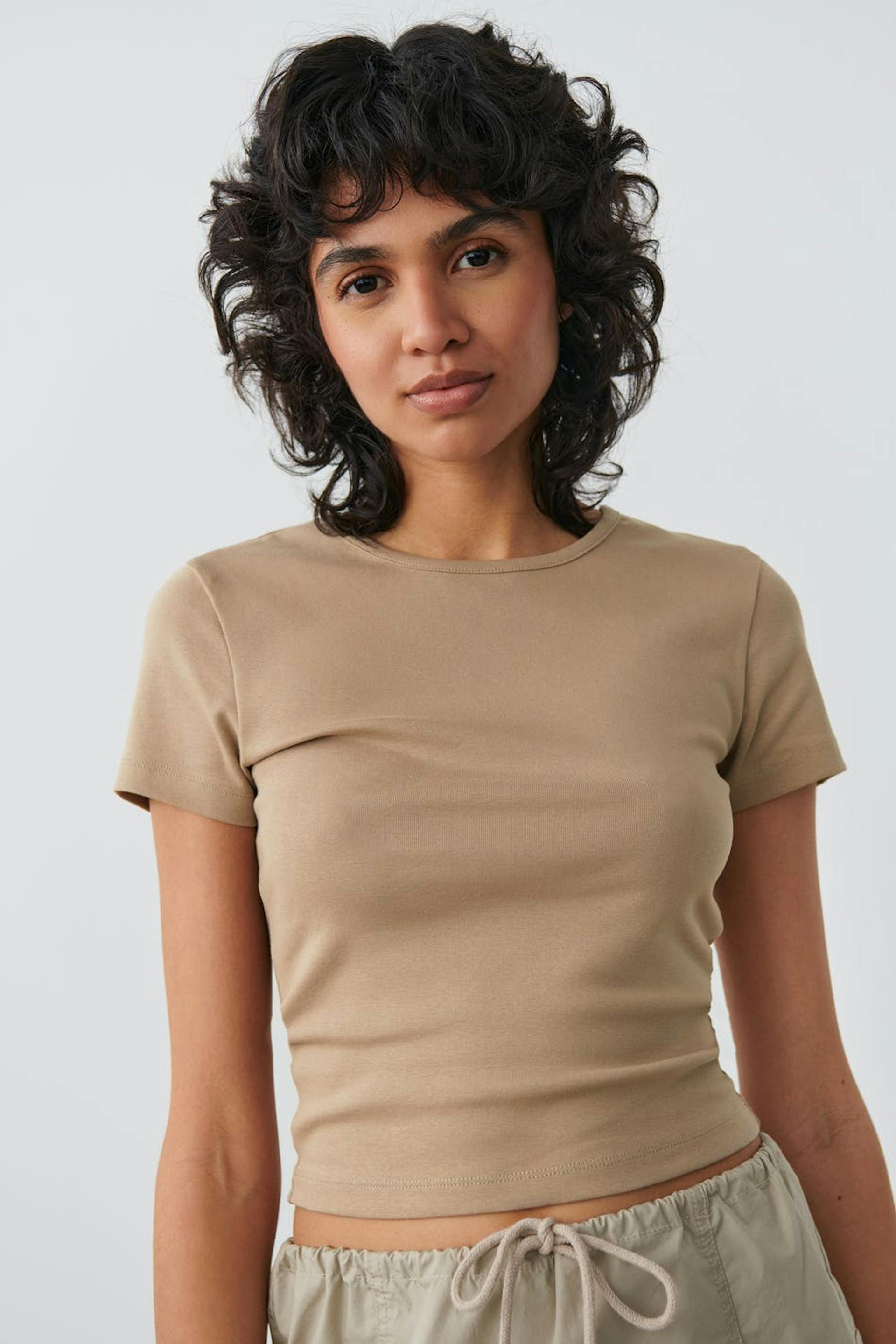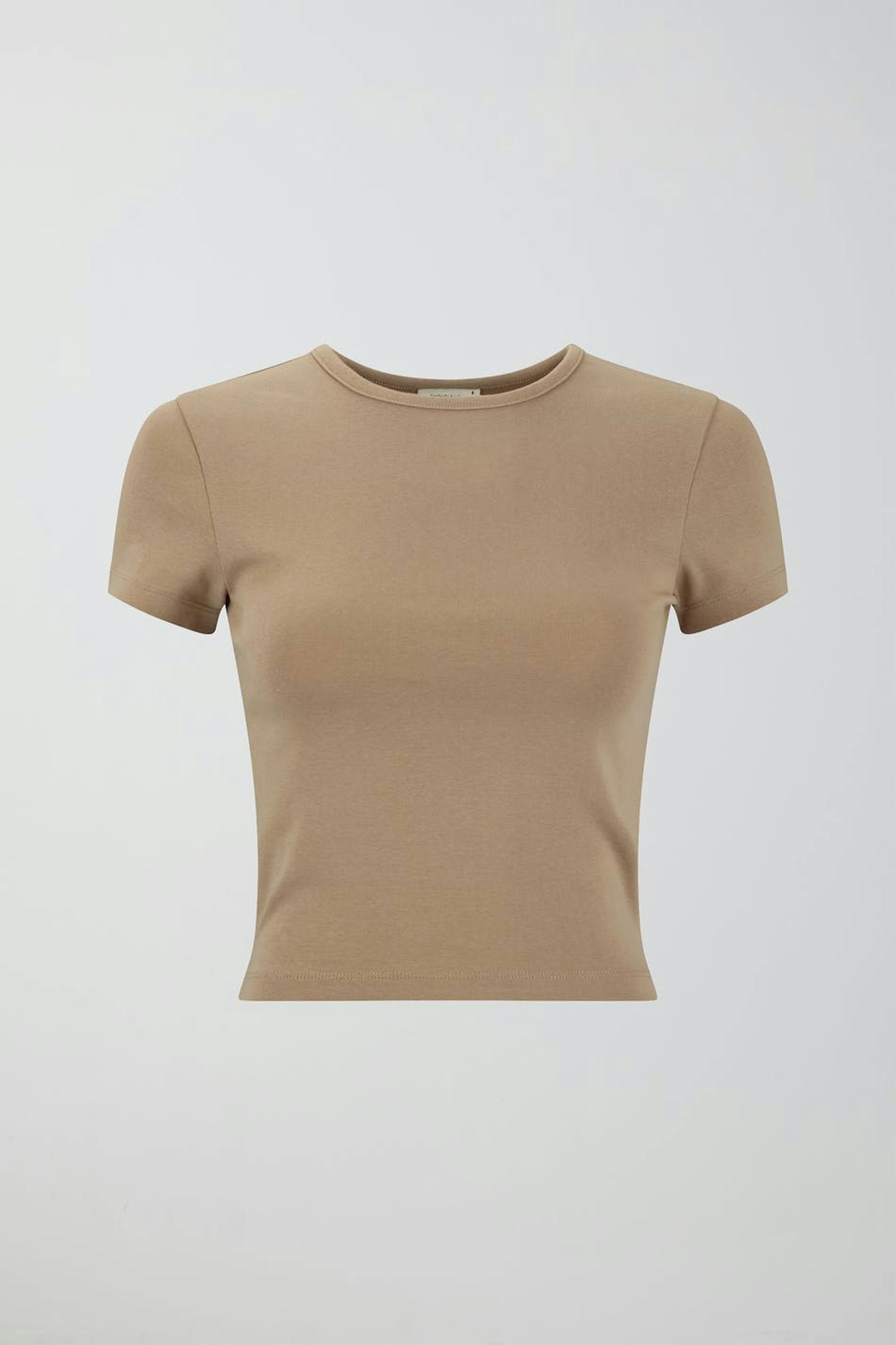 Kortärmad topp med figurnära passform. Toppen är beige och har en croppad längd.