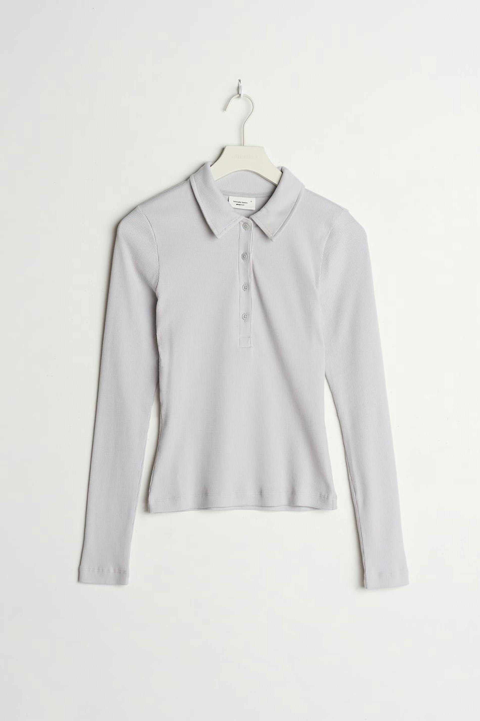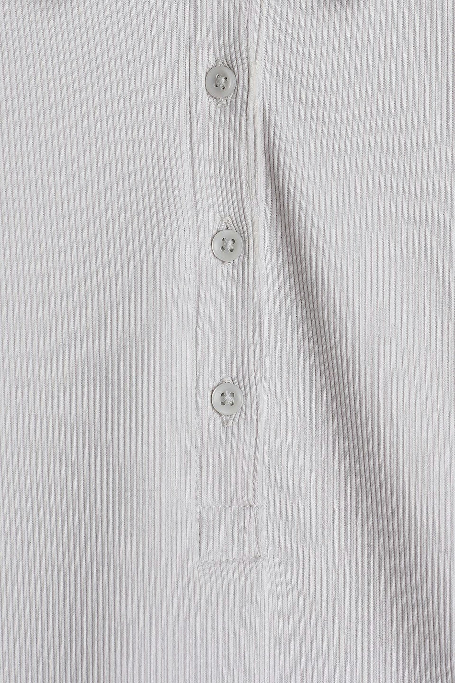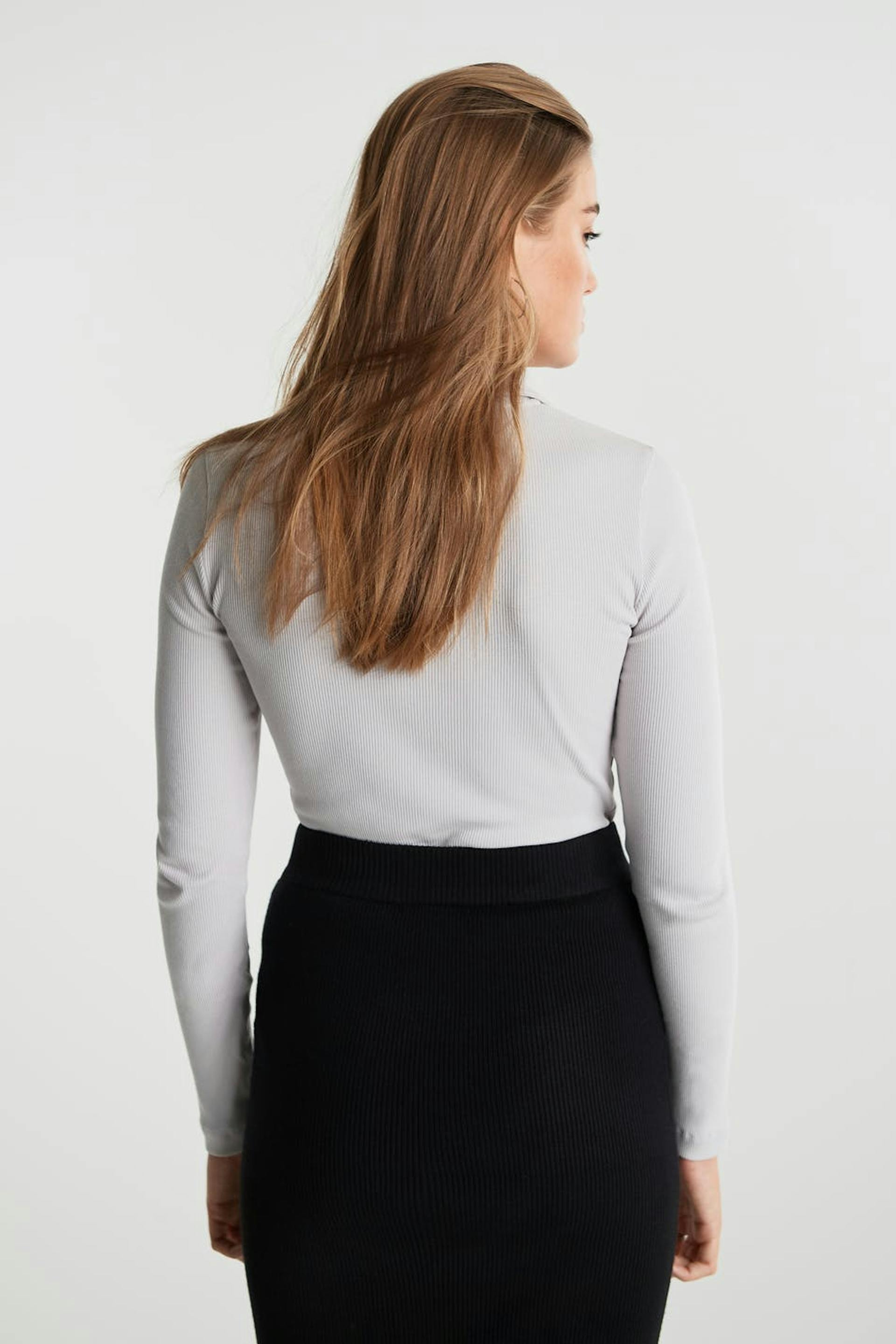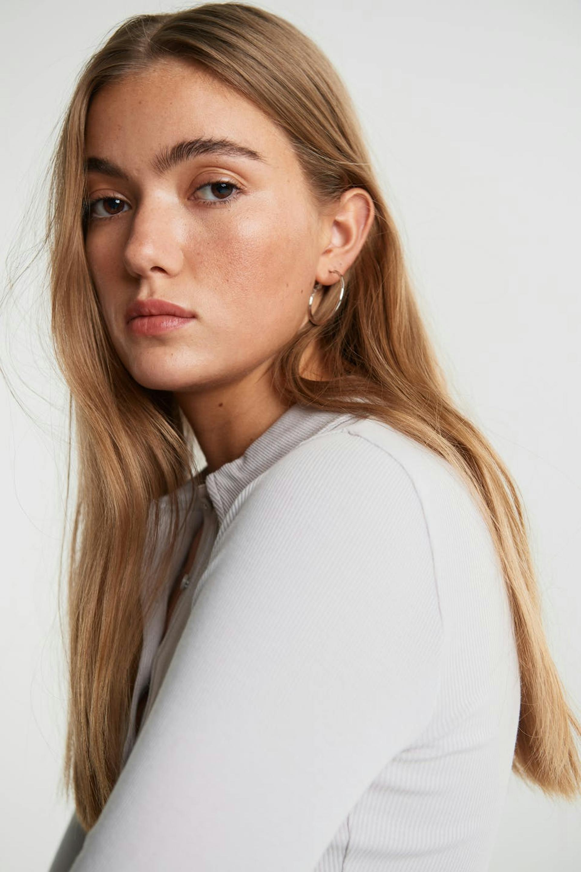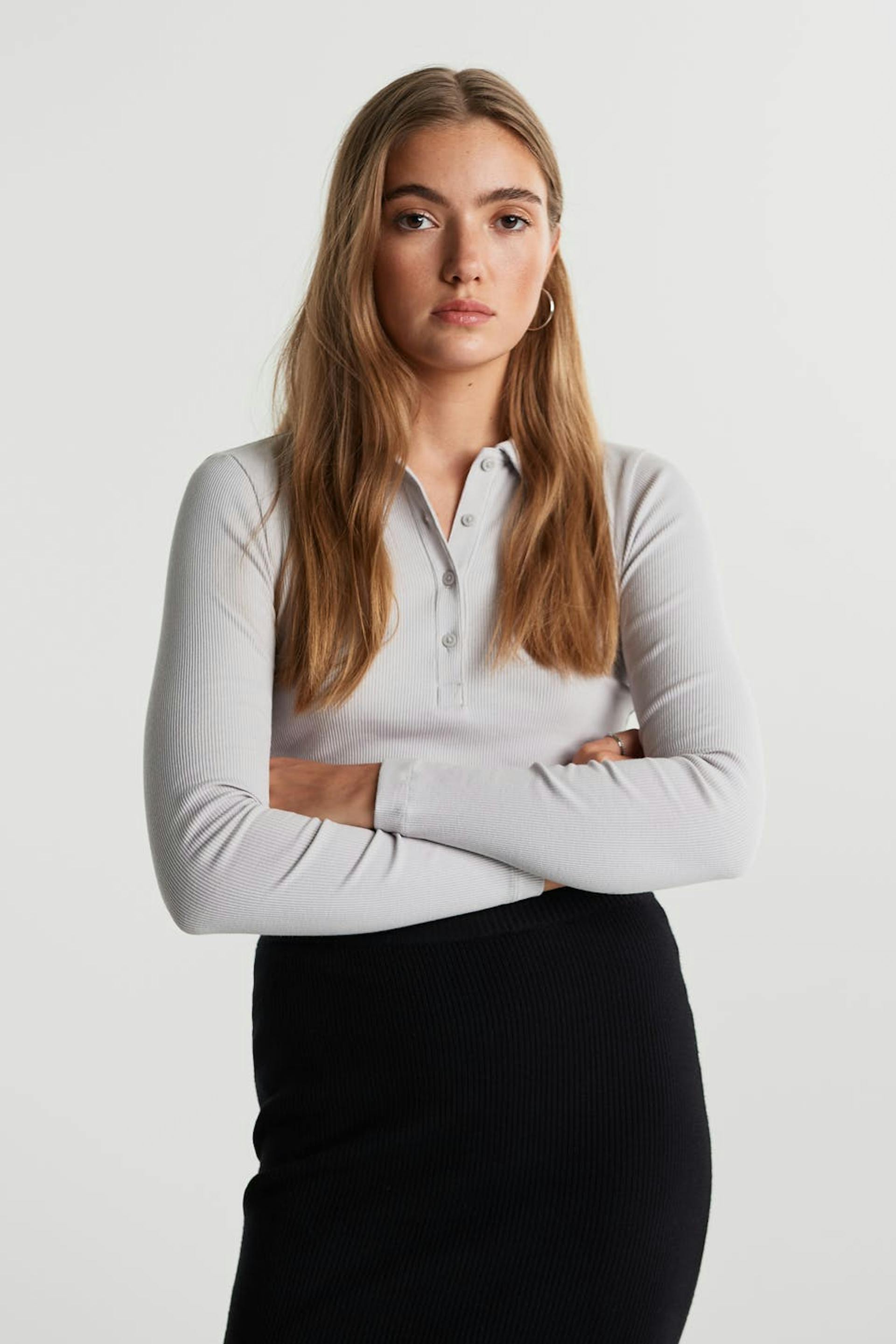 Långärmad topp med en figurnära passform. Toppen är grå och ribbad och har knappar vid halsringningen. Den har en krage.