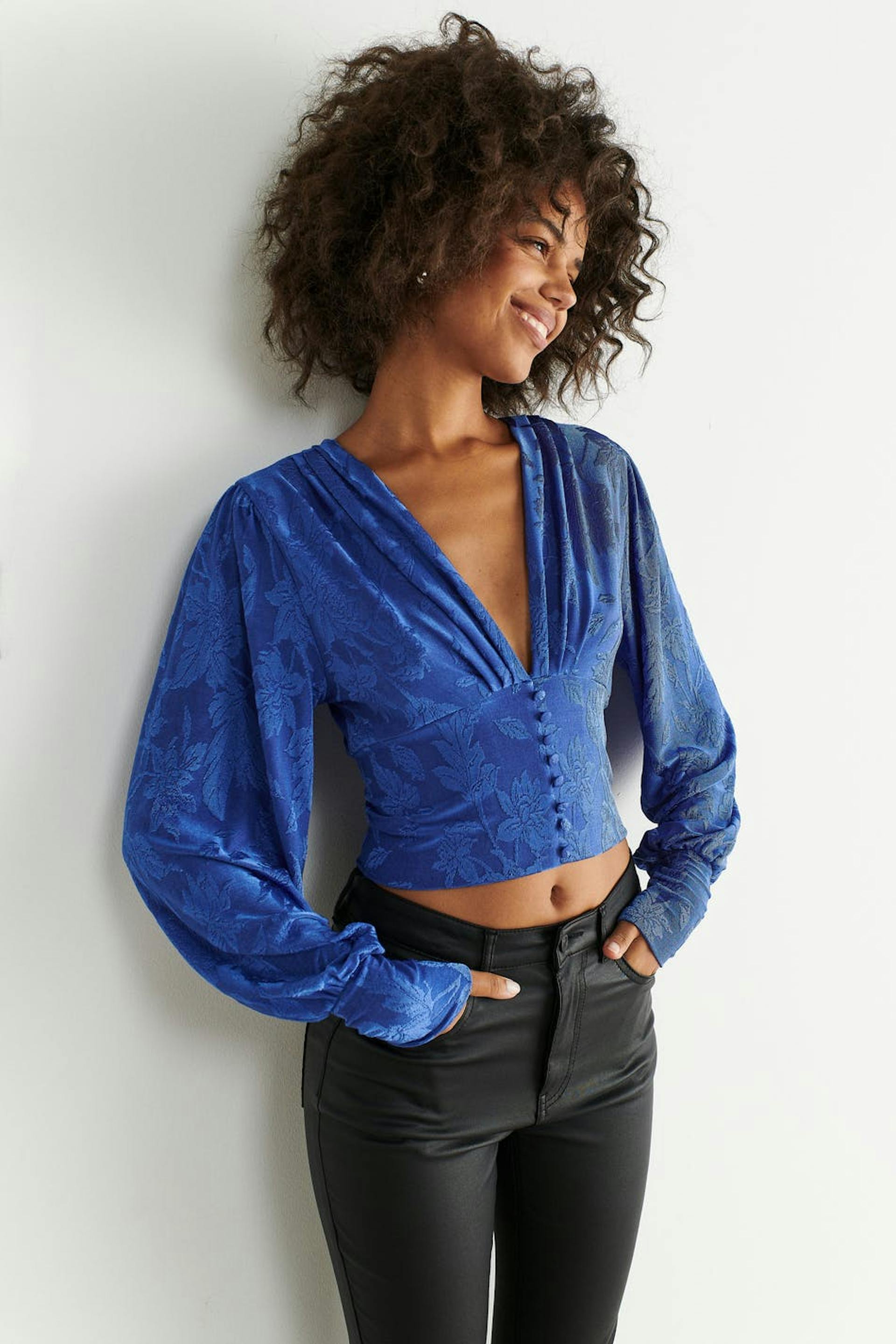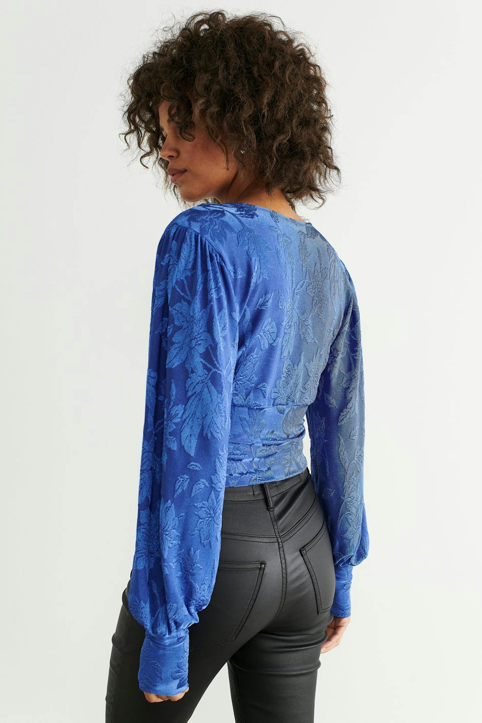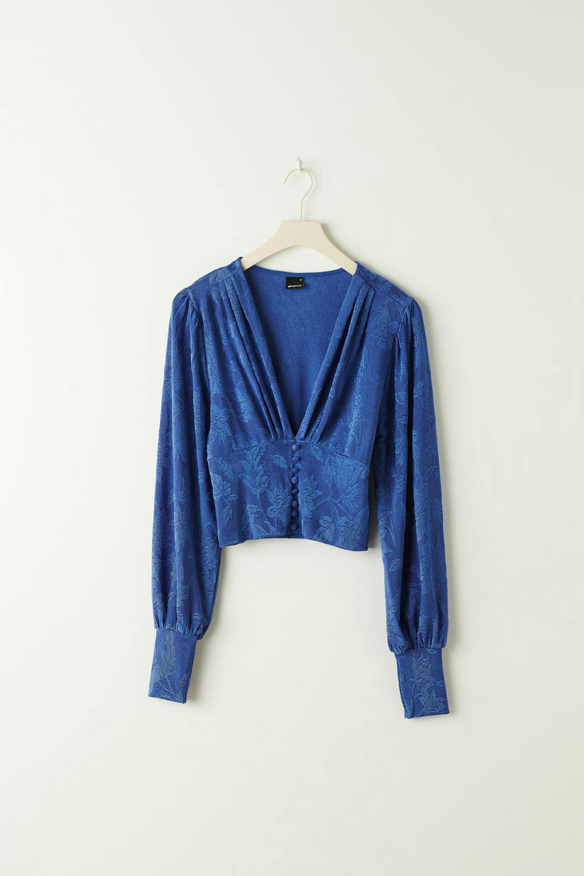 Långärmad topp i trikå med djup v-ringning. Toppen är blå och har ett stretchigt, texturerat material. Den har ballongärmar och en croppad längd.