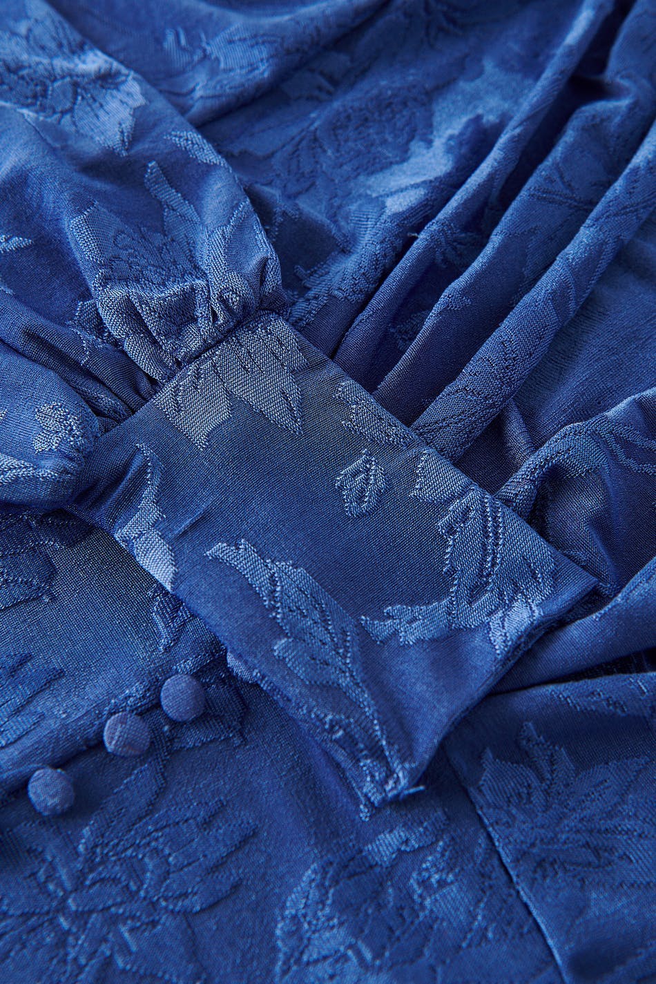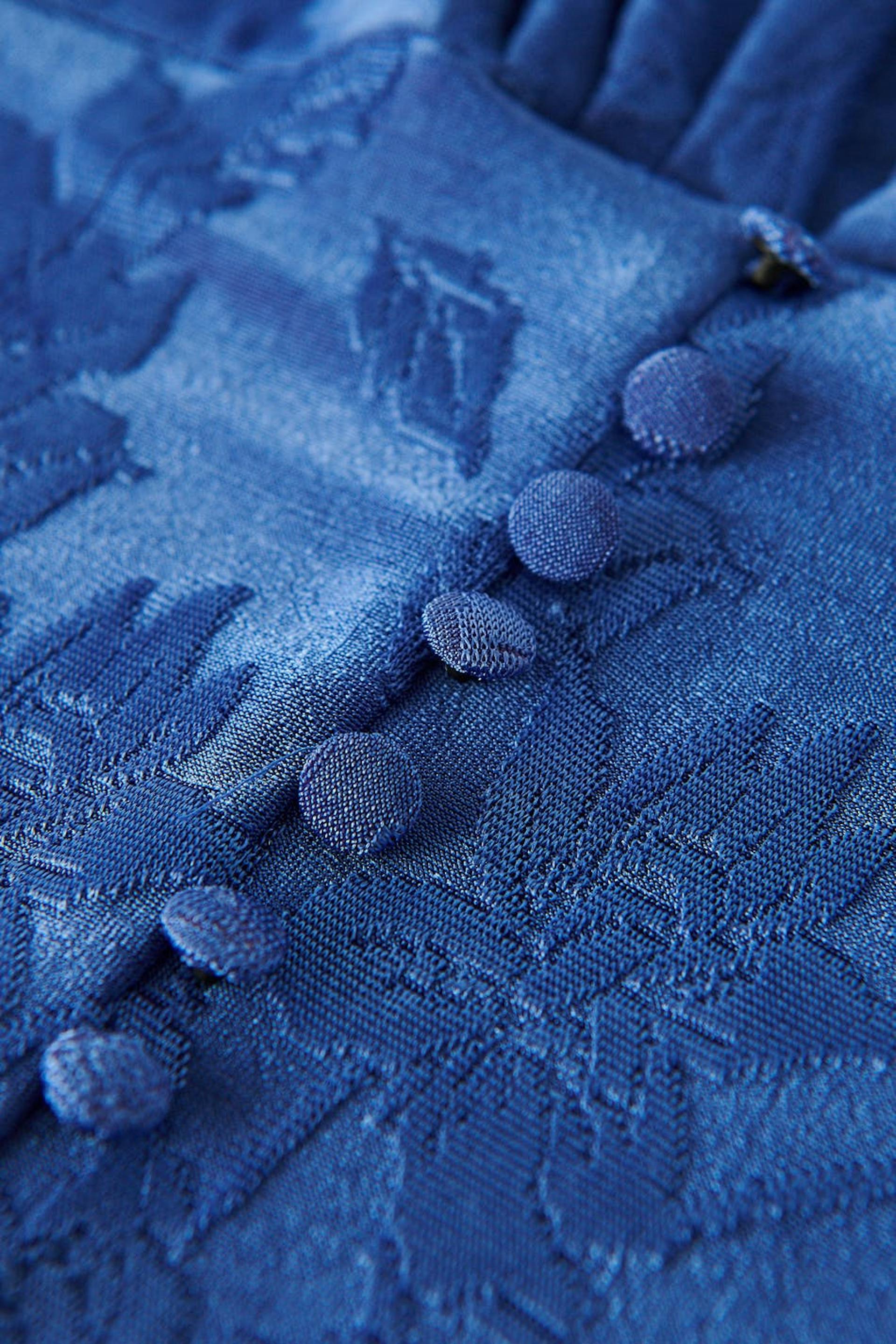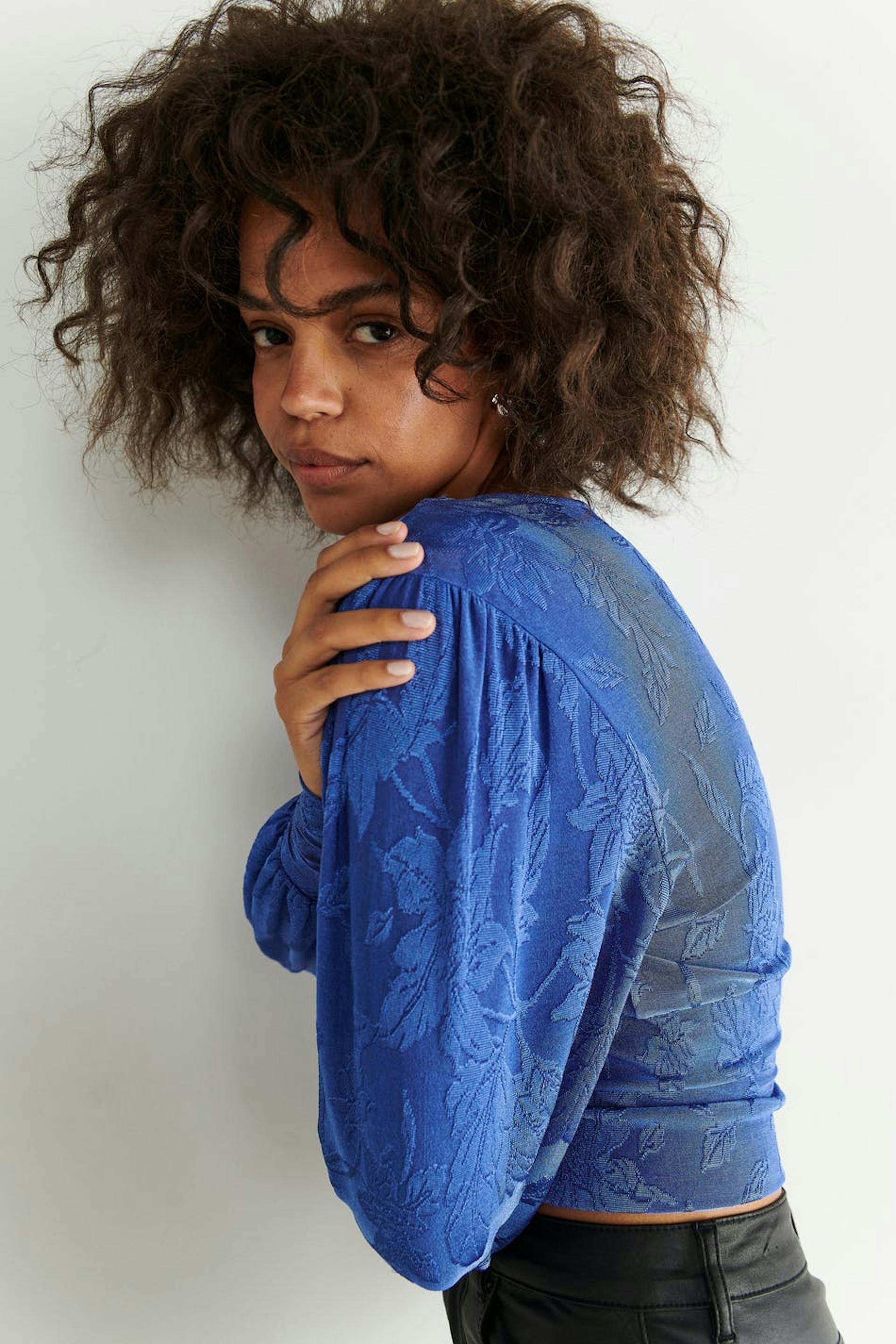 Långärmad topp i trikå med djup v-ringning. Toppen är blå och har ett stretchigt, texturerat material. Den har ballongärmar och en croppad längd.