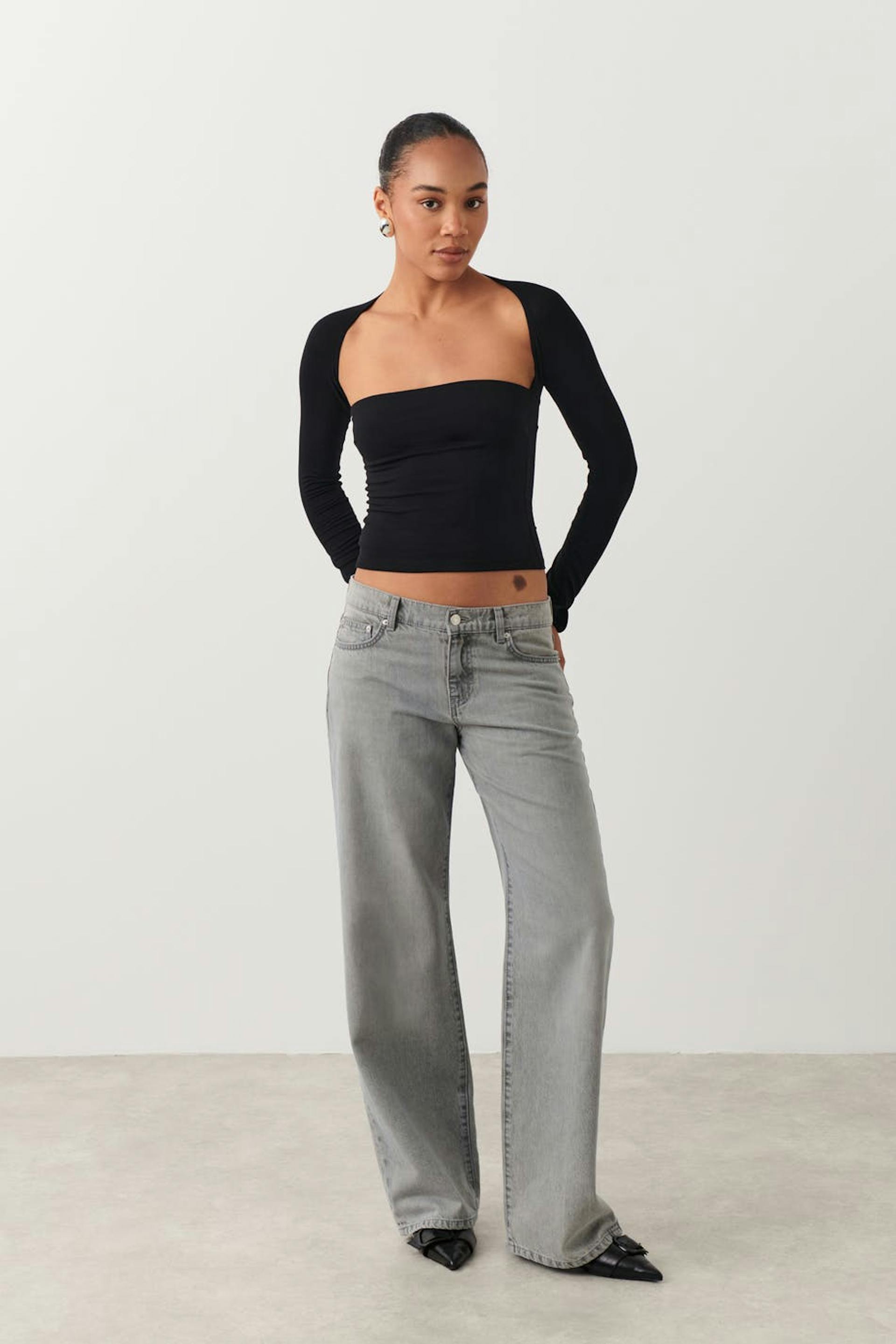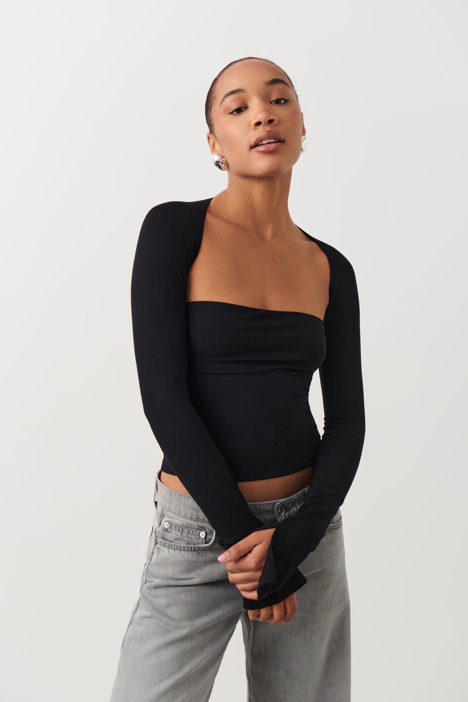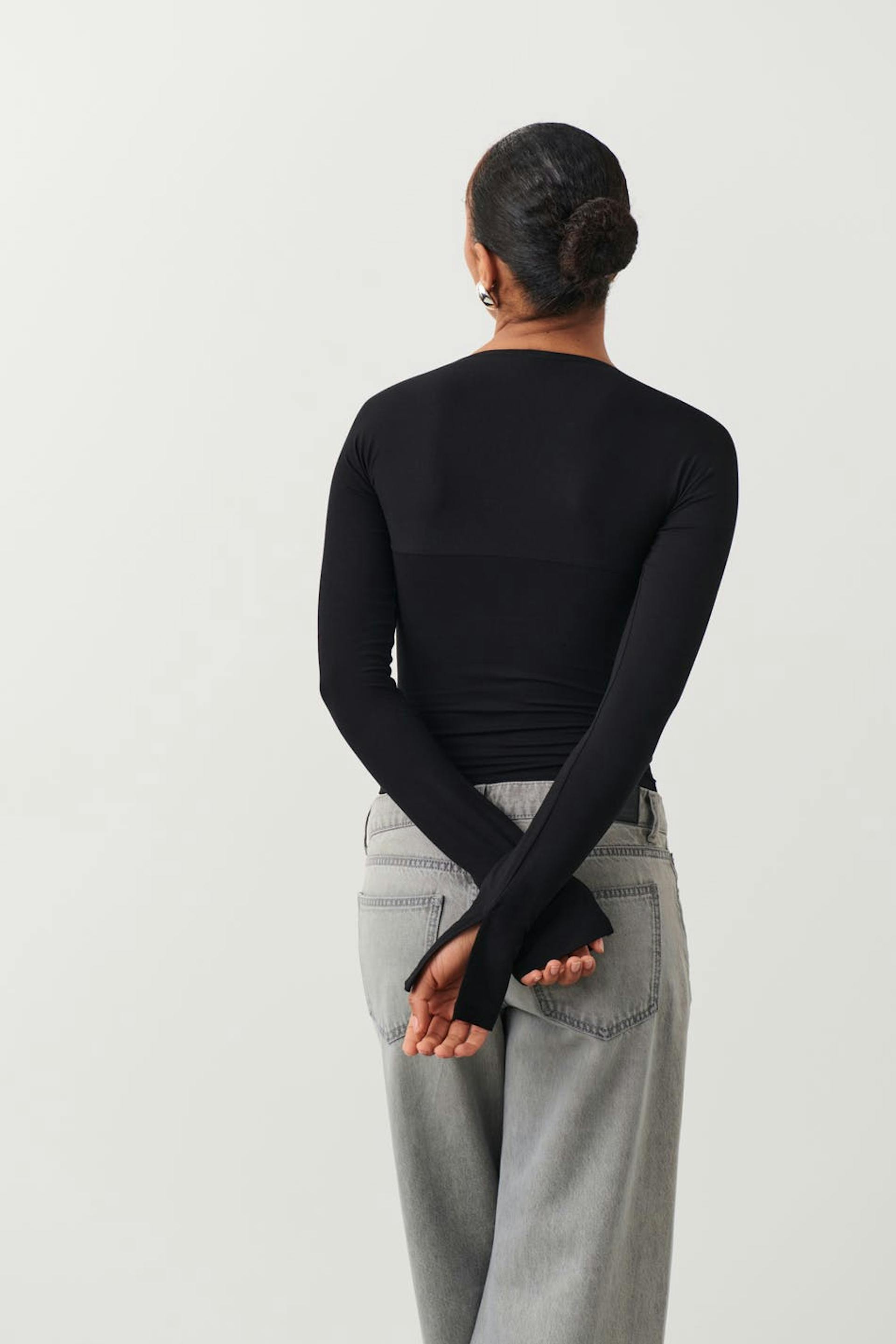Soft touch – second skin comfort. Långärmad topp i mjuk viskos med fyrkantig halsringning. Toppen är svart och har figurnära passform. Den har slits vid ärmsluten och croppad längd.