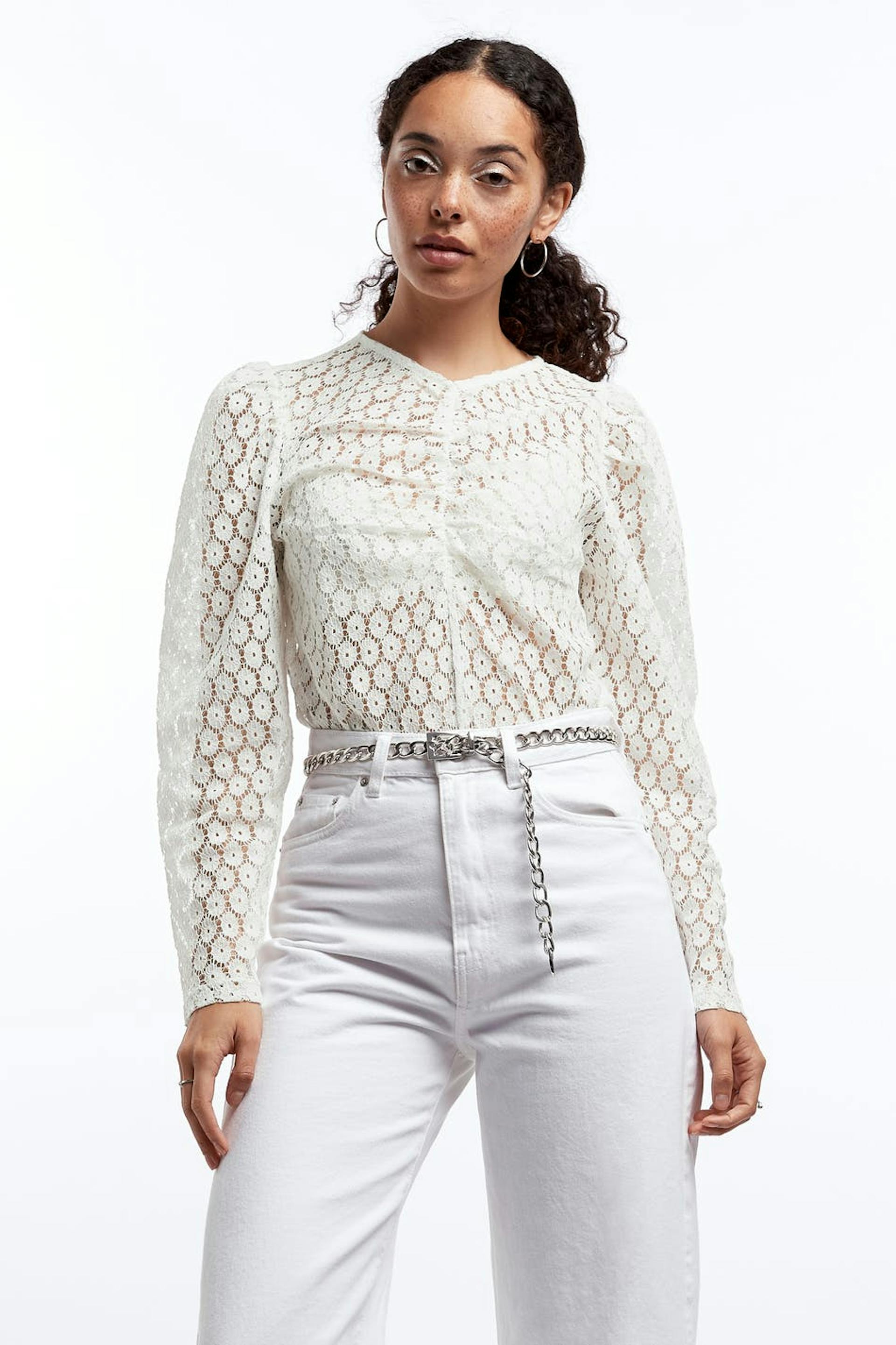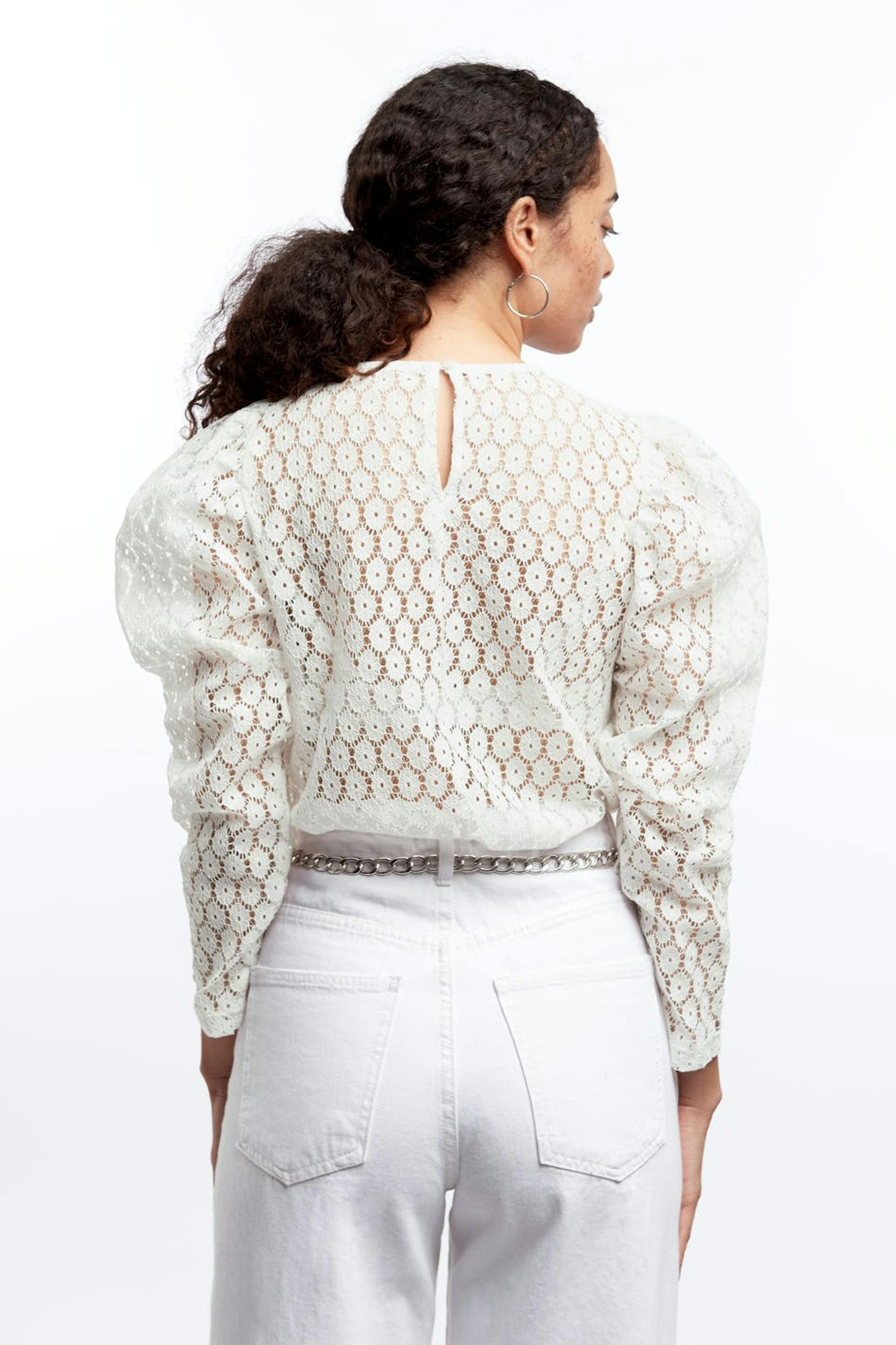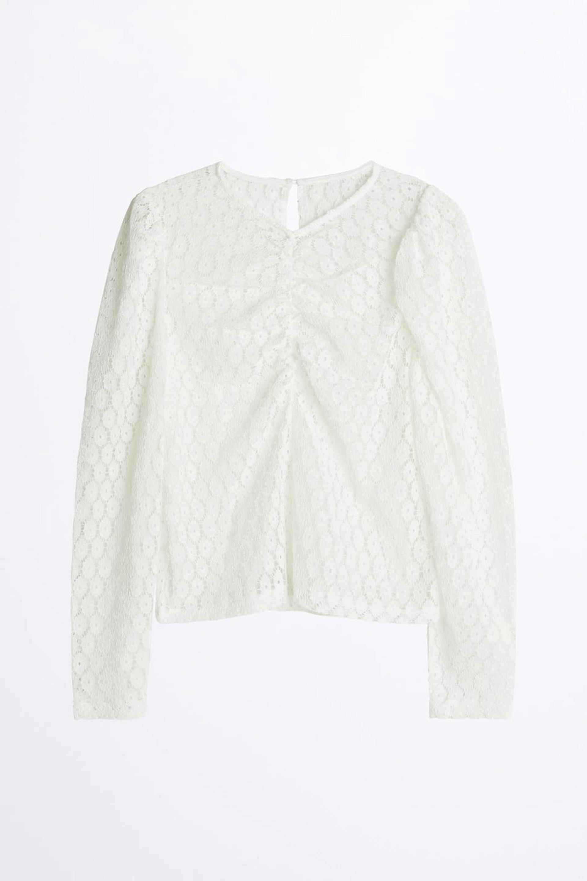 Långärmad blus med en rynkning framtill. Blusen är vit och blommönstrad. Den är gjord av spets.