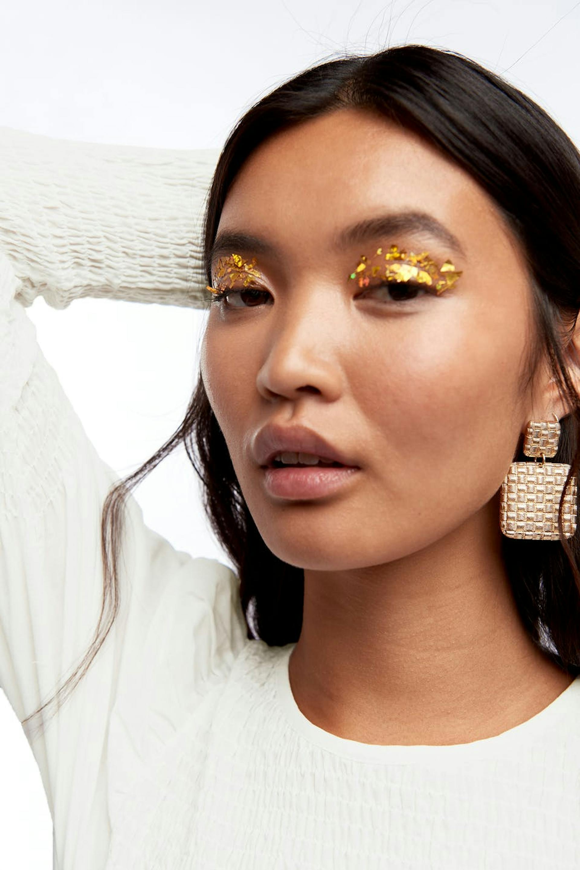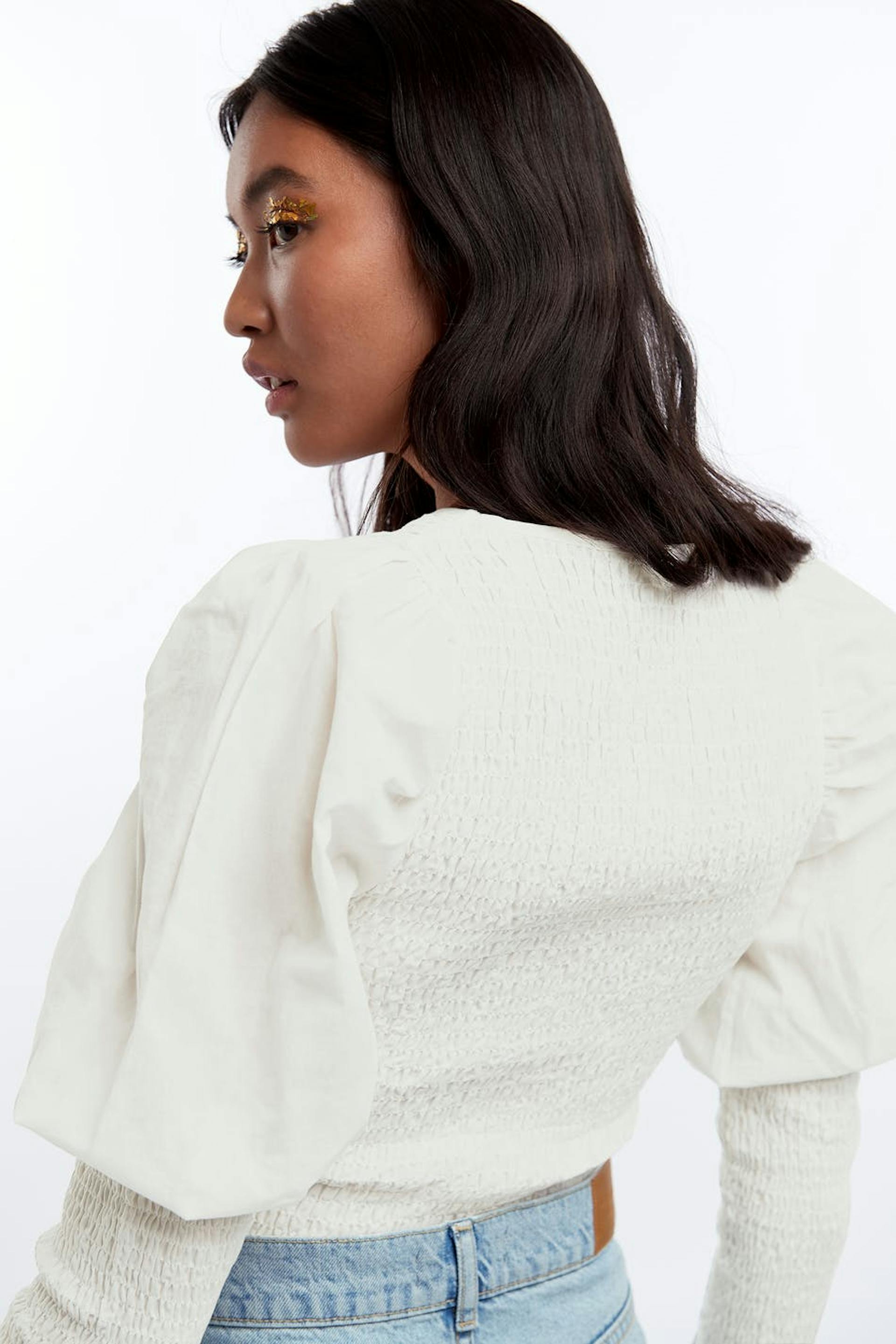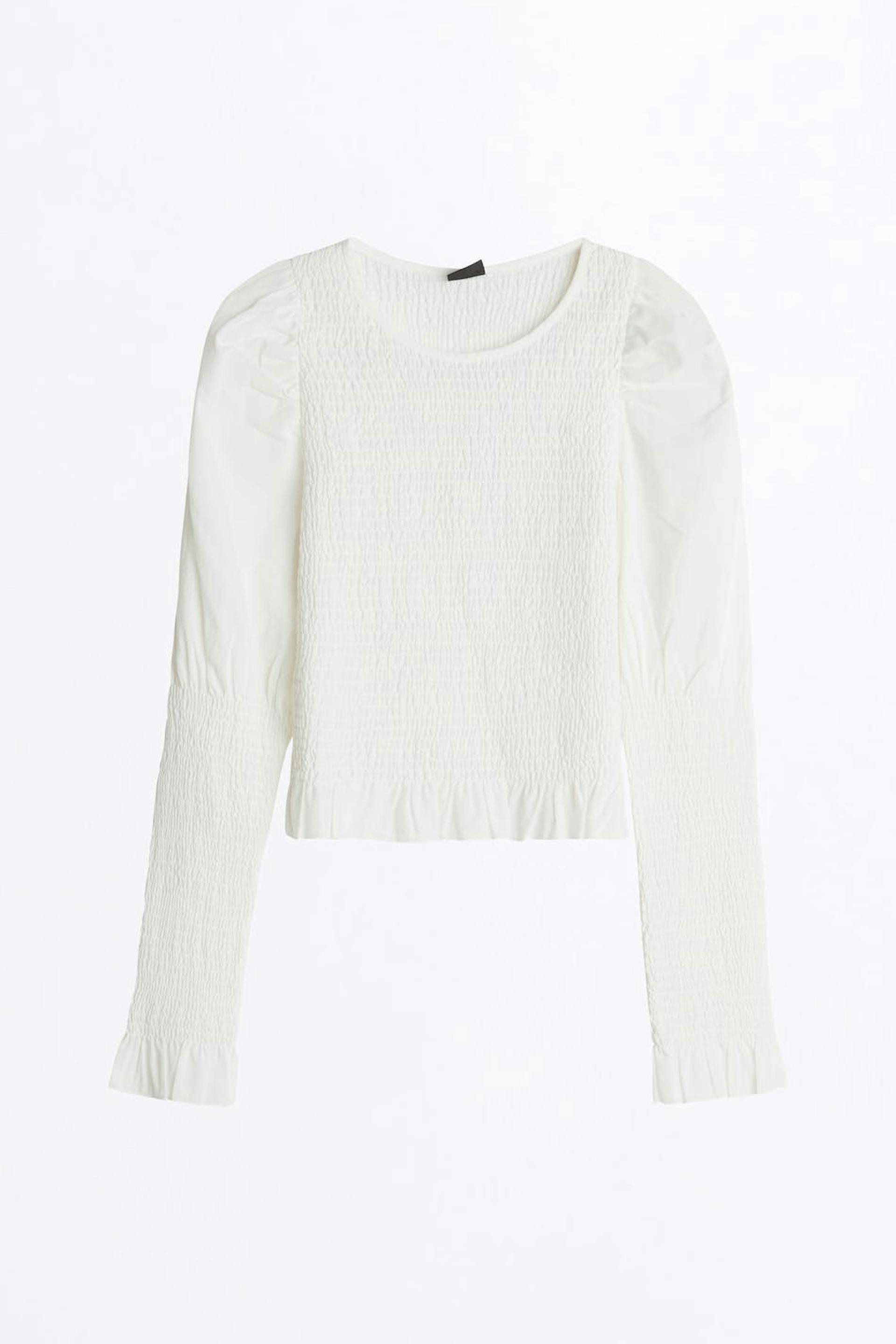 En figurnära topp i bomull med smockat fram- och bakstycke med volang nedtill. Toppen har puffärm med smockat ärmslut.