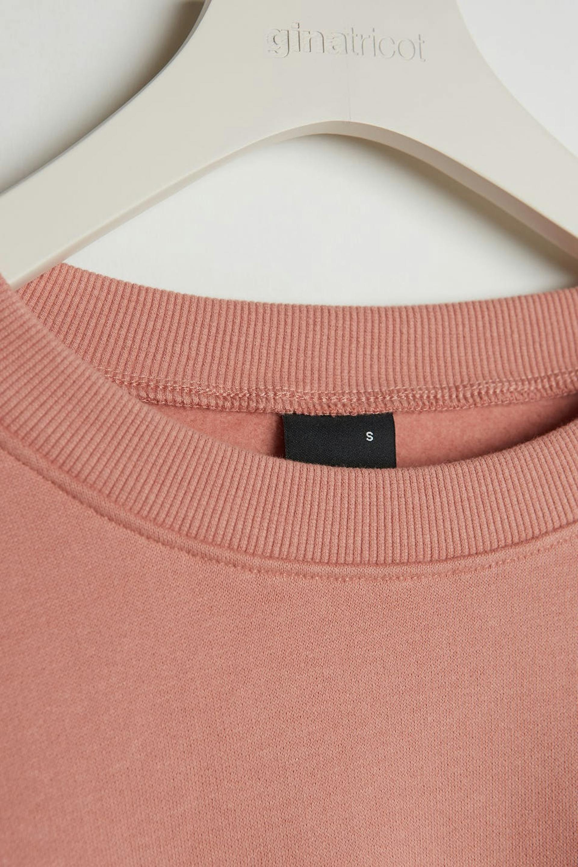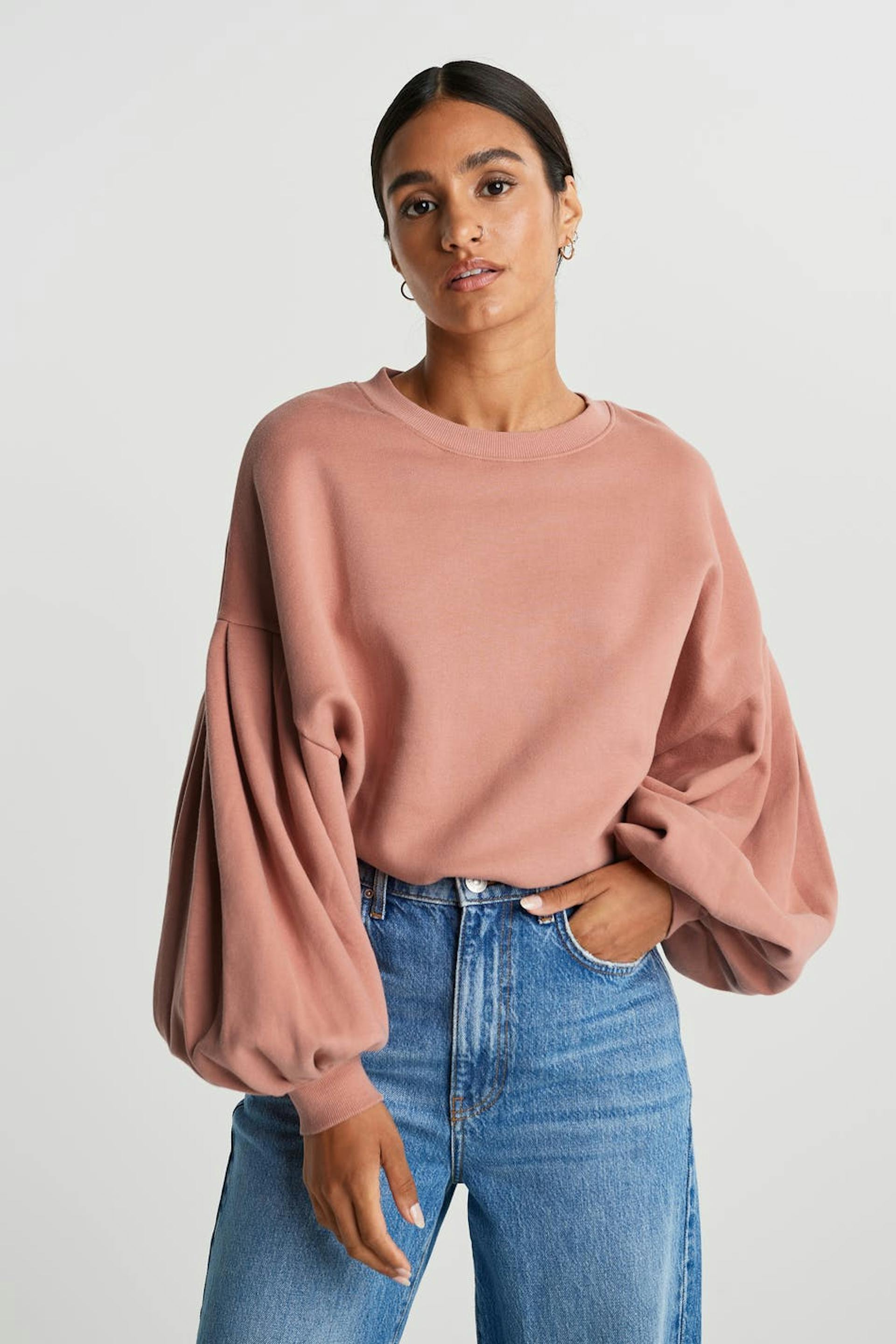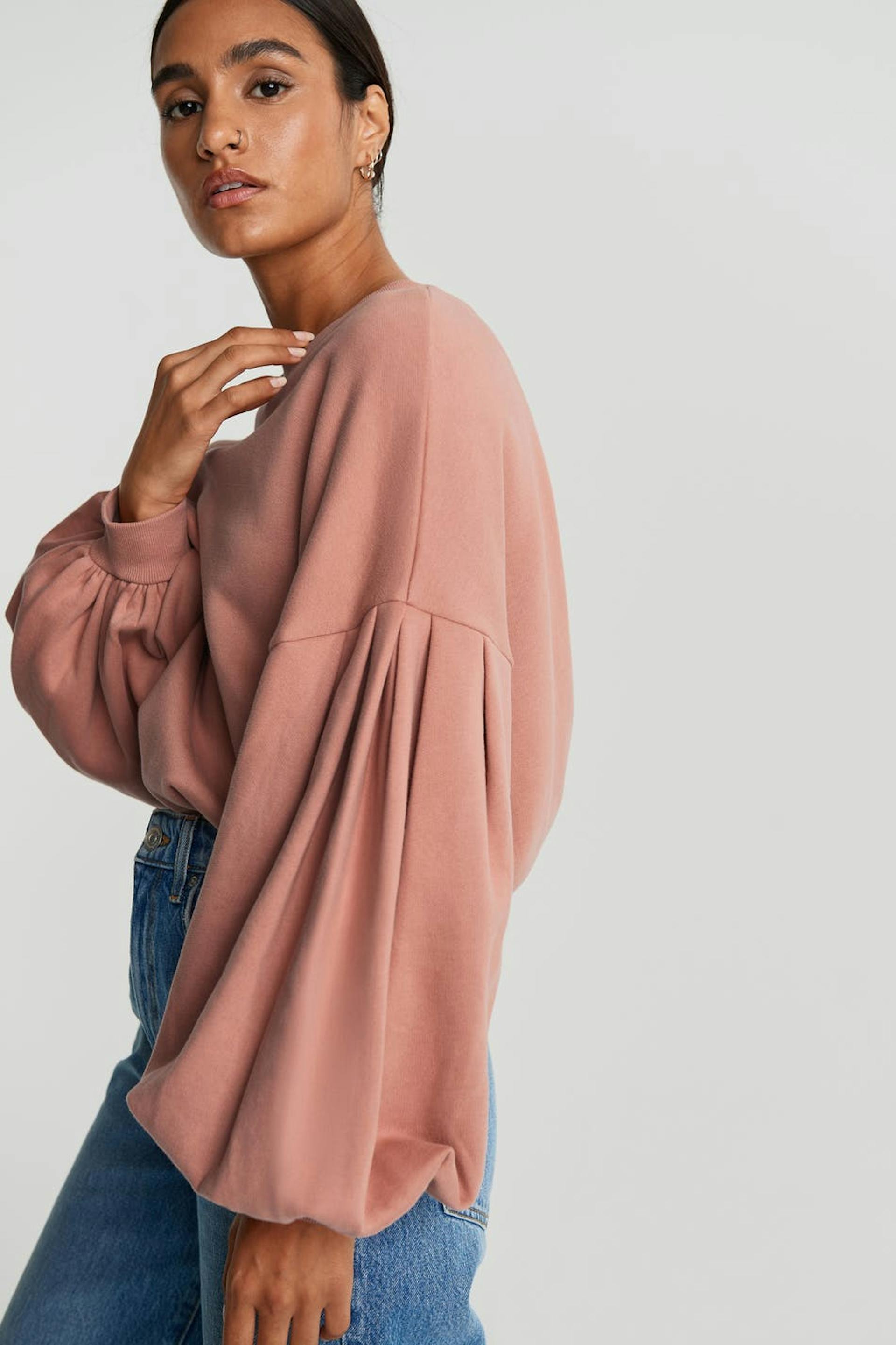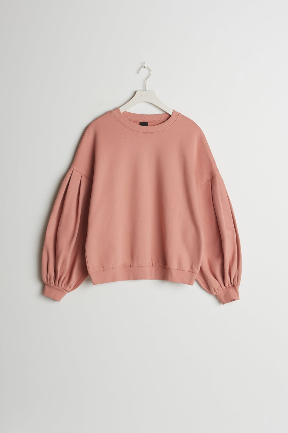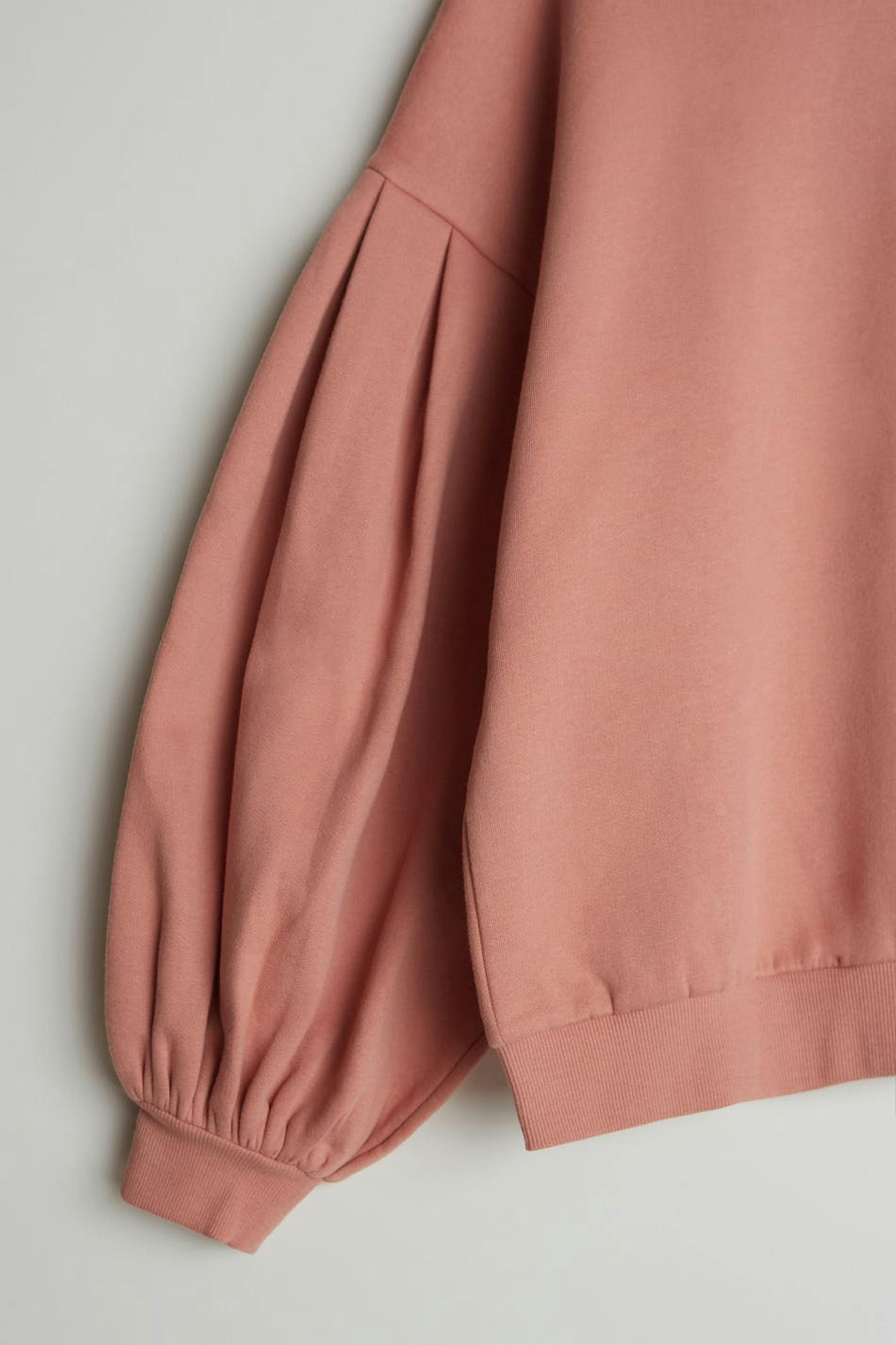 Collegetröja med oversize fit. Collegetröjan är rosa och har ballongärmar med en mudd vid ärmsluten. Den har nerhasade axlar med veck.