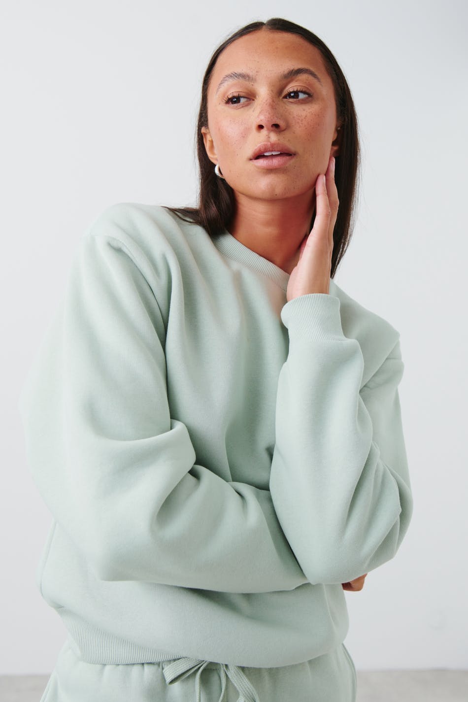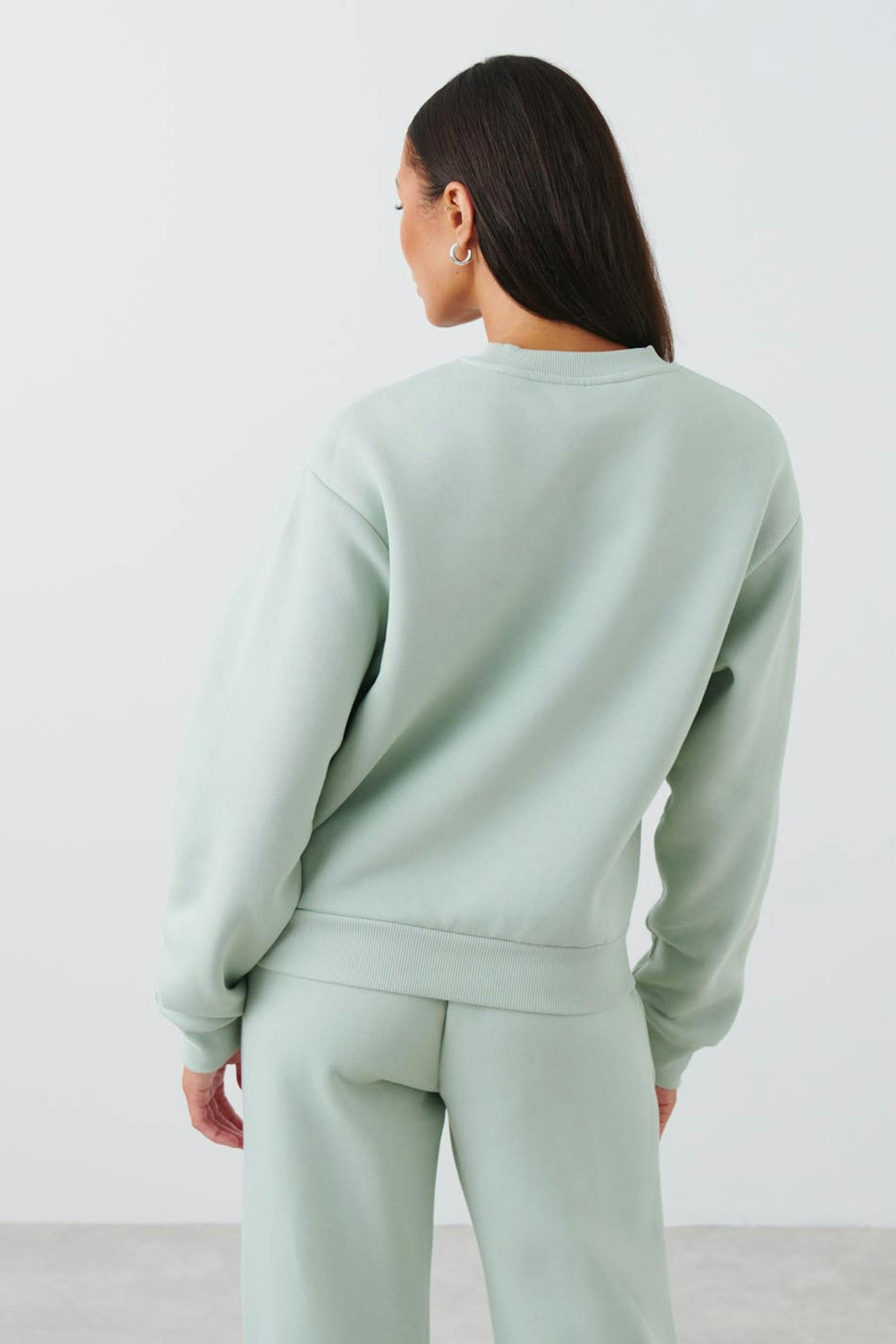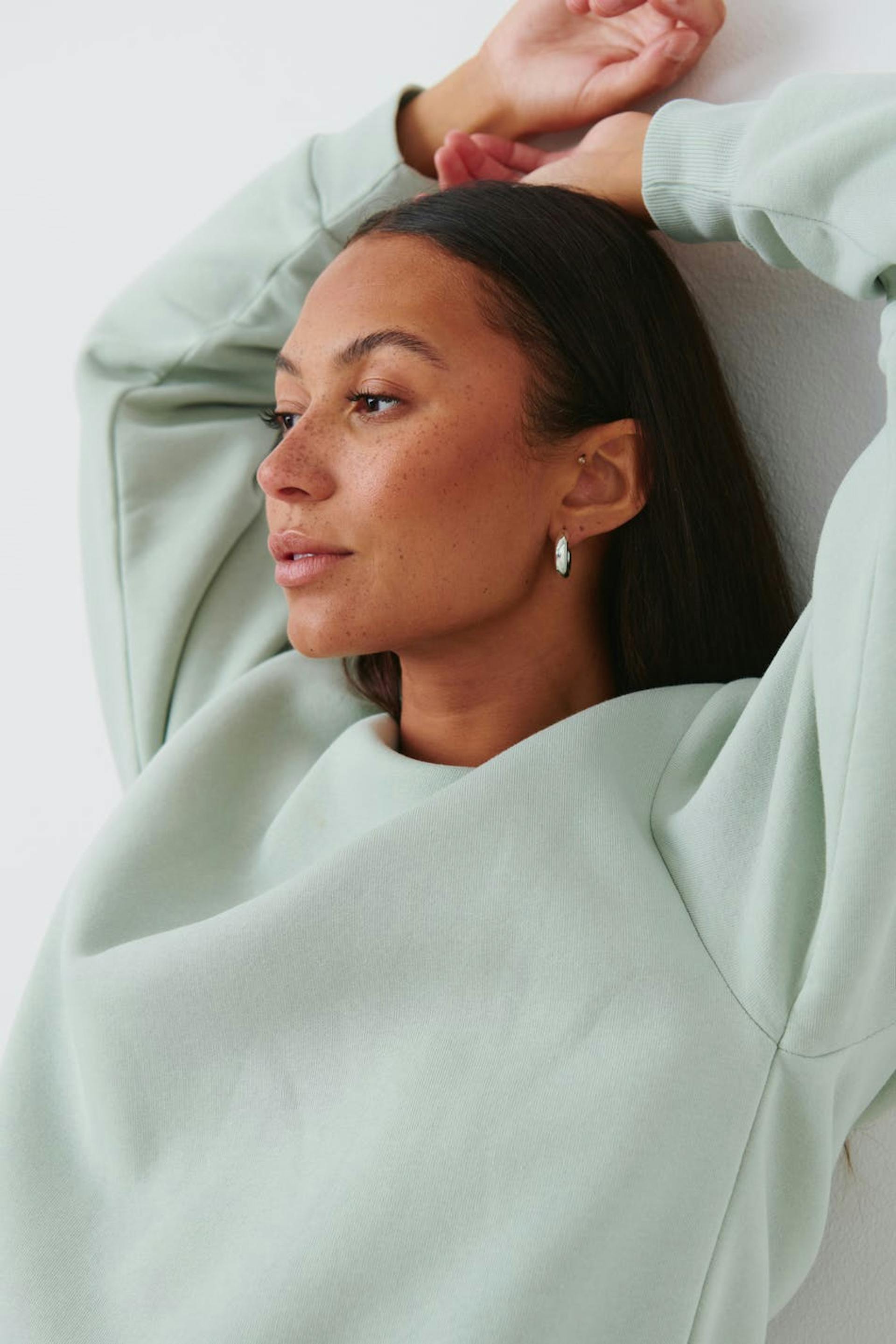 Mjuk sweatshirt med oversize fit. Sweatshirten är grön och har nedhasade axlar. Den har en rund halsringning och en ribbmudd vid ärmsluten och på nederfållen.