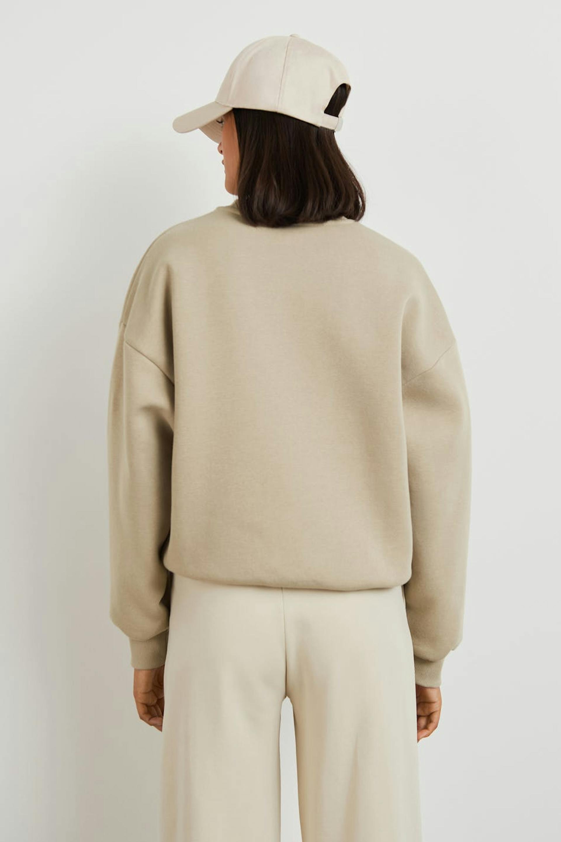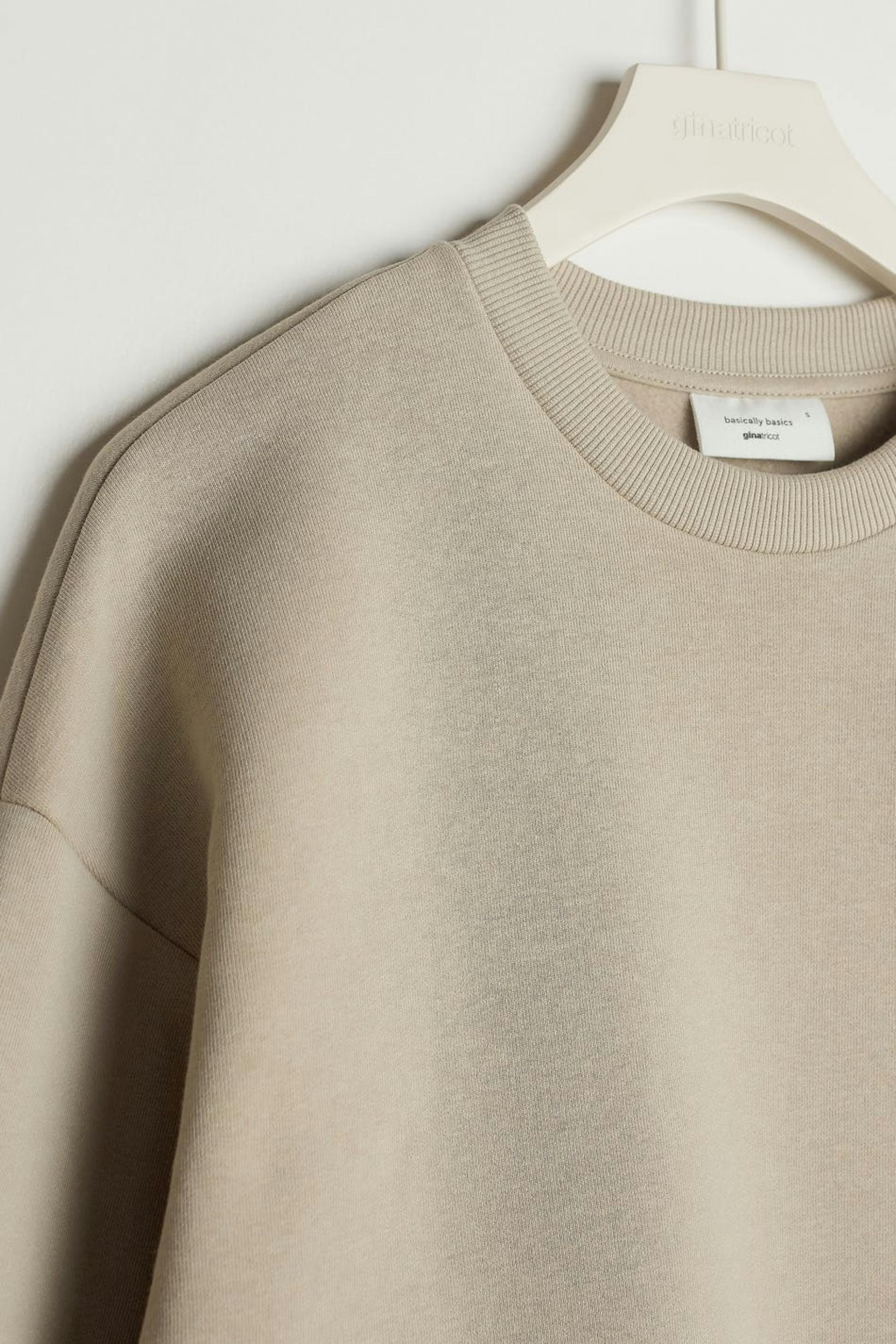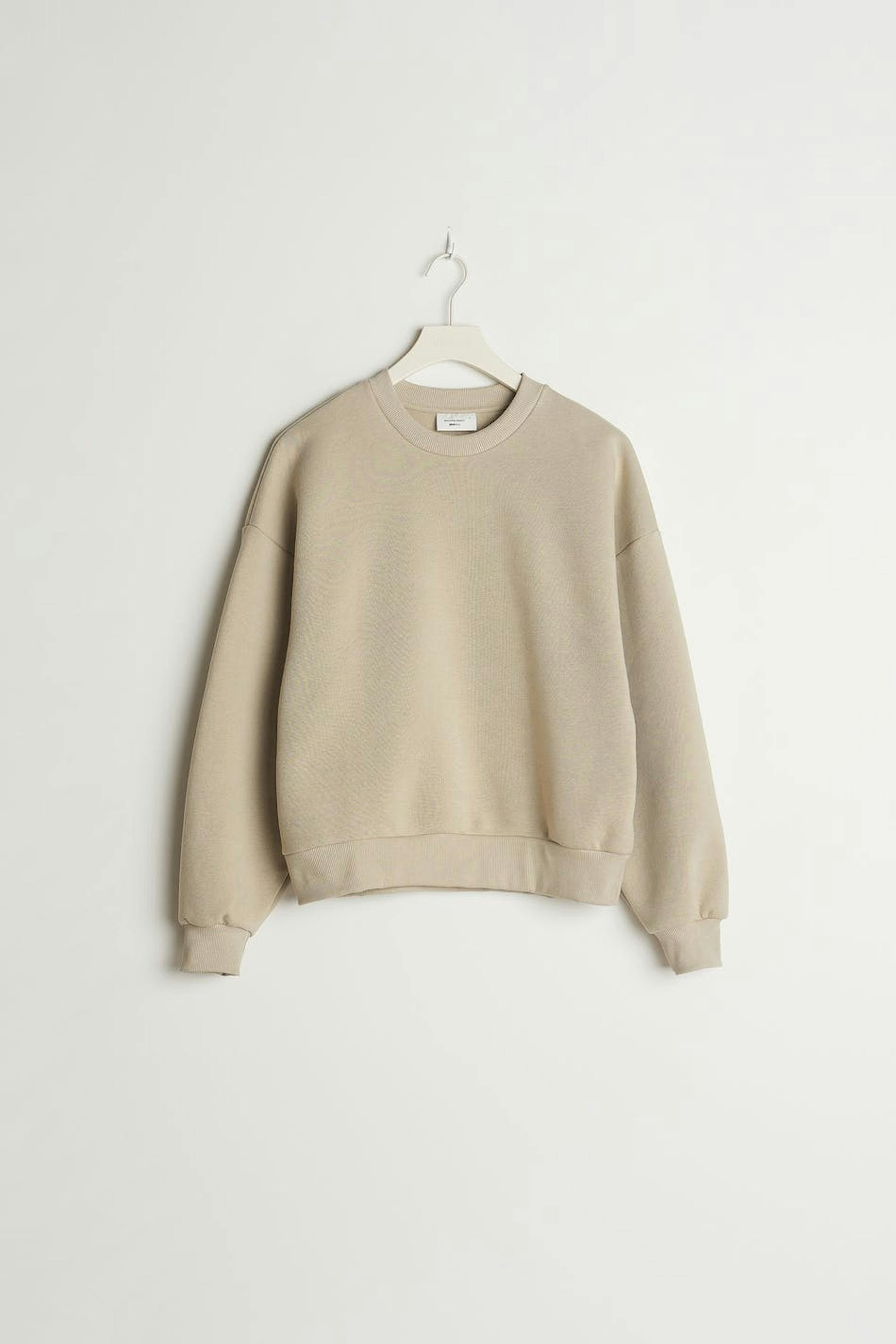 Mjuk collegetröja med oversize fit. Collegetröjan är beige och långärmad och har nedhasade axlar. Den har en rund halsringning och en ribbmudd vid ärmsluten och på nederfållen.