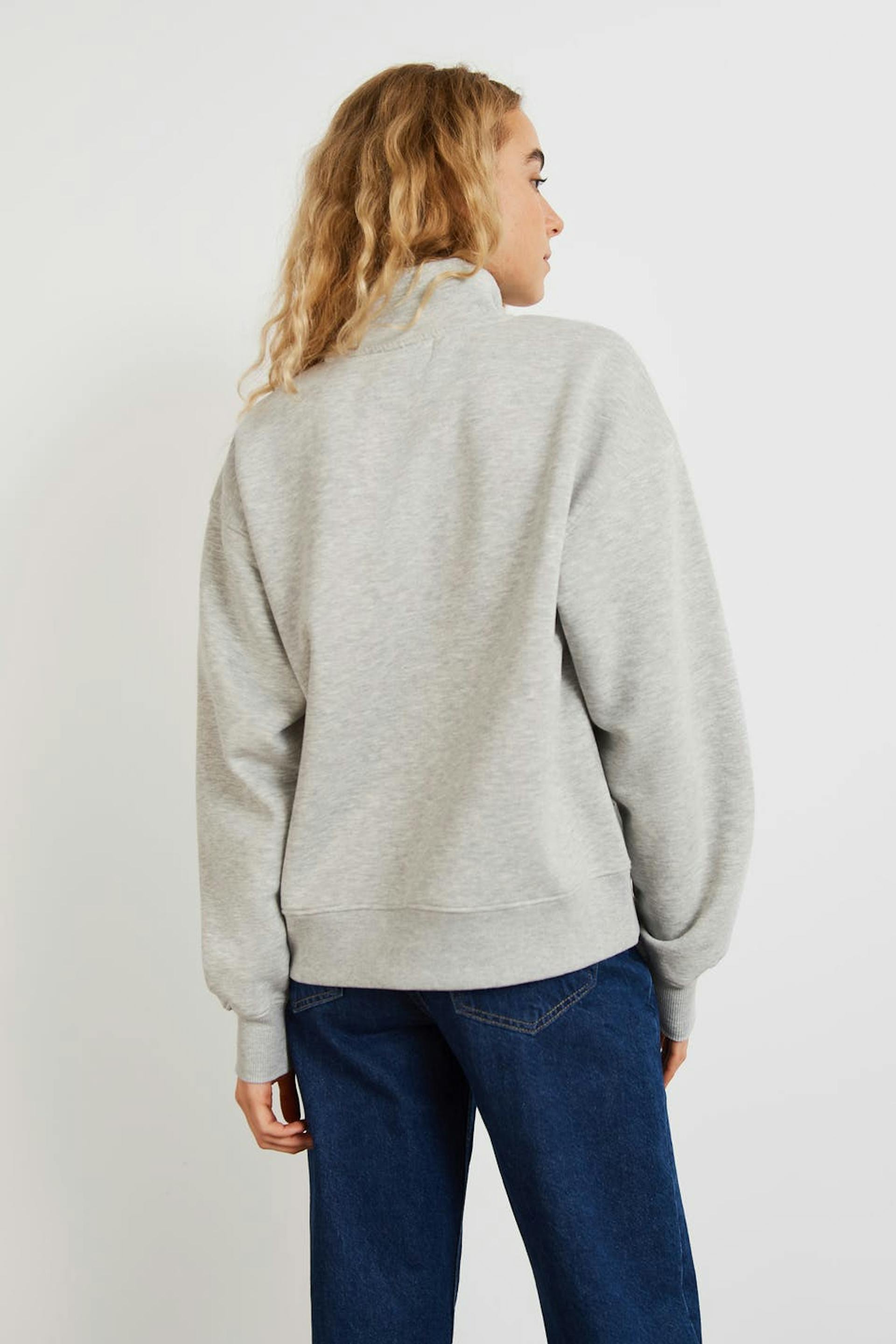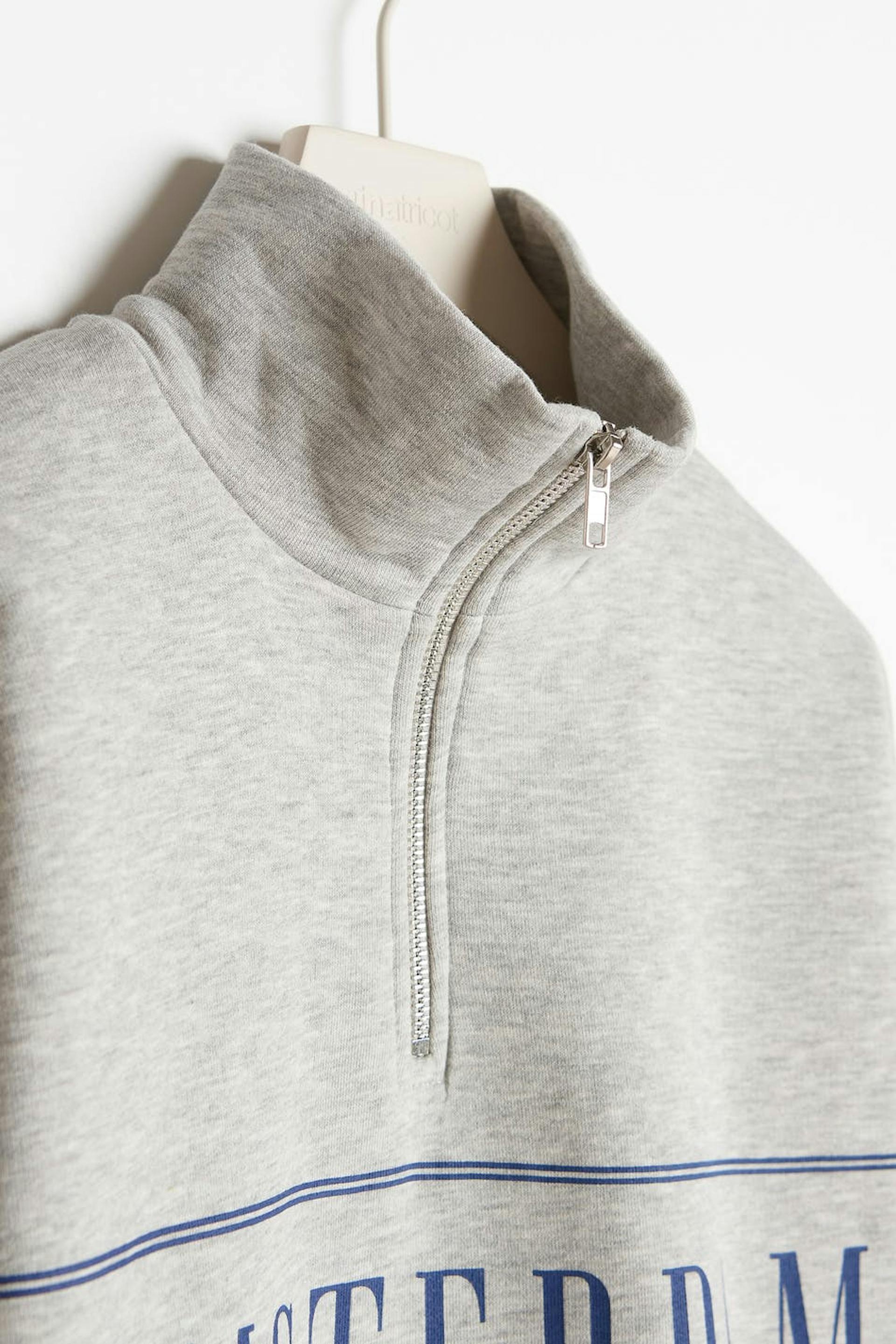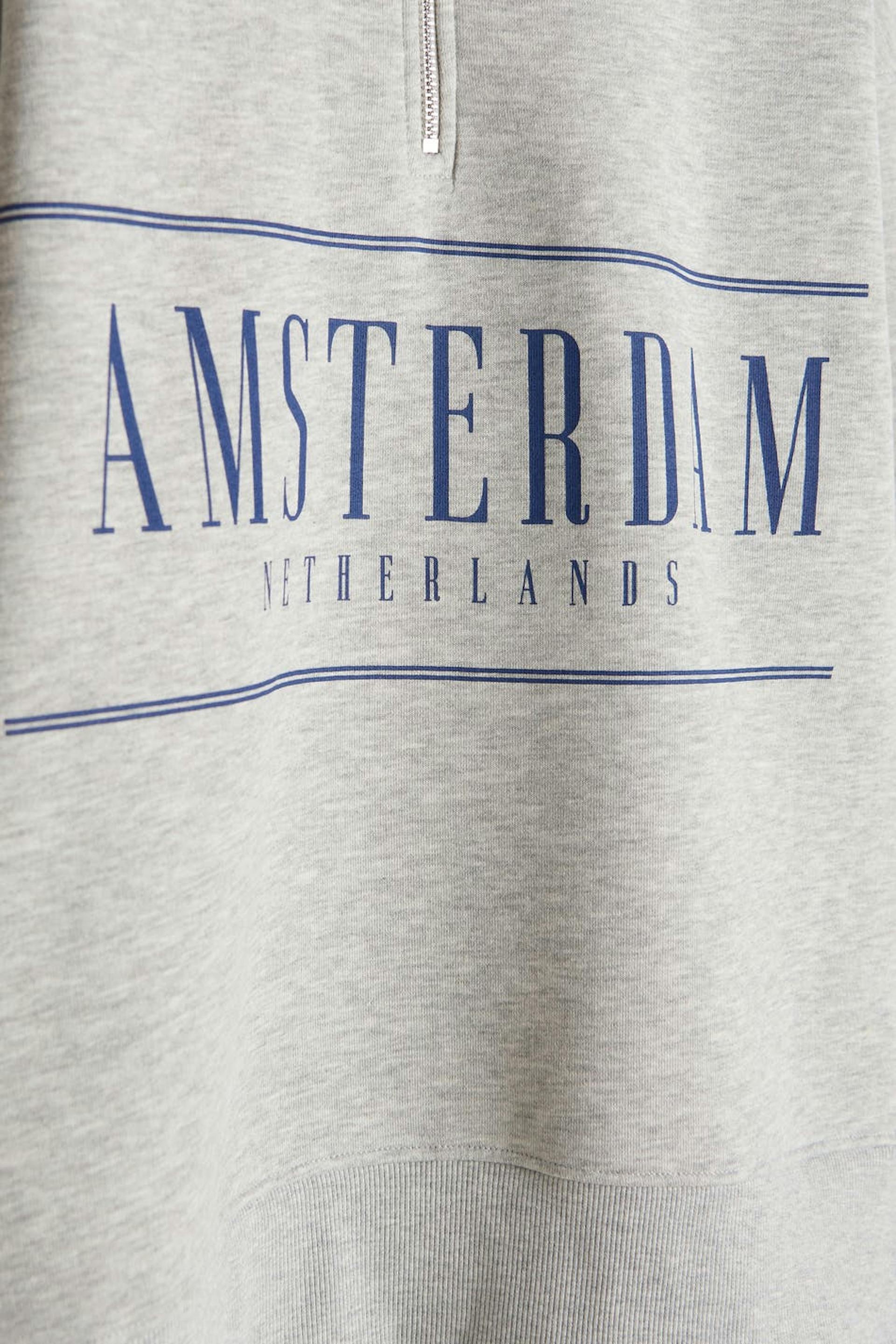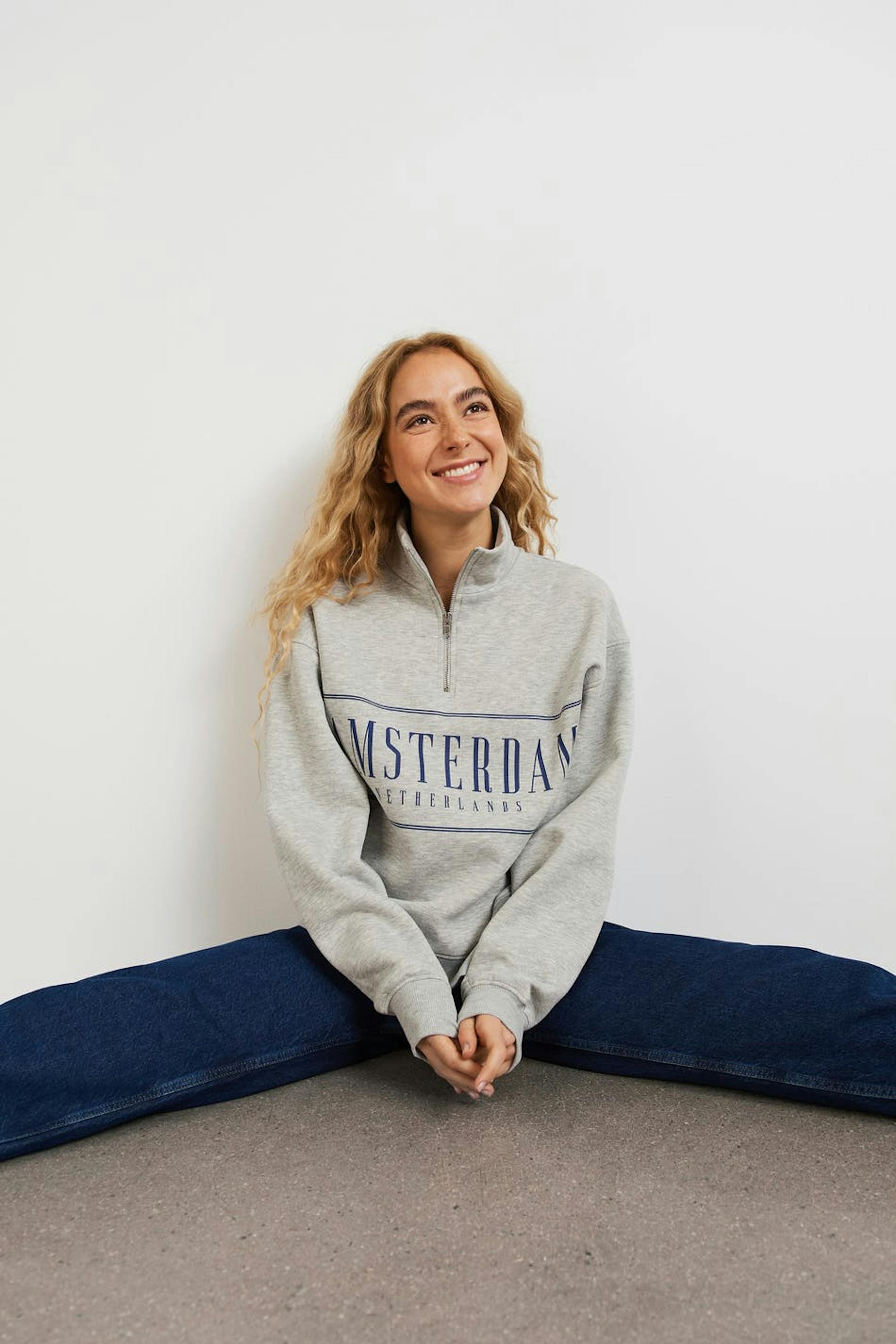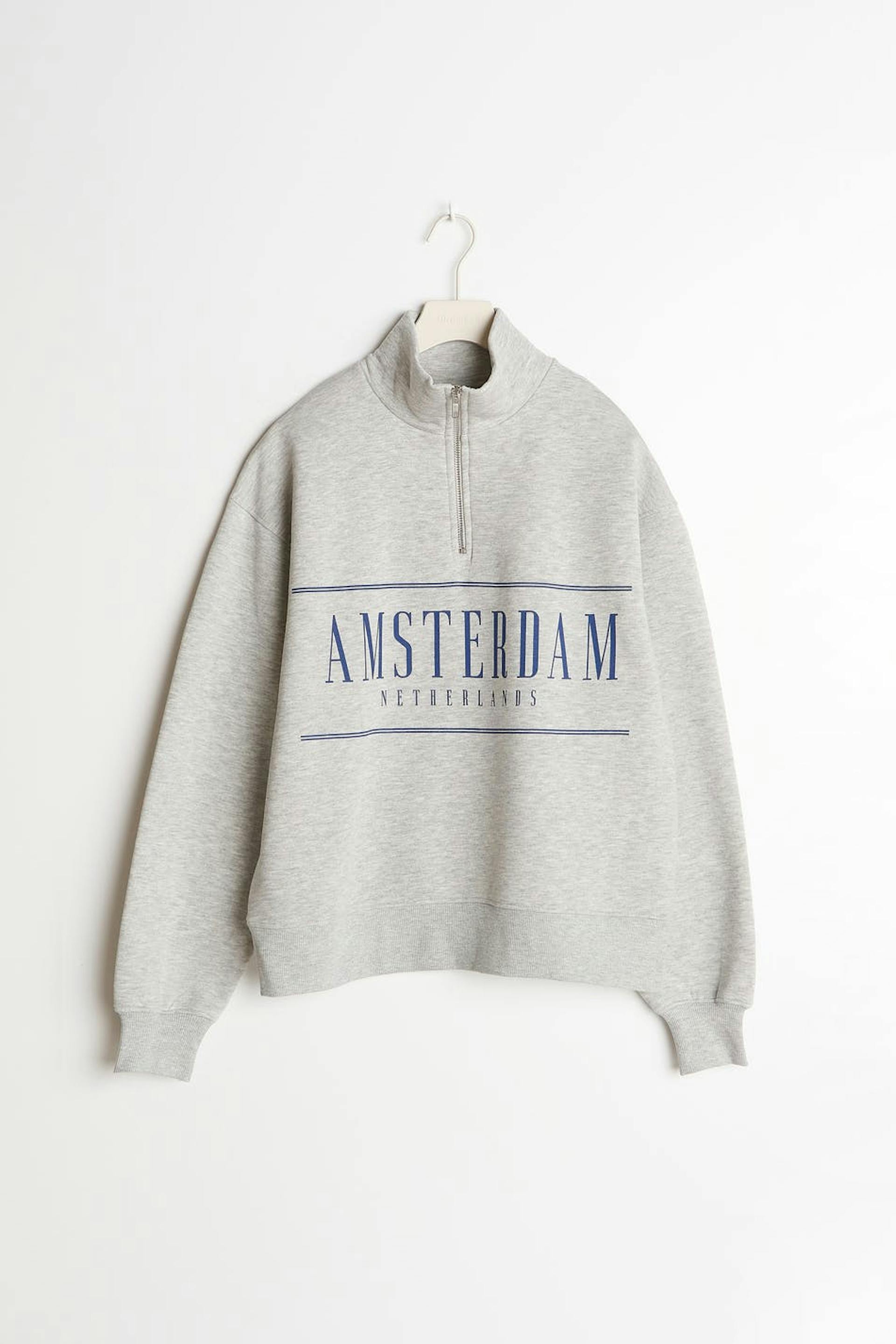 Collegetröja med blått tryck. Collegetröjan är grå och har oversize fit. Den har nedhasade axlar, en ribbad nederkant och en hög krage med dragkedja.