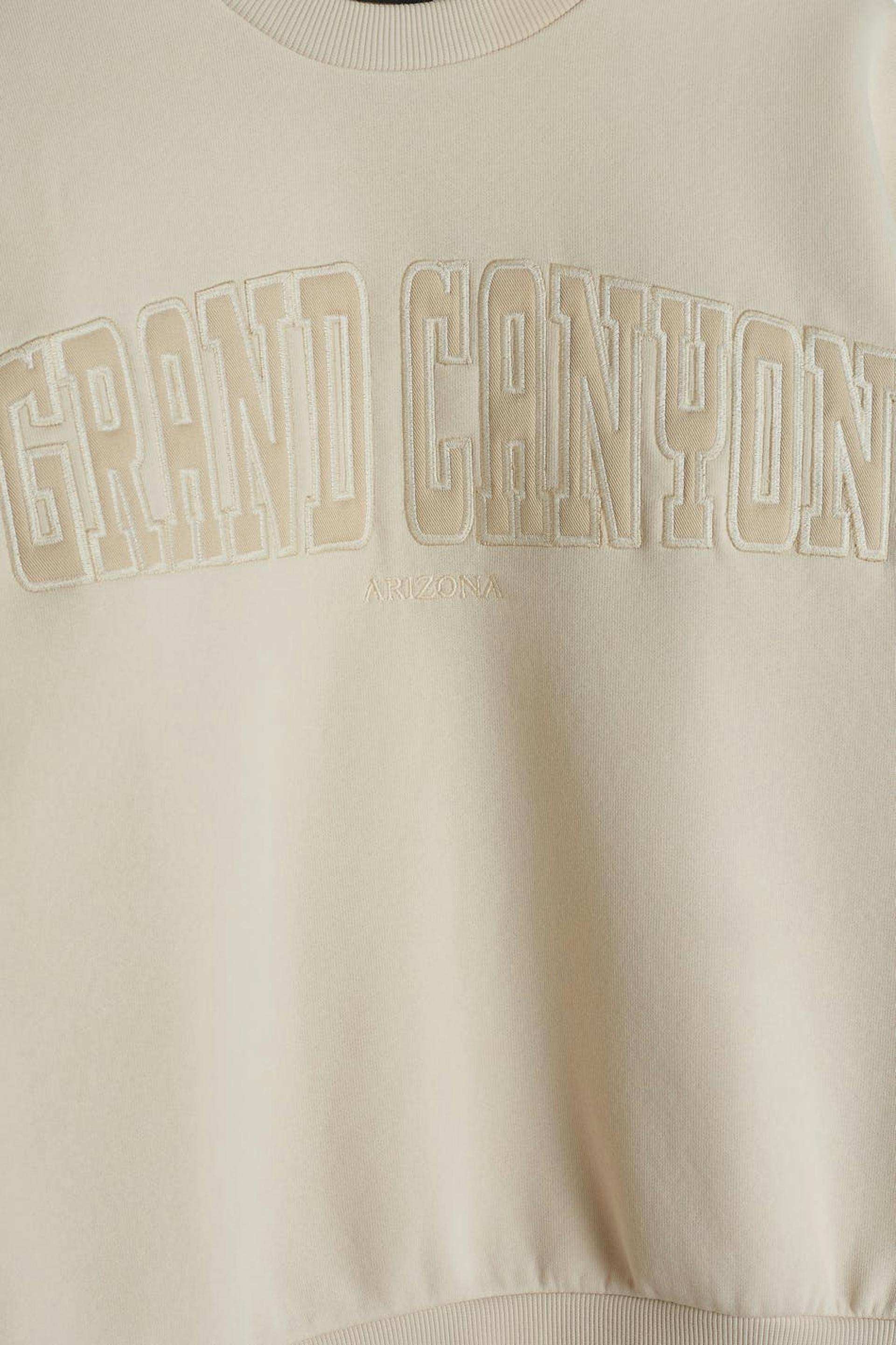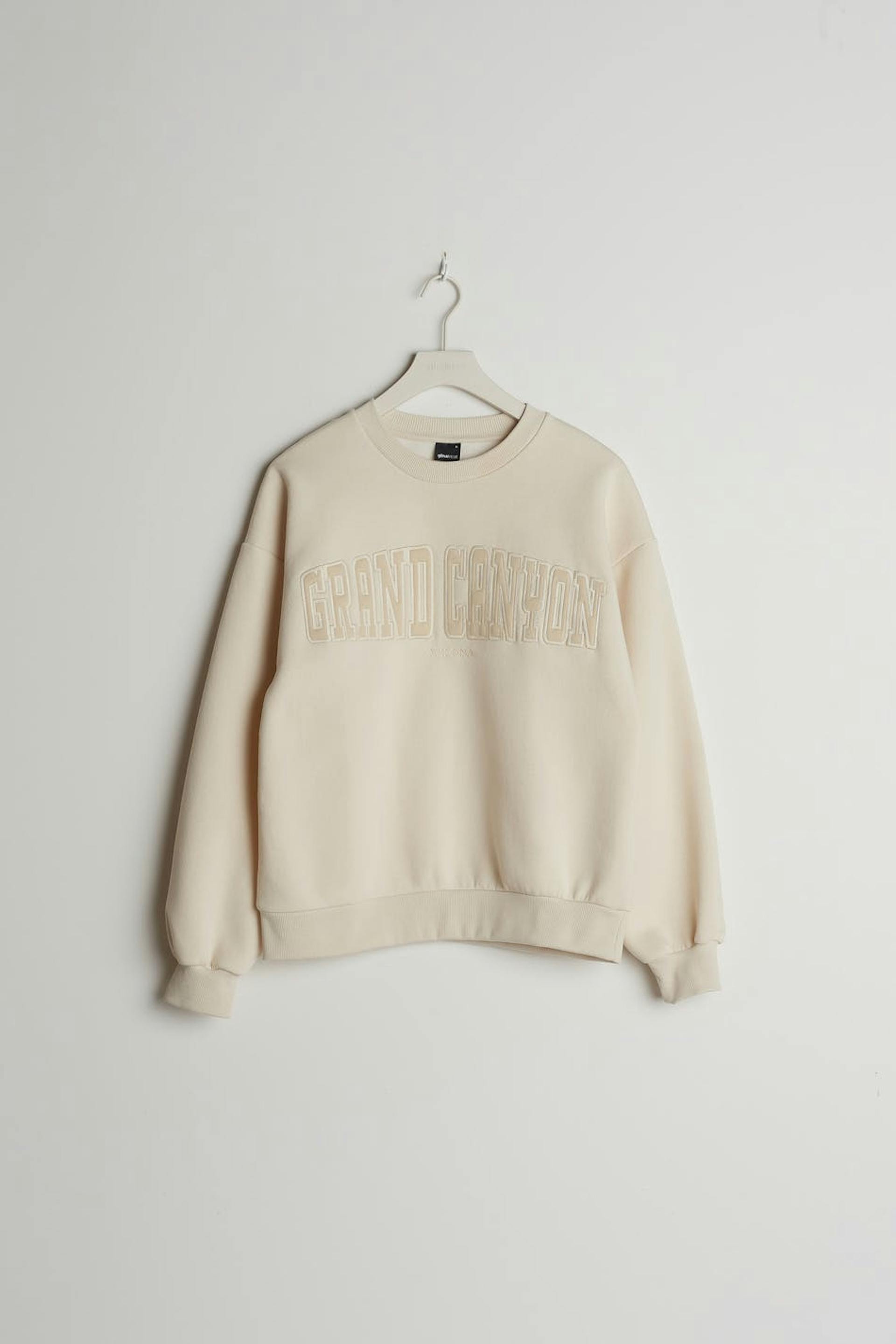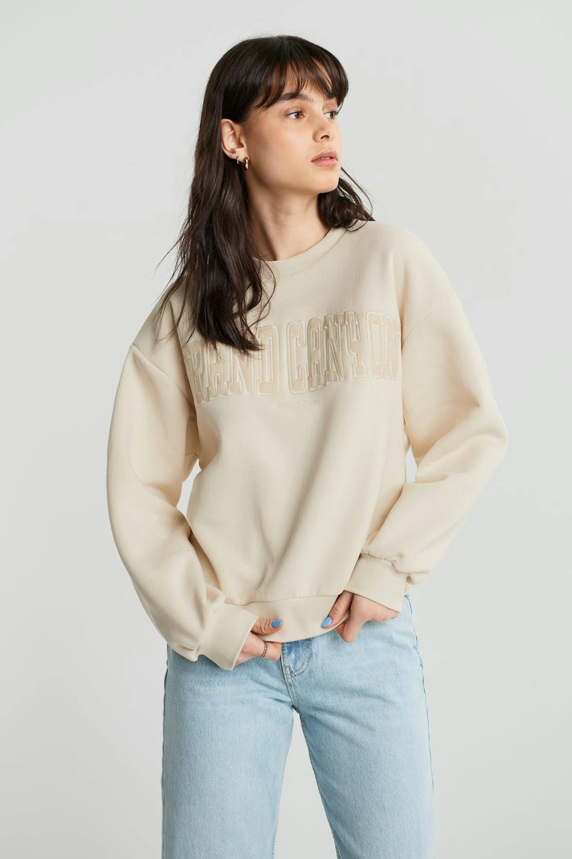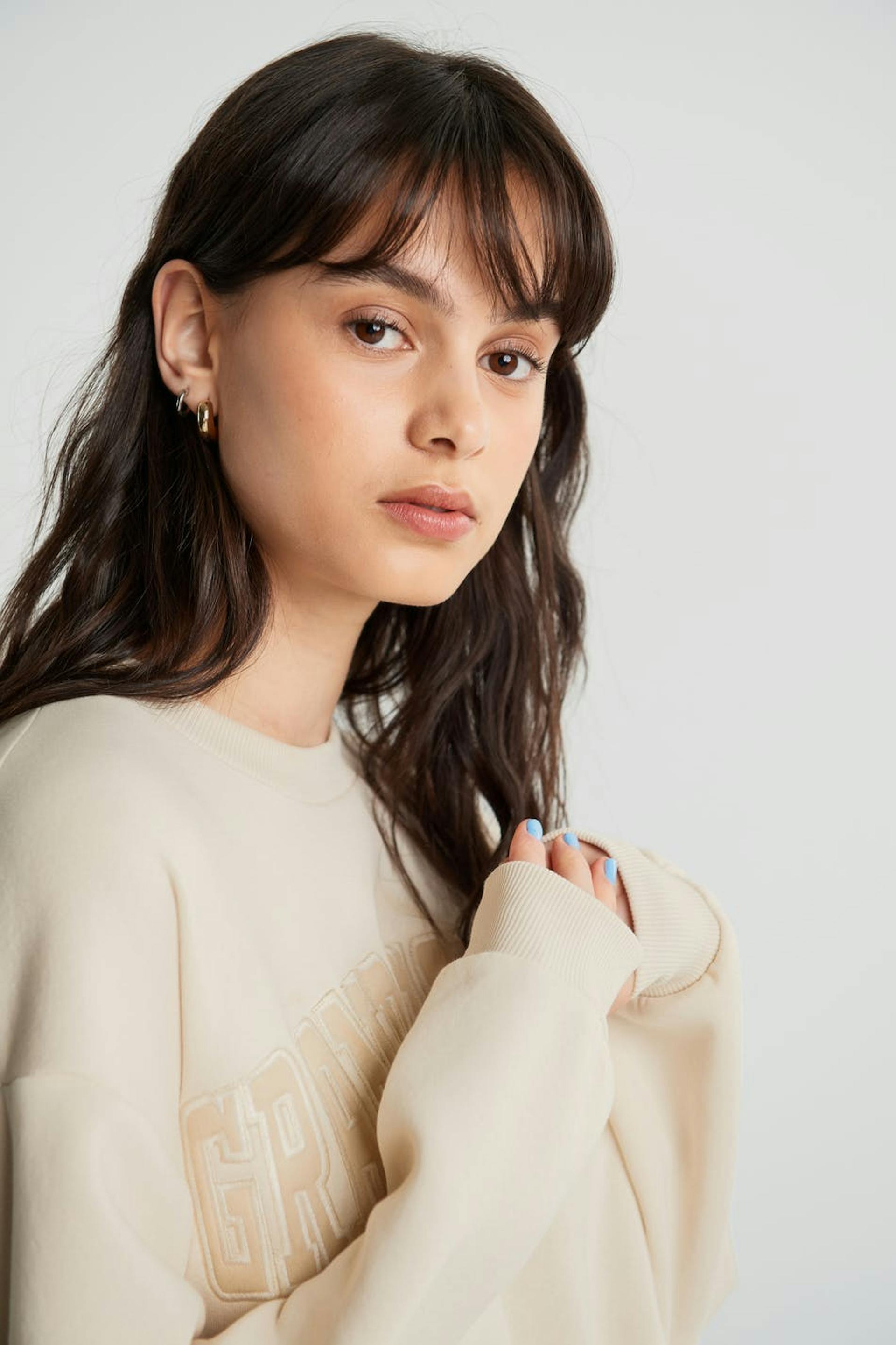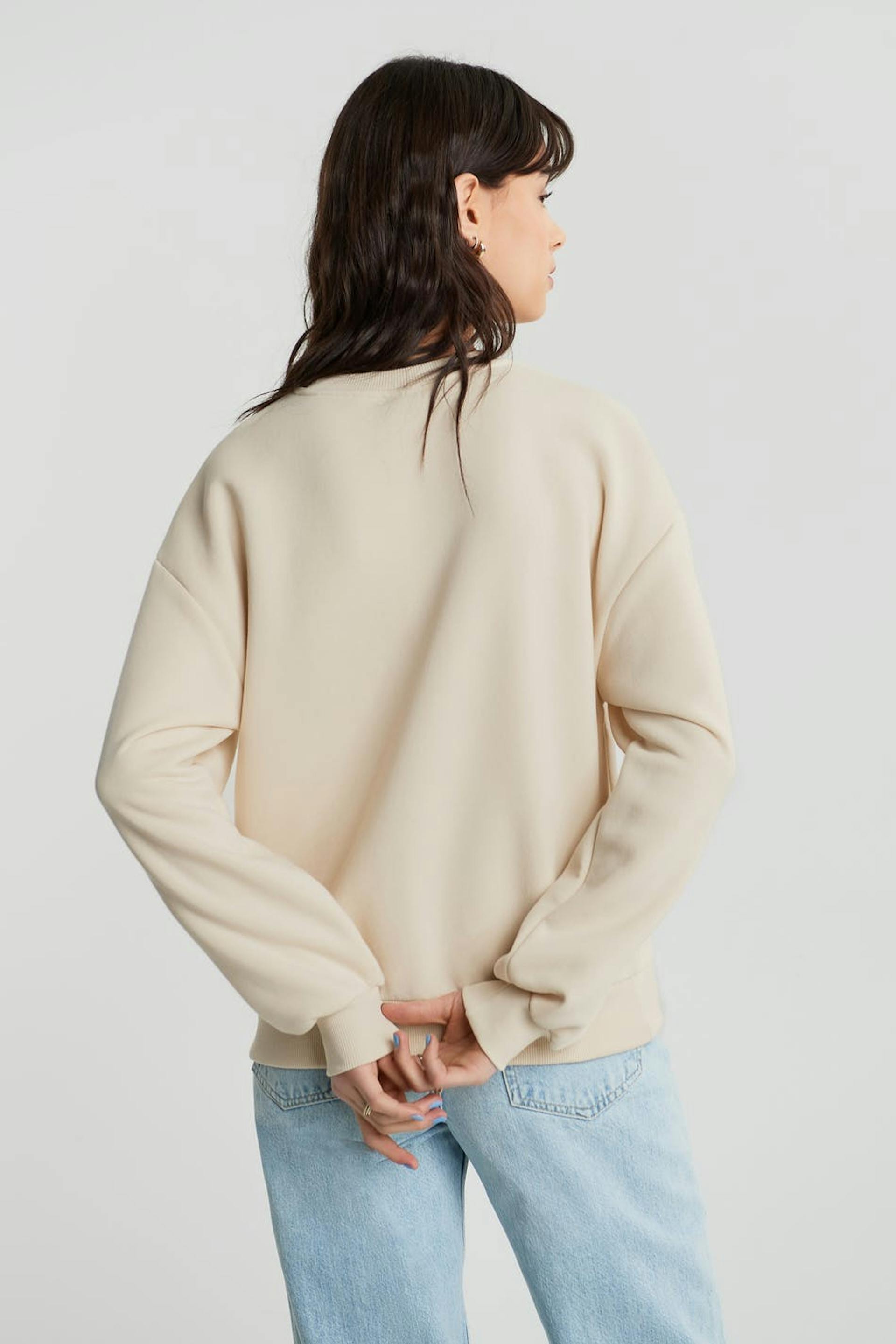 Collegetröja med ett tryck framtill. Collegetröjan är ljusbeige och har oversize fit.