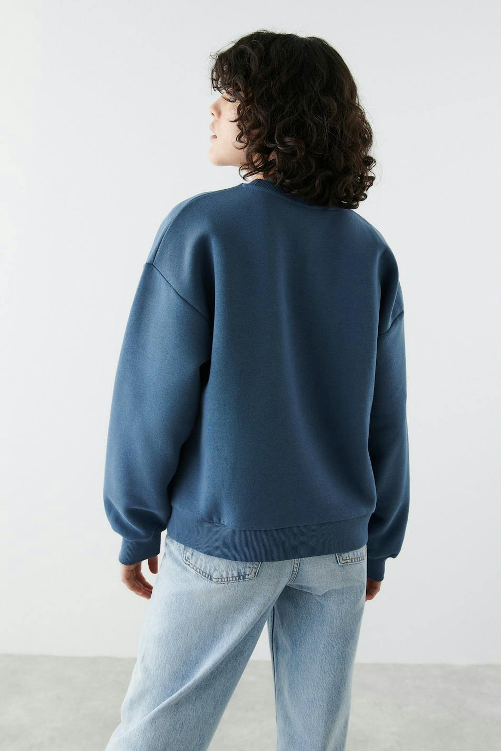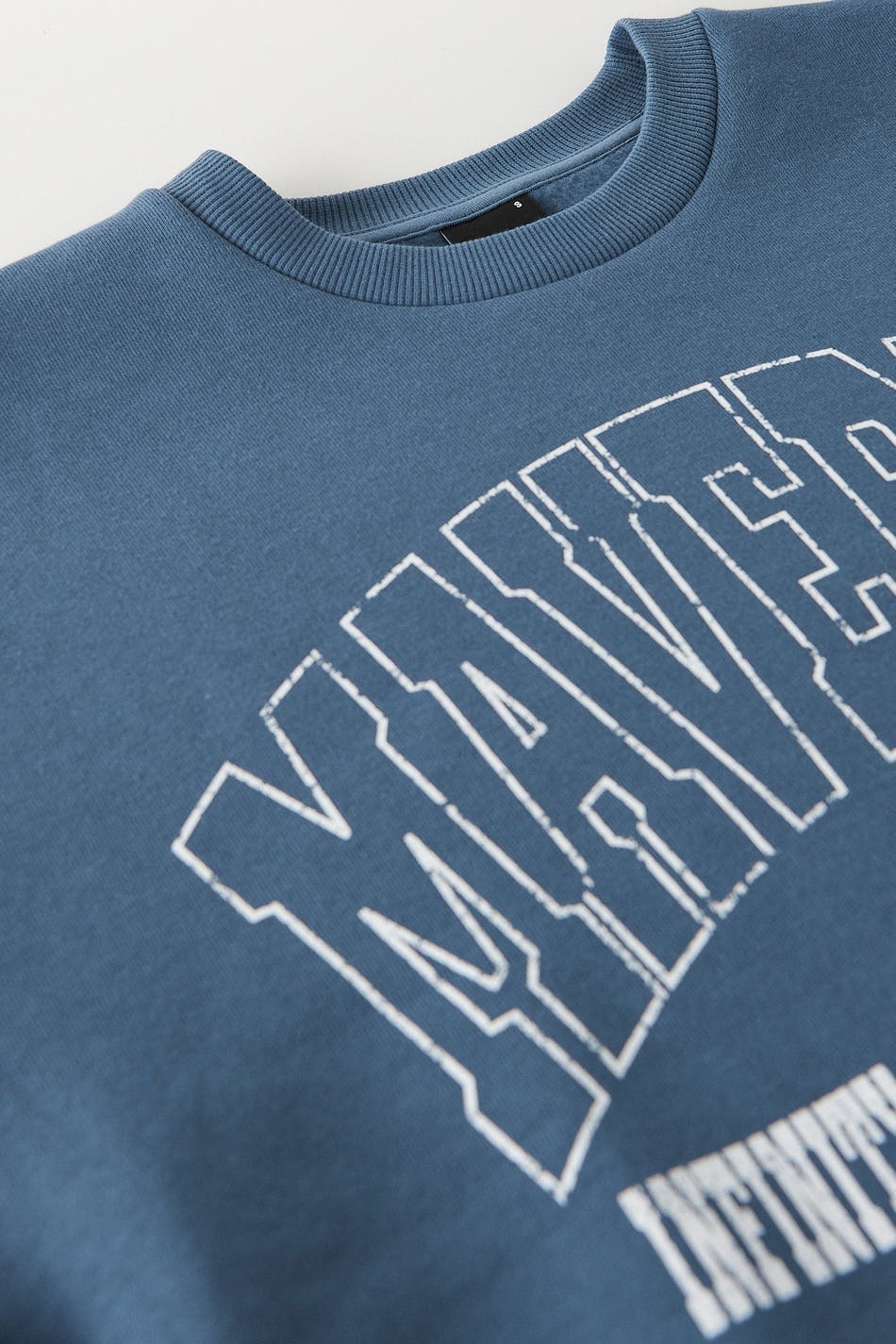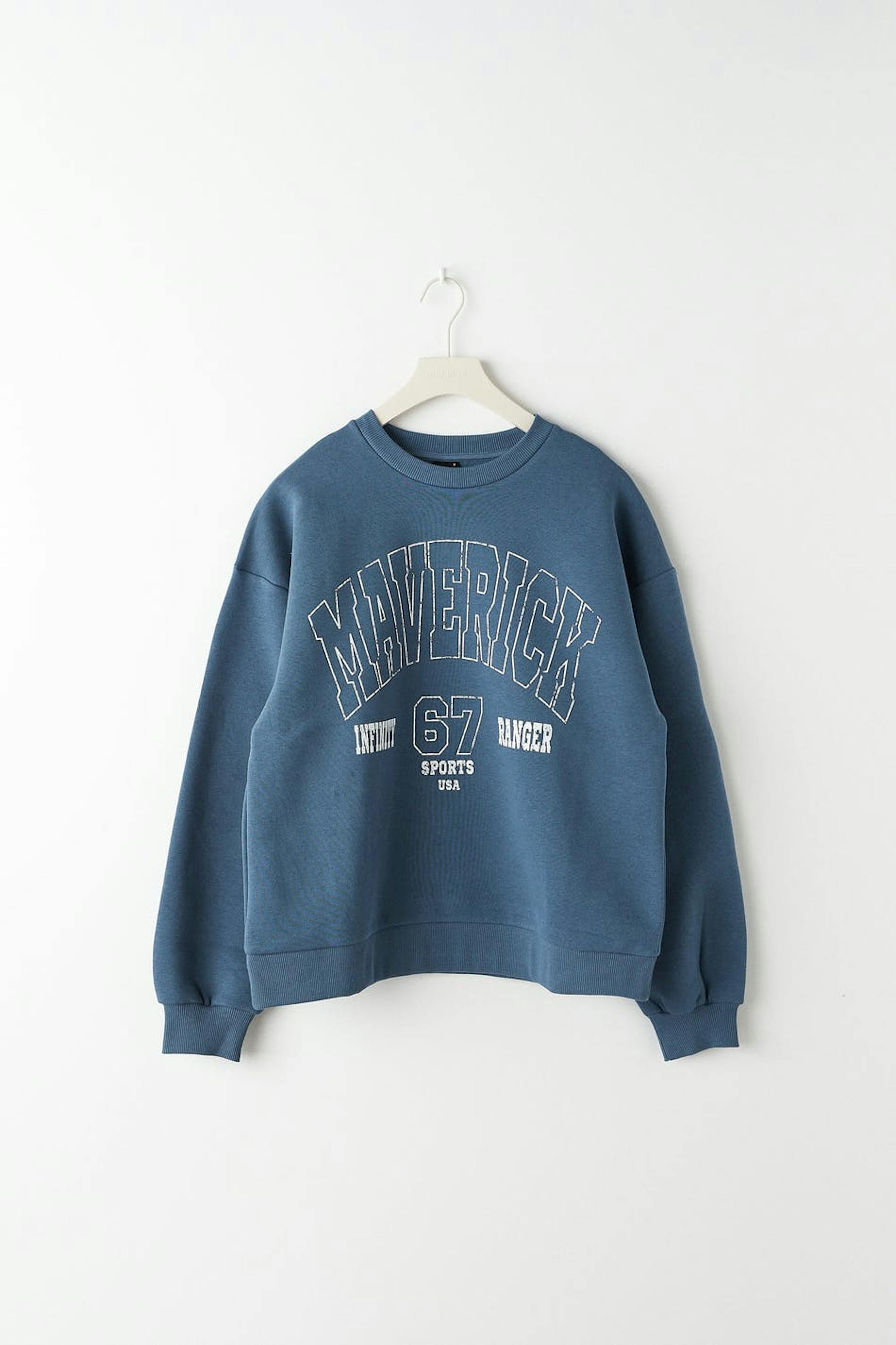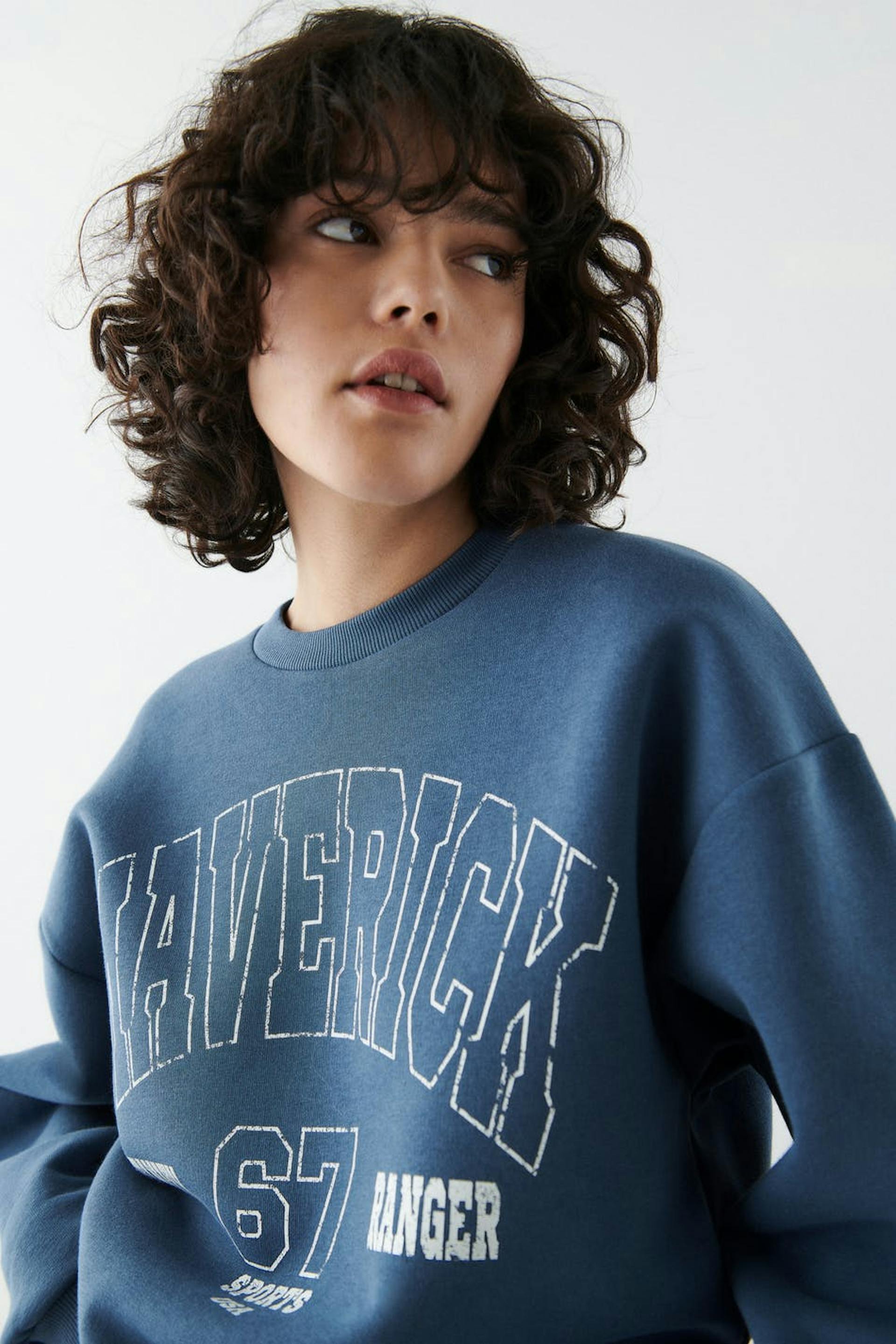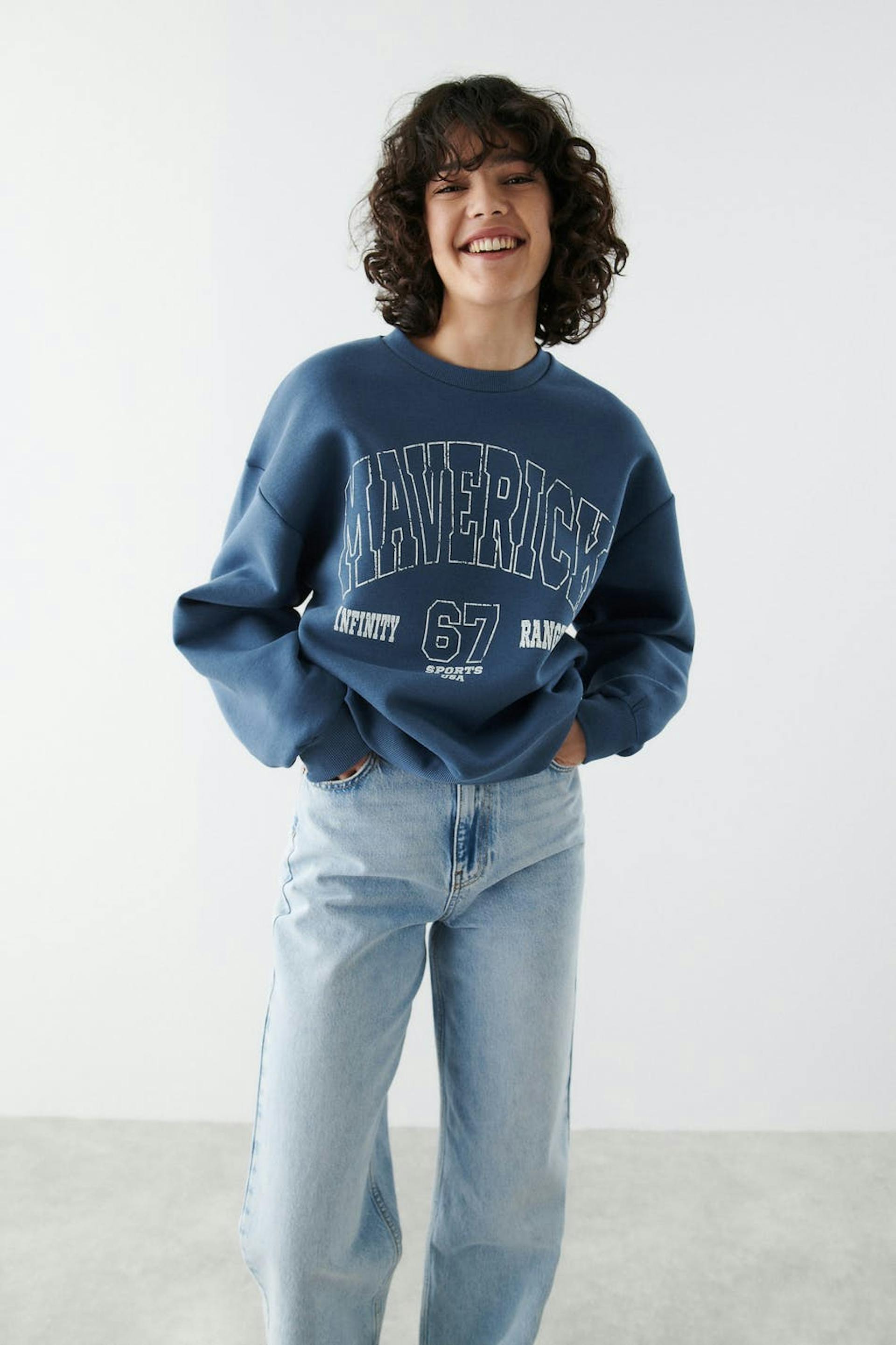 Collegetröja med tryck fram. Collegetröjan är blå och har oversize fit. Den har en rund halsringning och en ribbmudd vid ärmsluten och på nederfållen.