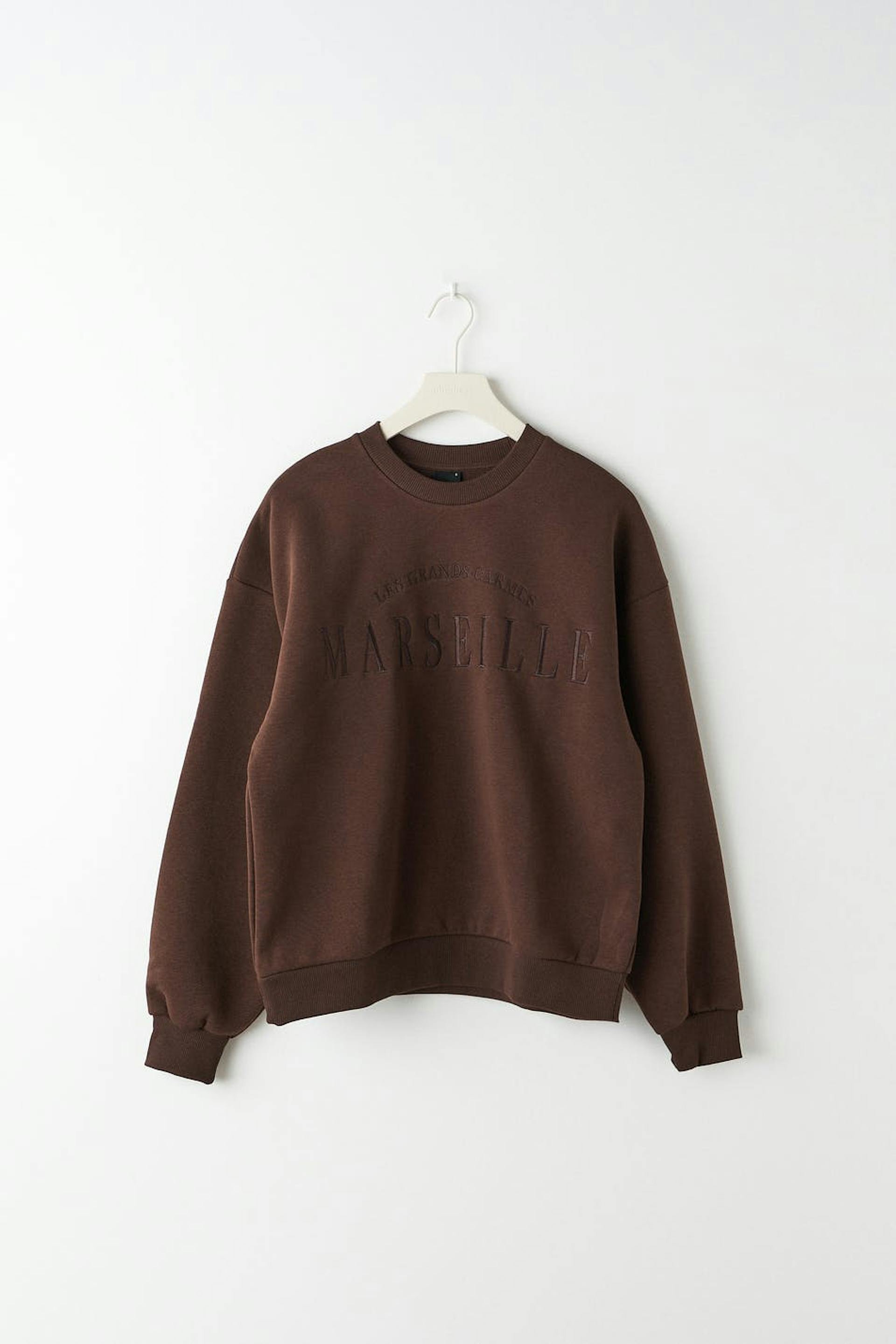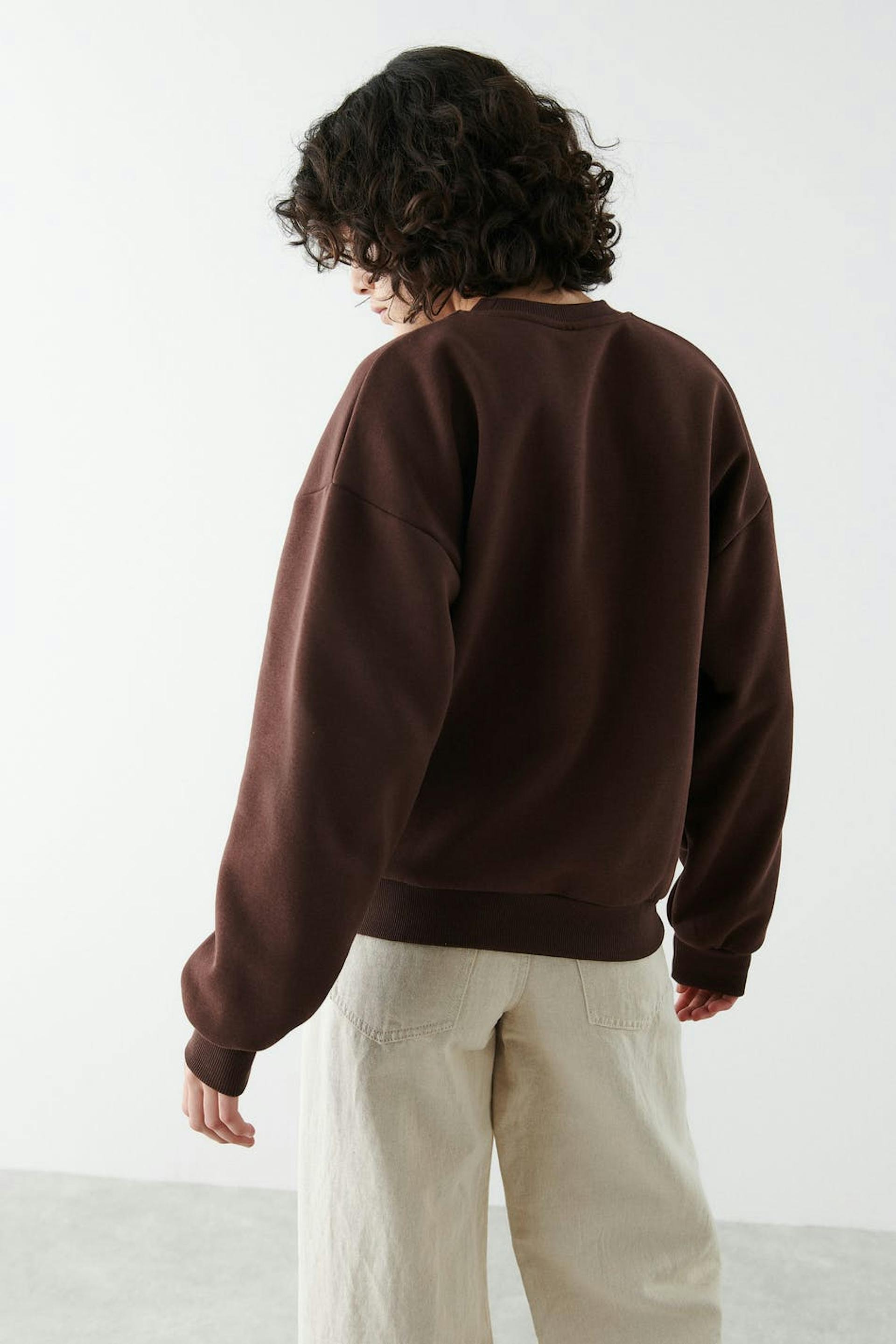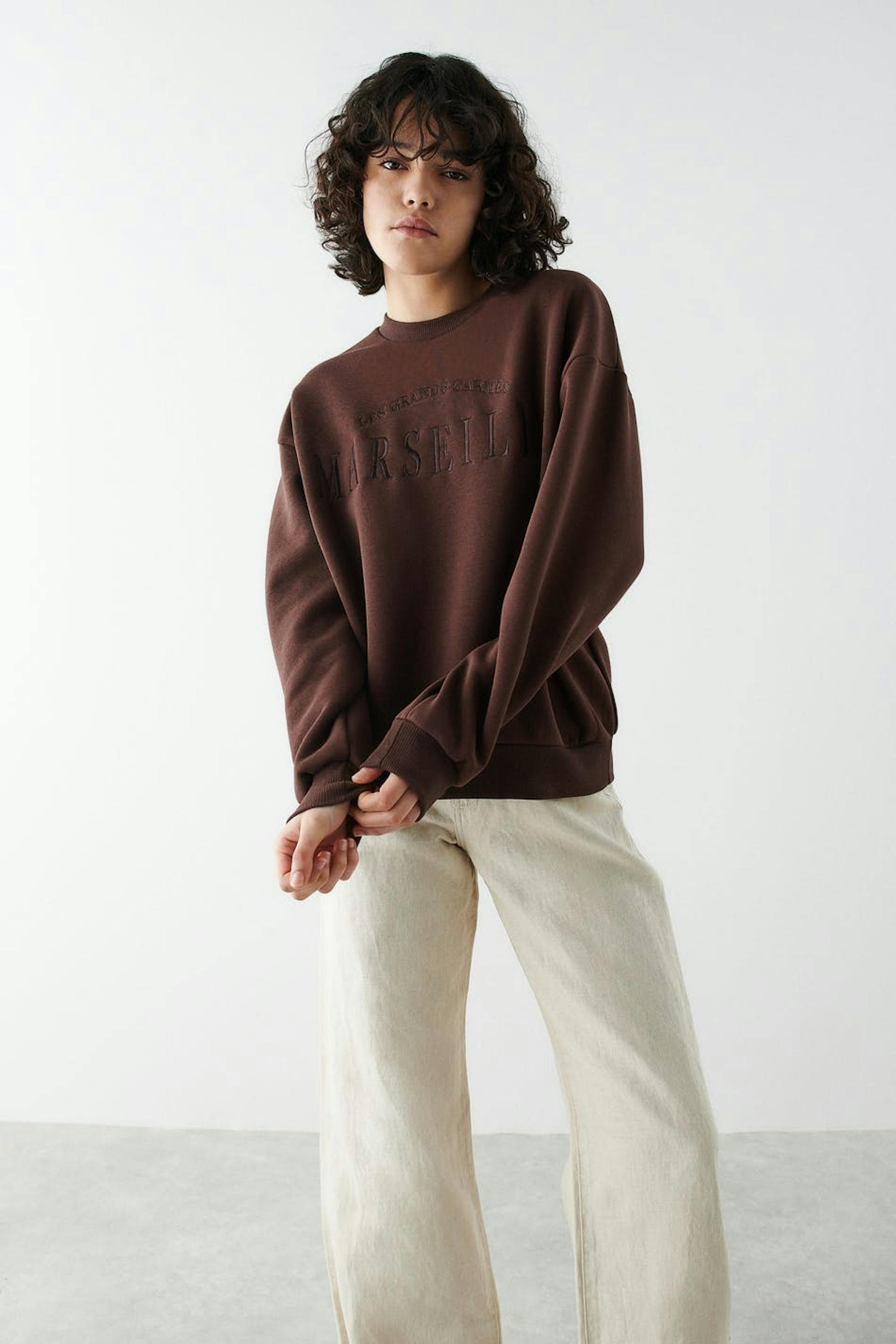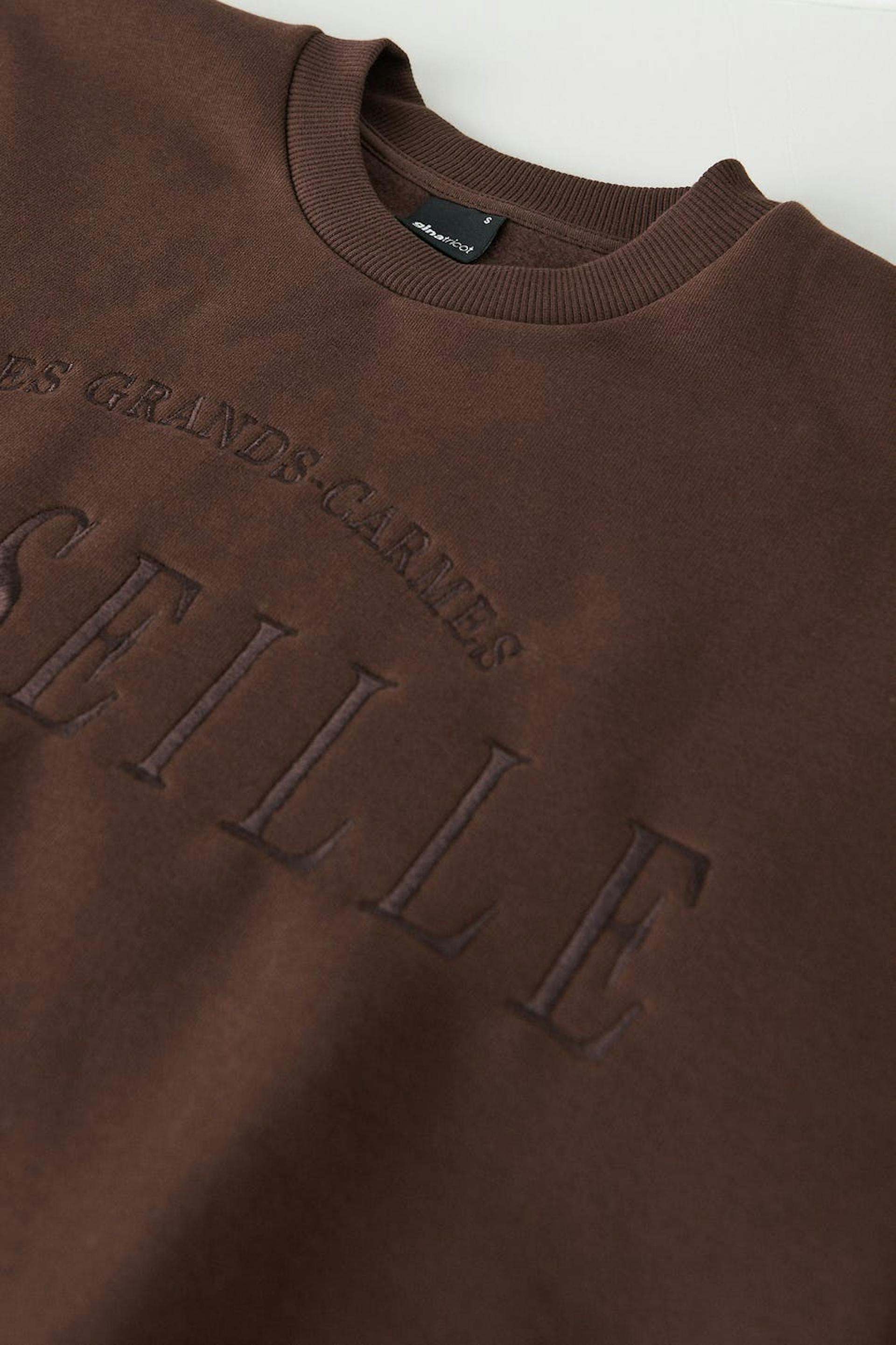 Collegetröja med broderad text fram. Collegetröjan är brun och har oversize fit. Den har en rund halsringning och en ribbmudd vid ärmsluten och på nederfållen.
