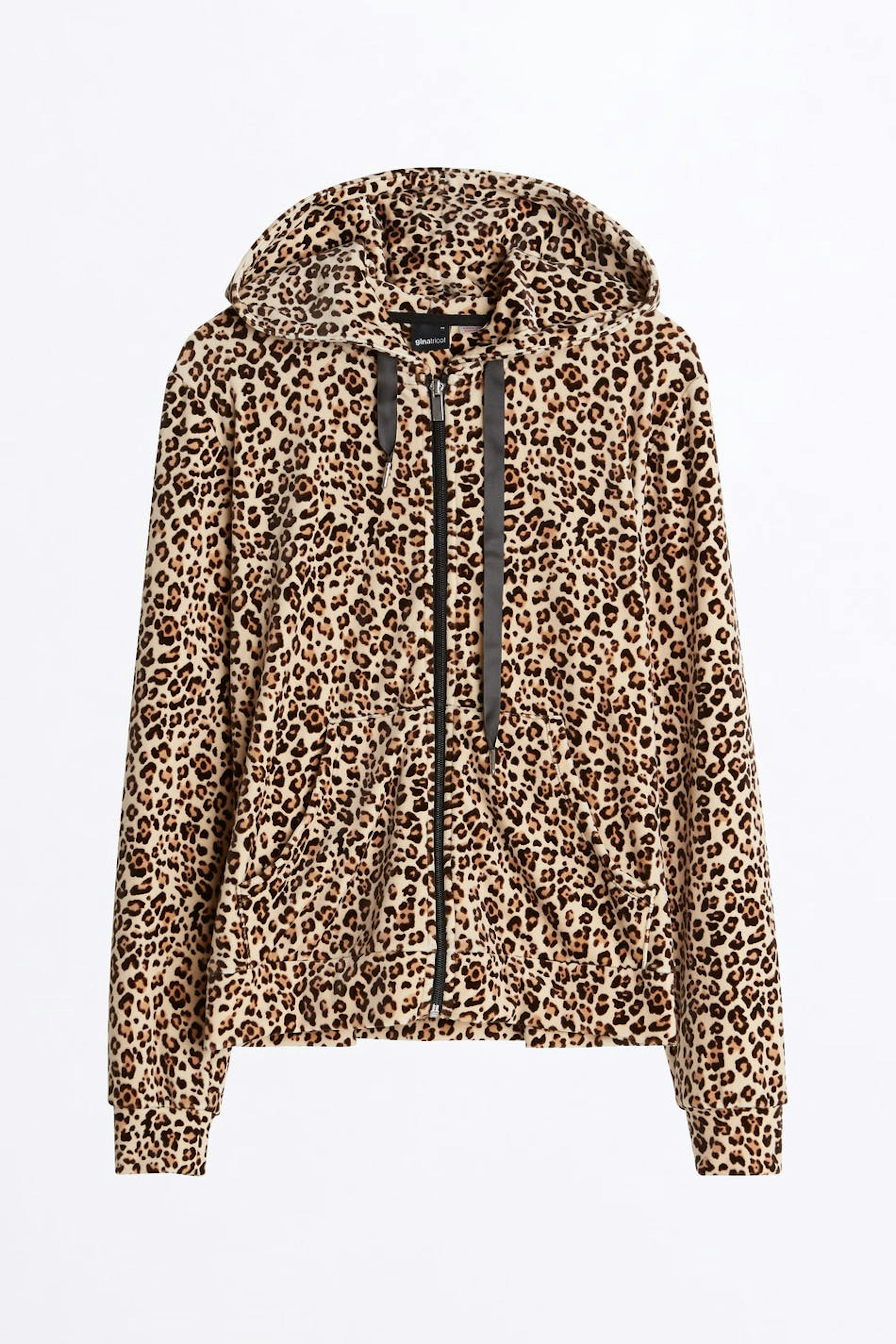 Collegetröja med en huva med en dragsko i satin. Collegetröjan är leopardmönstrad och har en dragkedja framtill. Den är gjord av velour och har fickor på framsidan. Får inte komma i kontakt med eld.