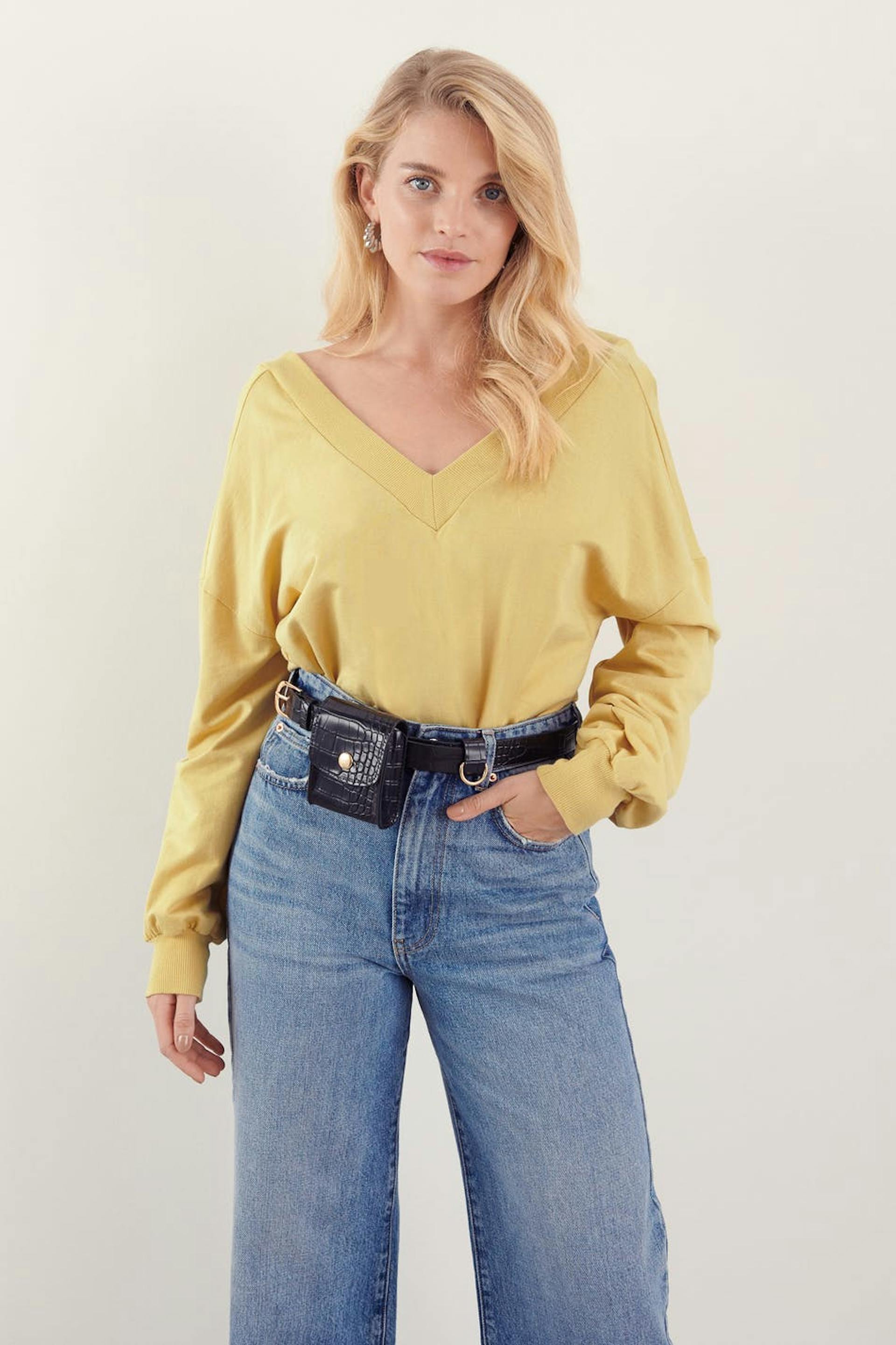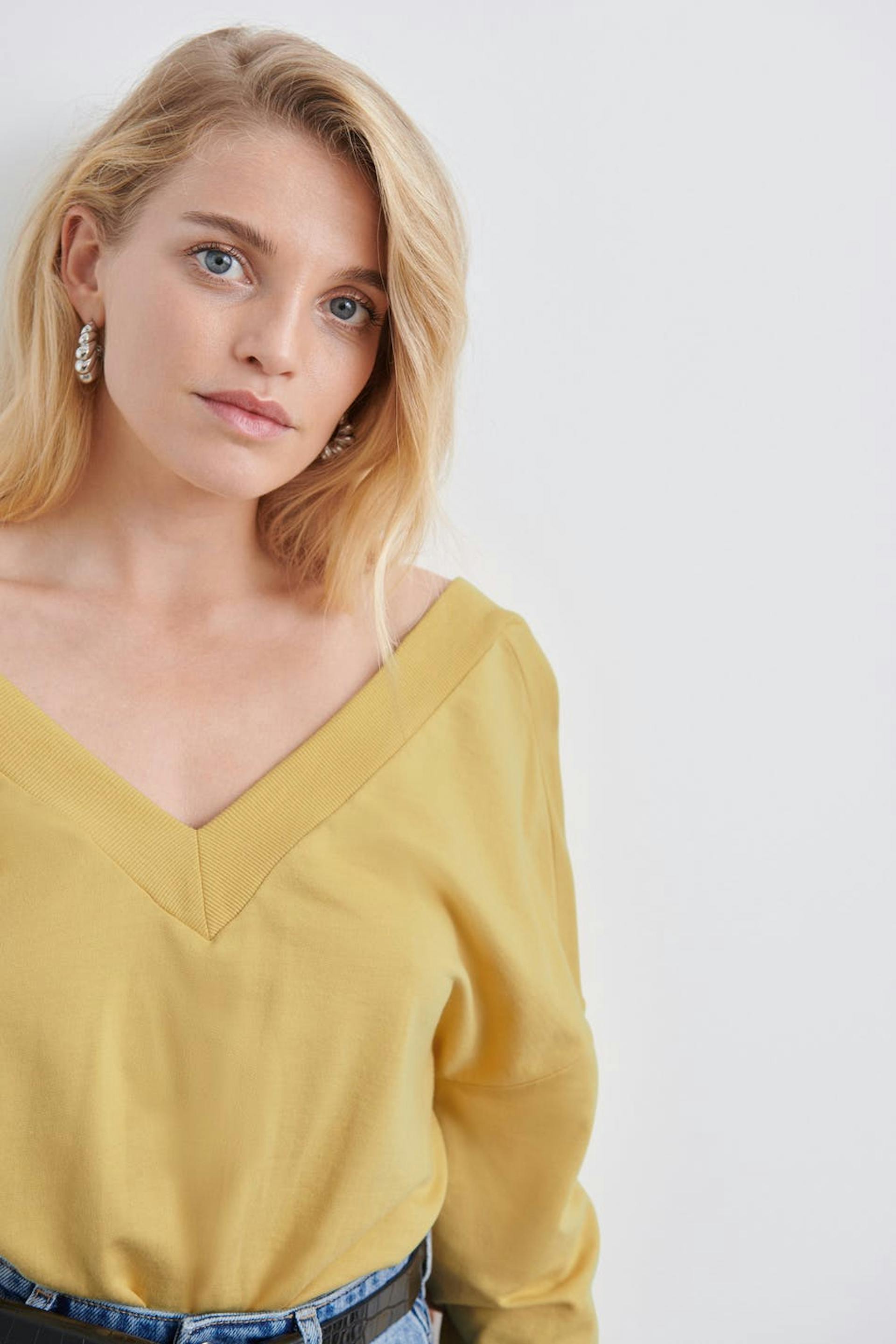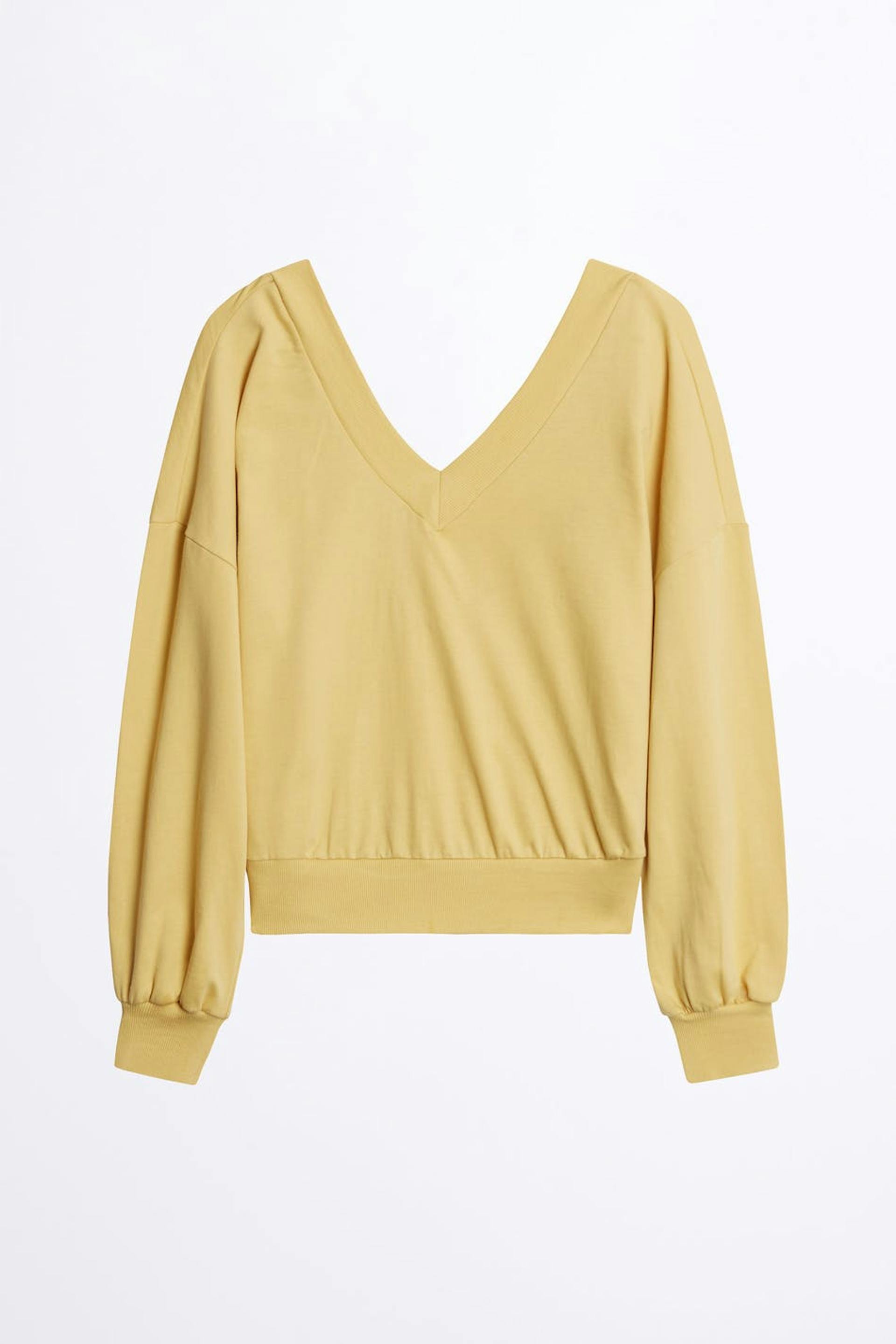 Kort tröja med oversize fit. Tröjan är gul och har en djup v-ringning. Den är gjord av trikå.