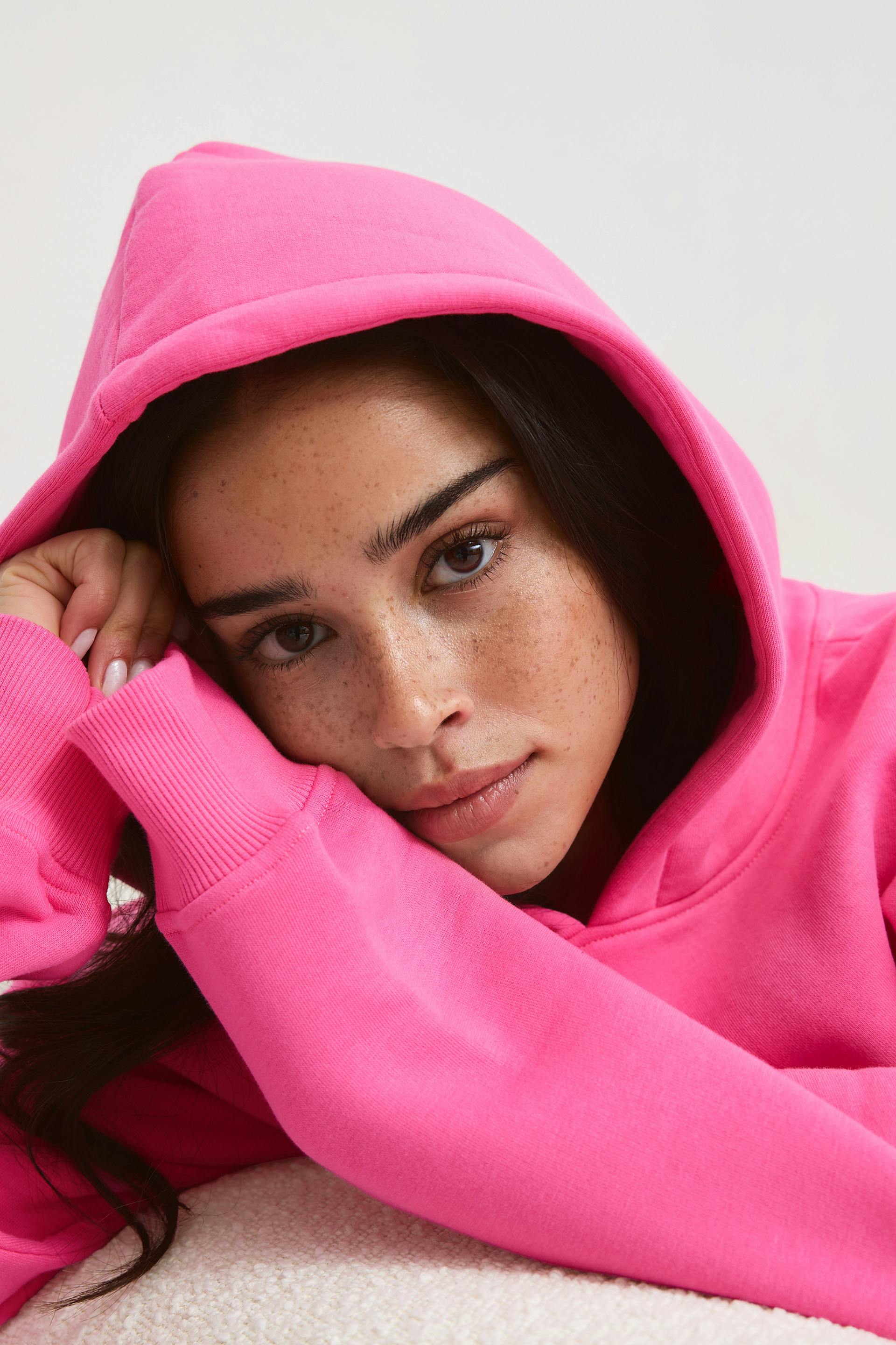 Avslappnad hoodie med mjuk borstad insida. Nedhasade axlar, fodrad huva med dragsko och ficka framtill. I färgen rosa. Easy to wear everyday.