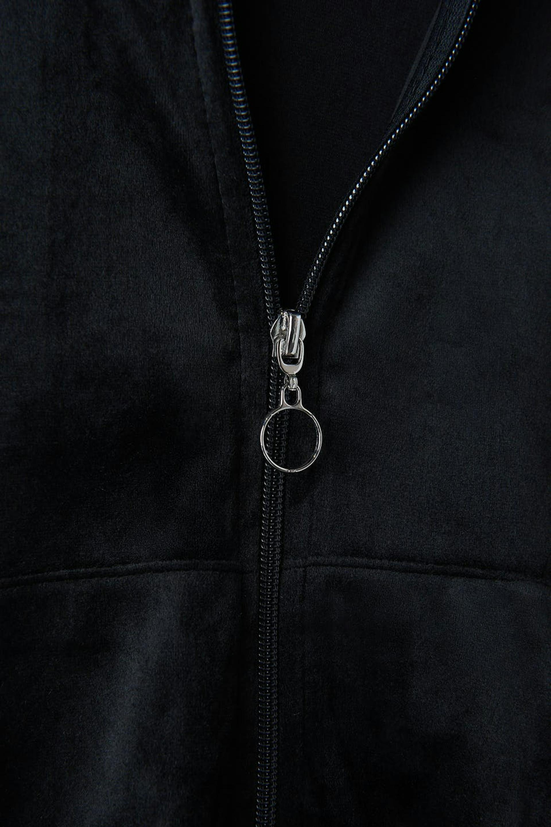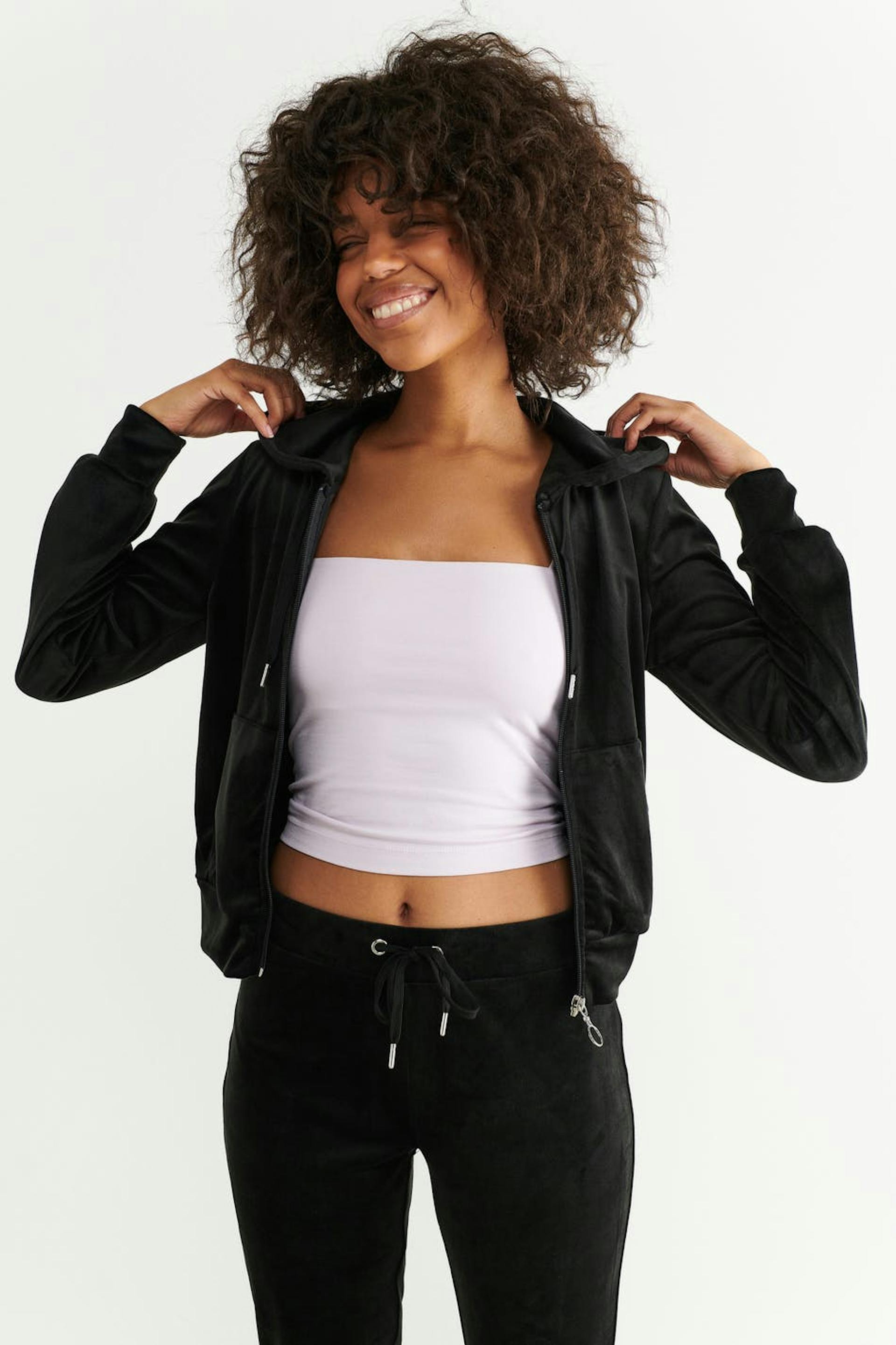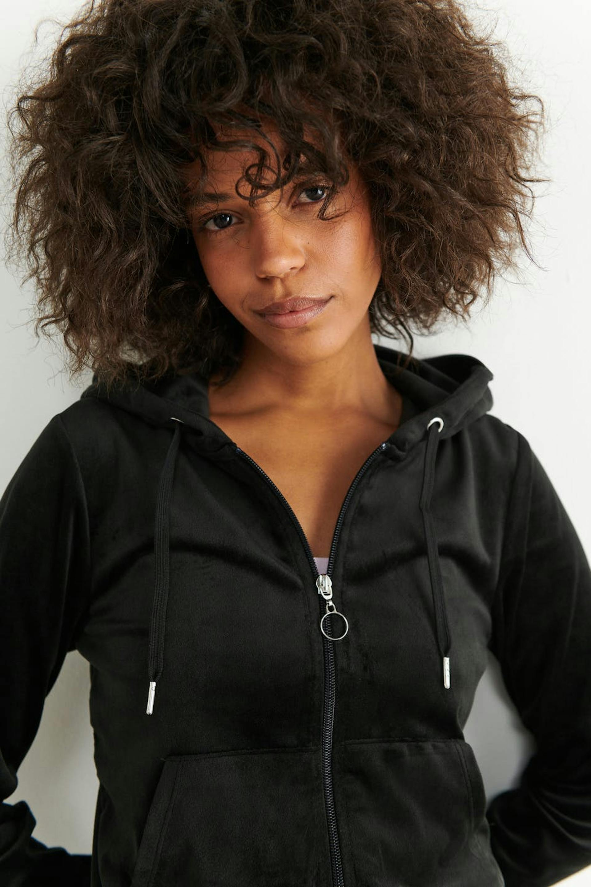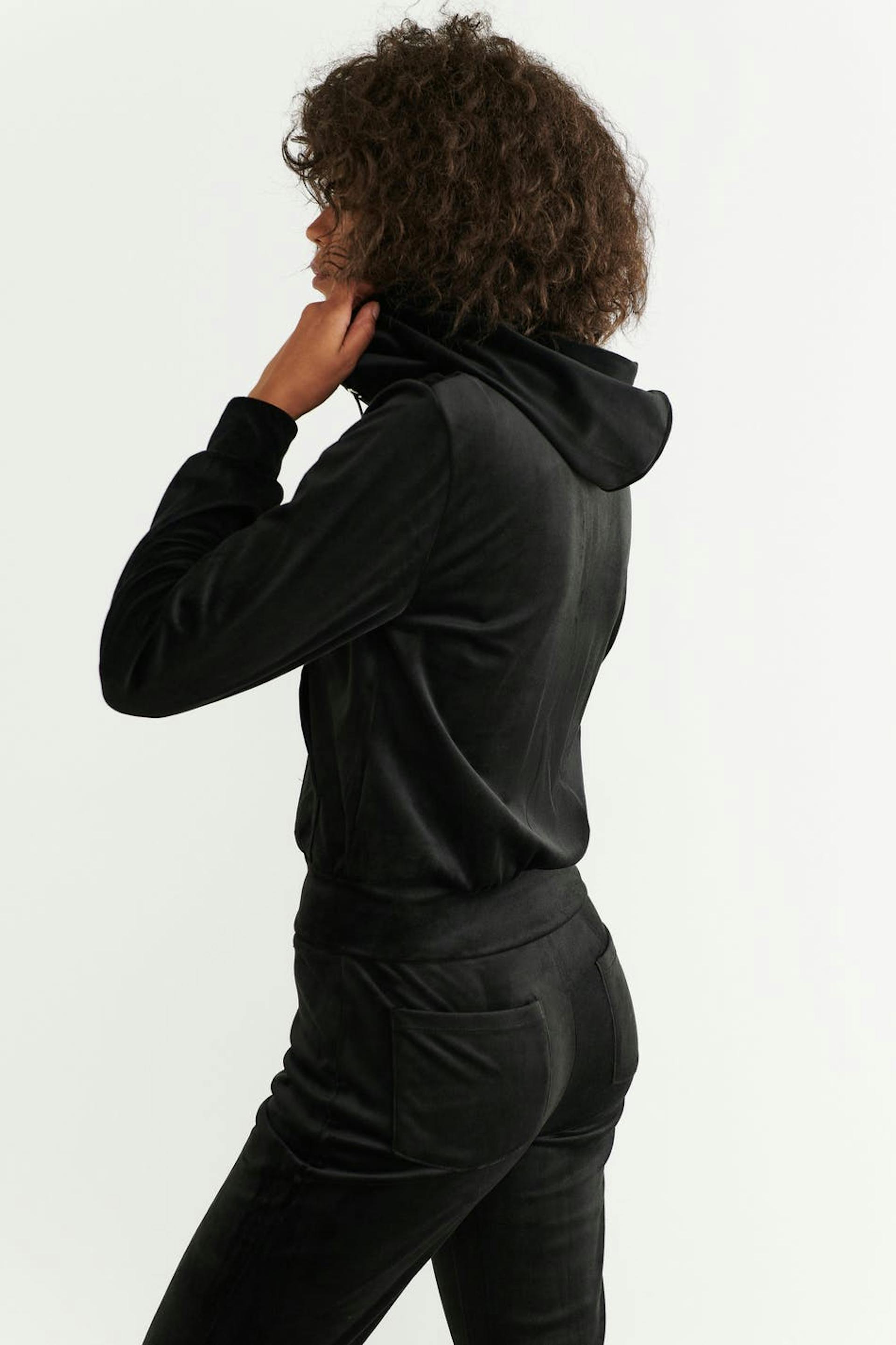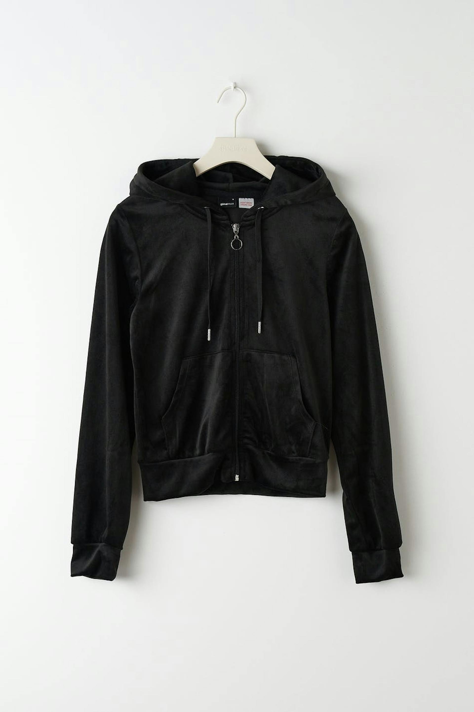 Mjuk hoodie i velour med fodrad huva. Hoodien är svart och har fickor på sidorna. Den har dragkedjestängning med metallring och dragskor vid huvan.