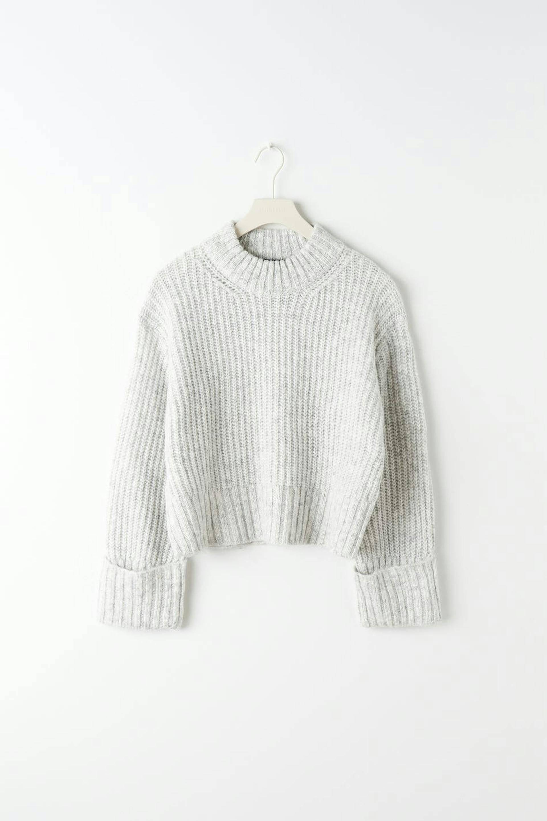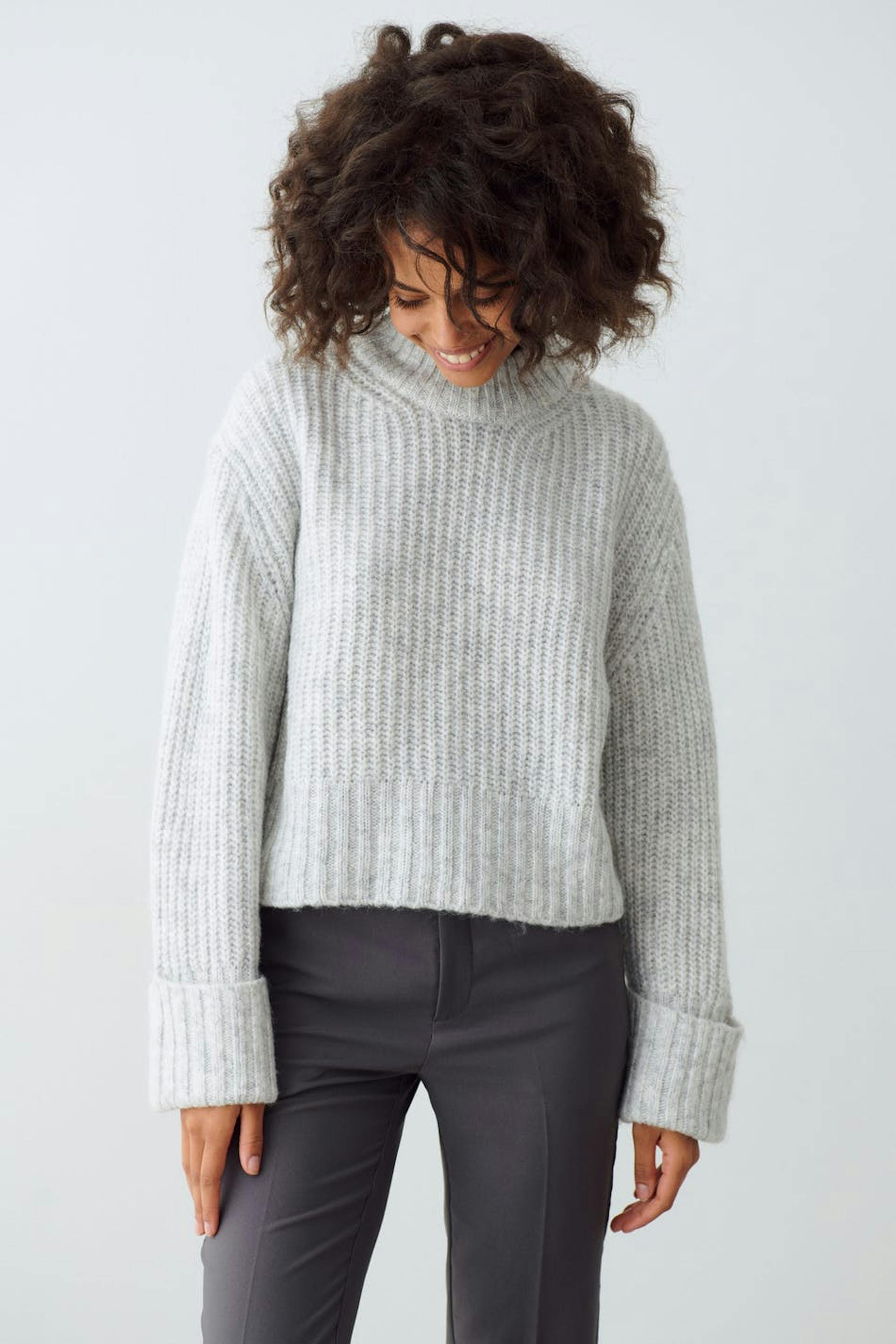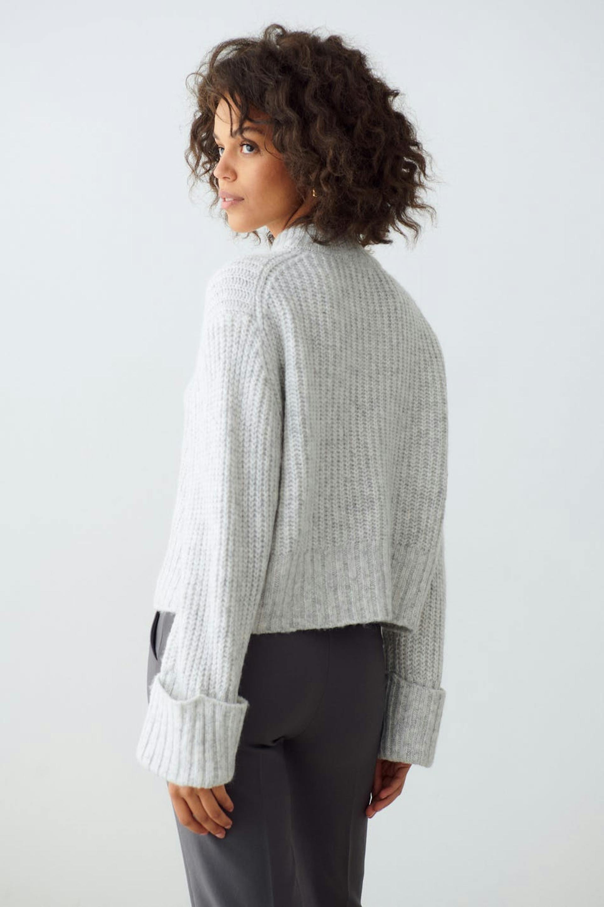 Stickad tröja med boxig passform. Tröjan är croppad, grå och långärmad. Den har rund halsringning och uppvikta ärmslut med ribbade manschetter.