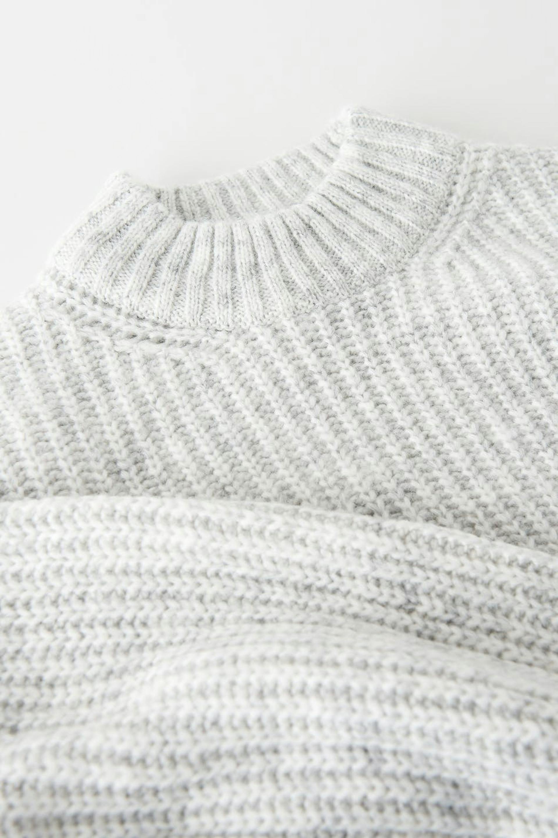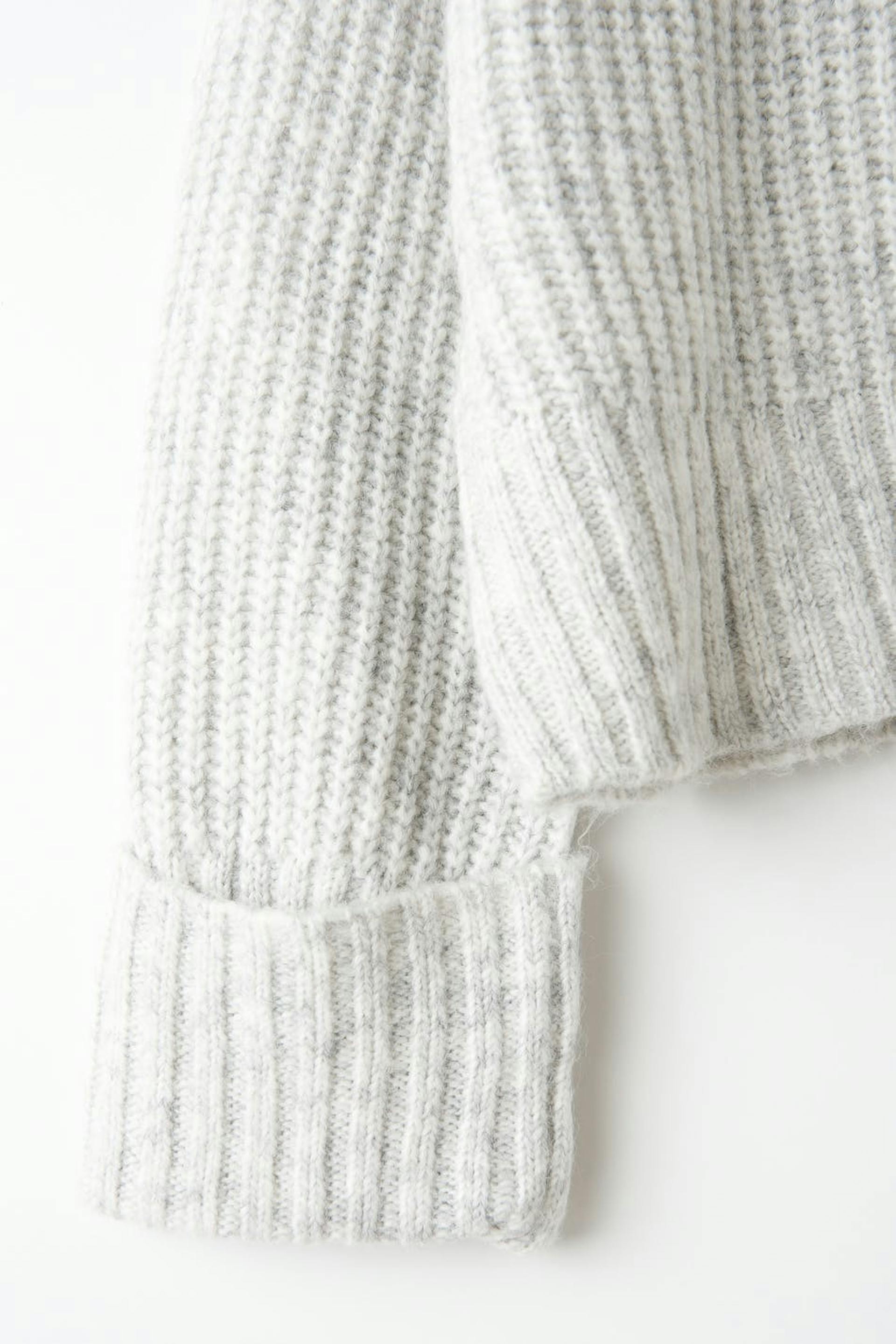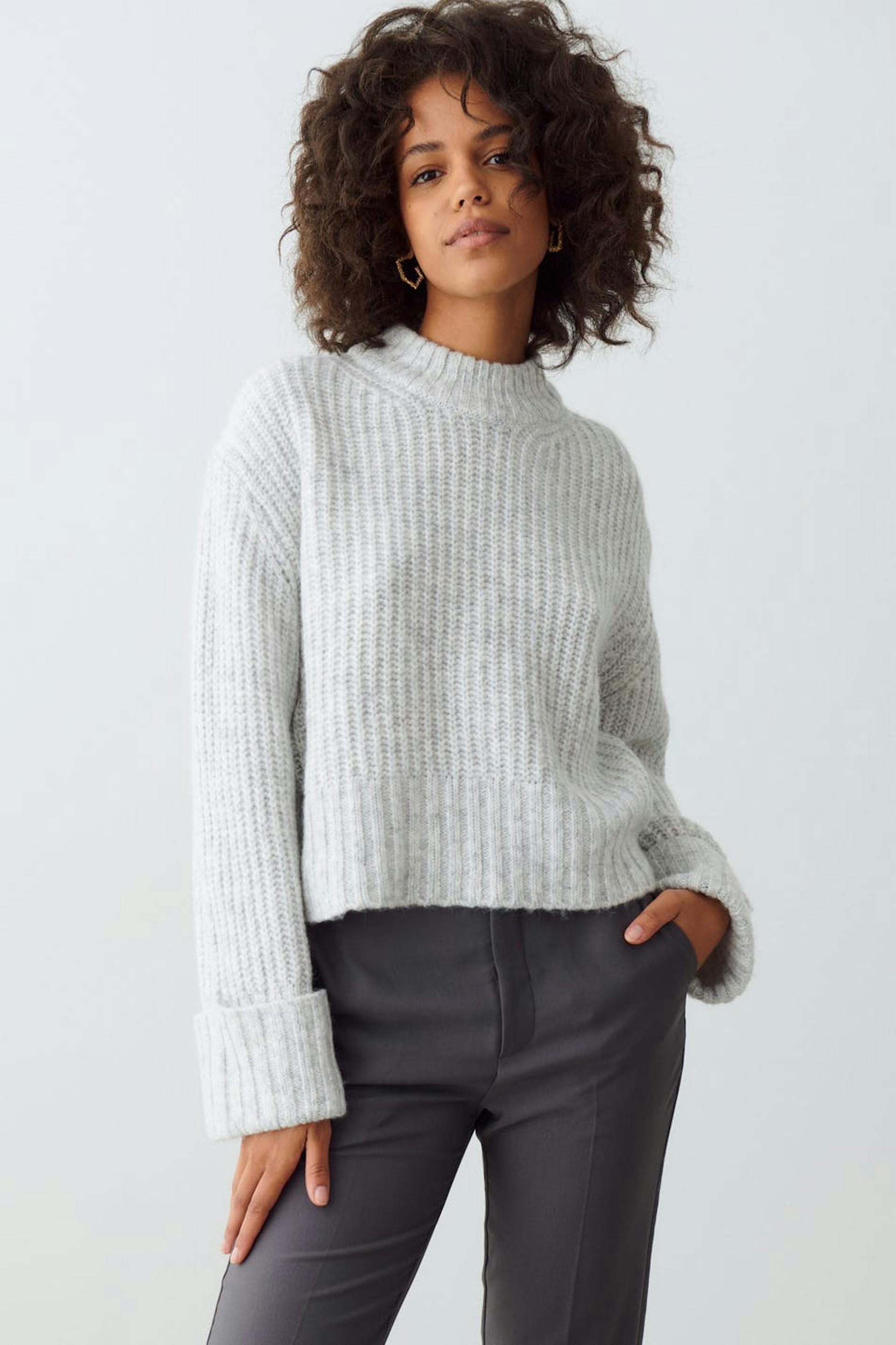 Stickad tröja med boxig passform. Tröjan är croppad, grå och långärmad. Den har rund halsringning och uppvikta ärmslut med ribbade manschetter.