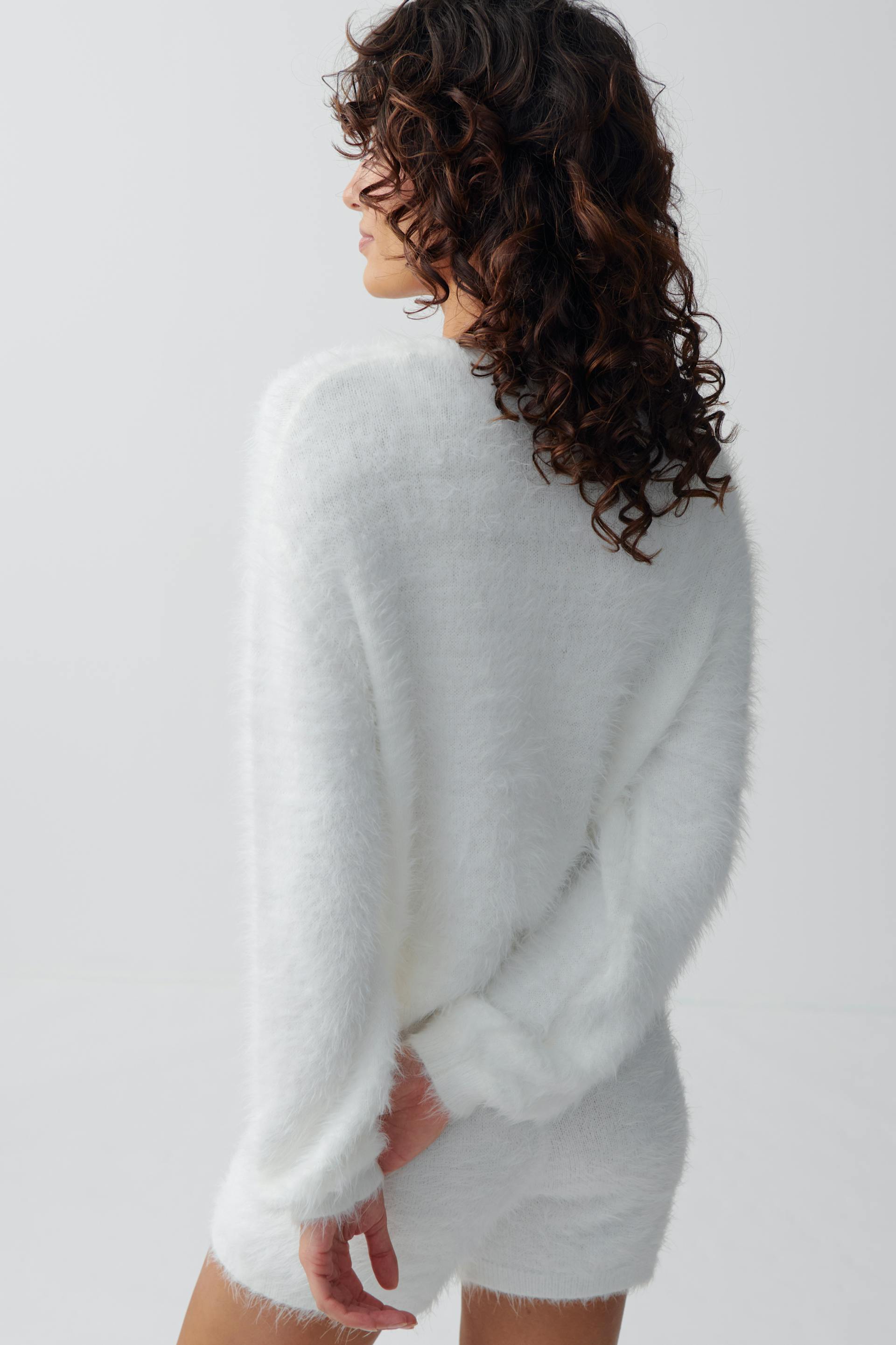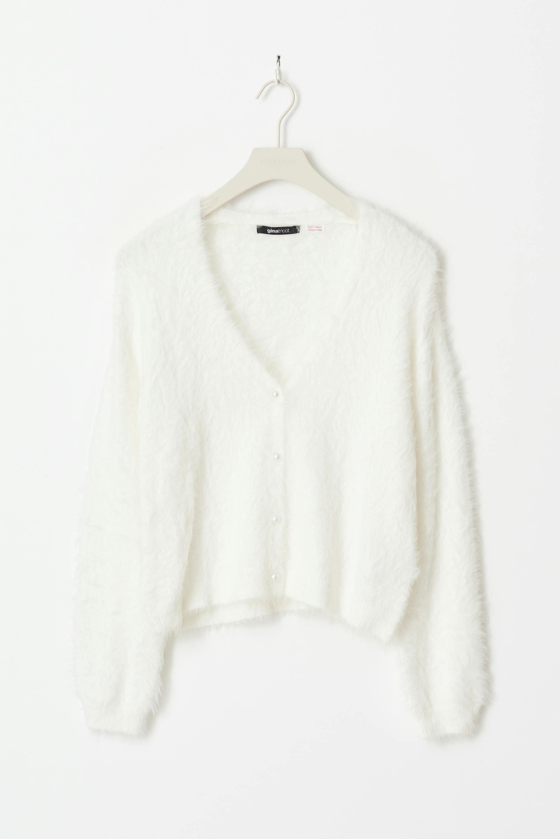 Fluffig kofta med oversize fit. Koftan är vit och har knäppning fram. Den har lång ärm, nedhasad axel och v-ringning.