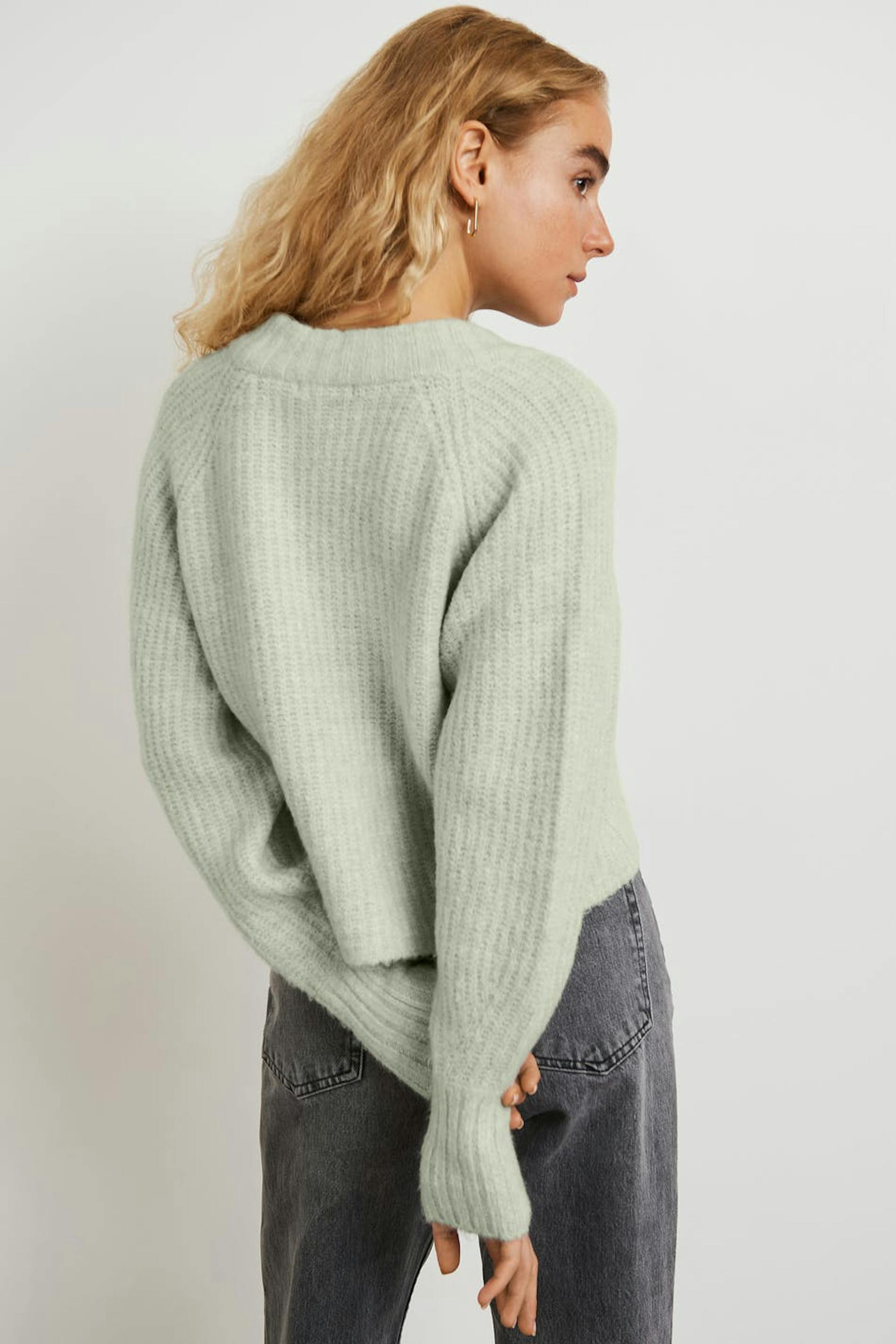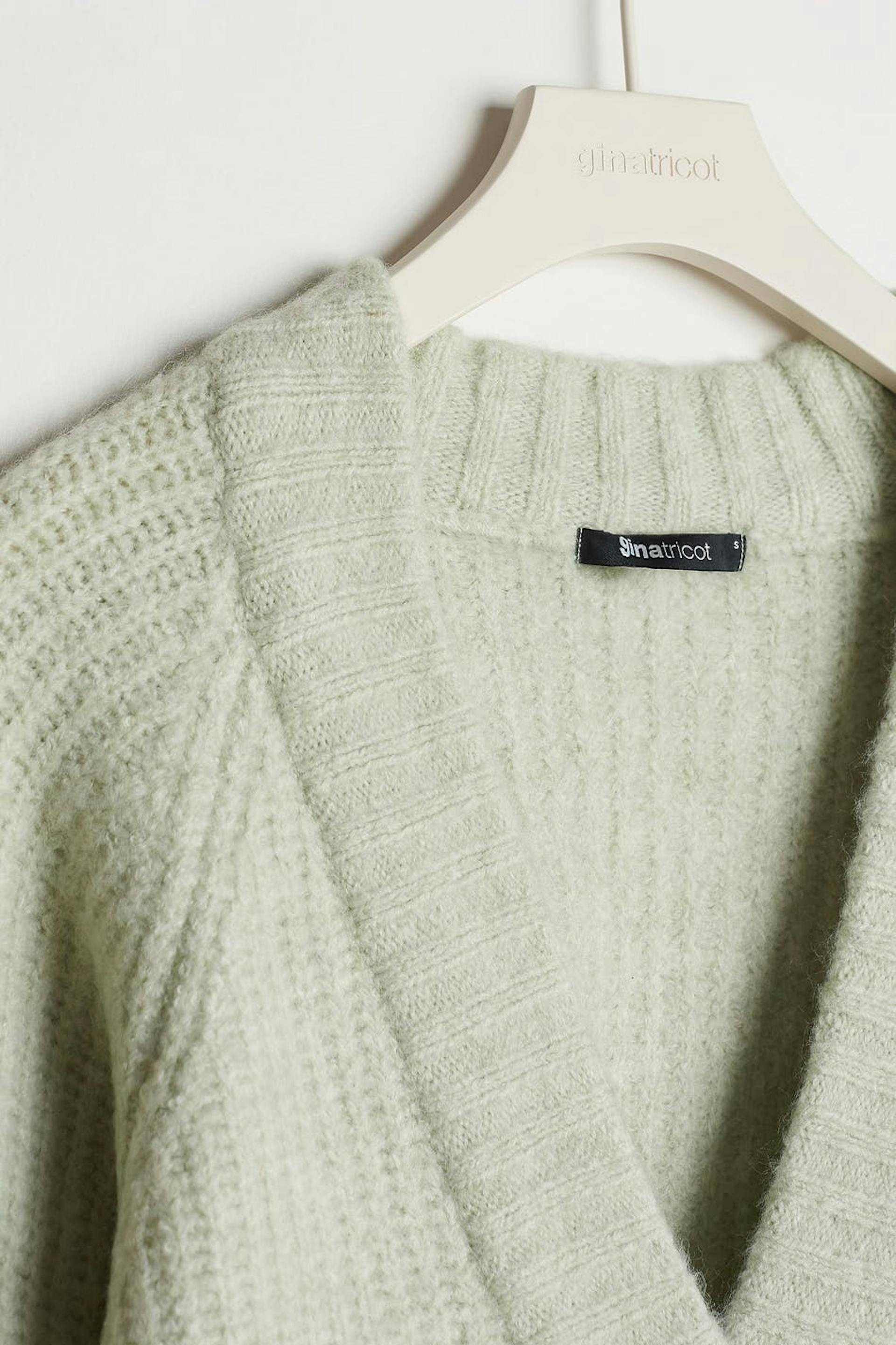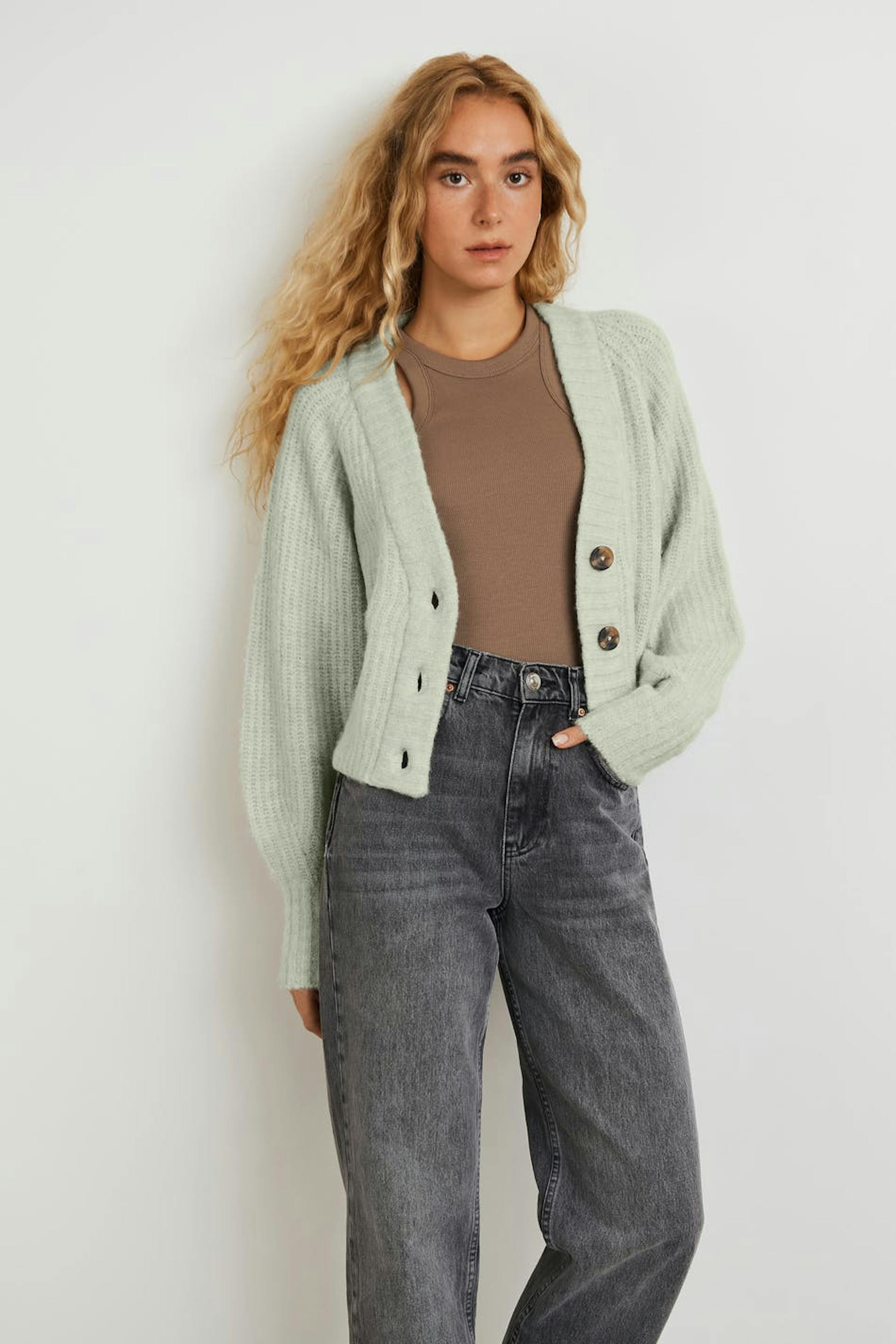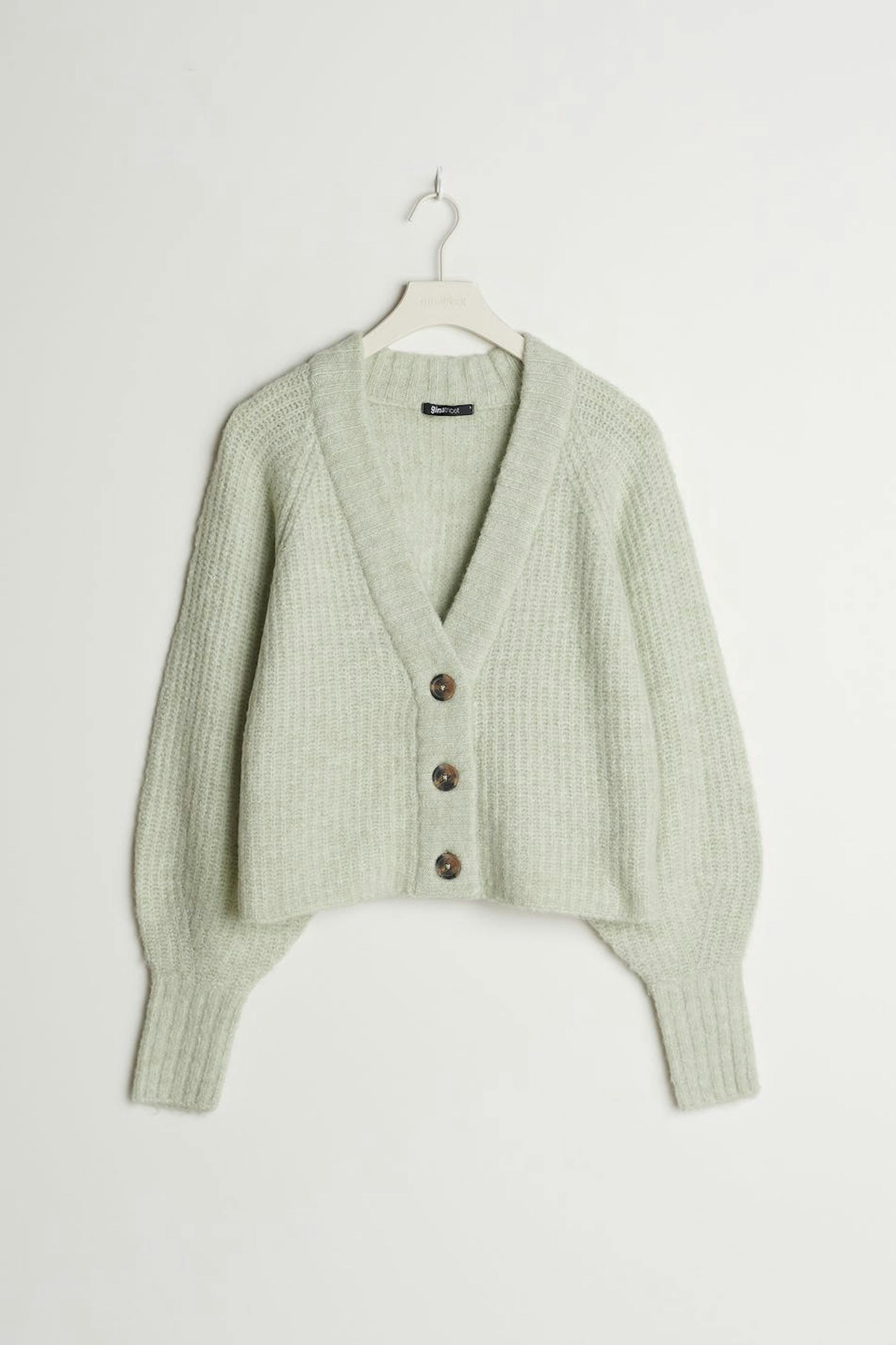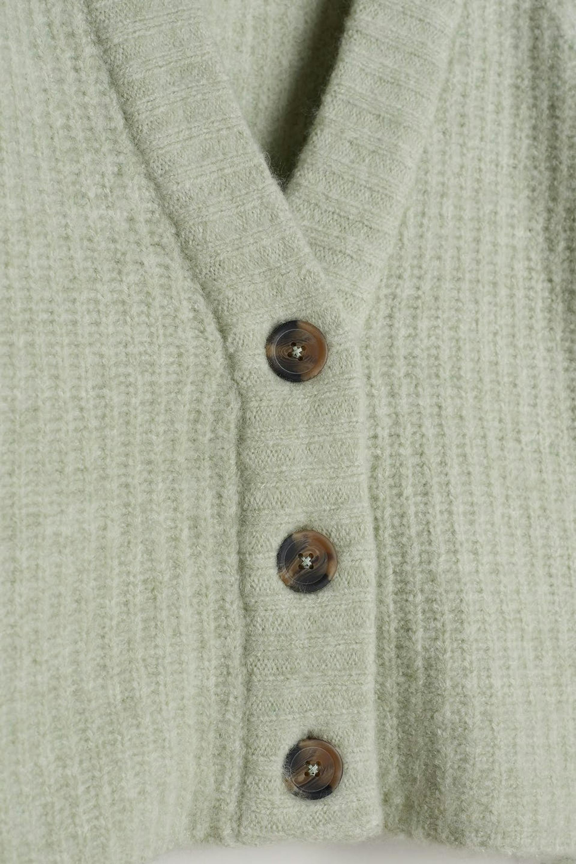 Stickad cardigan med en boxig passform. Cardigan är grön, långärmad och croppad. Den har en v-ringning och en knappstängning framtill.