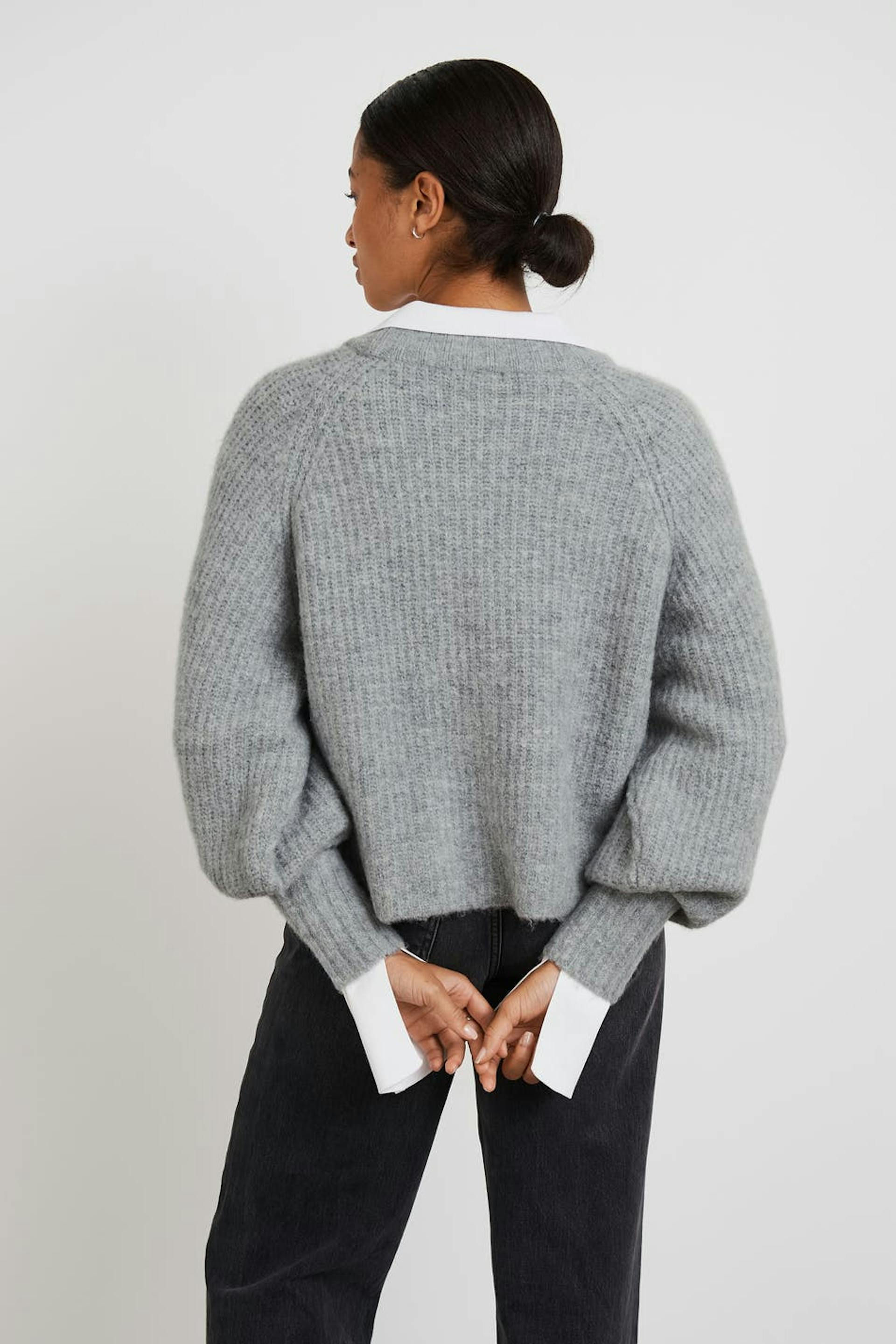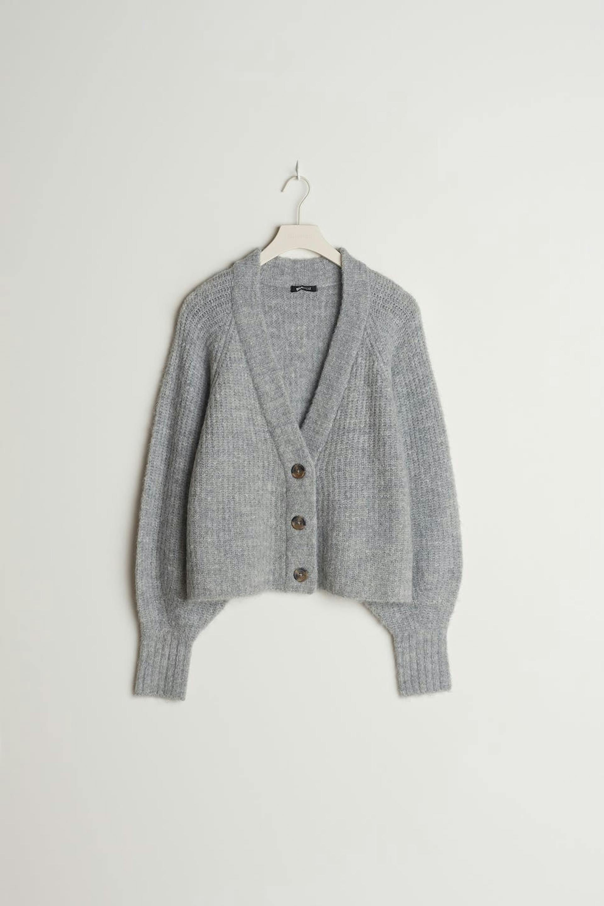 Stickad cardigan med en boxig passform. Cardigan är grå, långärmad och croppad. Den har en v-ringning och en knappstängning framtill.