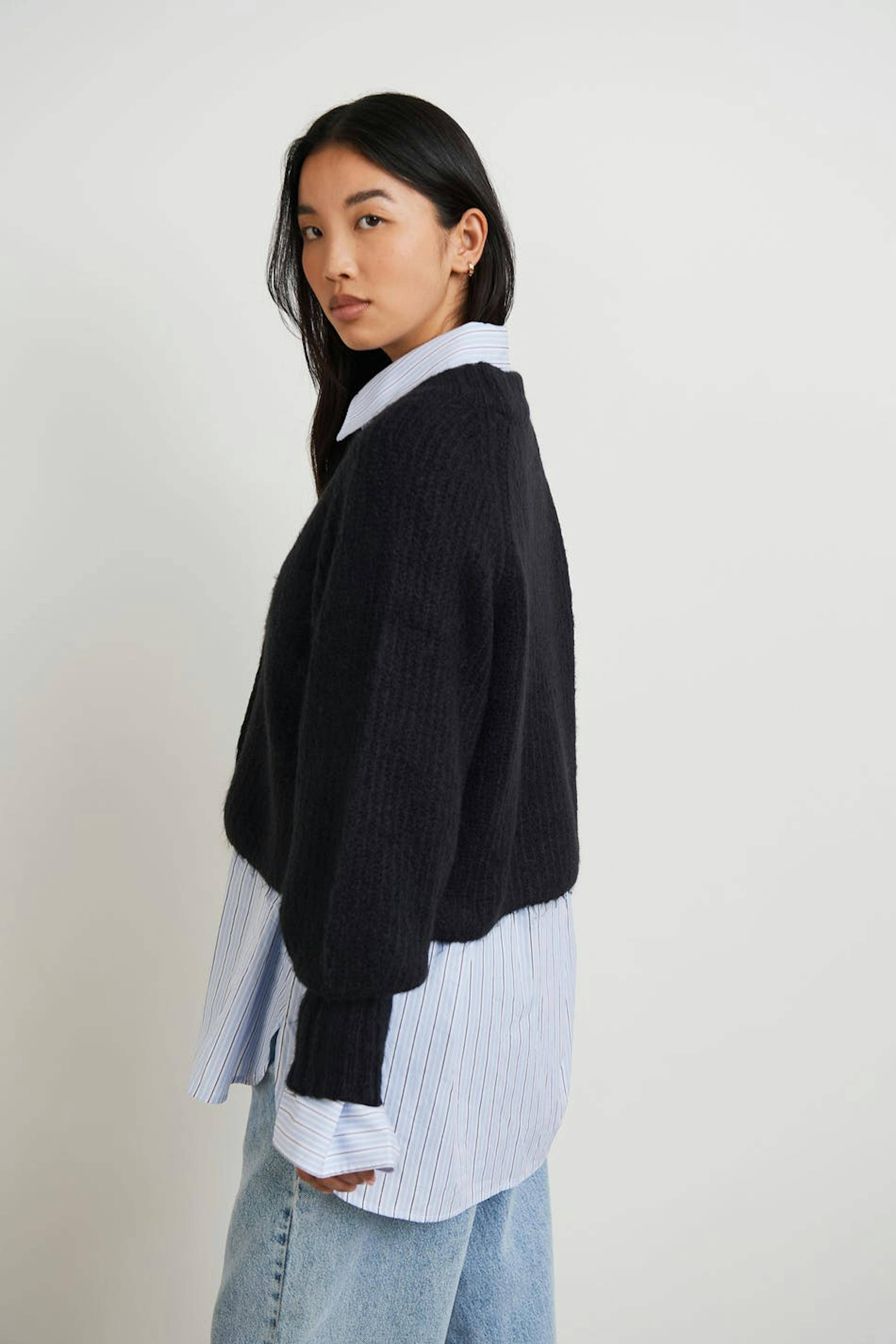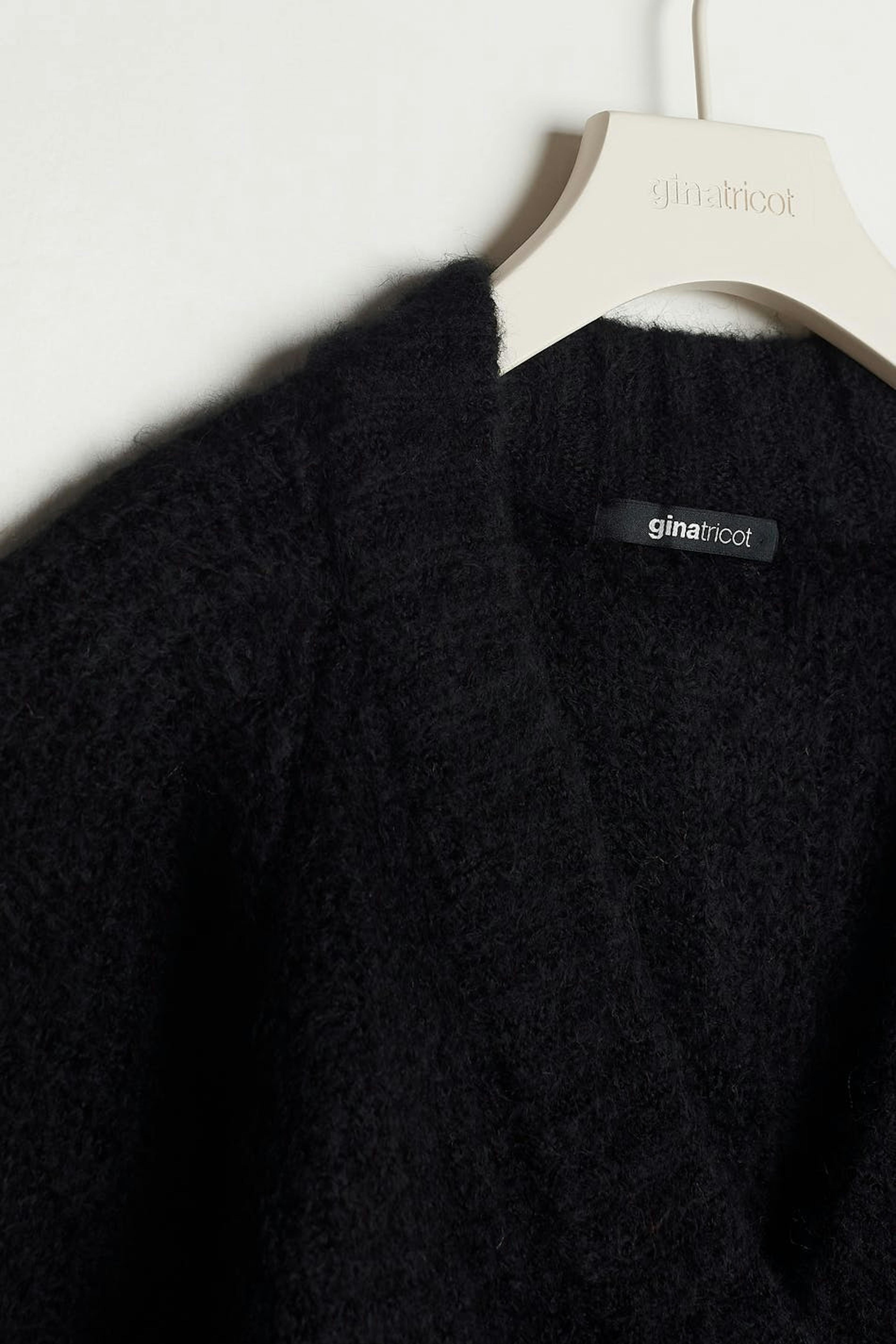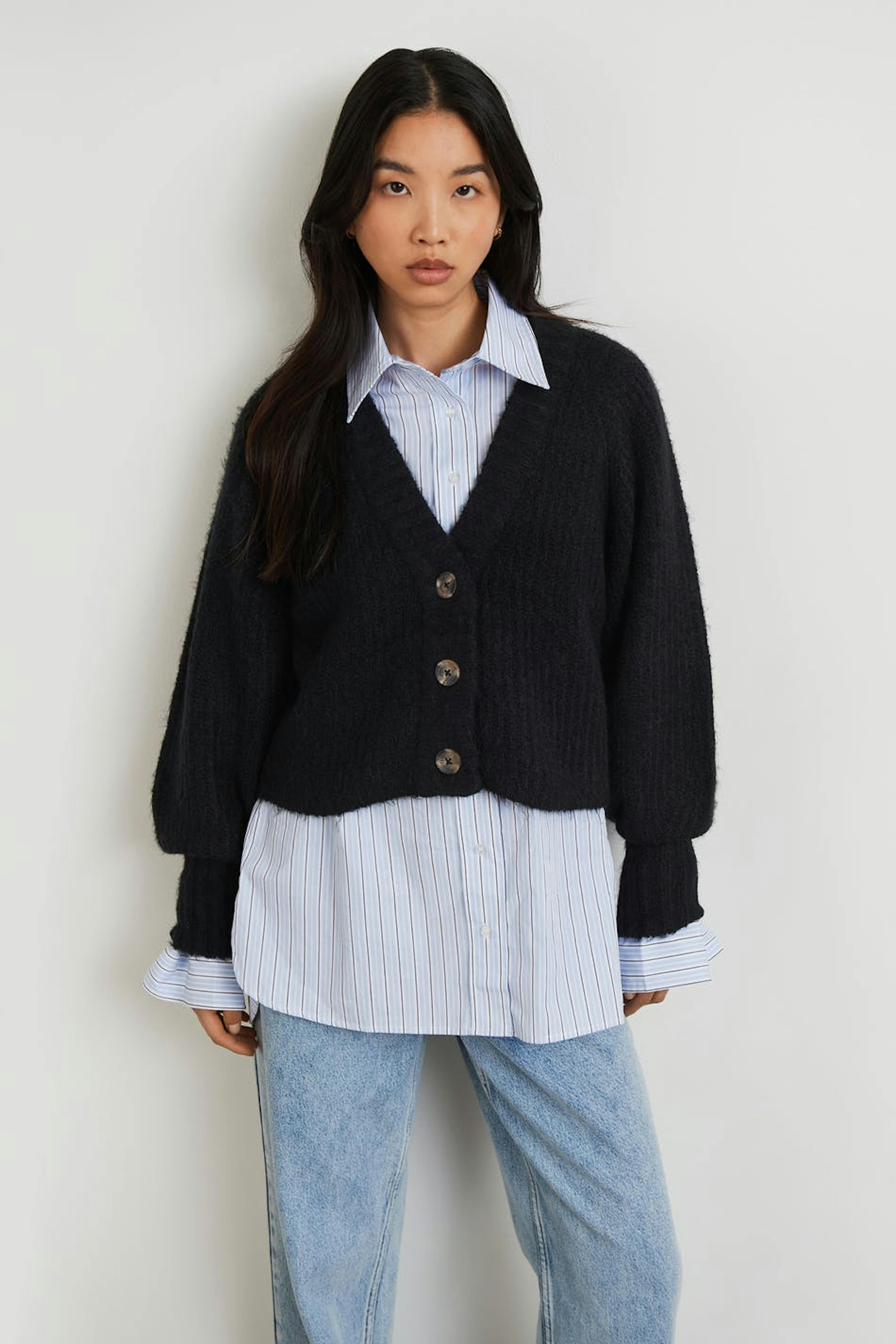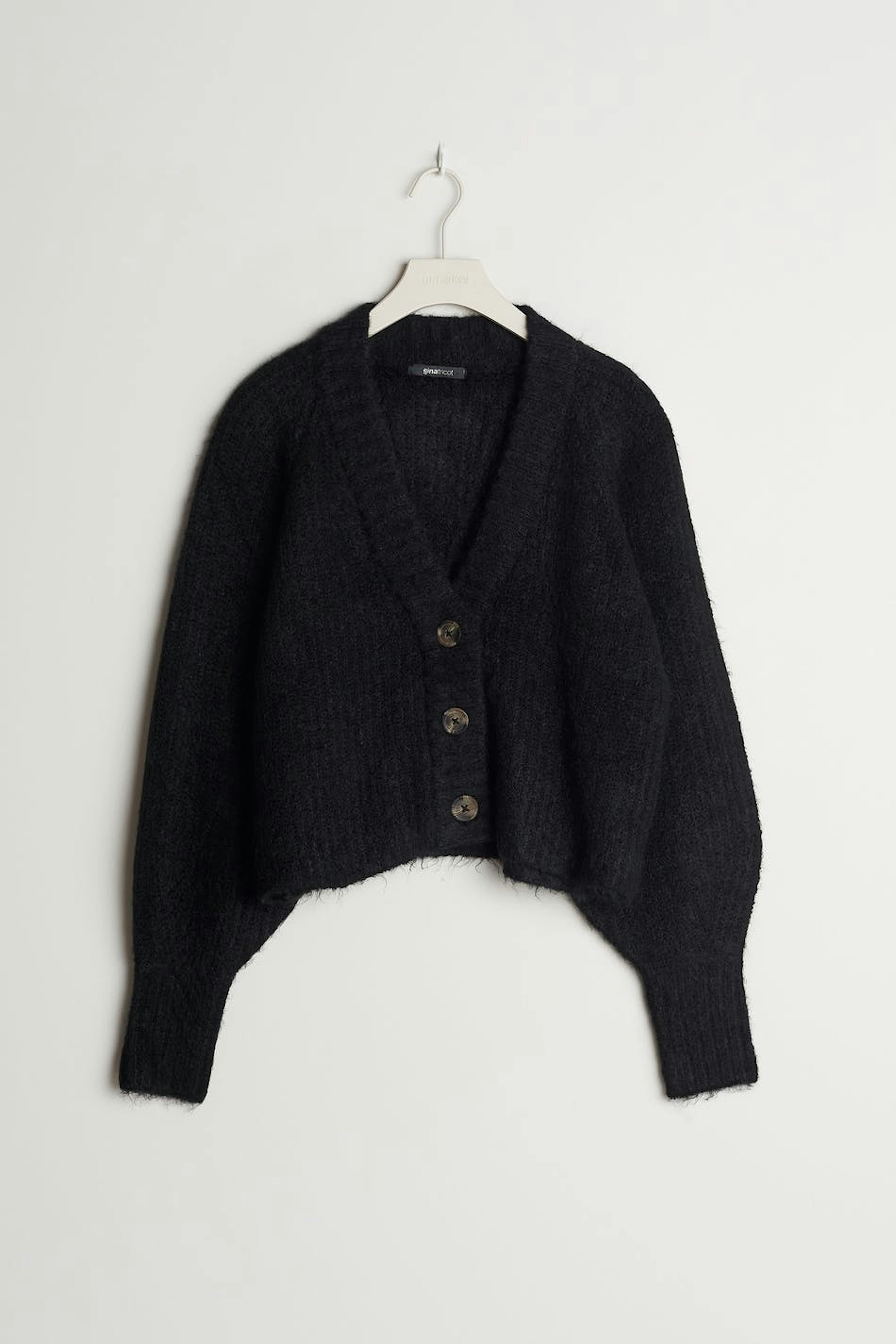 Stickad cardigan med en boxig passform. Cardigan är svart, långärmad och croppad. Den har en v-ringning och en knappstängning framtill.