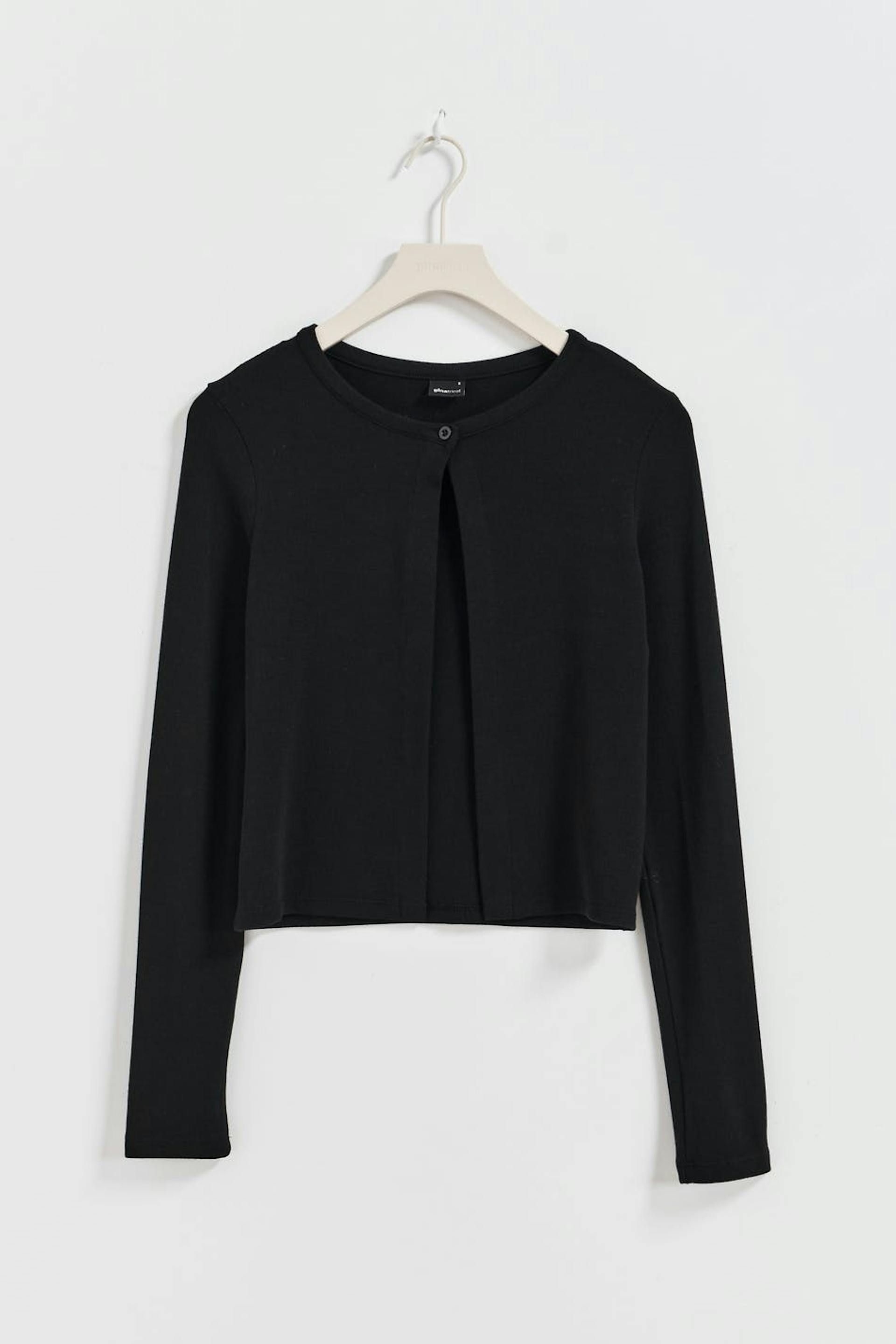 Cardigan i ribbad trikå med figurnära passform. Cardigan är svart och har knäppning med en knapp framtill. Den har rund halsringning, lång ärm och kort längd.