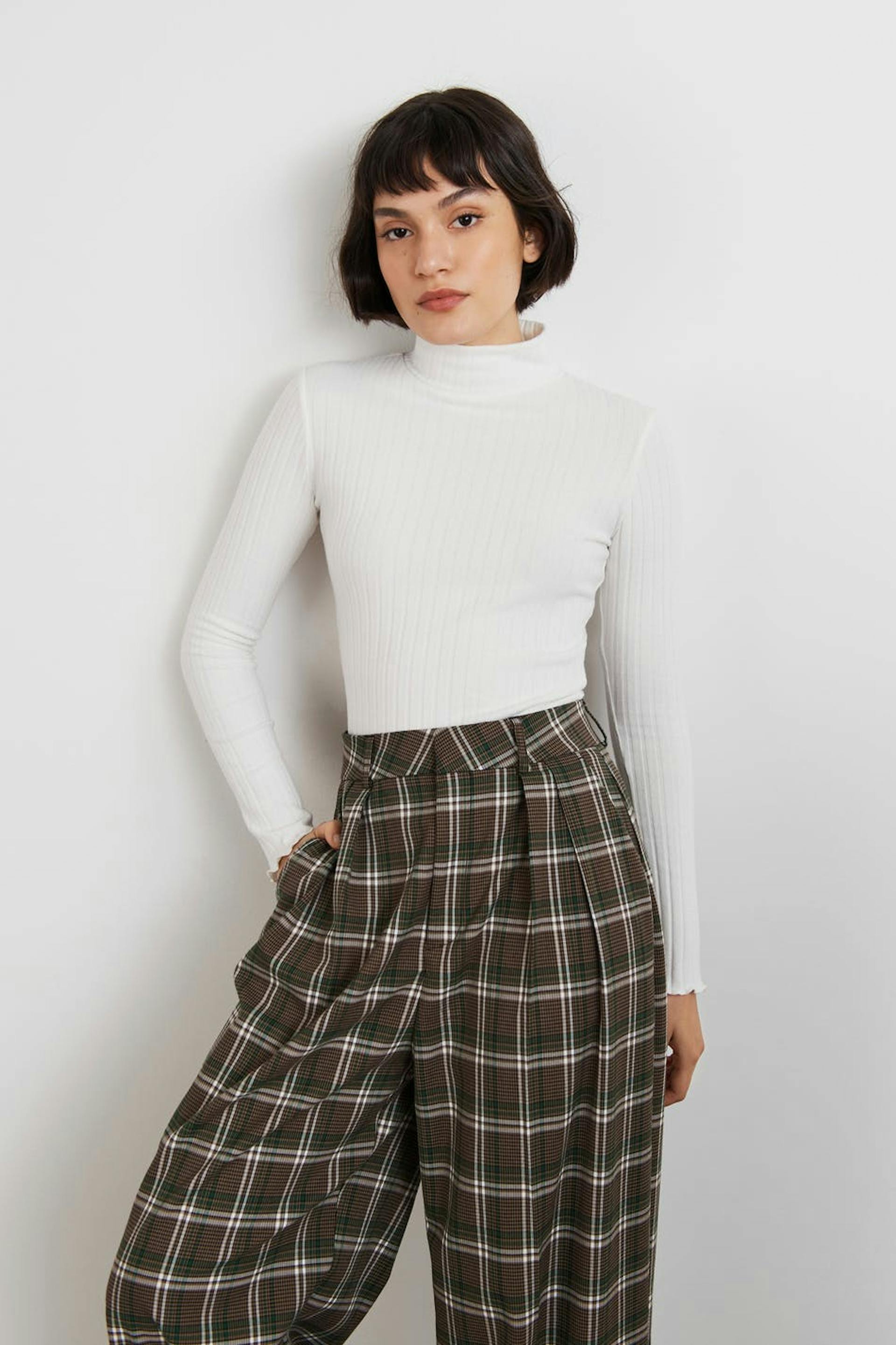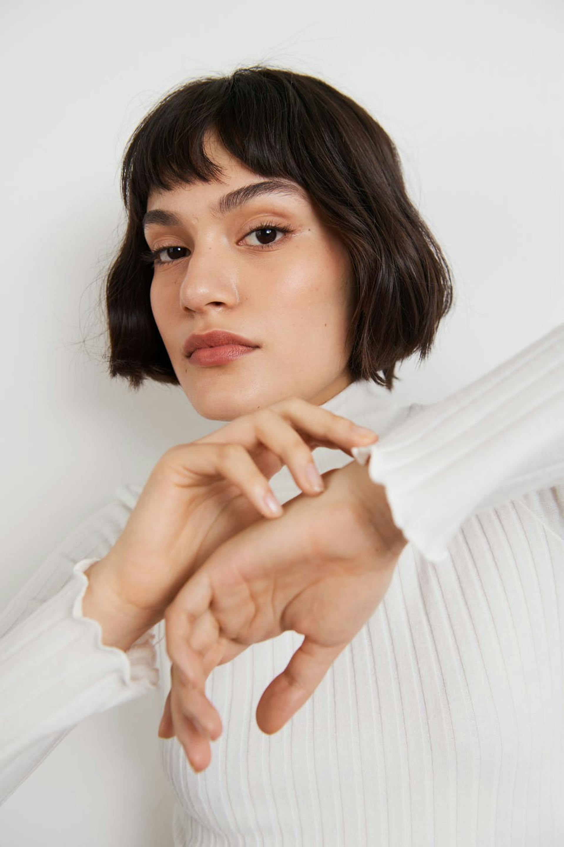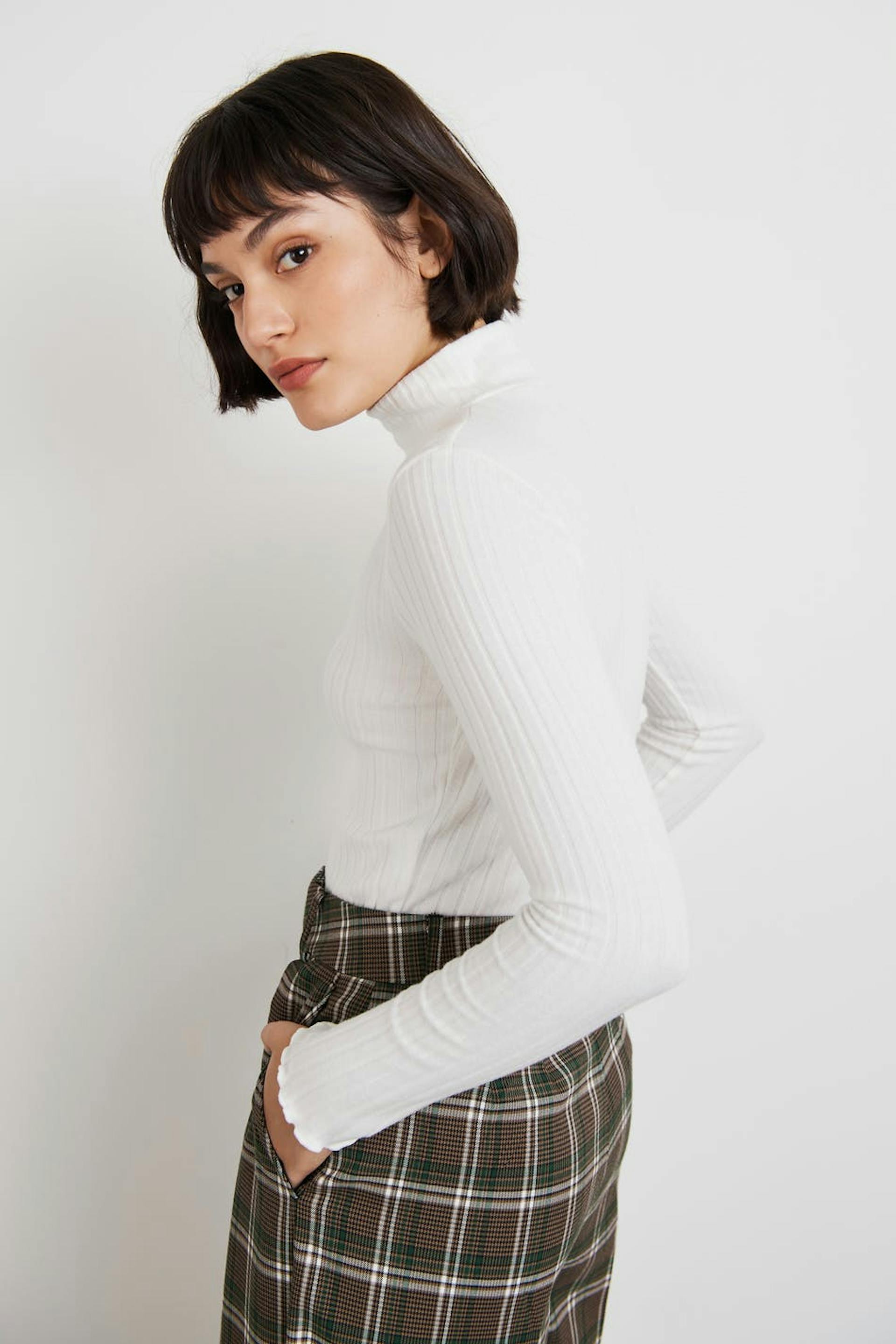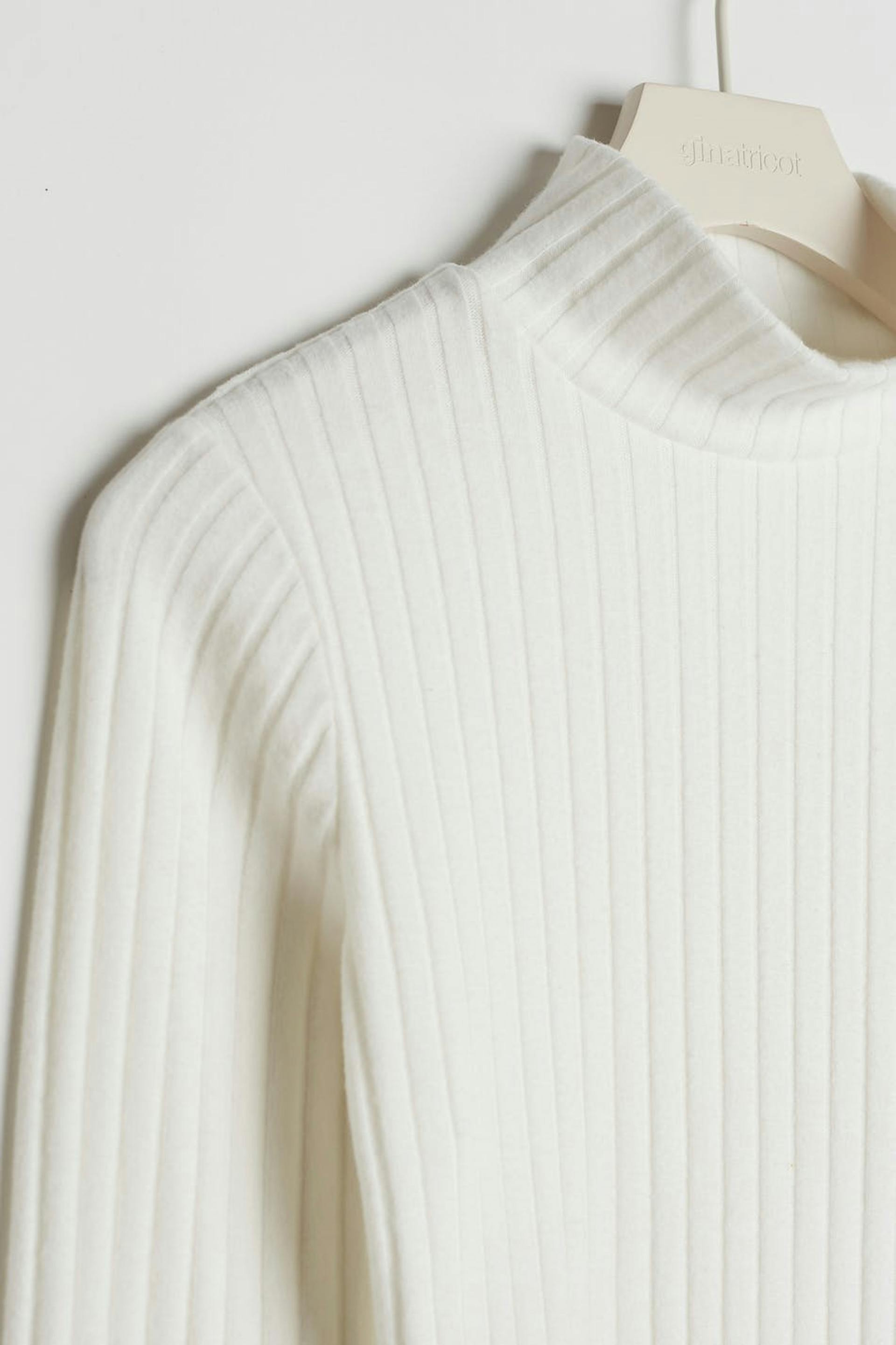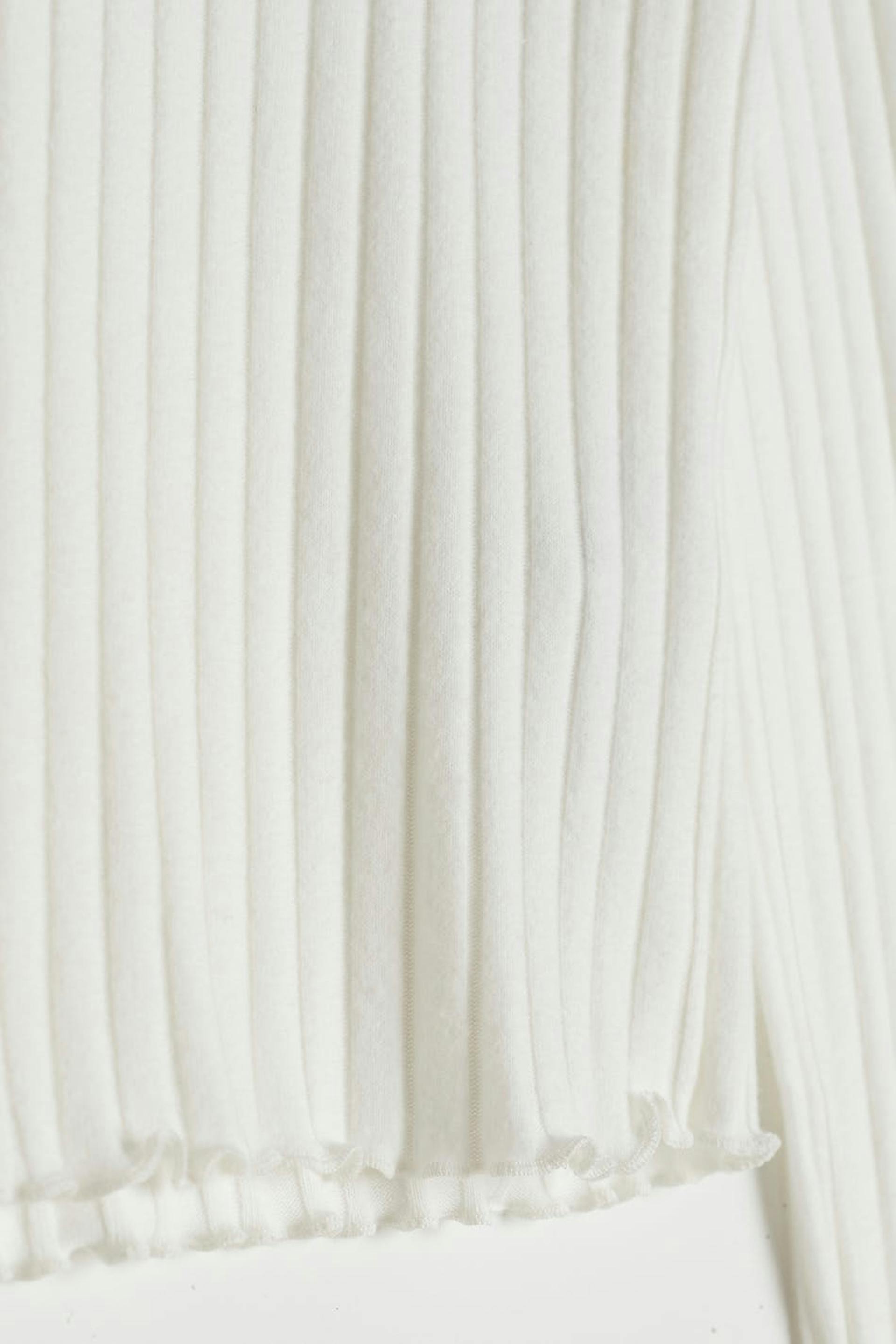 Långärmad topp med en normal passform. Toppen är vit och har en ribbad, mjuk kvalitet. Den har en polokrage, en croppad längd och små volanger vid ärmsluten och på nederfållen.
