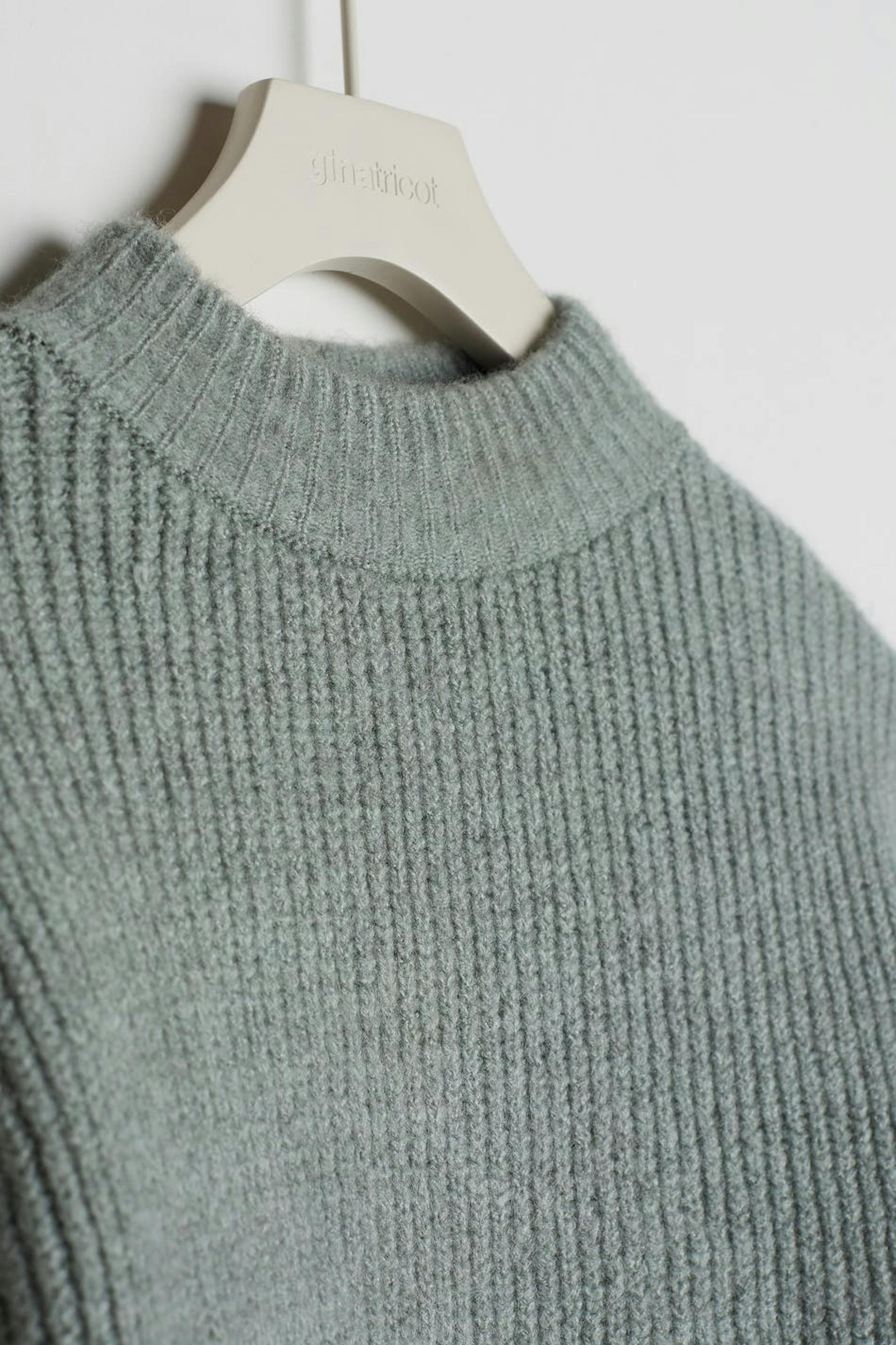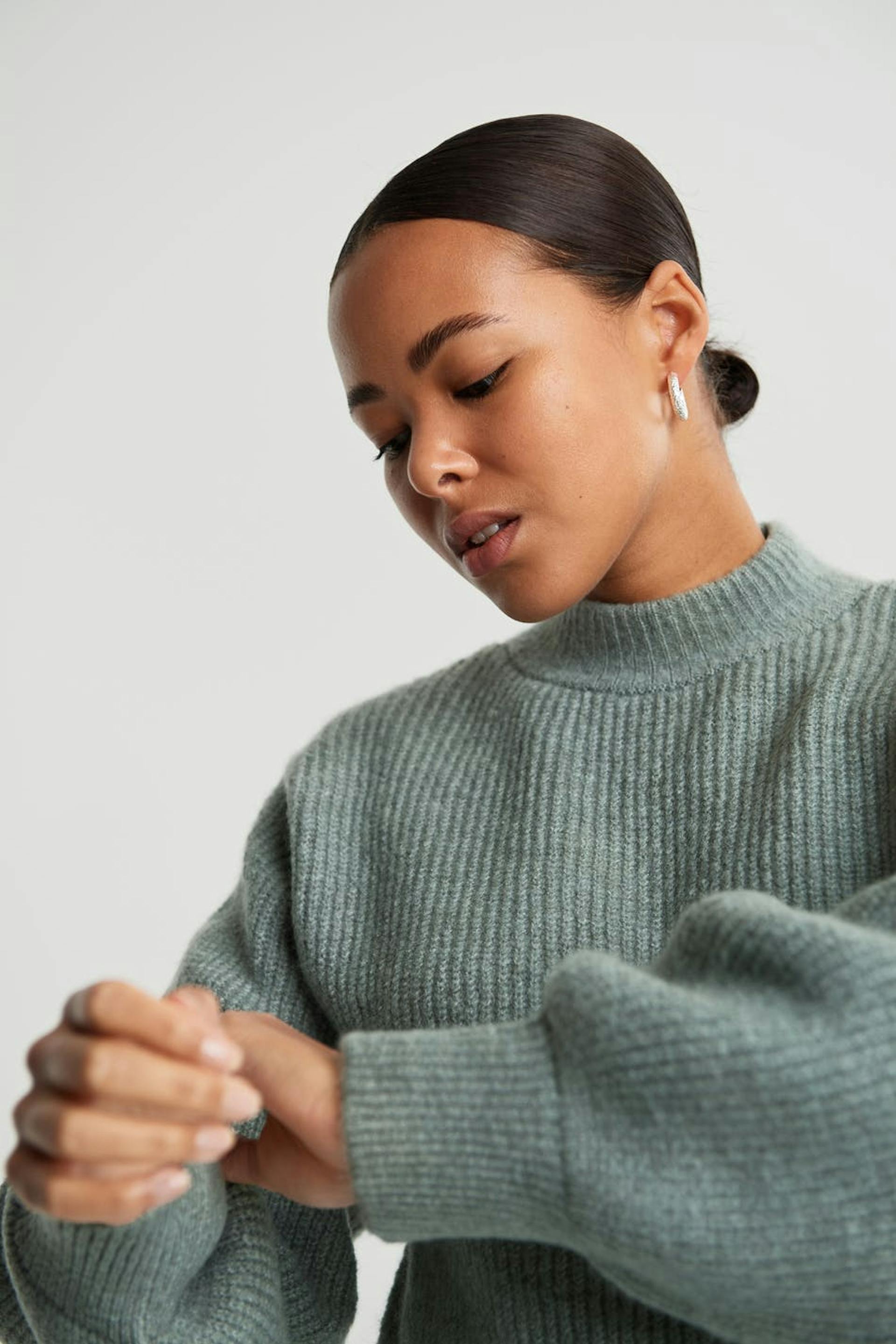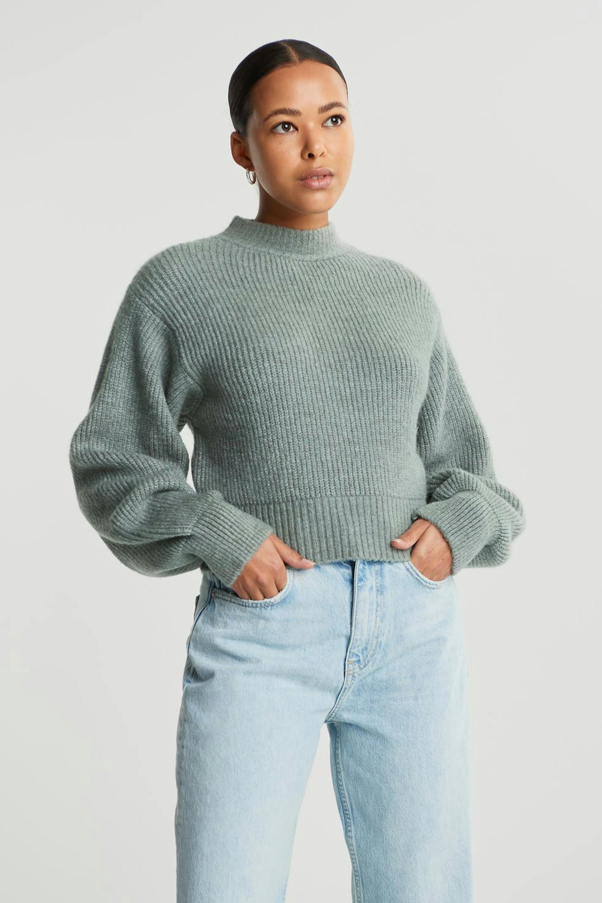 Stickad tröja med en boxig passform. Tröjan är grön.