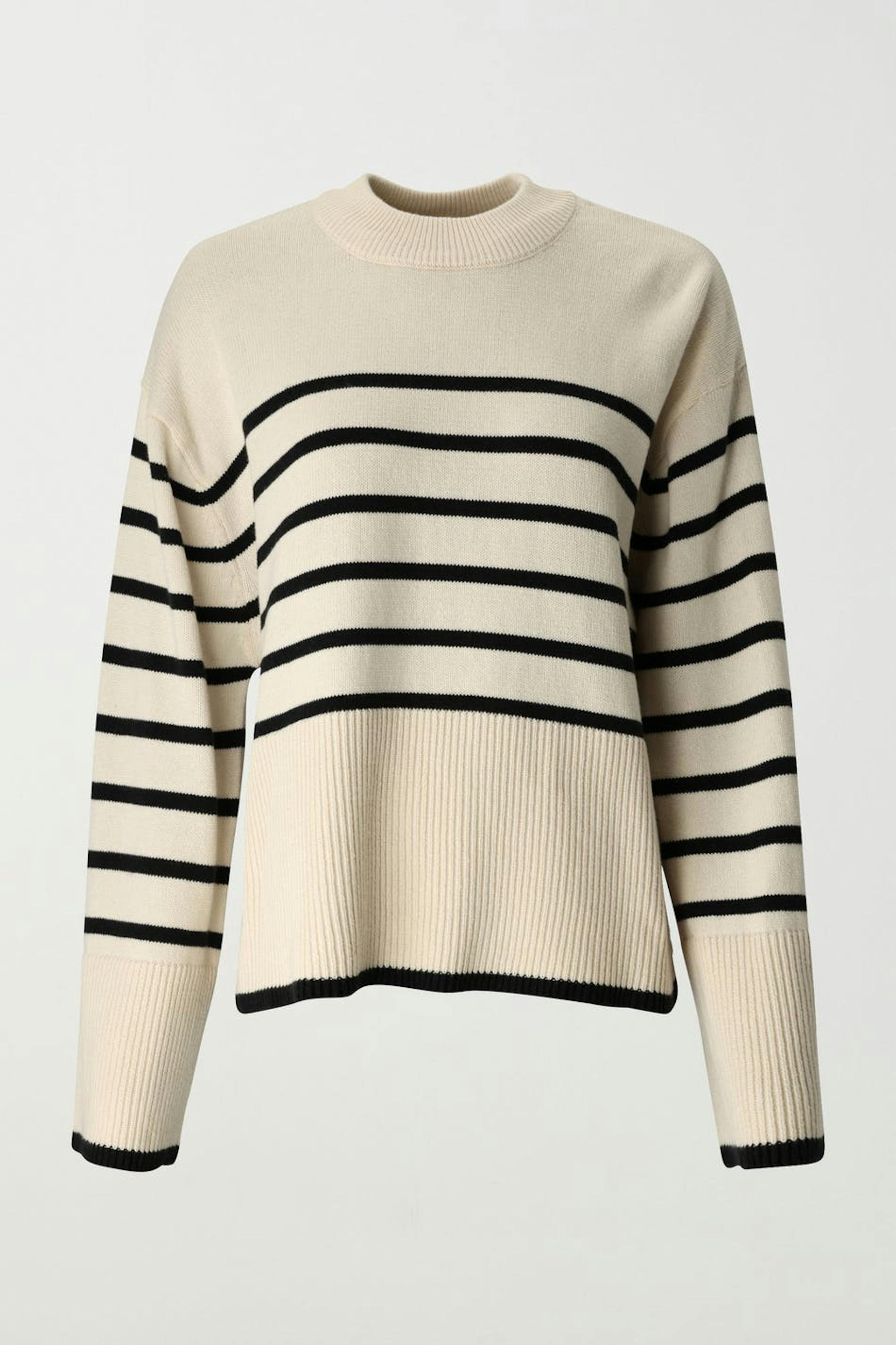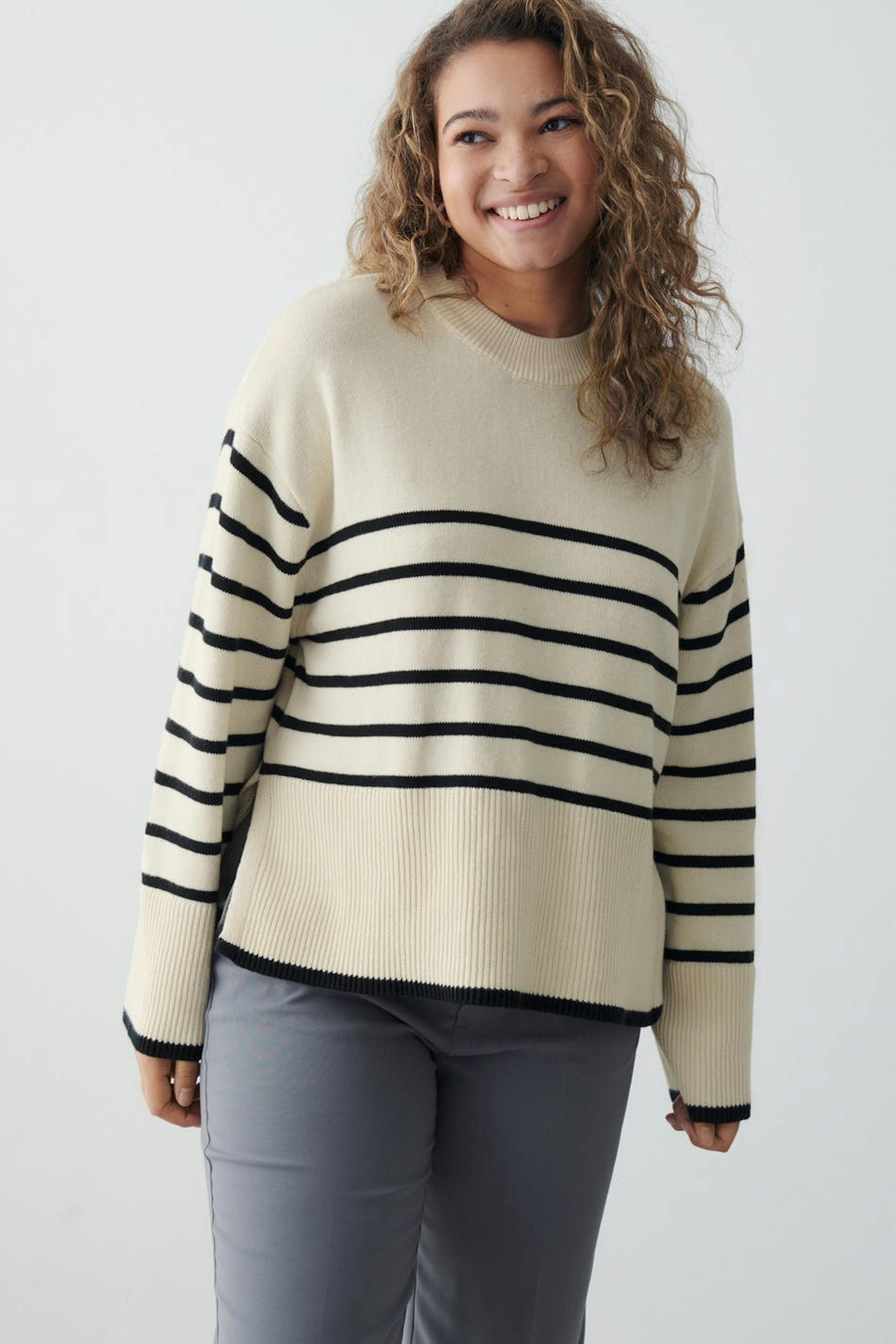 Randig stickad tröja med rund halsringning. Tröjan är vit och har slits i sidorna.