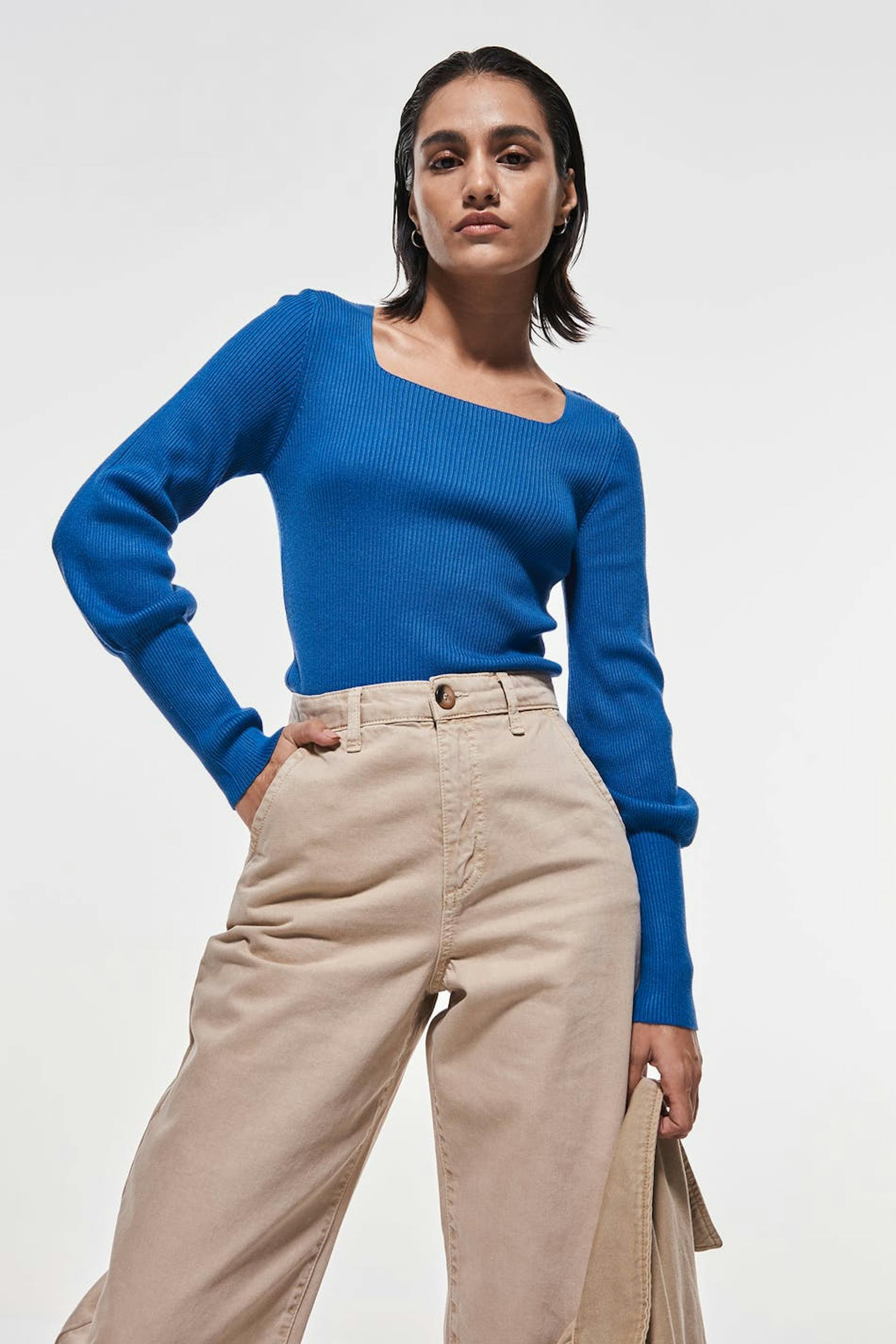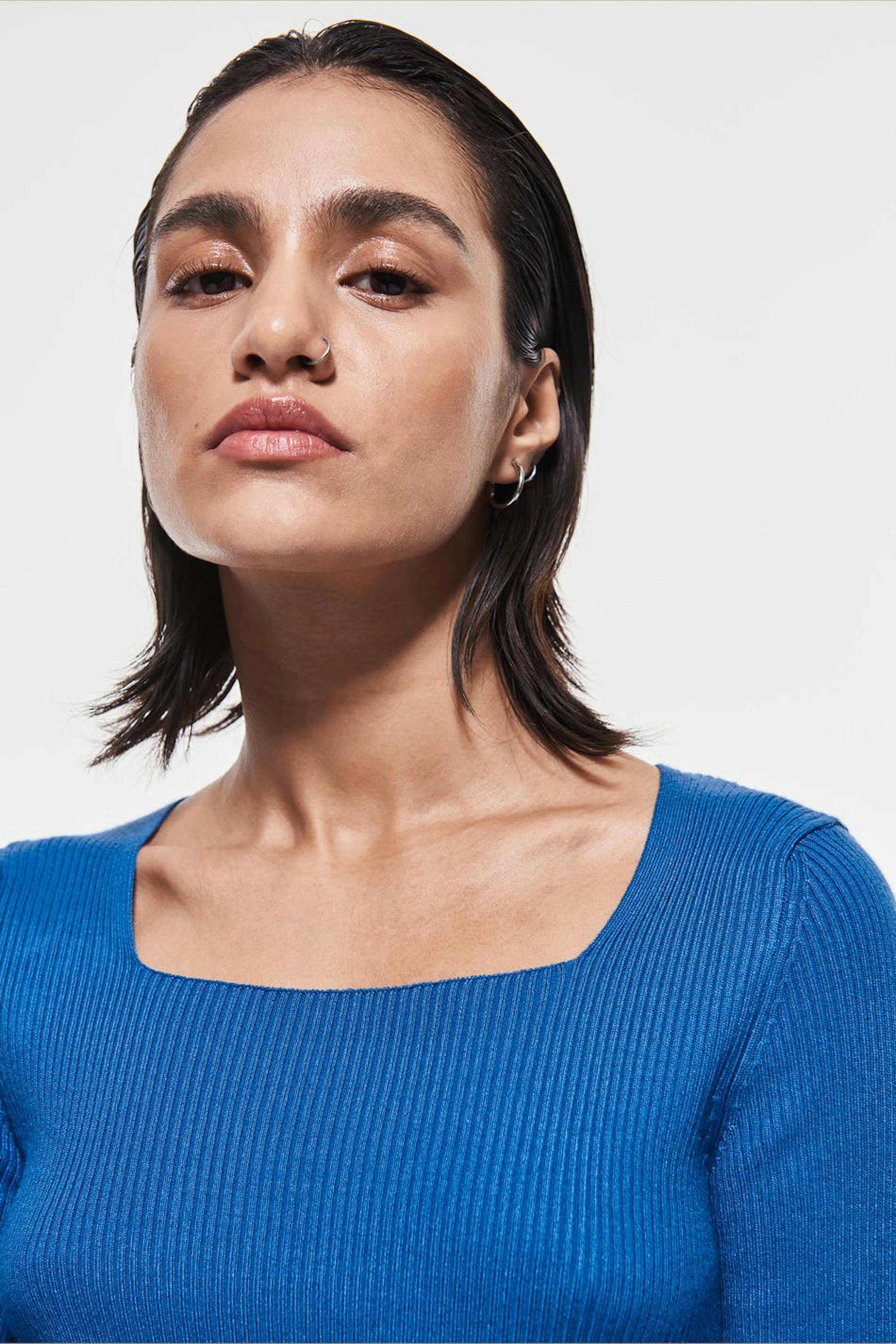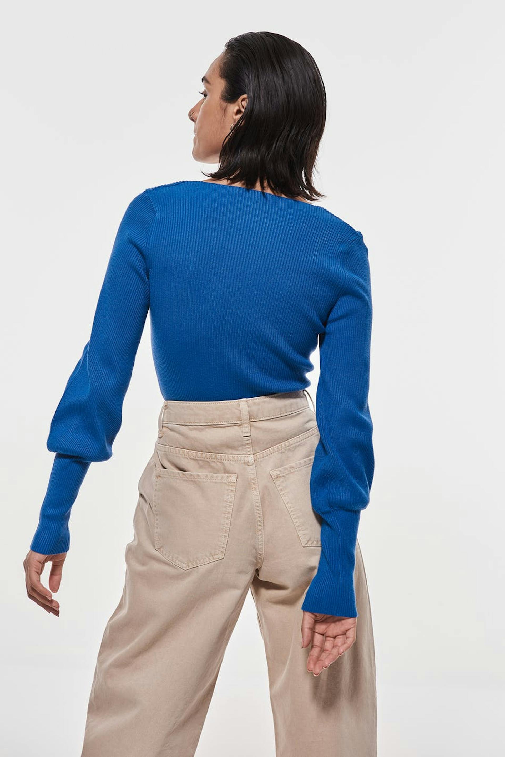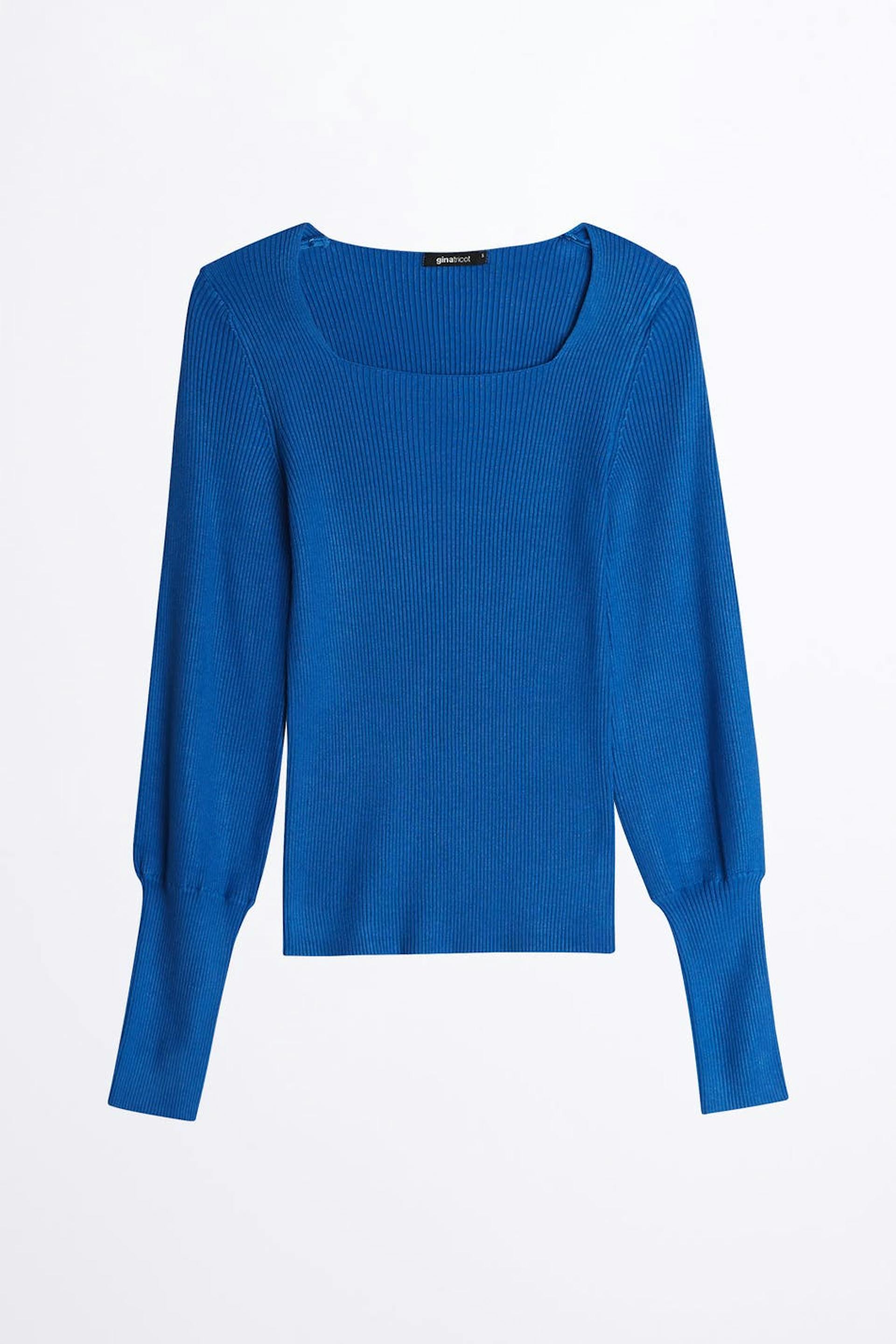 Stickad tröja med en fyrkantig halsringning. Blå, stickad, ribbad och långärmad.