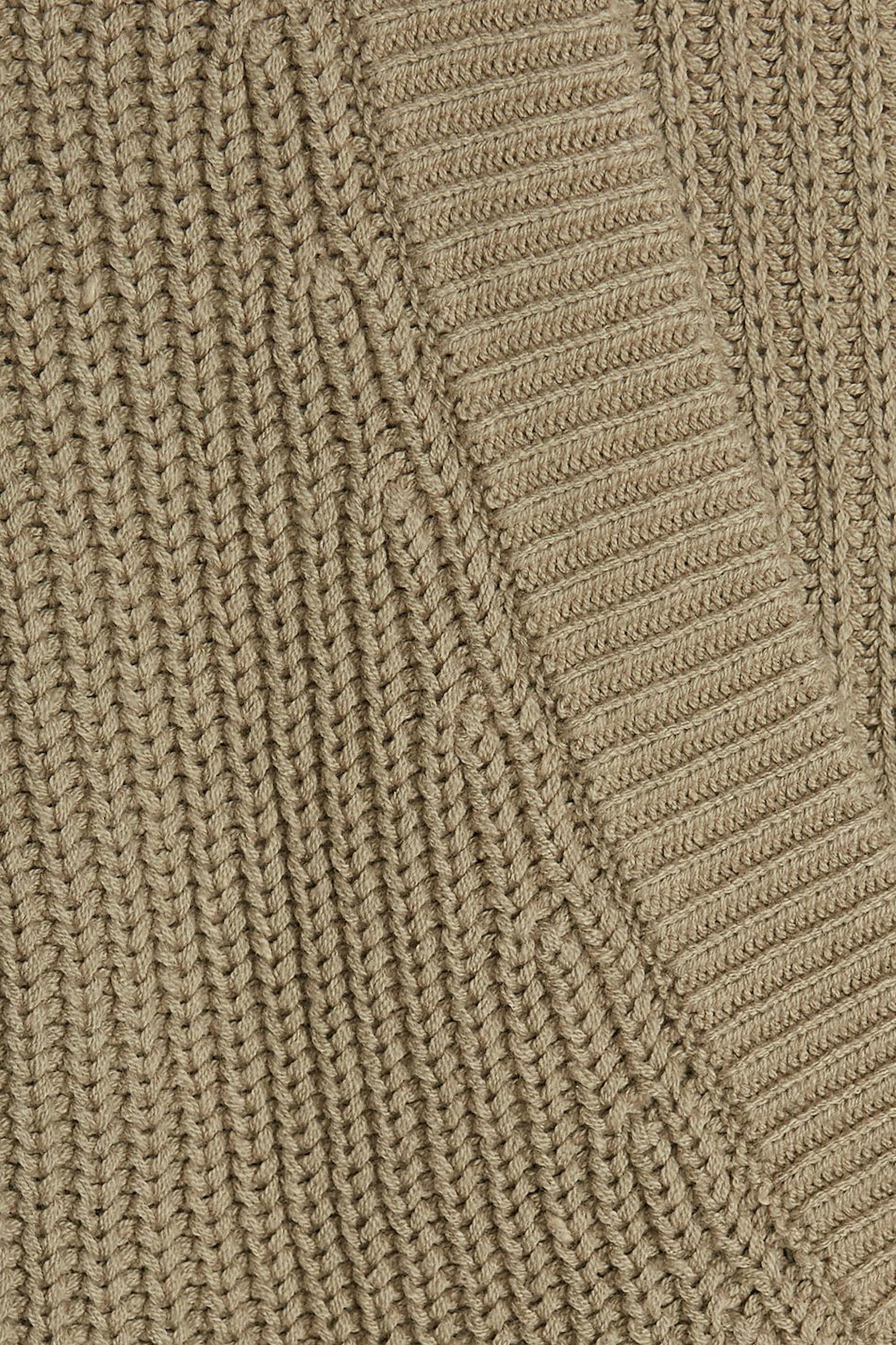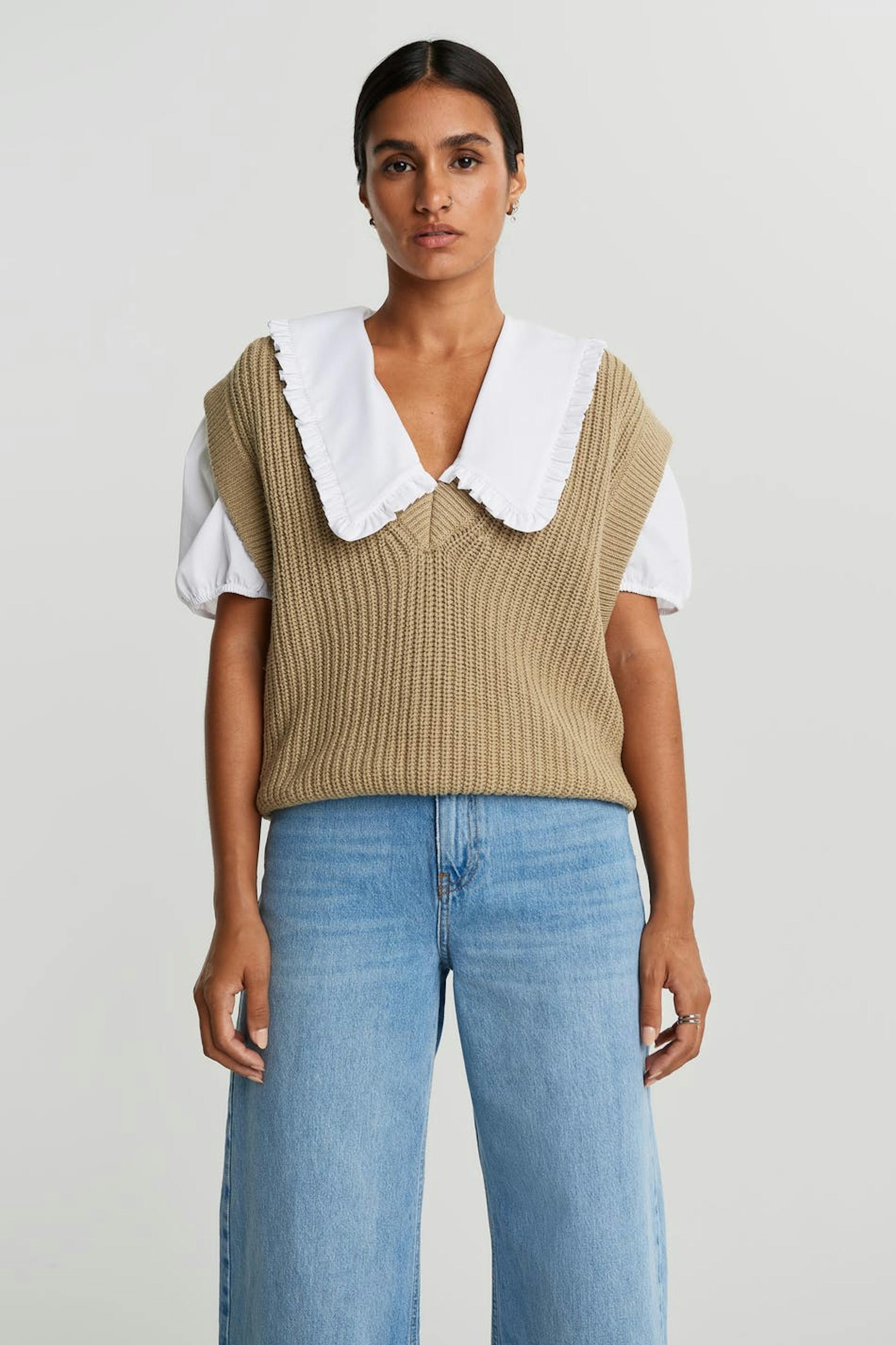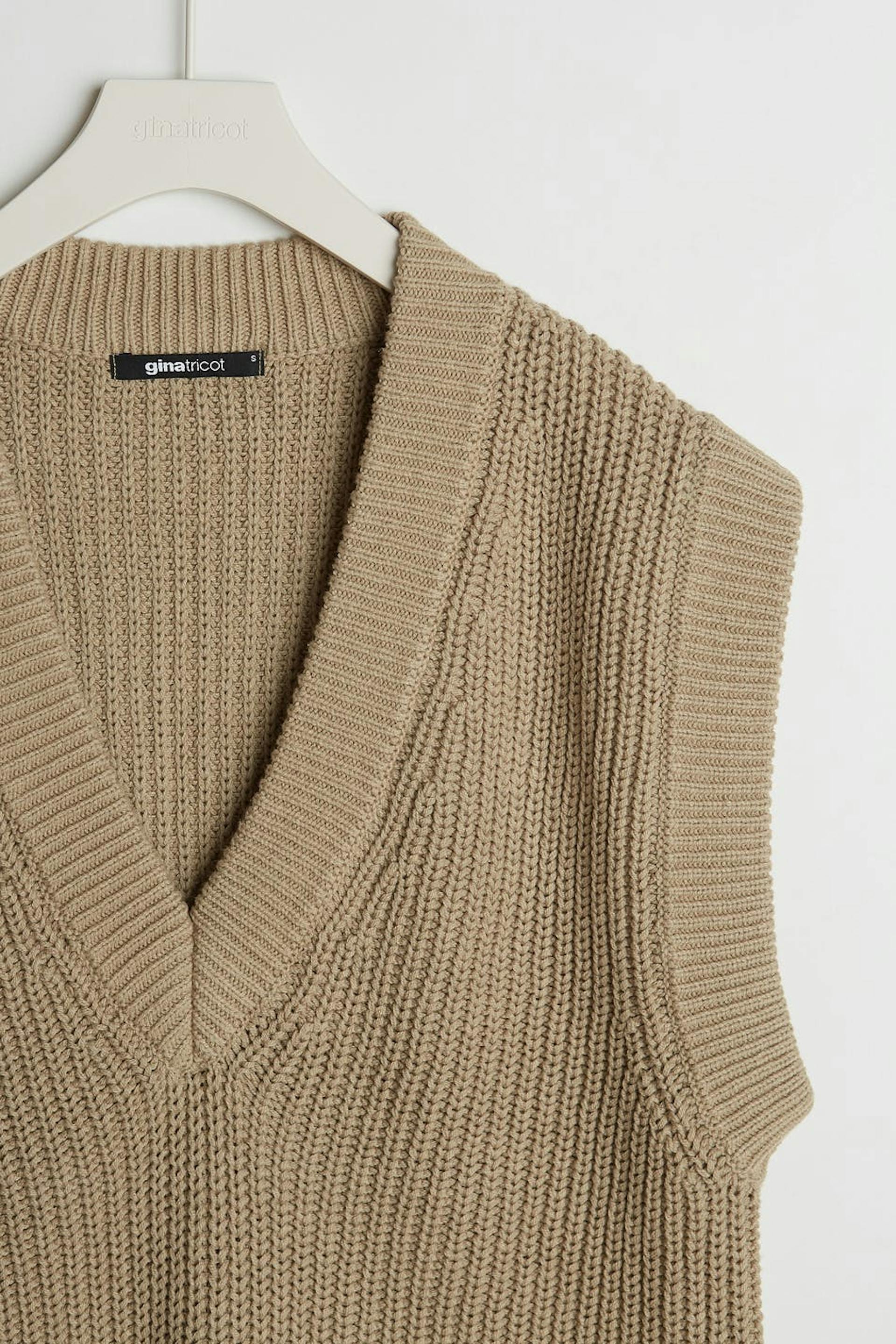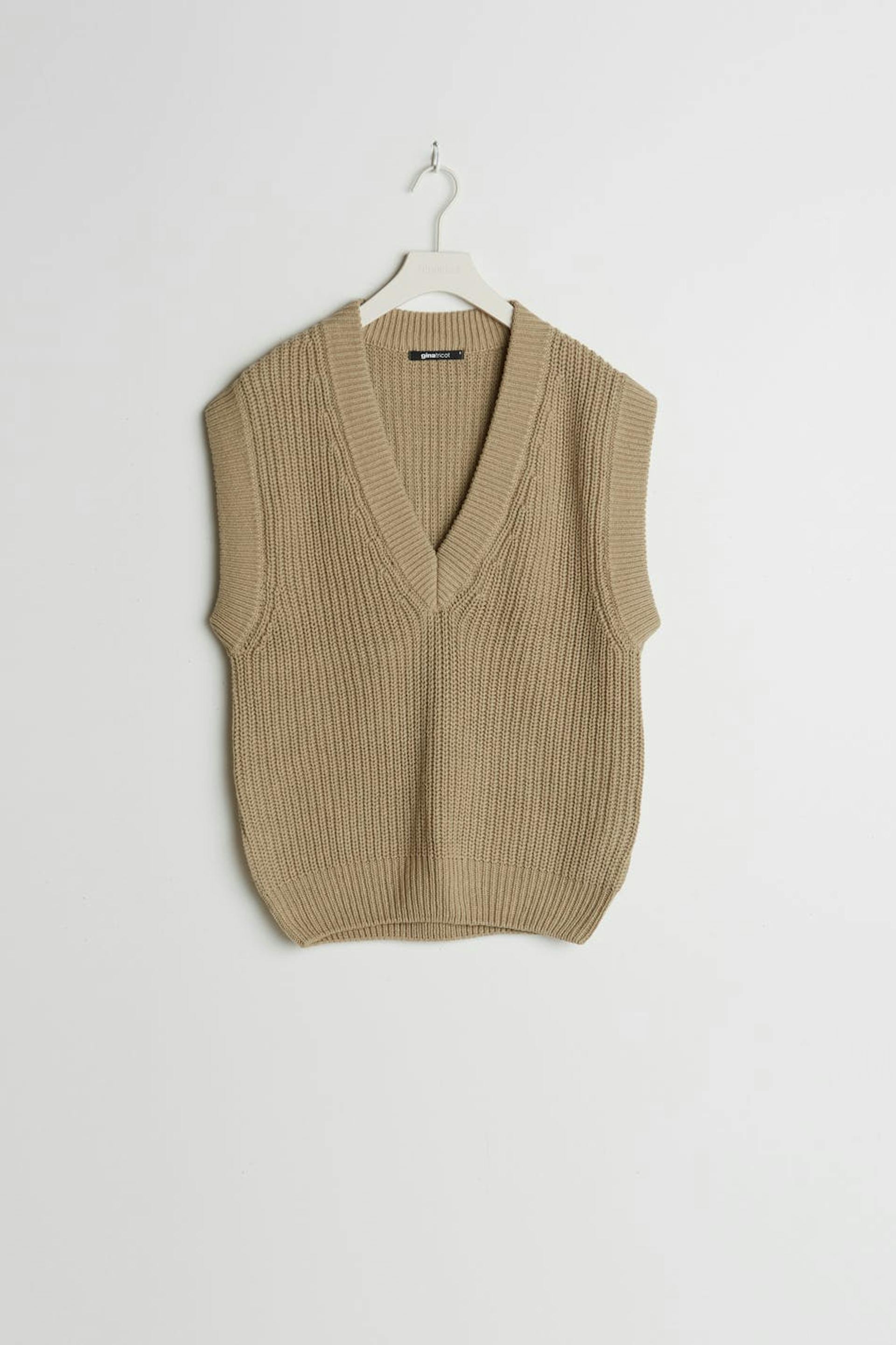 Stickad väst med en v-ringning. Västen är beige och kort.