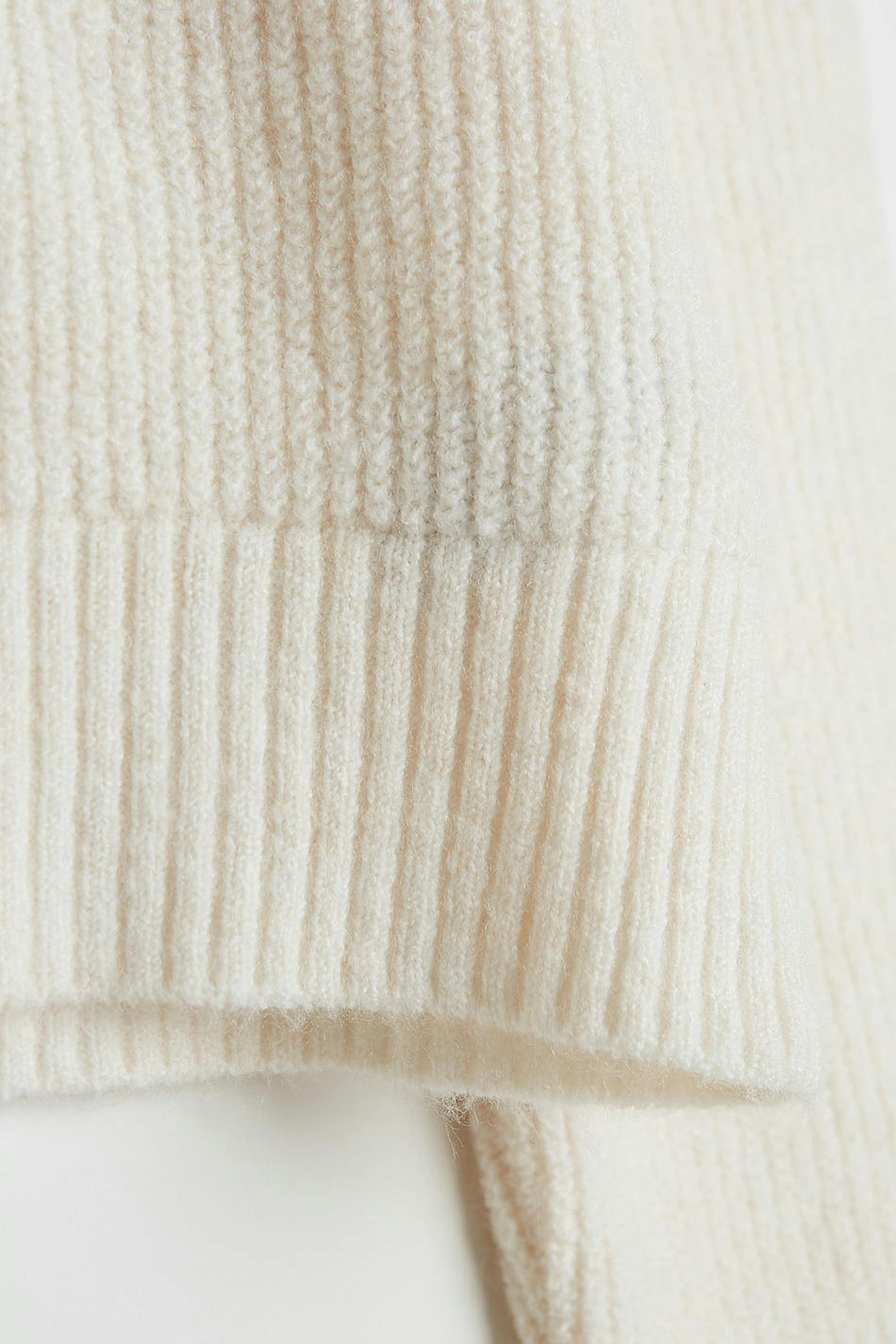Stickad tröja med cutout detaljer på axlarna. Tröjan är vit och långärmad och har en polokrage.