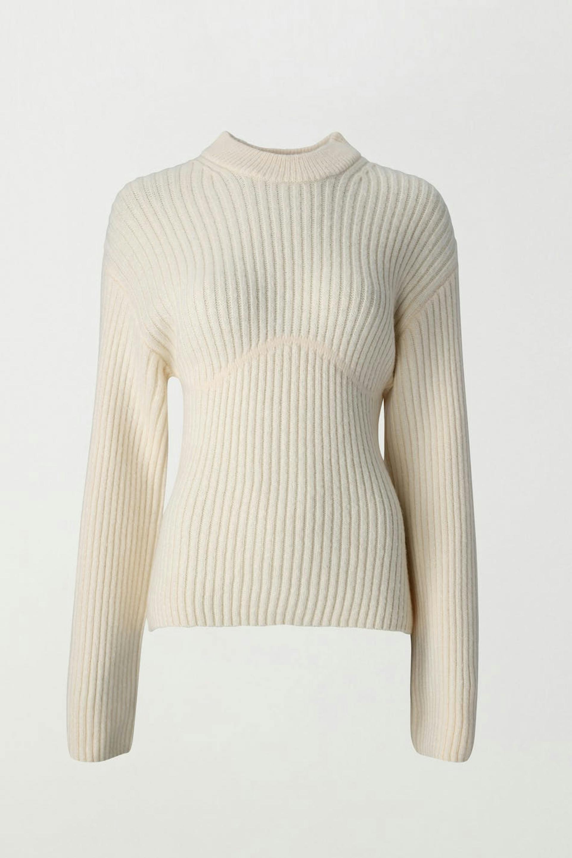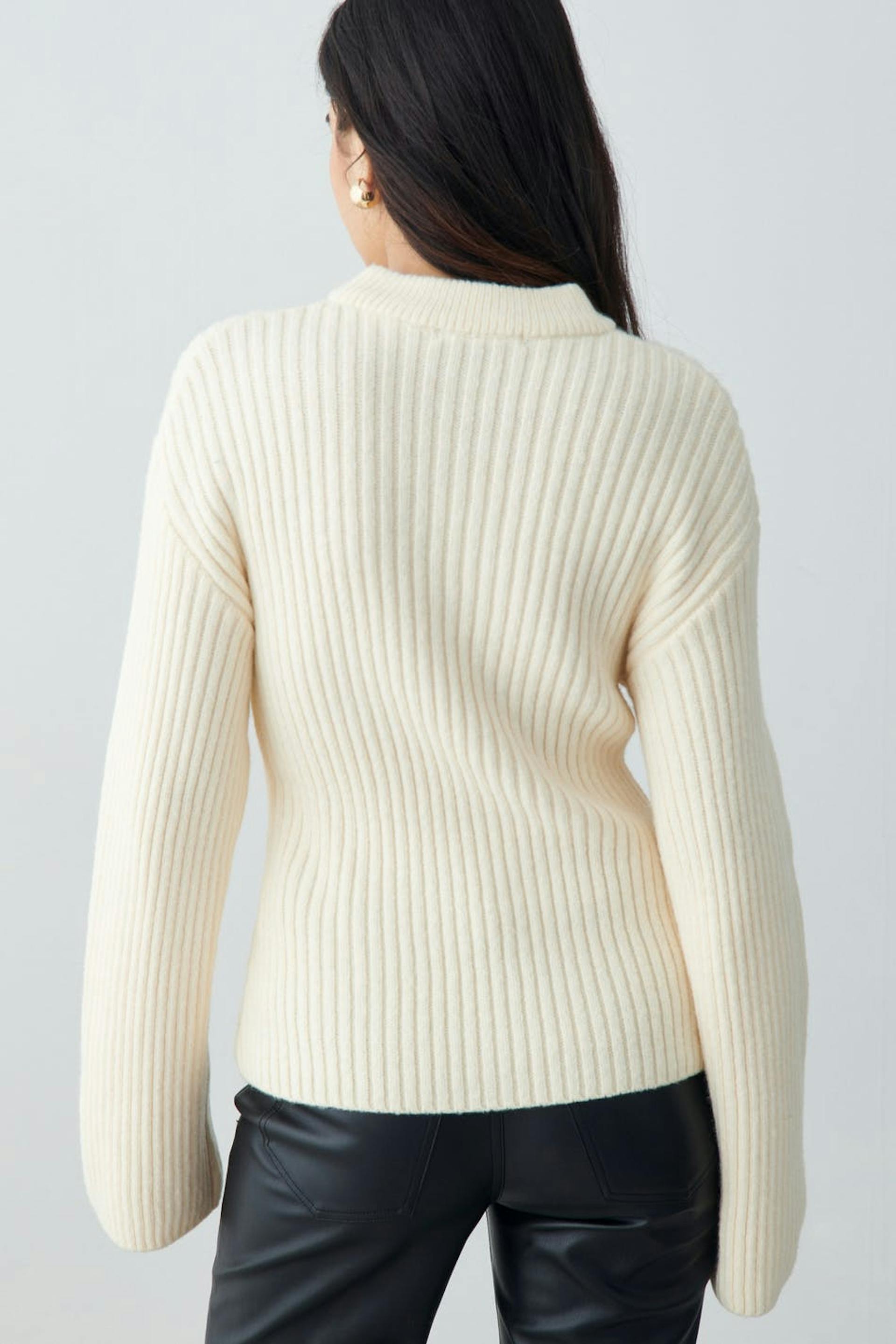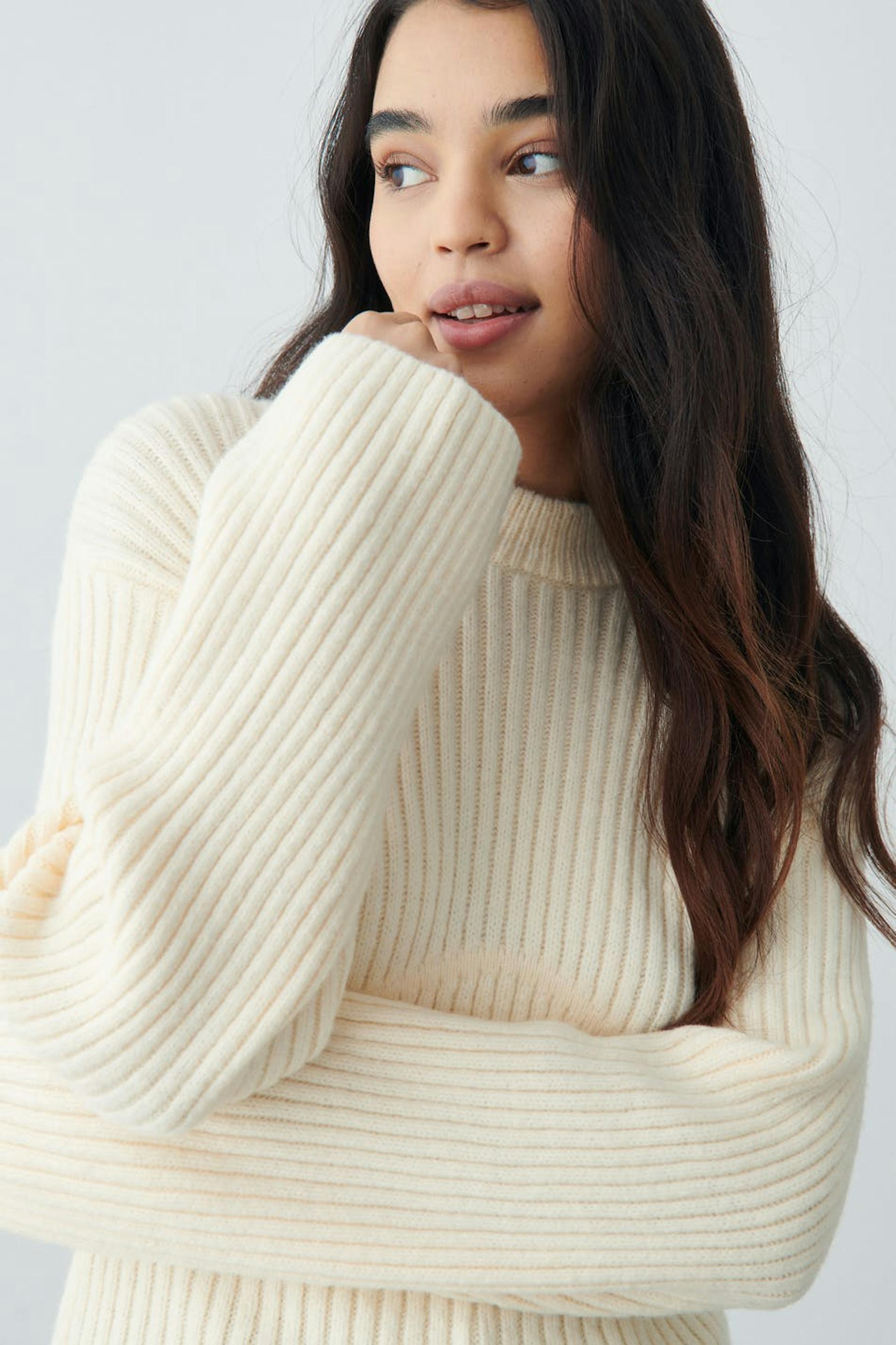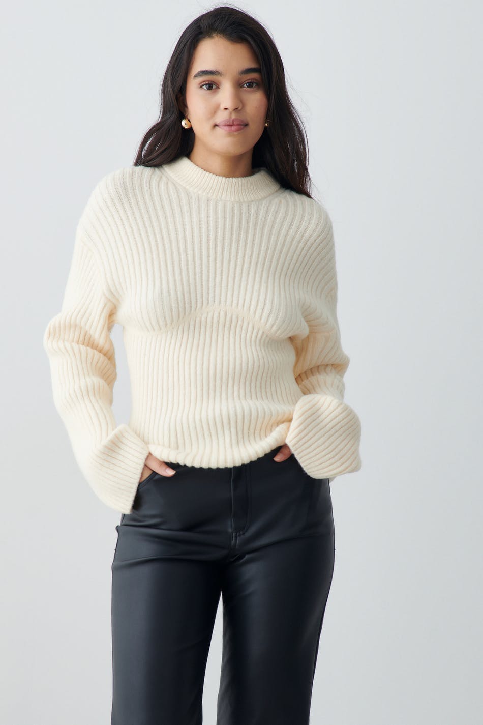 Stickad tröja med rund halsringning. Tröjan är vit och har en stickad detalj under bysten.