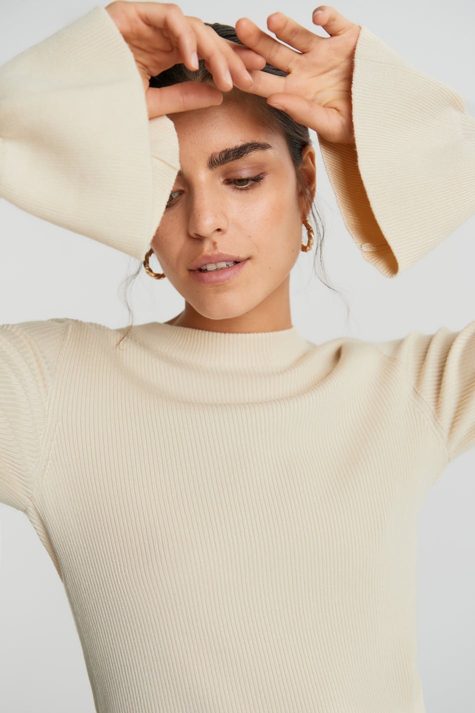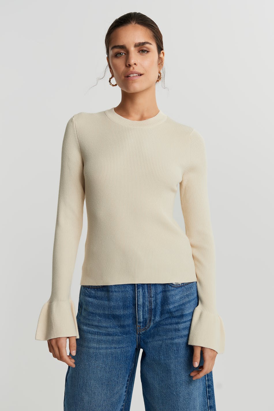 Ribbstickad tröja med en figurnära passform. Tröjan är beige och har volanger vid ärmsluten. Den har en öppen detalj i ryggen.