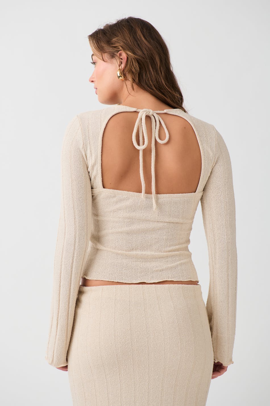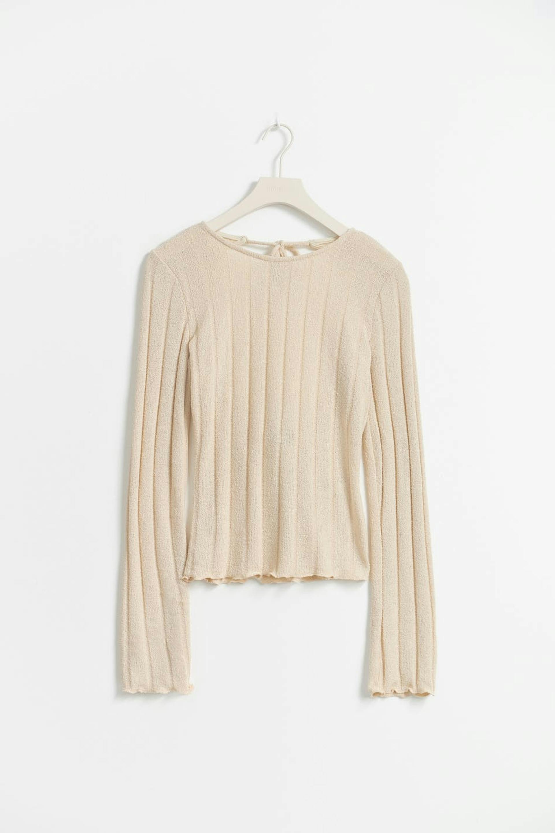 Stickad långärmad tröja med öppen rygg baktill. Tröjan är beige och har knytning i ryggen.