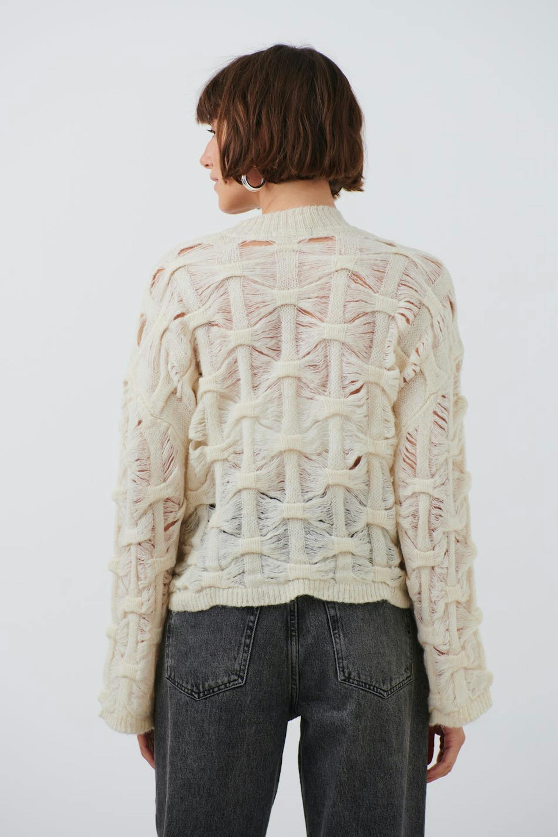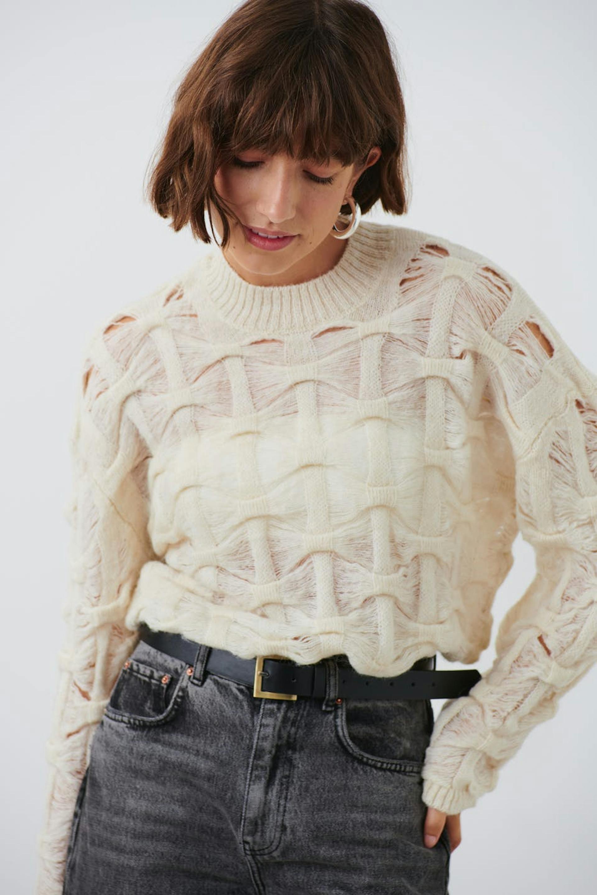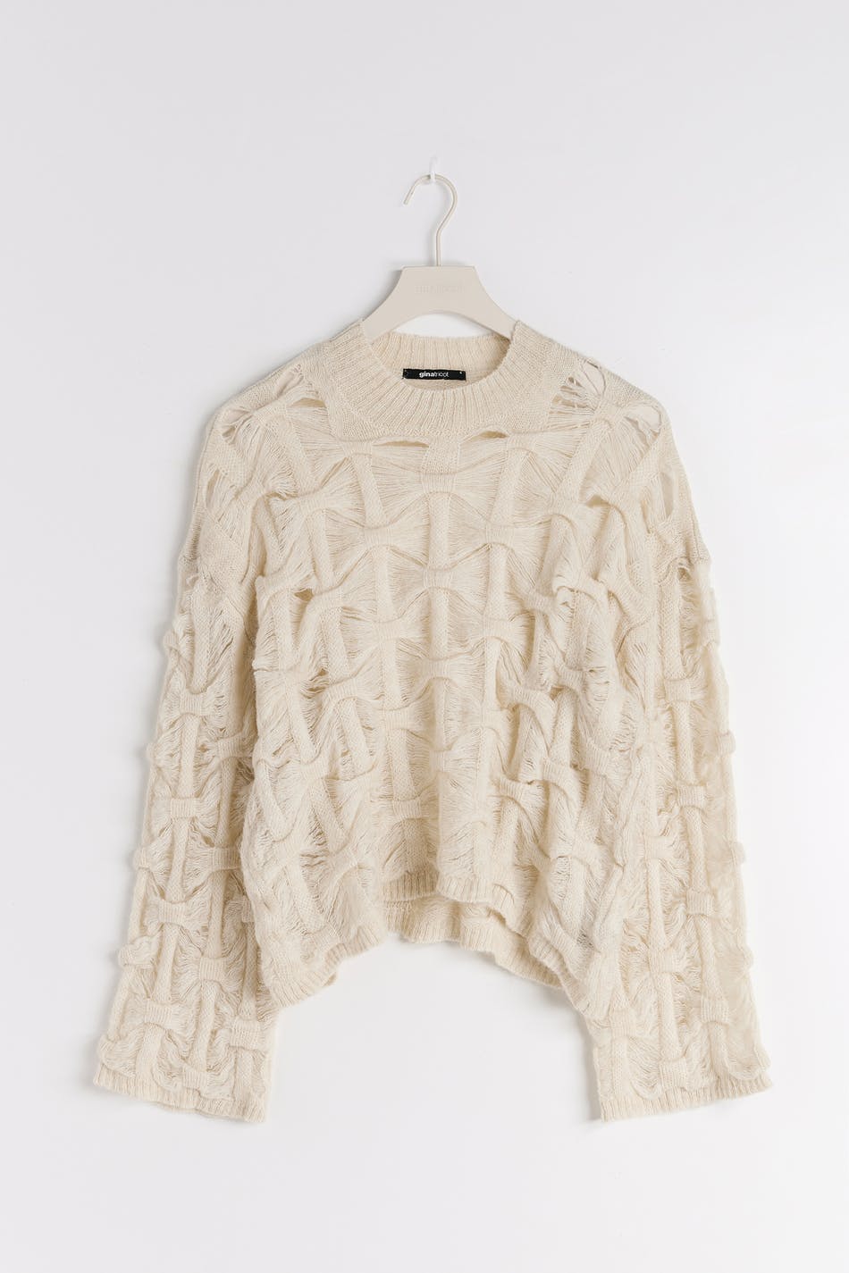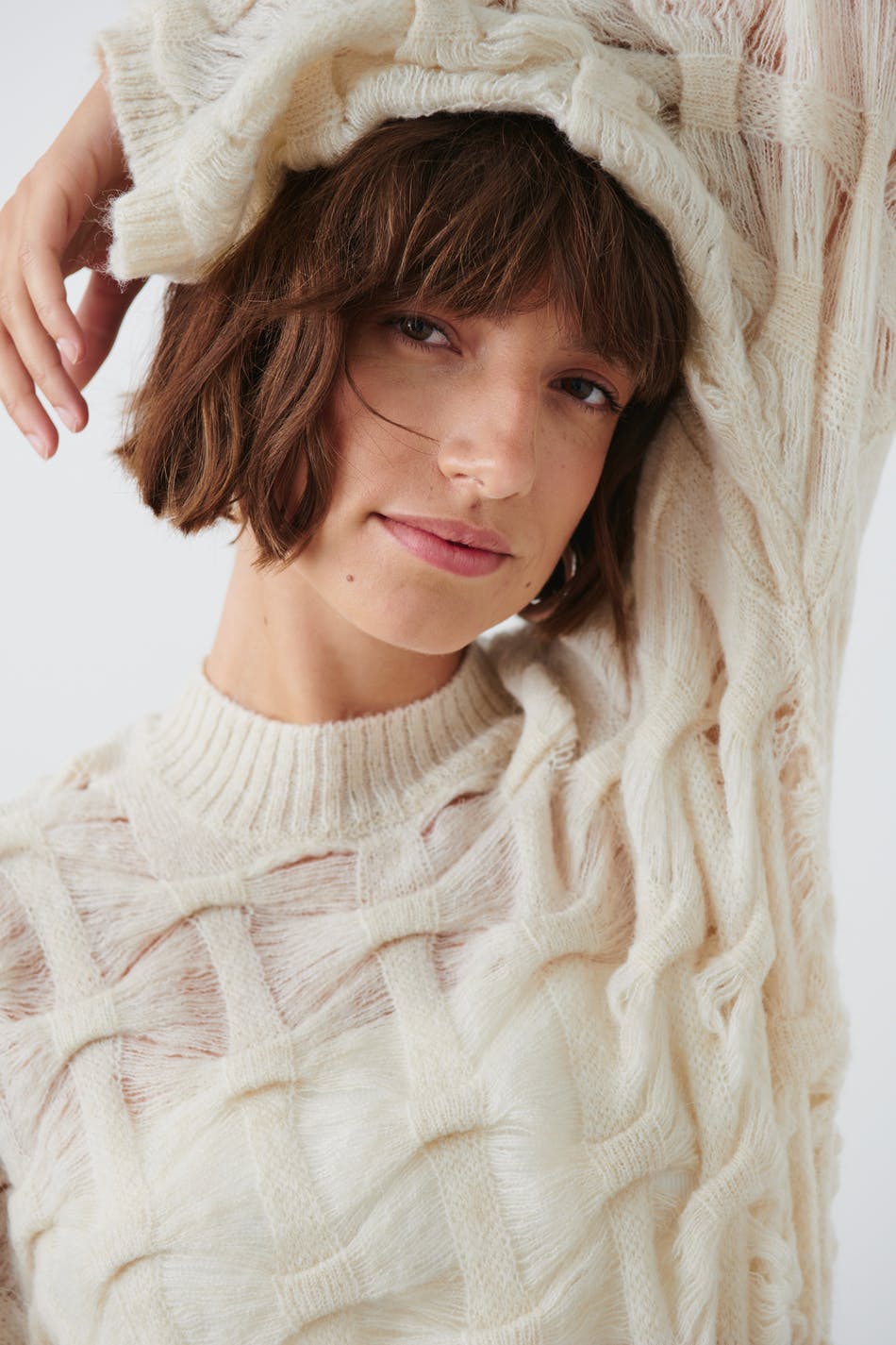 Stickad tröja med lös passform. Tröjan är vit och har vida ärmar.