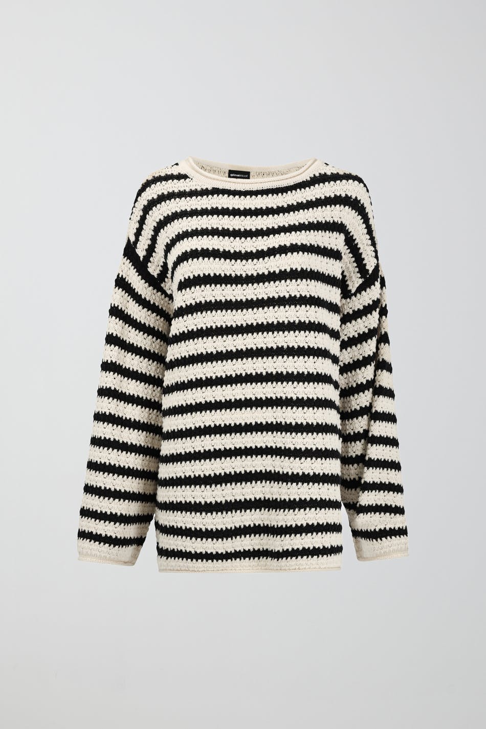 Randig stickad tröja med oversize fit. Tröjan är vit och har hög halsringning. Den har nedhasad axel och raglanärm.