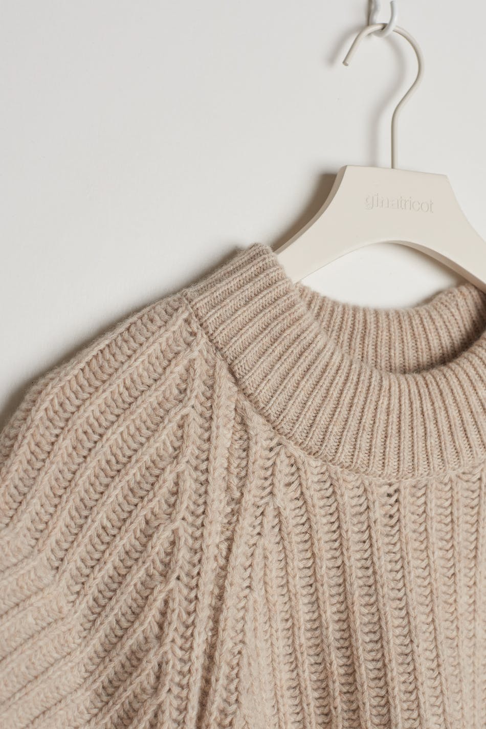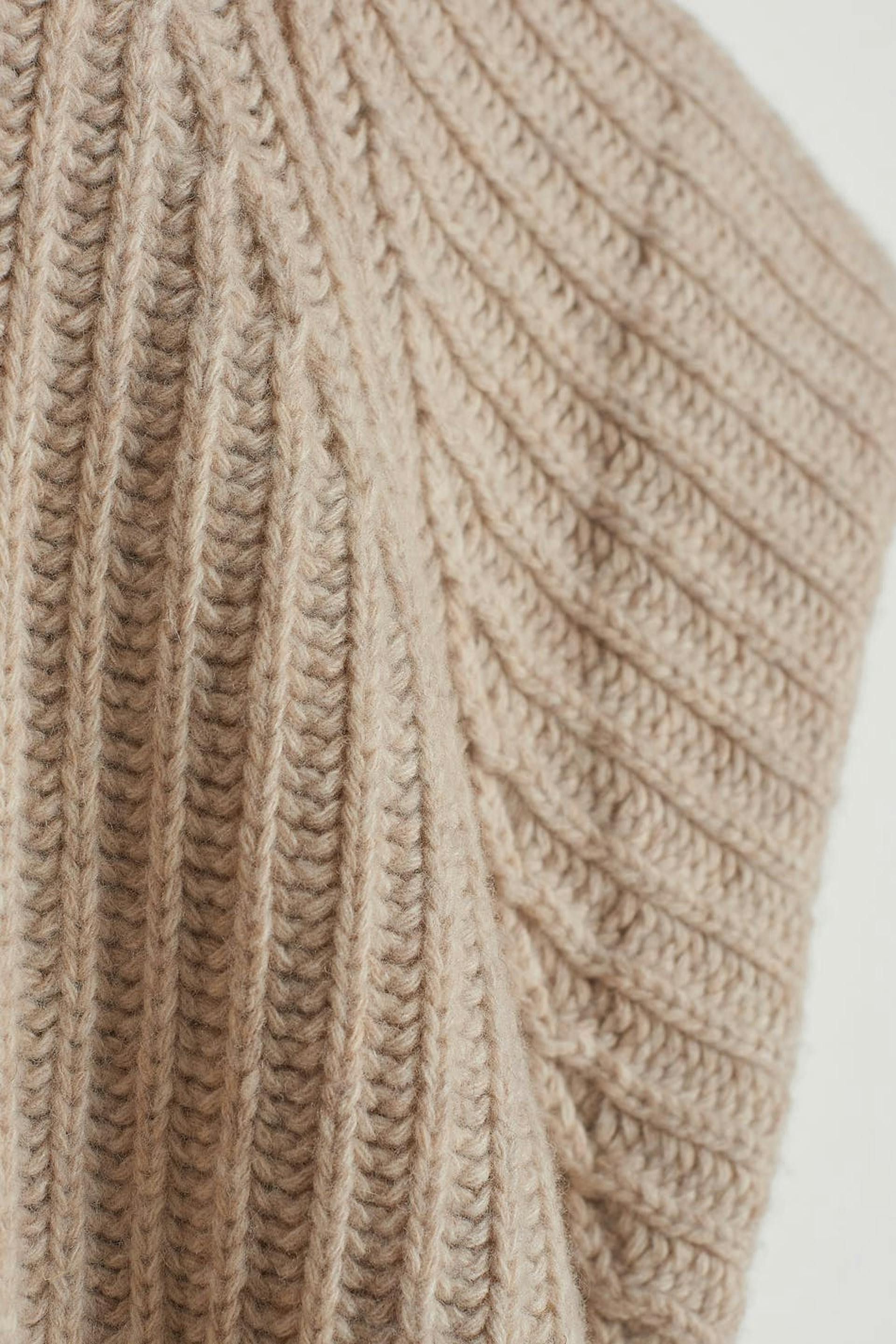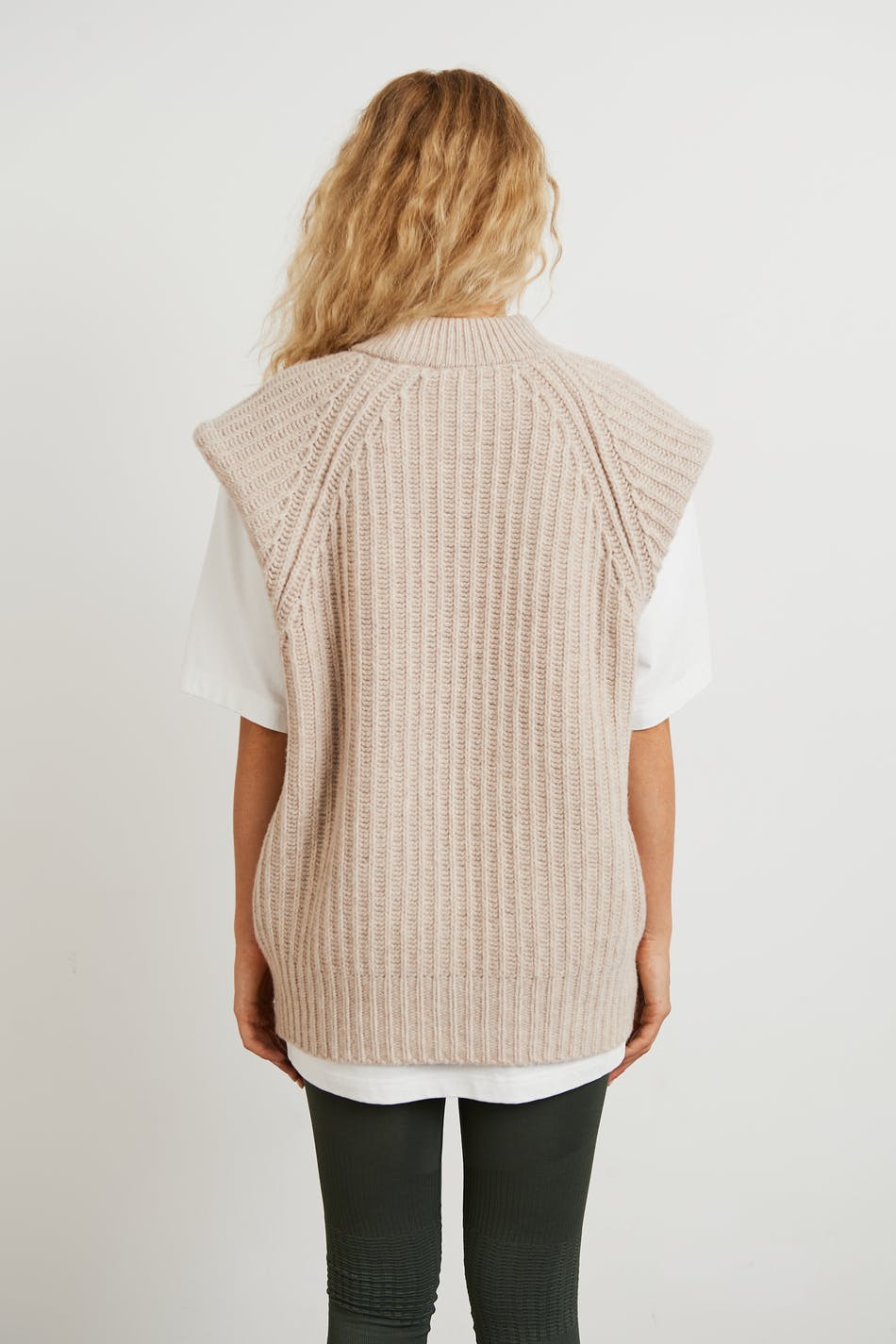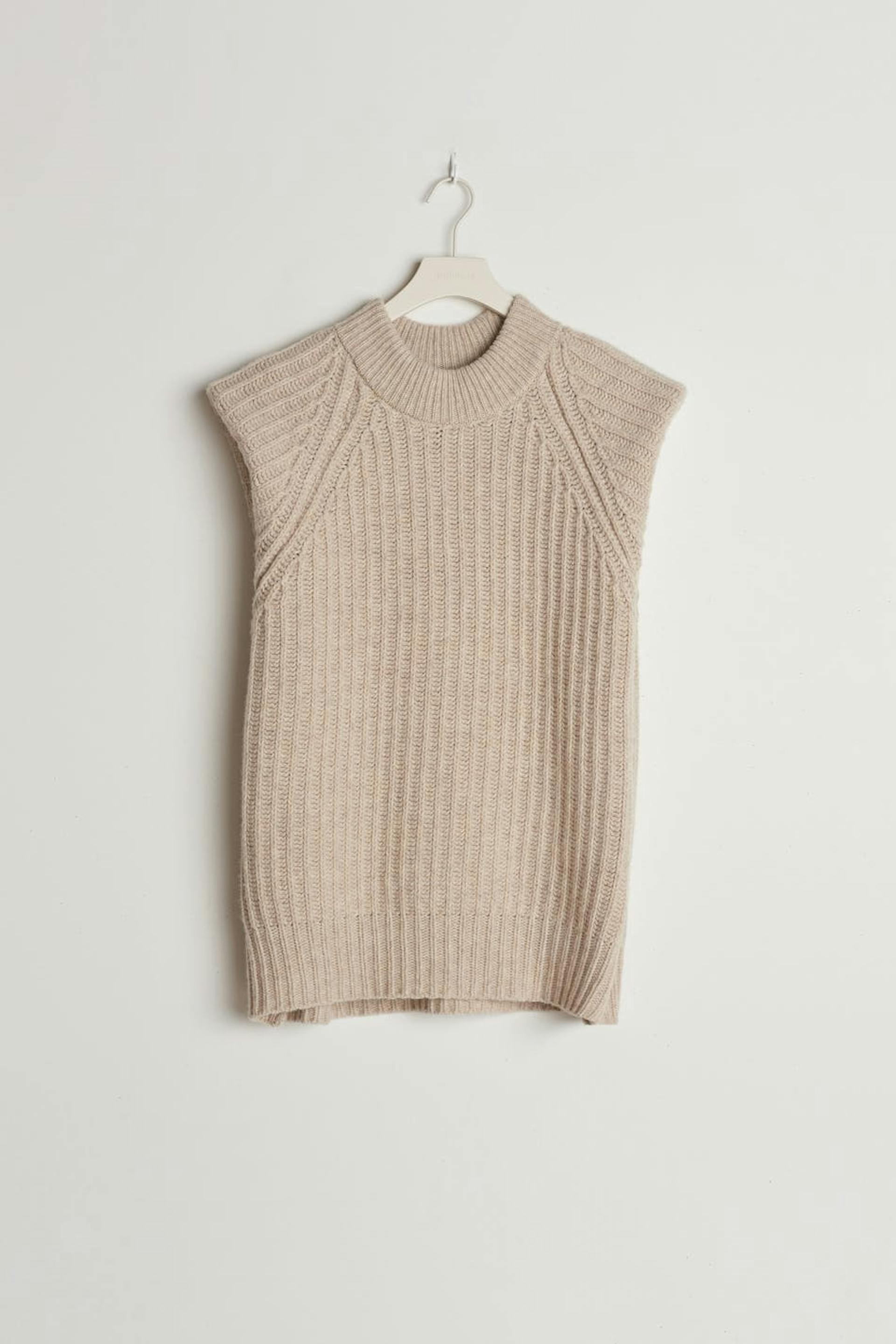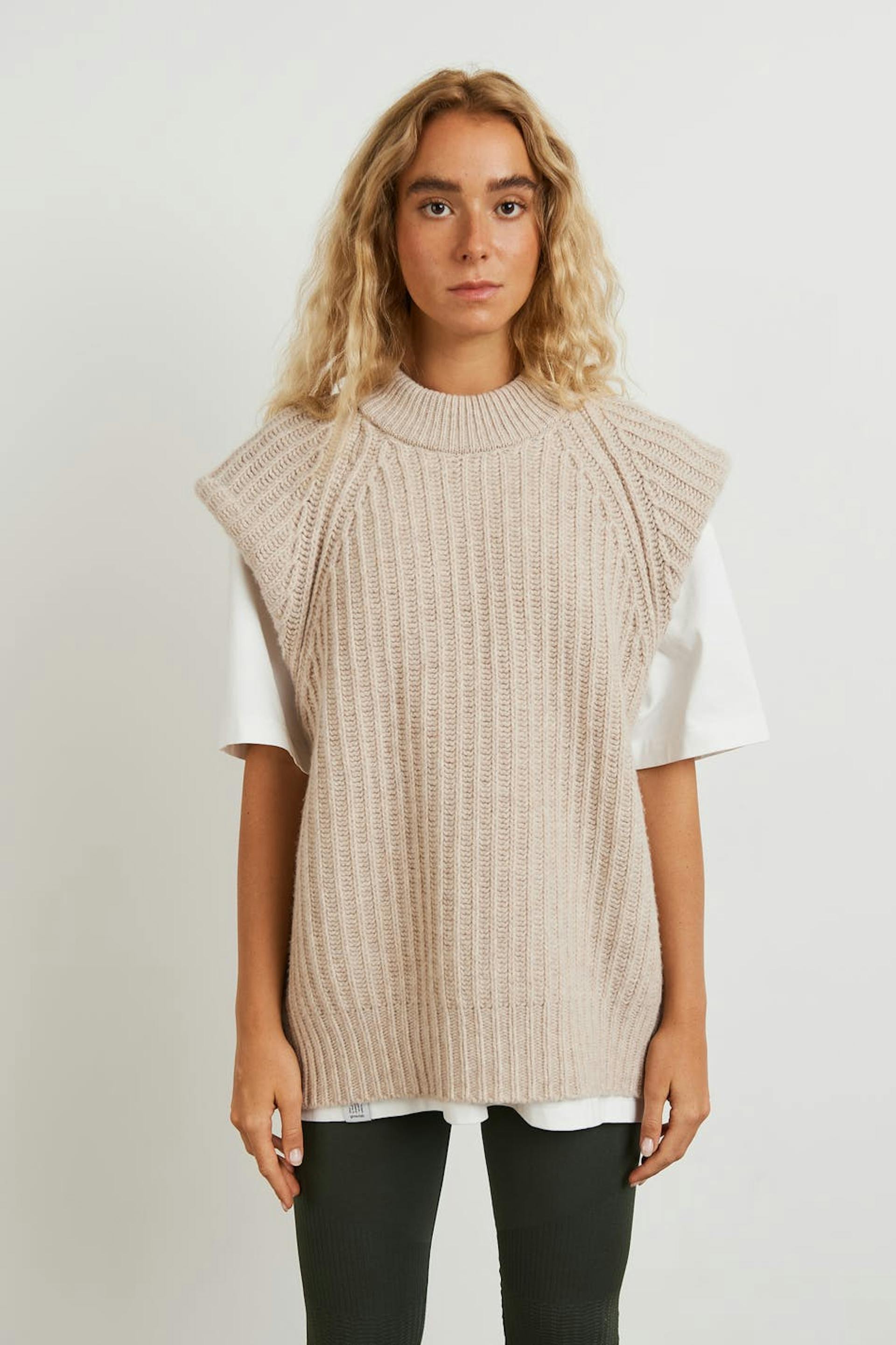Stickad väst från Gina Lab med en lös passform. Västen är beige och har en rund halsringning. Den är gjord av återvunnen ull och har nedhasade axlar.