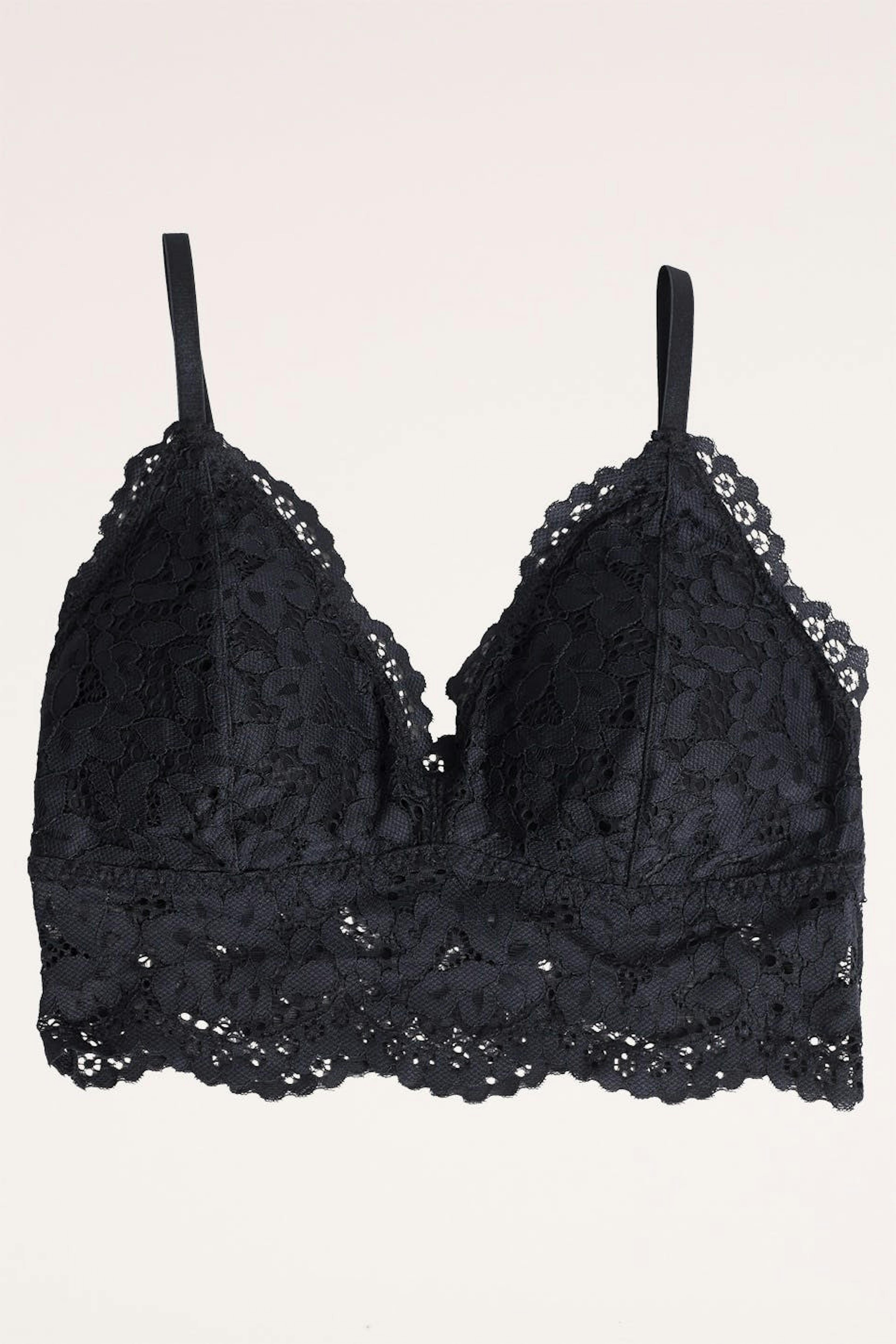 Bralette med trekantiga kupor med avtagbara vadderingar. Braletten är svart. Den är gjord av spets.