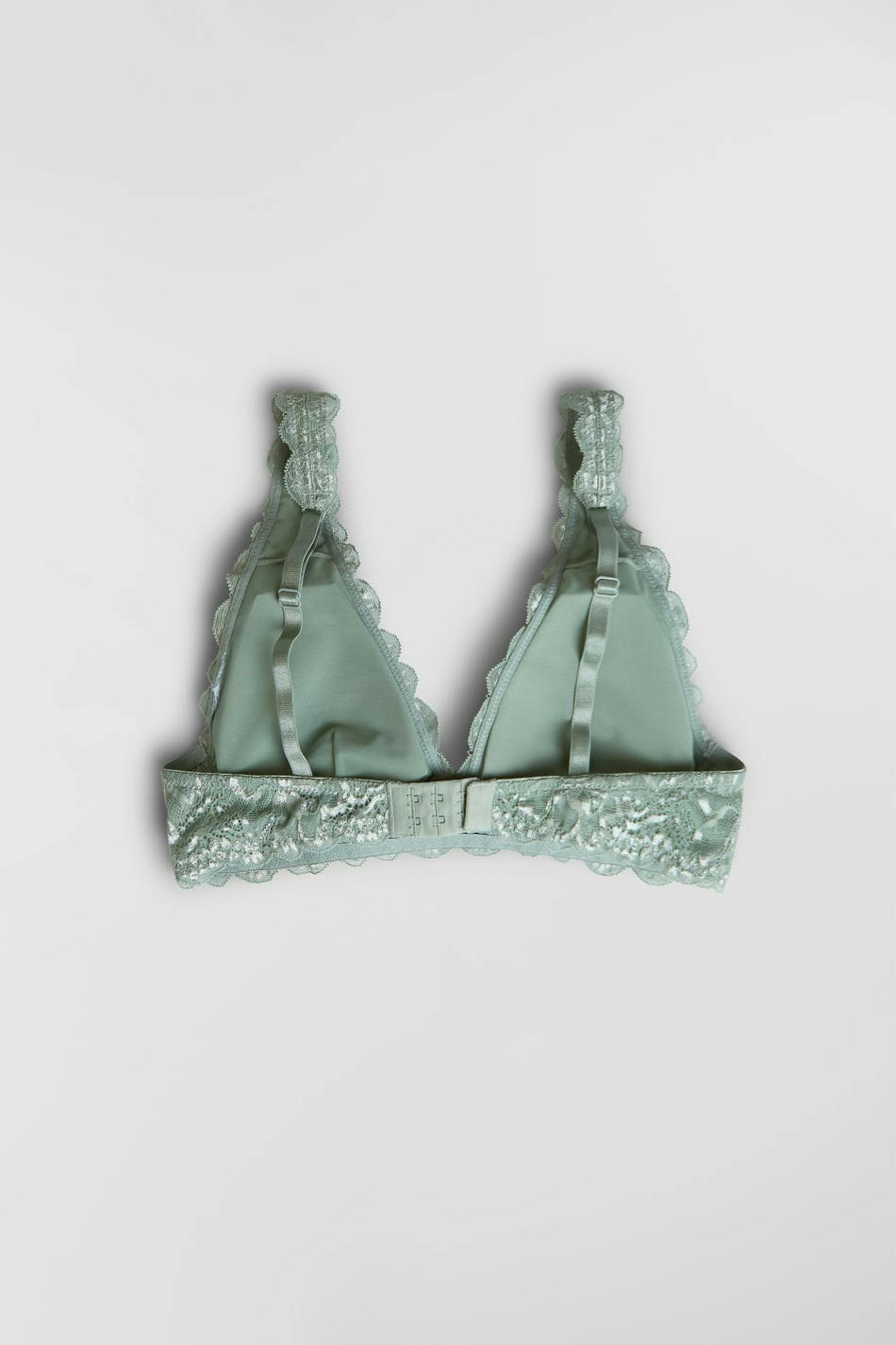 BH med en mjuk vaddering. BH:n är grön och har en resår vid kanterna. Den är gjord av spets och har justerbara axelband, en justerbar stängning i ryggen och en dekorativ rosett.
