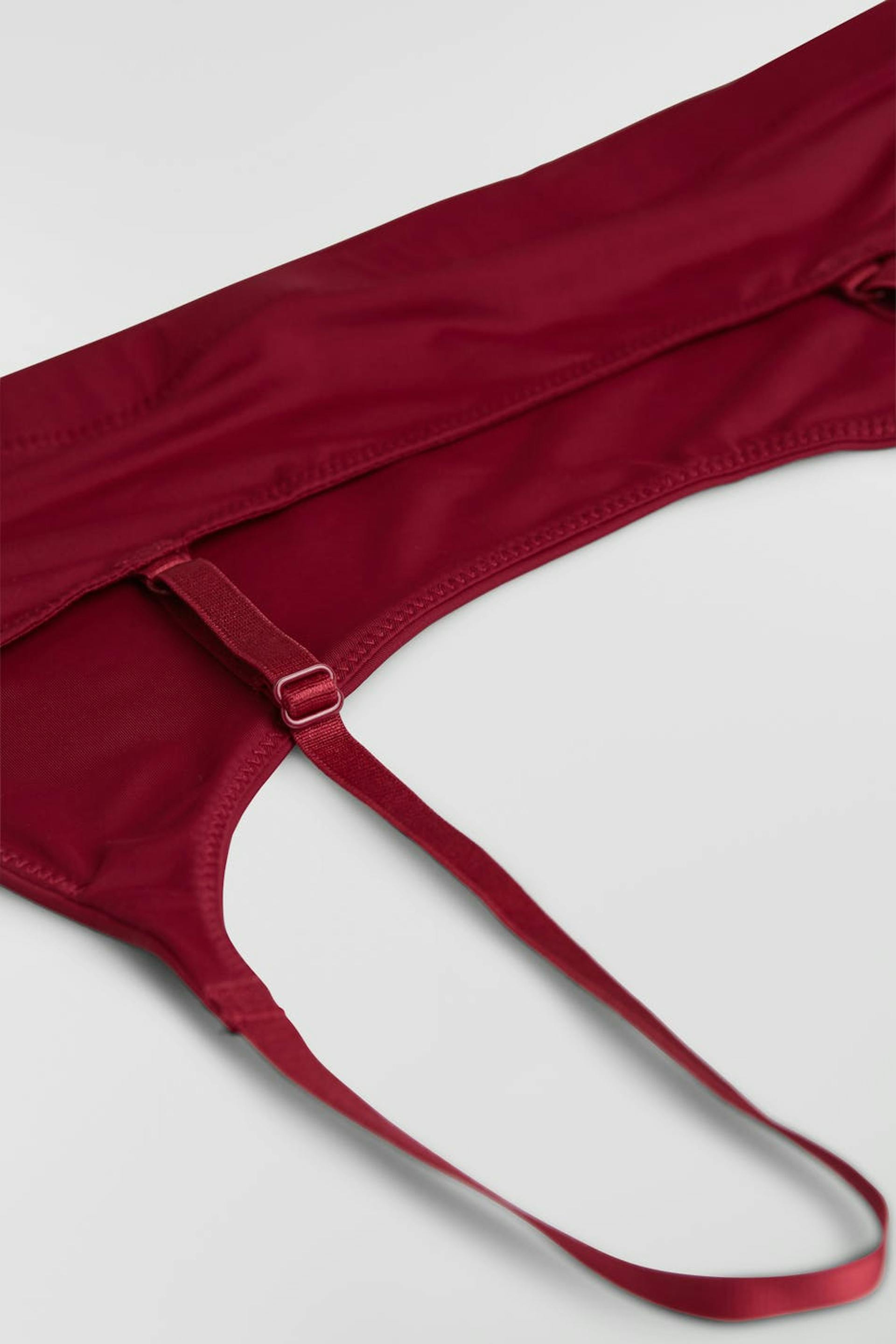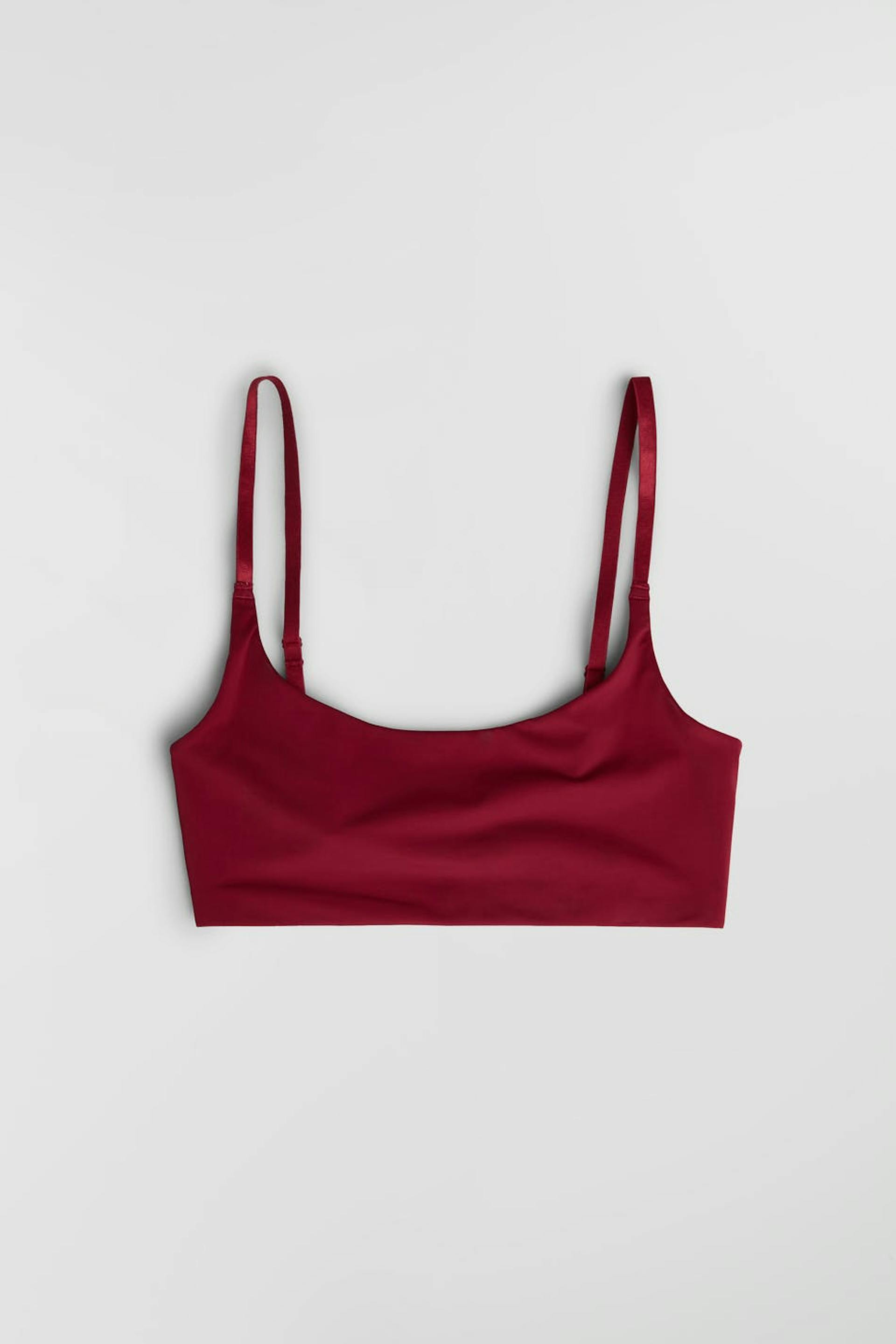 Helt fodrad BH med en resår i nederkant. BH:n är röd. Den är gjord av mikrofiber.